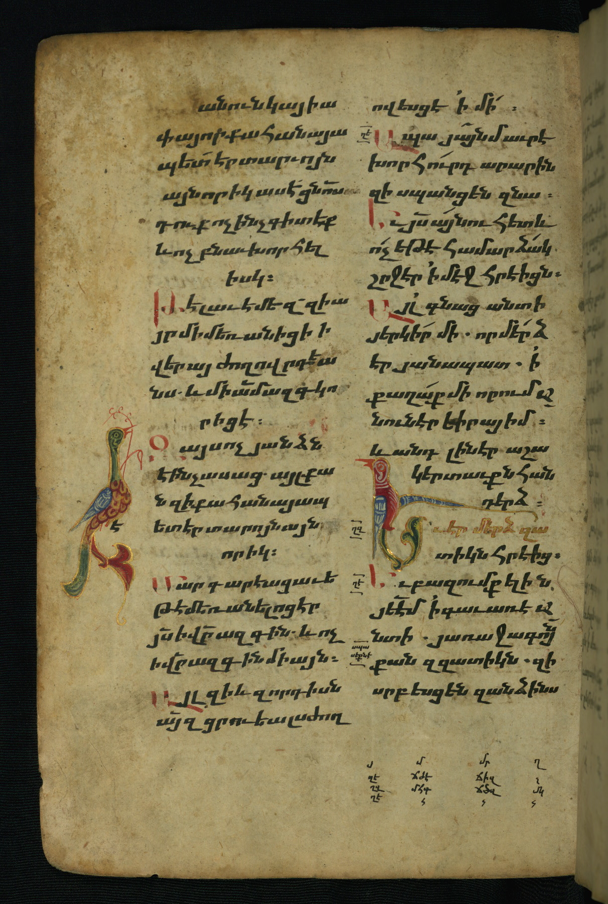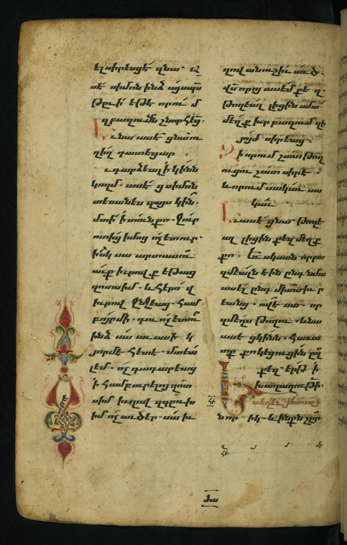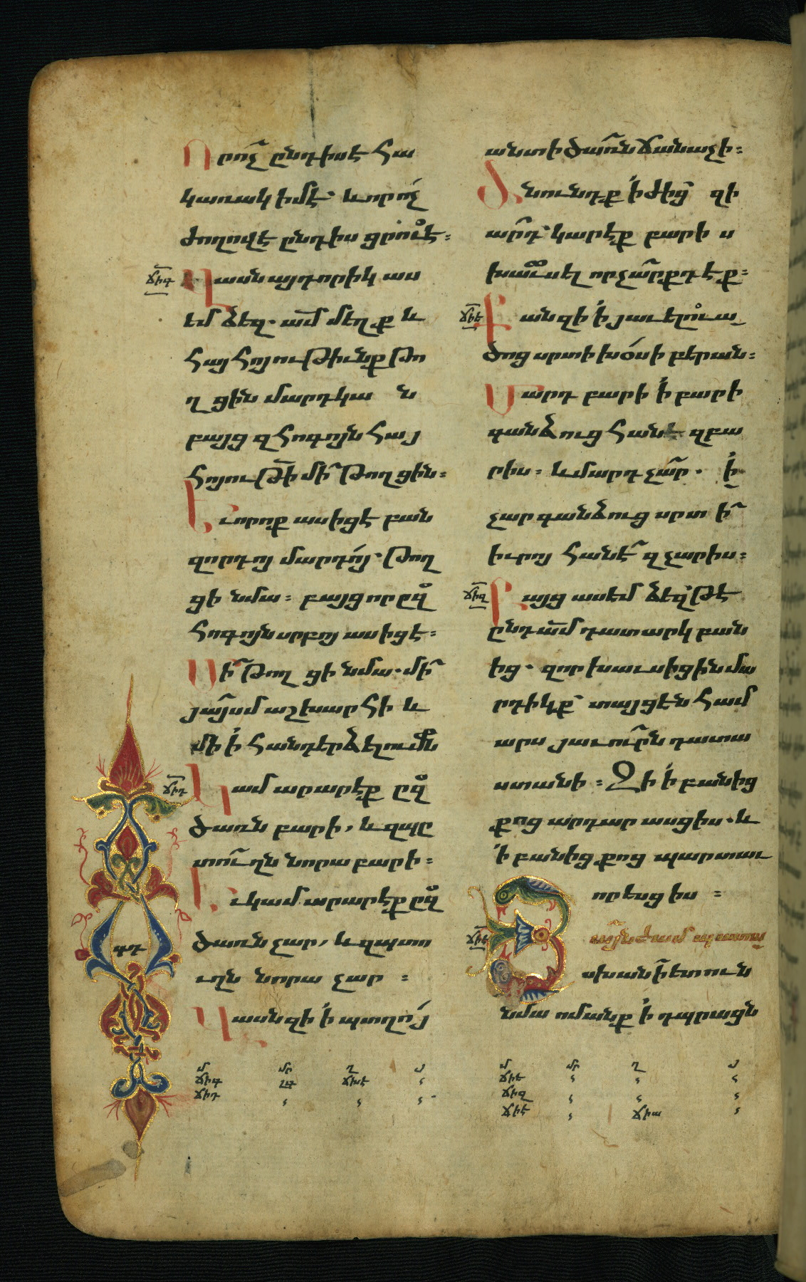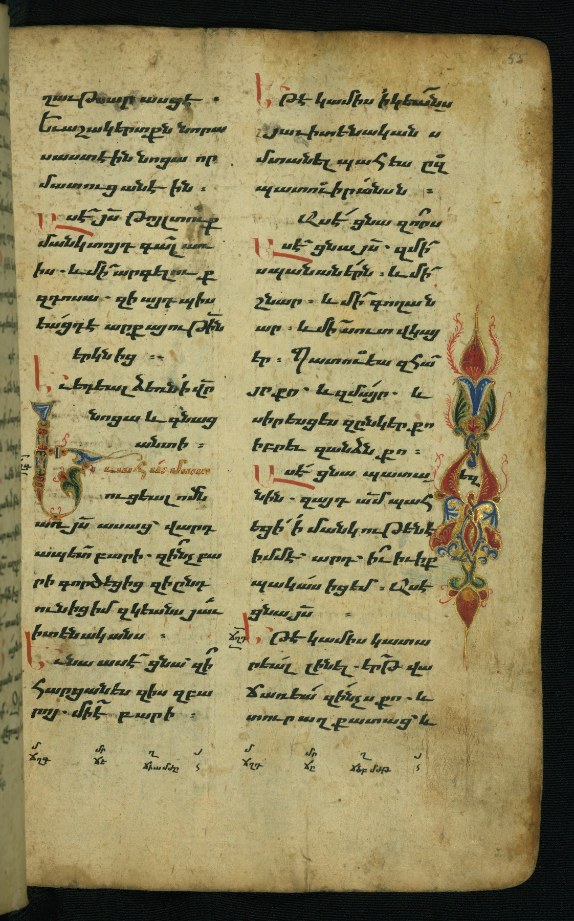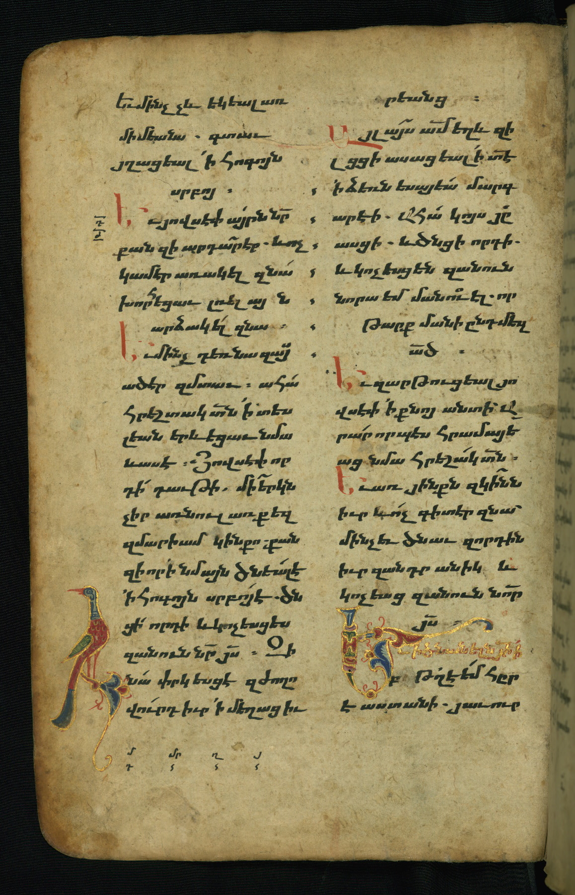 This manuscript was executed in 1475 CE by a scribe identified as Aristakes for a priest named Hakob. It contains a series of sixteen images on the life of Christ preceding the text of the Gospels, as well as the traditional Evangelist portraits, and there are marginal illustrations throughout. The style of the miniatures, which employ brilliant colors and emphasize decorative patterns, is characteristic of manuscript production in the region around Lake Van during the fifteenth century. The style of Lake Van has often been described in relation to schools of Islamic arts of the book. Numerous inscriptions (on fols. 258-260) spanning a few centuries attest to the manuscript's long history of use and revered preservation. The codex's later history included a rebinding with silver covers from Kayseri that date to approximately 1700. This jeweled and enameled silver binding bears a composition of the Adoration of the Magi on the front and the Ascension on the back.