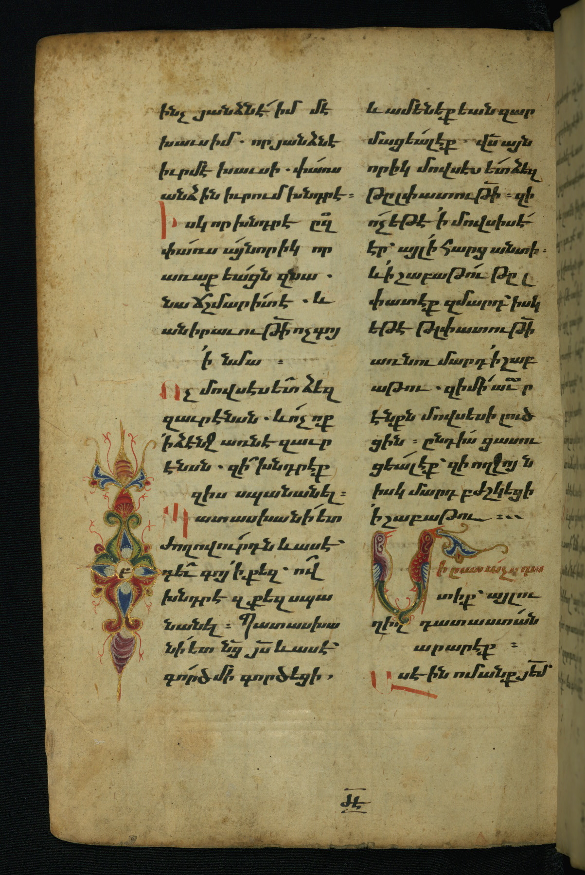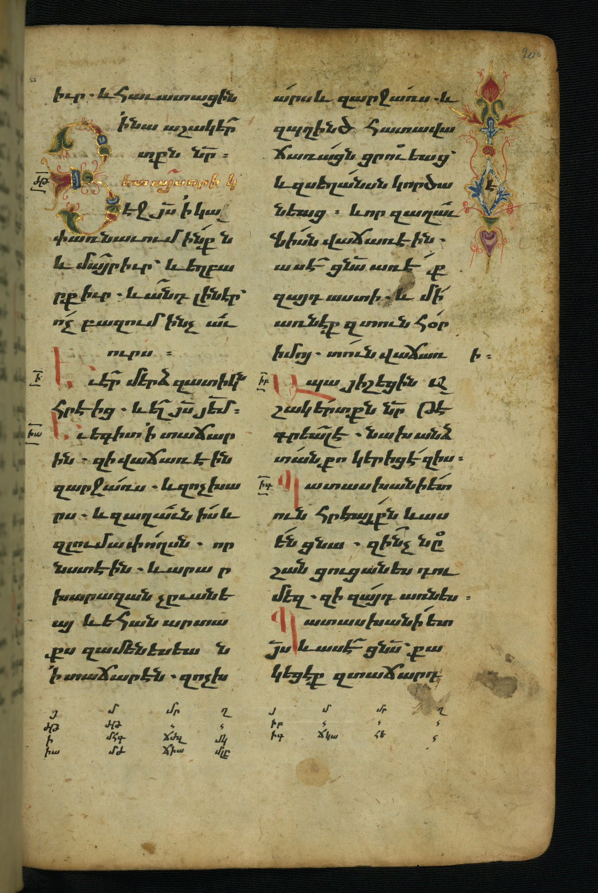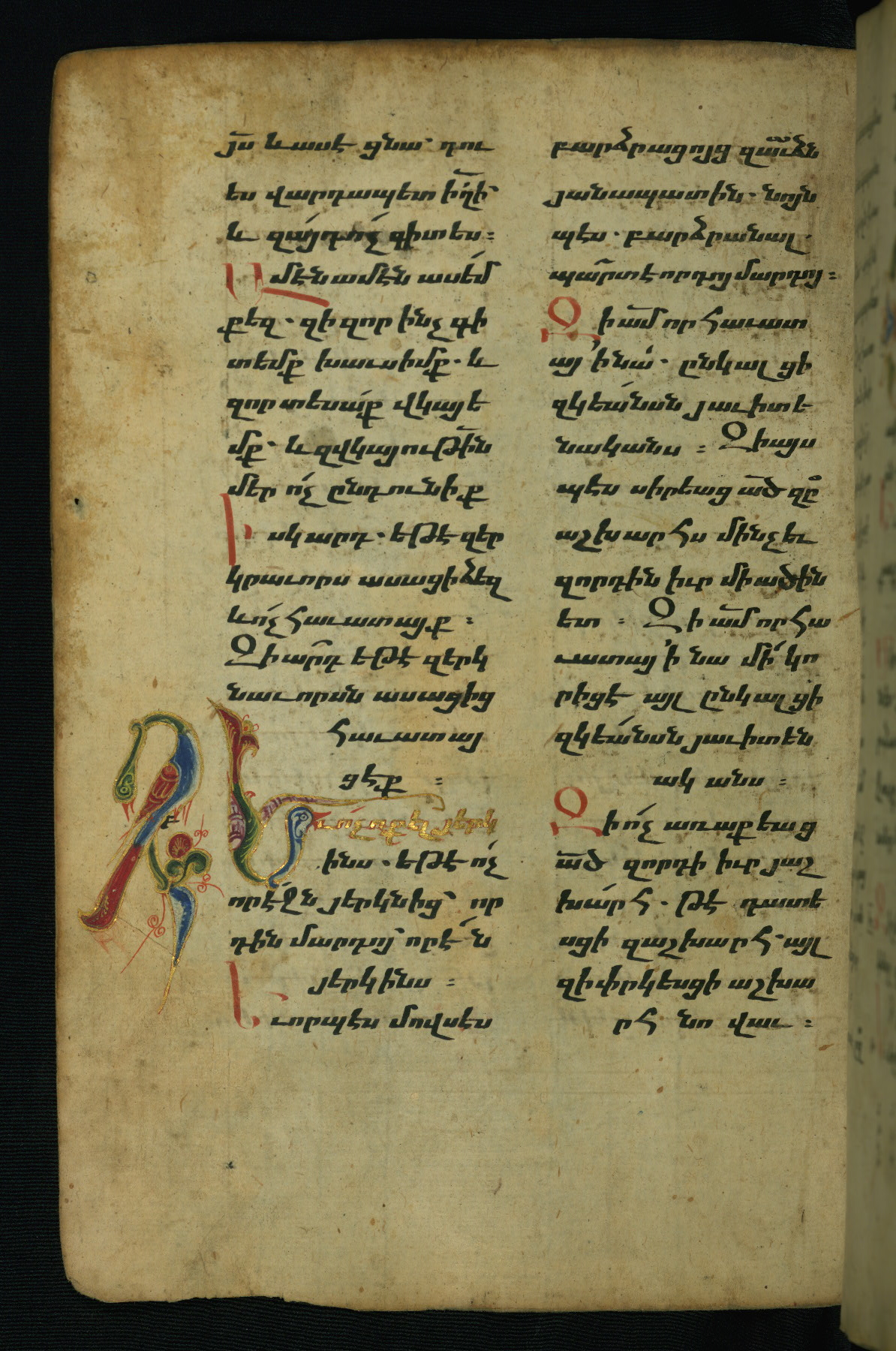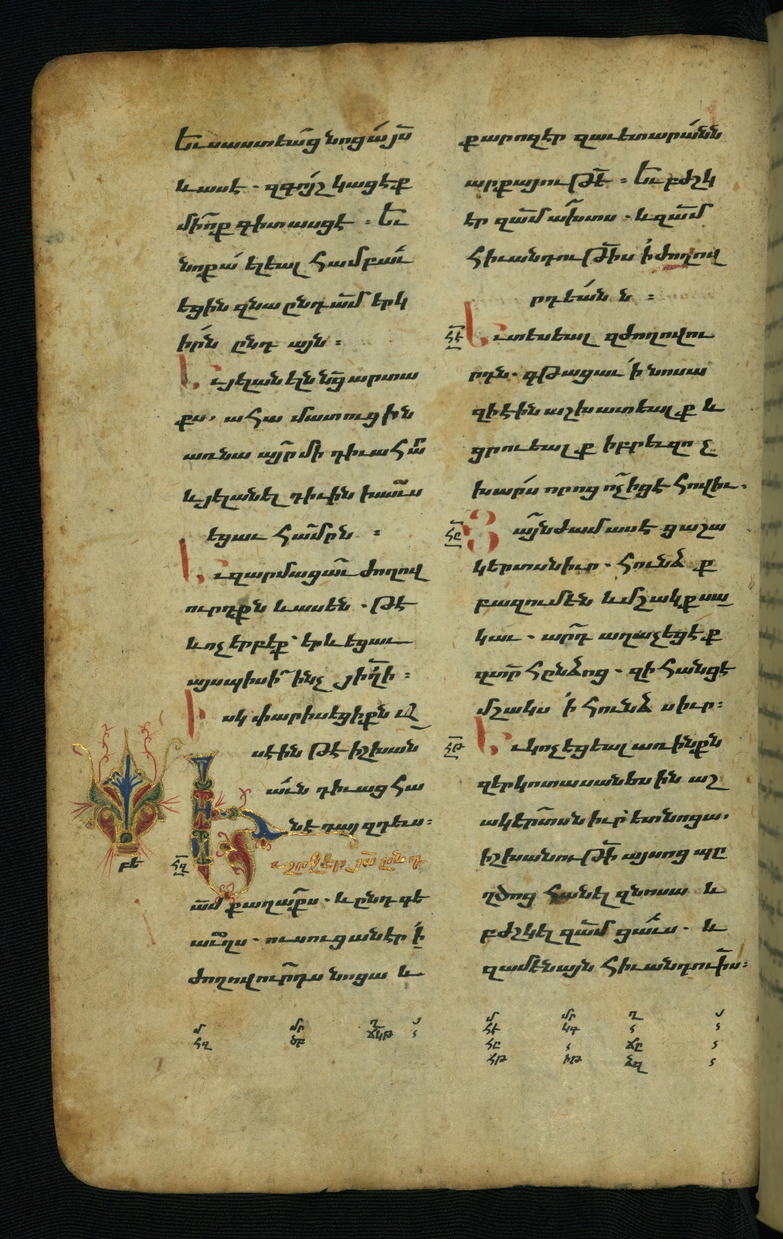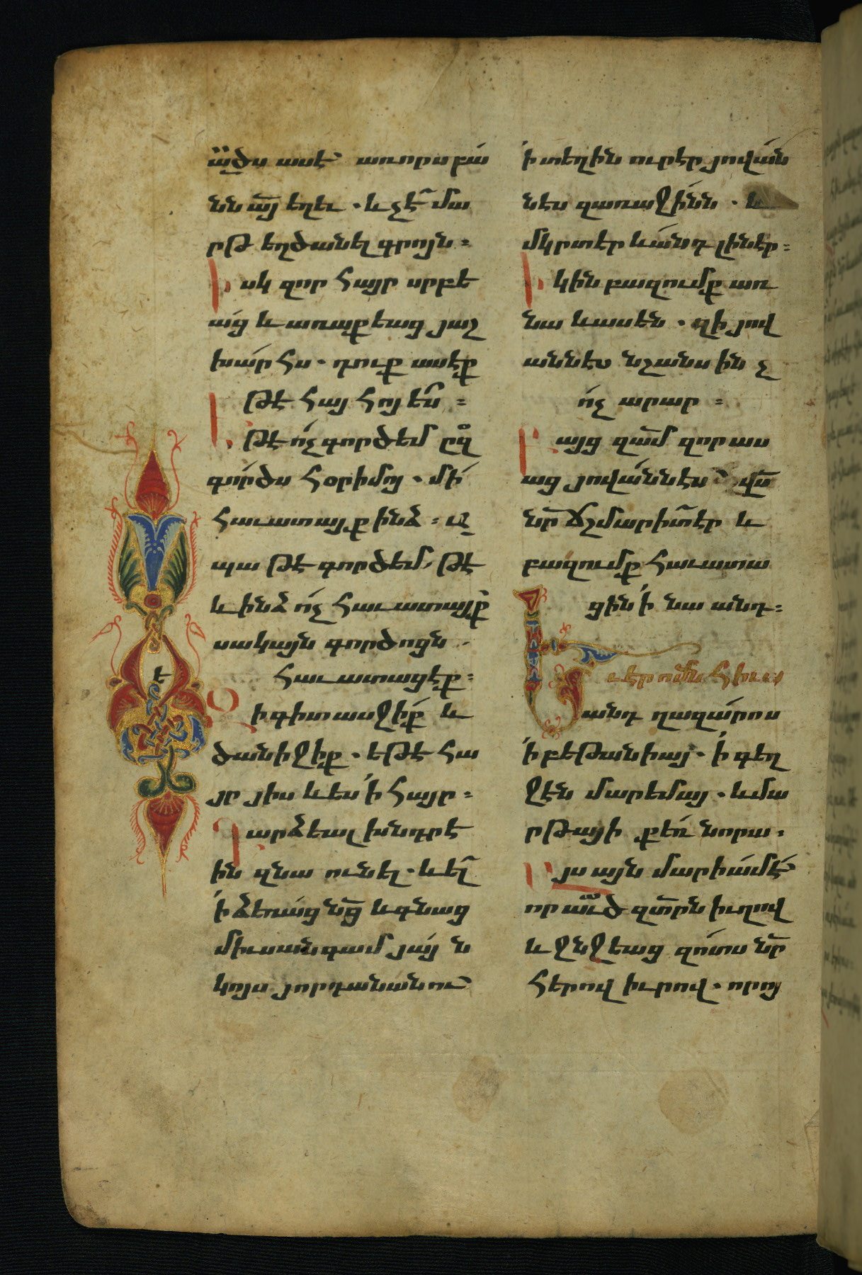 This manuscript was executed in 1475 CE by a scribe identified as Aristakes for a priest named Hakob. It contains a series of sixteen images on the life of Christ preceding the text of the Gospels, as well as the traditional Evangelist portraits, and there are marginal illustrations throughout. The style of the miniatures, which employ brilliant colors and emphasize decorative patterns, is characteristic of manuscript production in the region around Lake Van during the fifteenth century. The style of Lake Van has often been described in relation to schools of Islamic arts of the book. Numerous inscriptions (on fols. 258-260) spanning a few centuries attest to the manuscript's long history of use and revered preservation. The codex's later history included a rebinding with silver covers from Kayseri that date to approximately 1700. This jeweled and enameled silver binding bears a composition of the Adoration of the Magi on the front and the Ascension on the back.