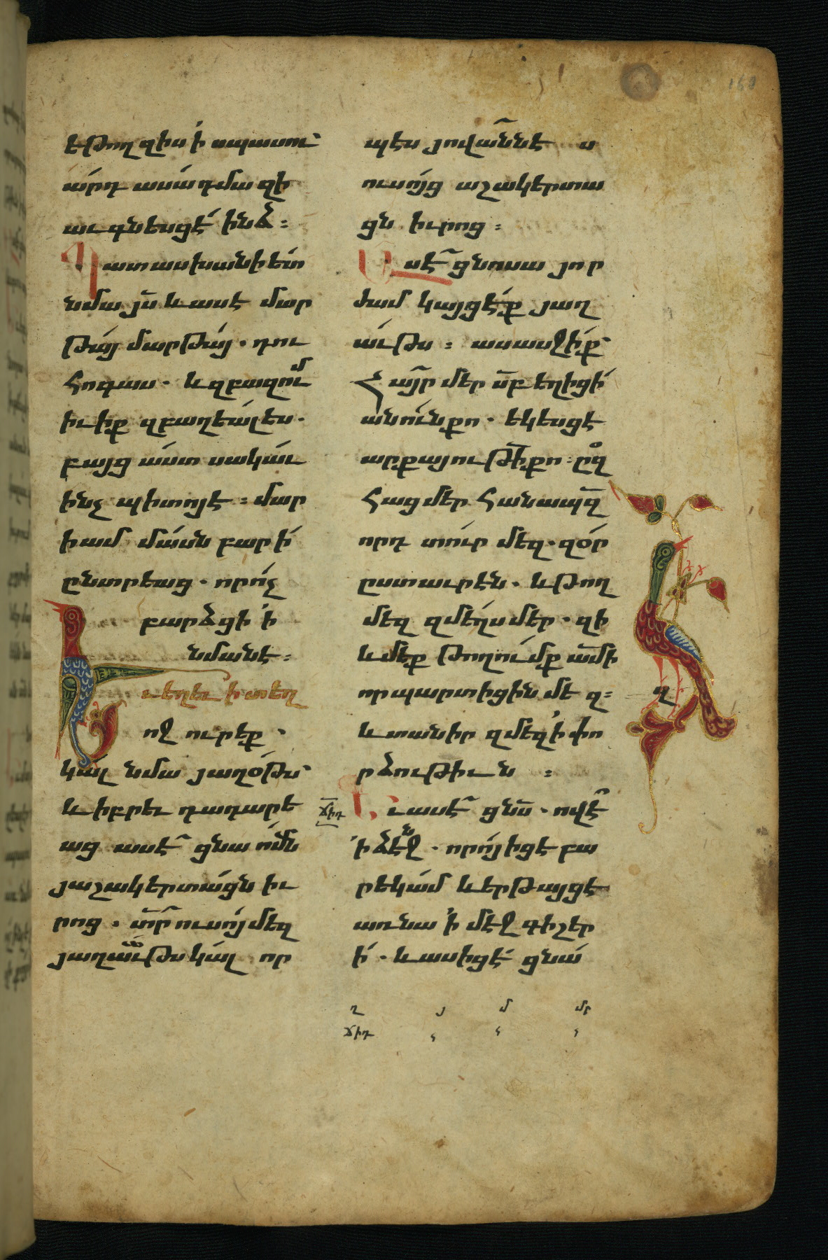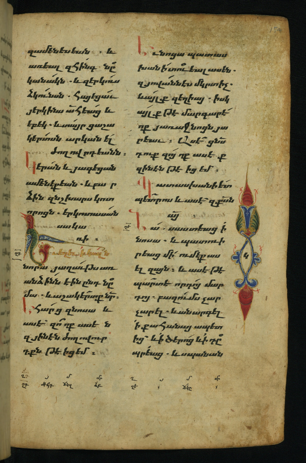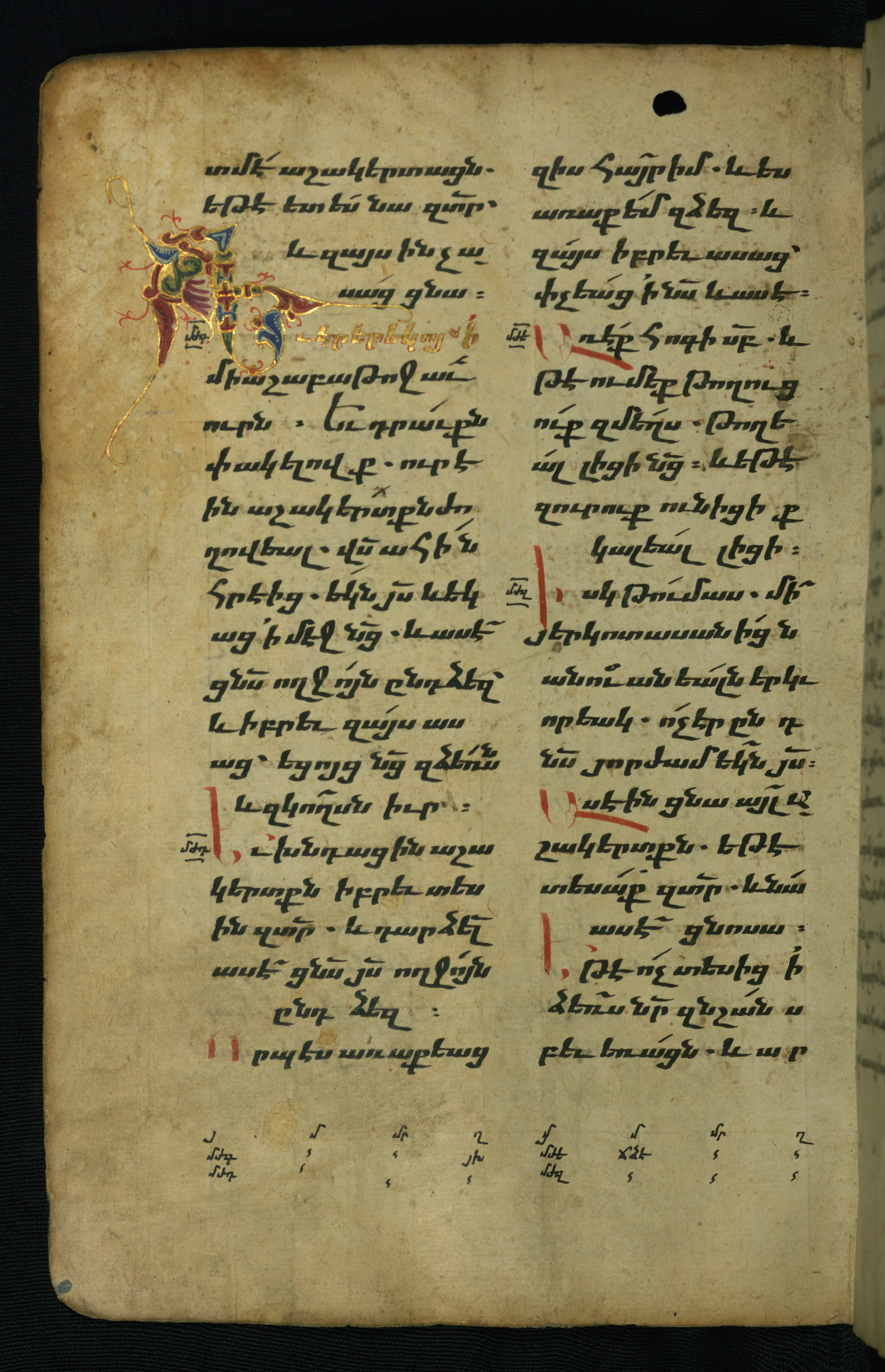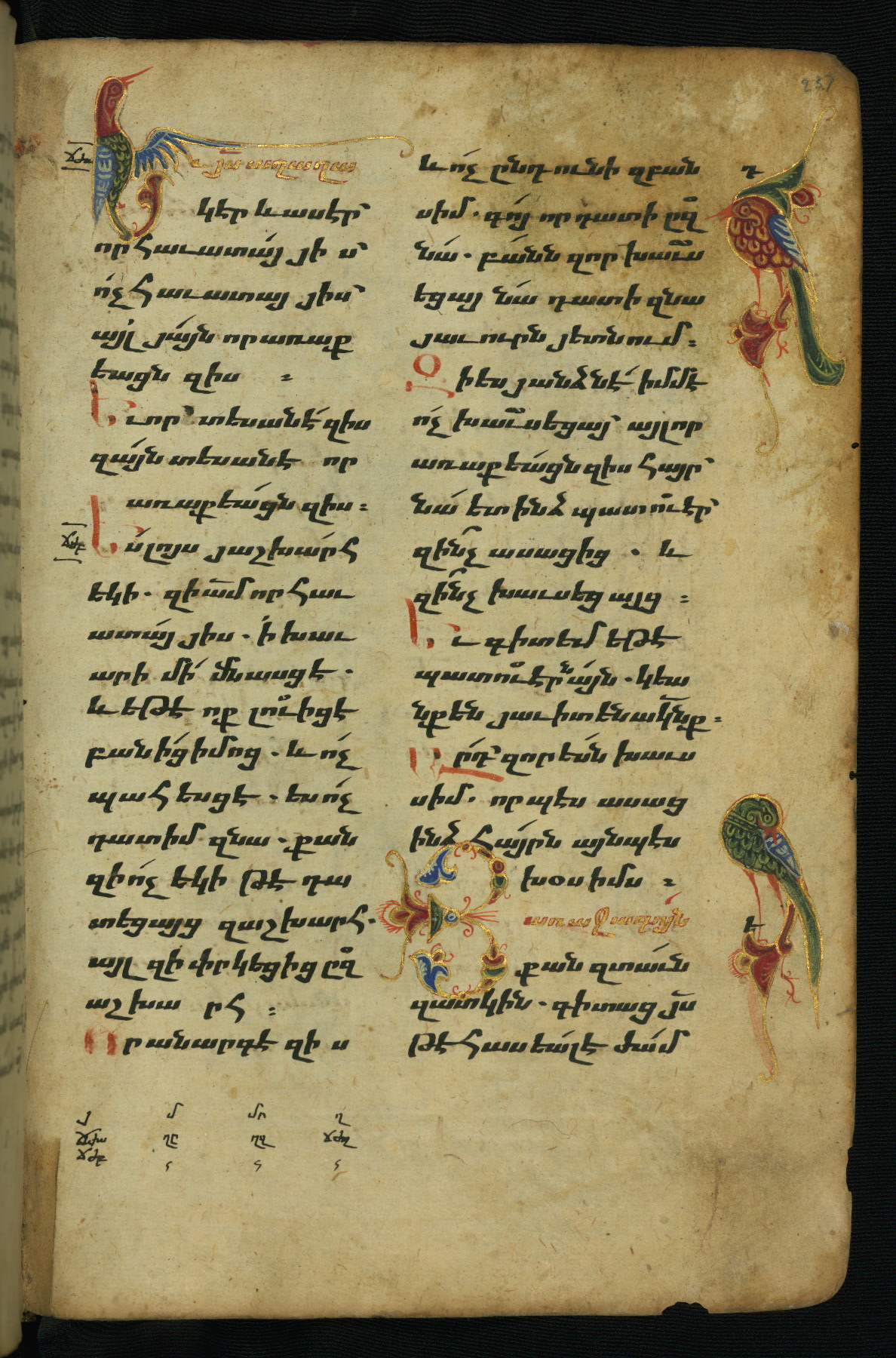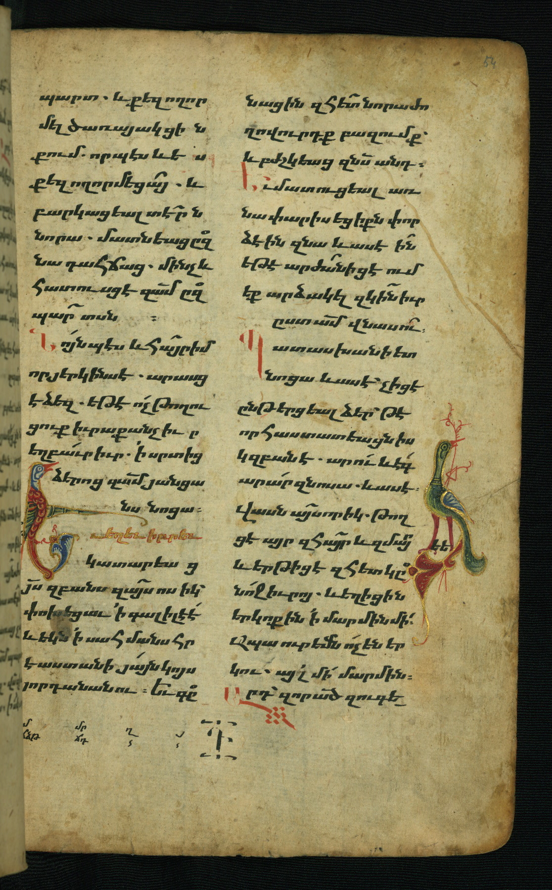 This manuscript was executed in 1475 CE by a scribe identified as Aristakes for a priest named Hakob. It contains a series of sixteen images on the life of Christ preceding the text of the Gospels, as well as the traditional Evangelist portraits, and there are marginal illustrations throughout. The style of the miniatures, which employ brilliant colors and emphasize decorative patterns, is characteristic of manuscript production in the region around Lake Van during the fifteenth century. The style of Lake Van has often been described in relation to schools of Islamic arts of the book. Numerous inscriptions (on fols. 258-260) spanning a few centuries attest to the manuscript's long history of use and revered preservation. The codex's later history included a rebinding with silver covers from Kayseri that date to approximately 1700. This jeweled and enameled silver binding bears a composition of the Adoration of the Magi on the front and the Ascension on the back.