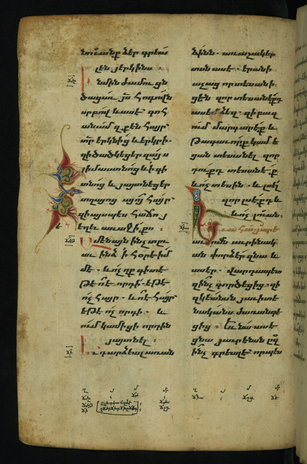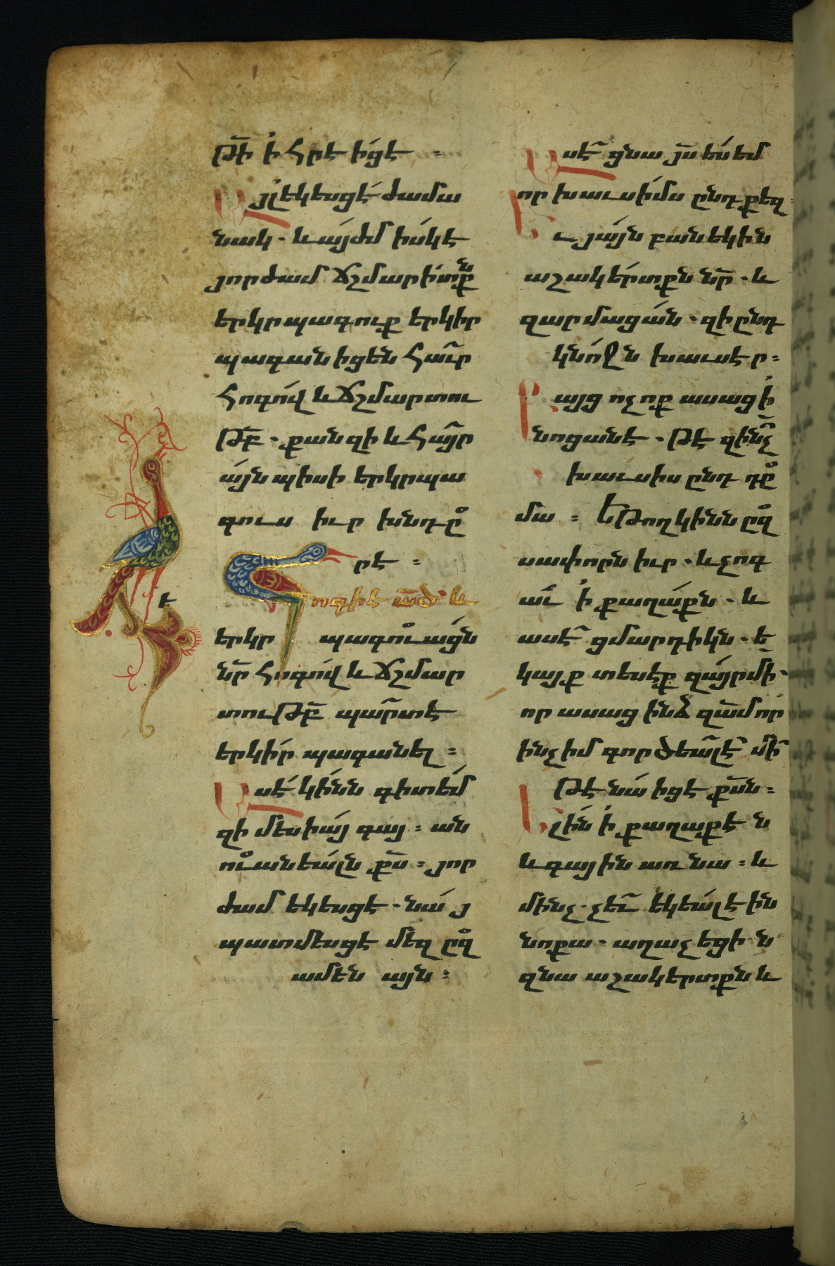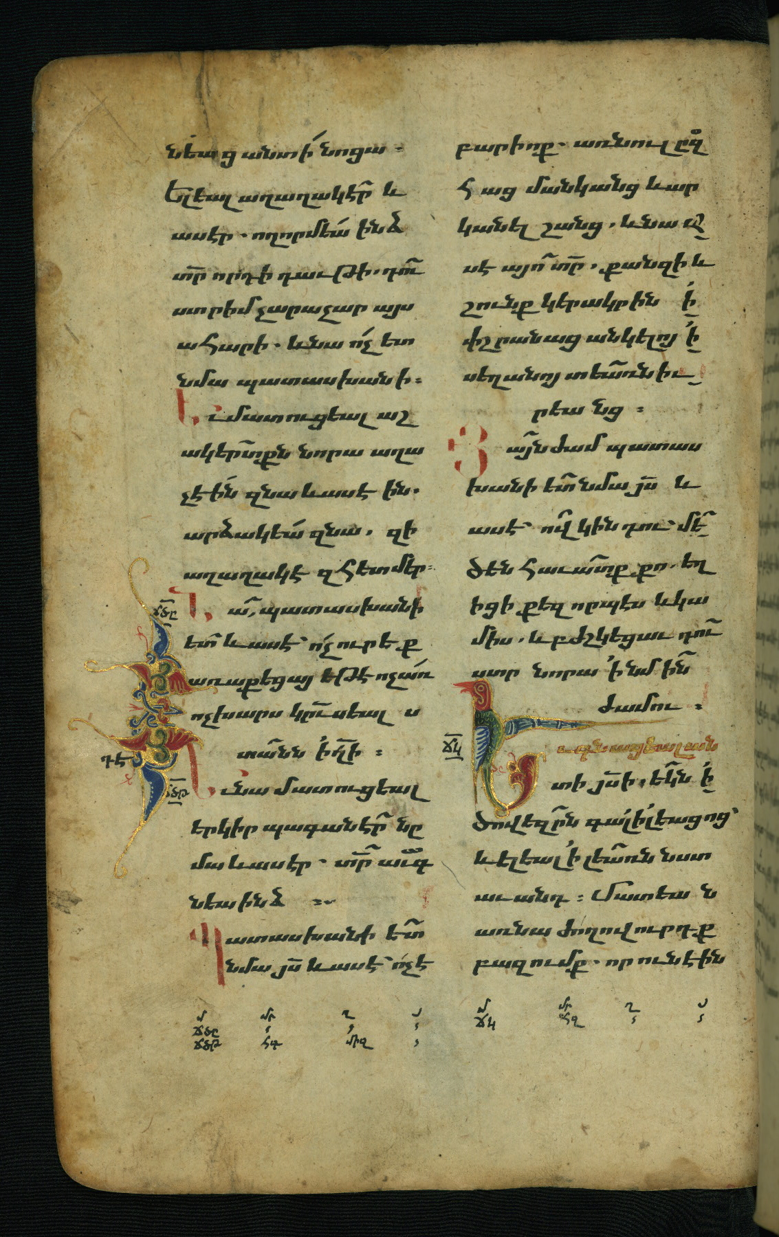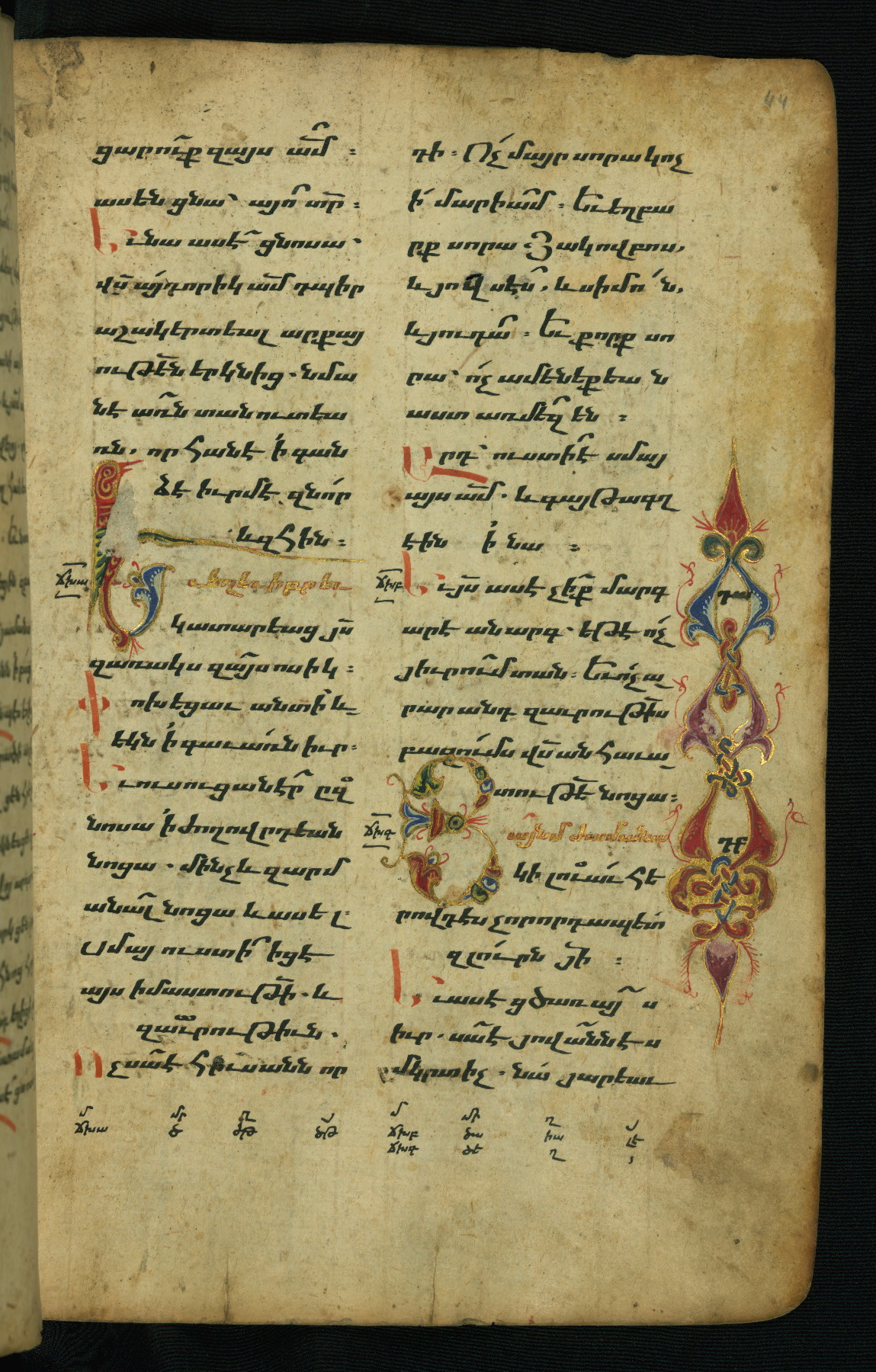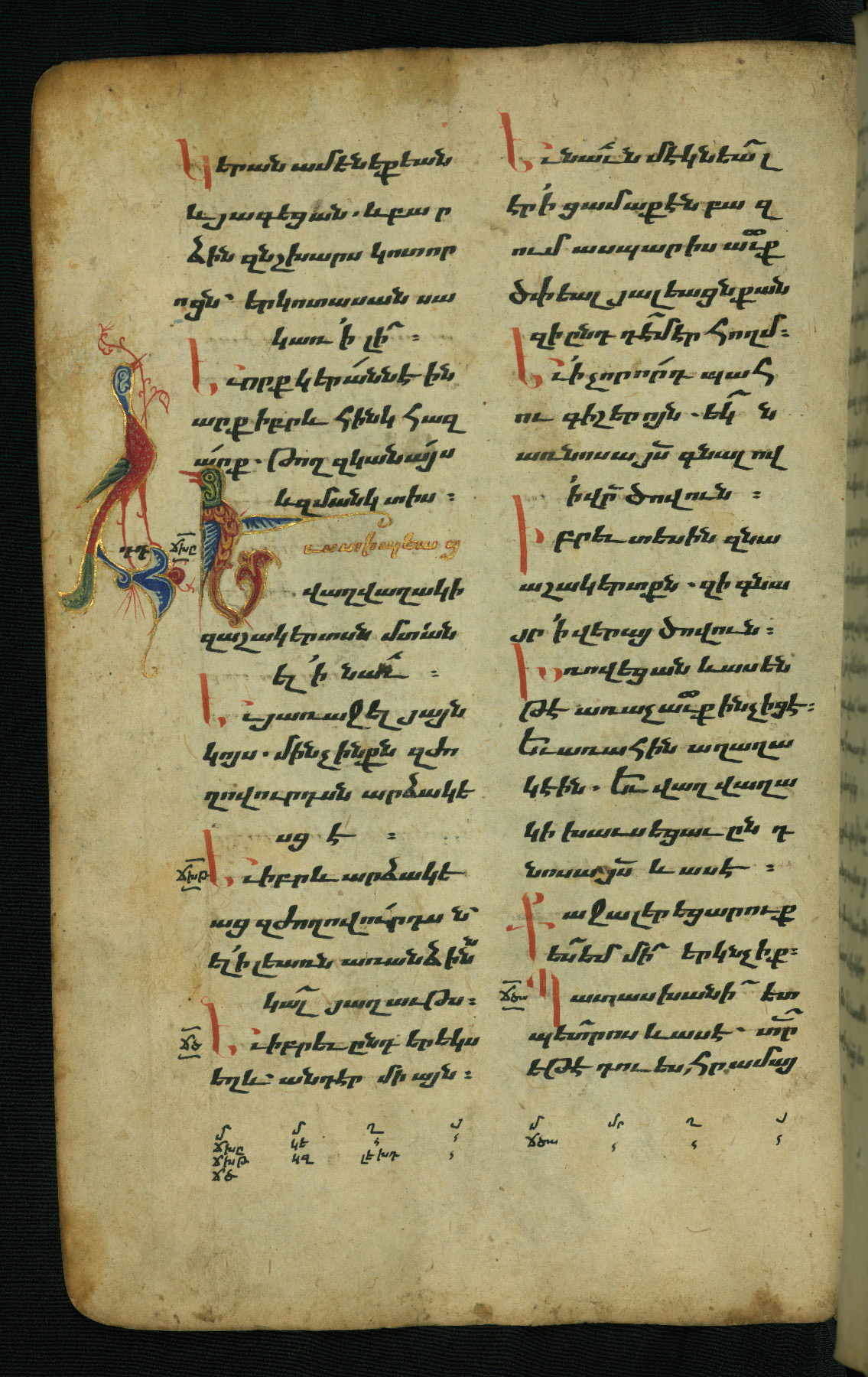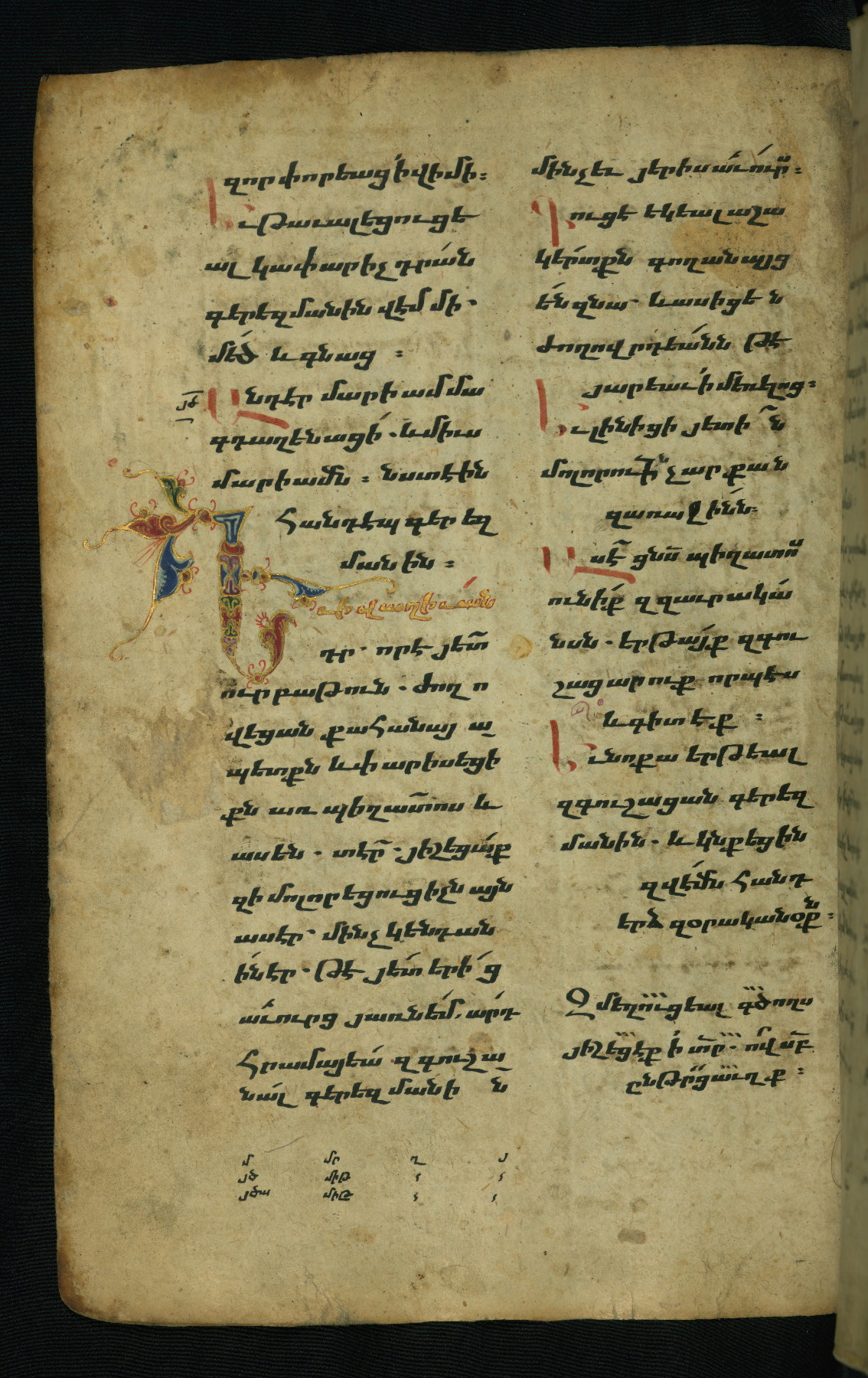 This manuscript was executed in 1475 CE by a scribe identified as Aristakes for a priest named Hakob. It contains a series of sixteen images on the life of Christ preceding the text of the Gospels, as well as the traditional Evangelist portraits, and there are marginal illustrations throughout. The style of the miniatures, which employ brilliant colors and emphasize decorative patterns, is characteristic of manuscript production in the region around Lake Van during the fifteenth century. The style of Lake Van has often been described in relation to schools of Islamic arts of the book. Numerous inscriptions (on fols. 258-260) spanning a few centuries attest to the manuscript's long history of use and revered preservation. The codex's later history included a rebinding with silver covers from Kayseri that date to approximately 1700. This jeweled and enameled silver binding bears a composition of the Adoration of the Magi on the front and the Ascension on the back.