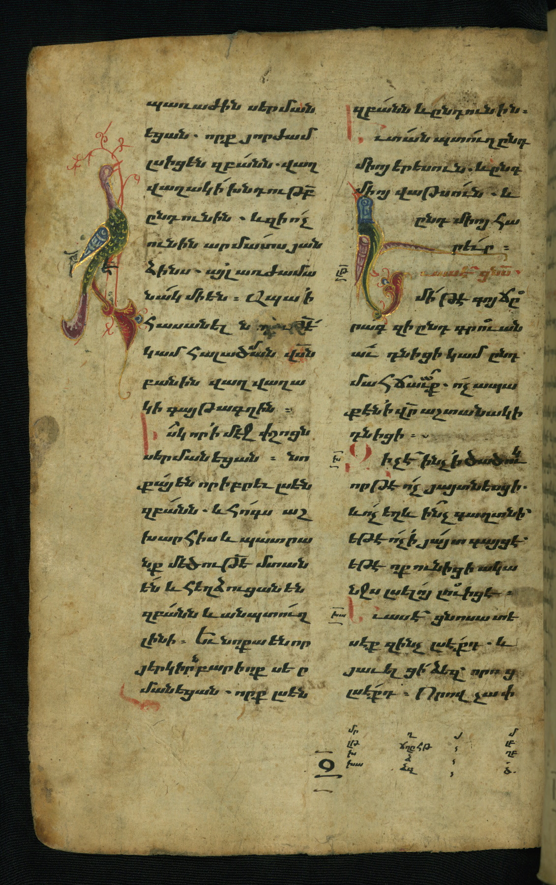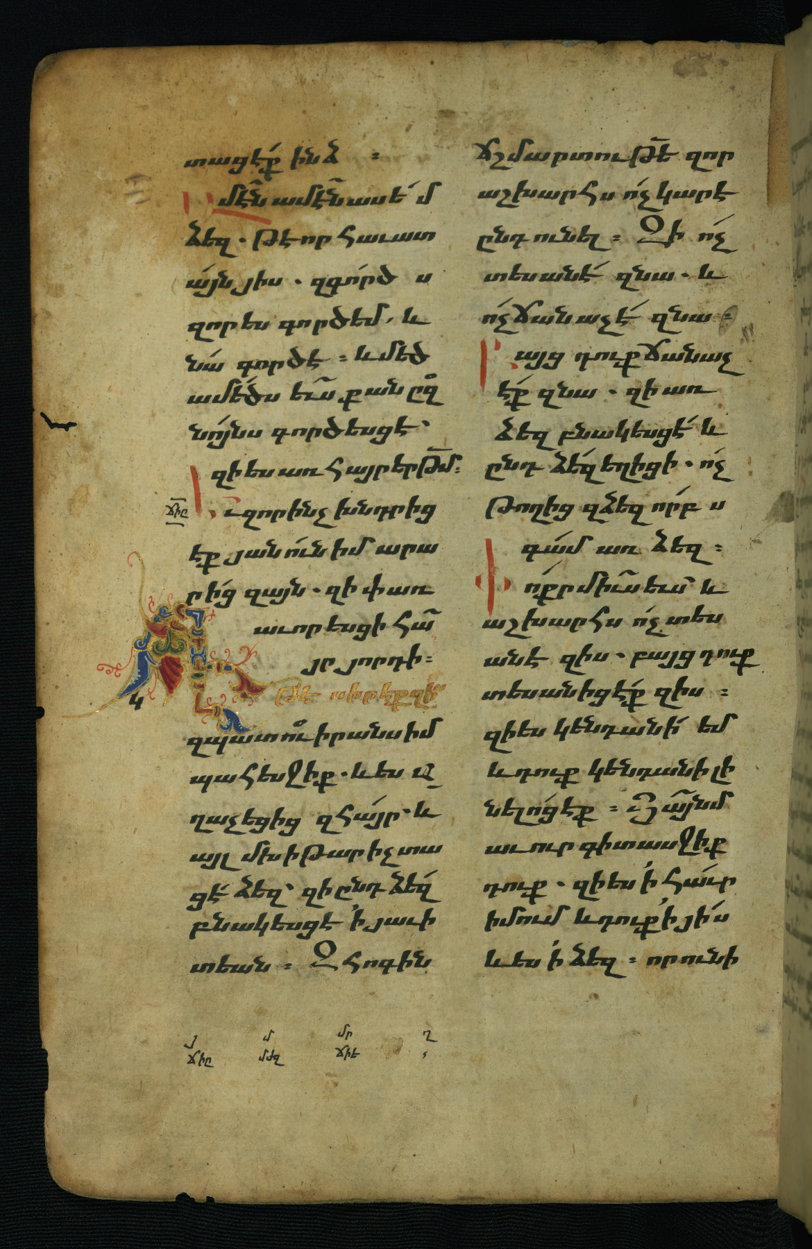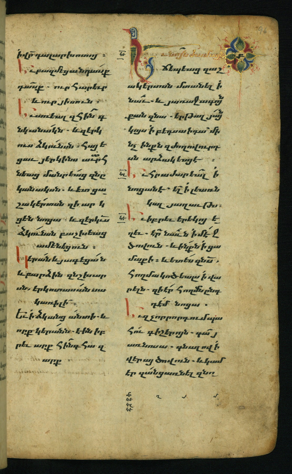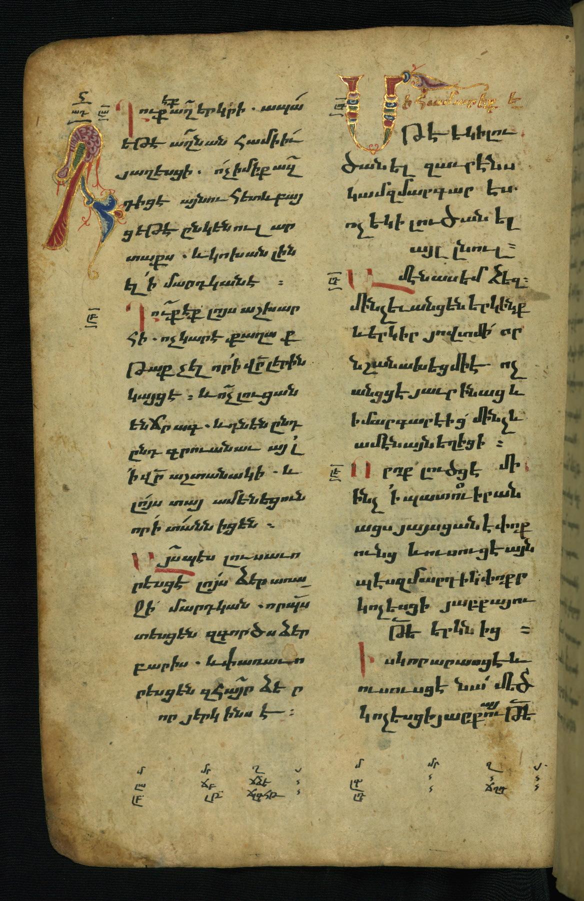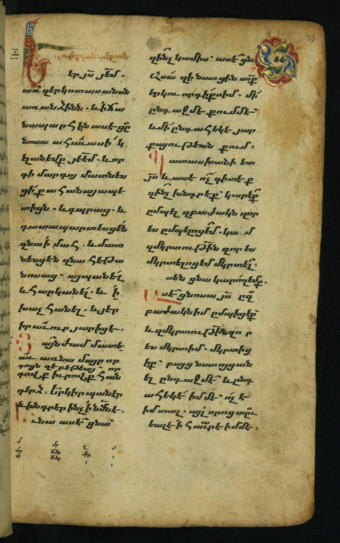 This manuscript was executed in 1475 CE by a scribe identified as Aristakes for a priest named Hakob. It contains a series of sixteen images on the life of Christ preceding the text of the Gospels, as well as the traditional Evangelist portraits, and there are marginal illustrations throughout. The style of the miniatures, which employ brilliant colors and emphasize decorative patterns, is characteristic of manuscript production in the region around Lake Van during the fifteenth century. The style of Lake Van has often been described in relation to schools of Islamic arts of the book. Numerous inscriptions (on fols. 258-260) spanning a few centuries attest to the manuscript's long history of use and revered preservation. The codex's later history included a rebinding with silver covers from Kayseri that date to approximately 1700. This jeweled and enameled silver binding bears a composition of the Adoration of the Magi on the front and the Ascension on the back.