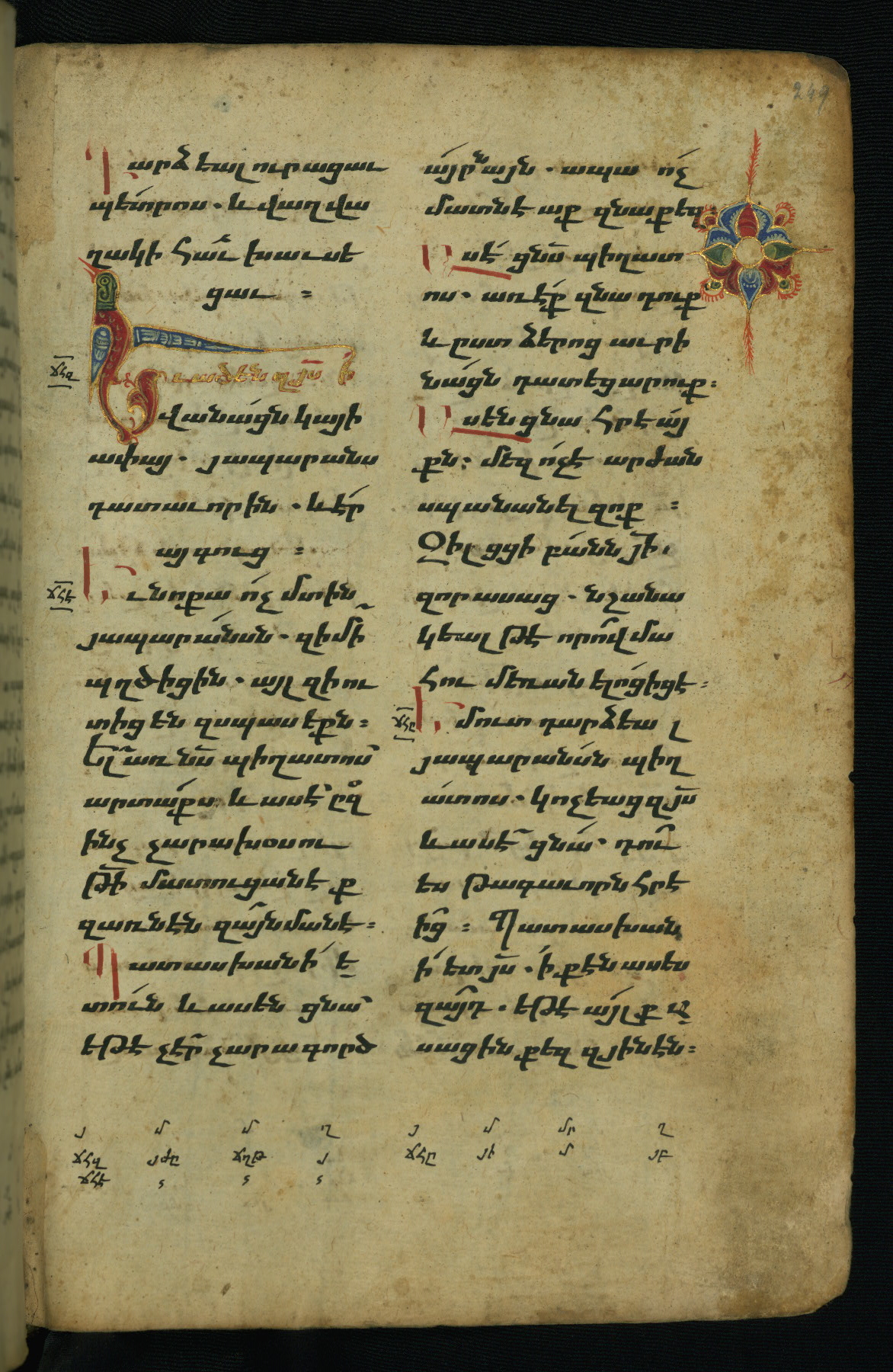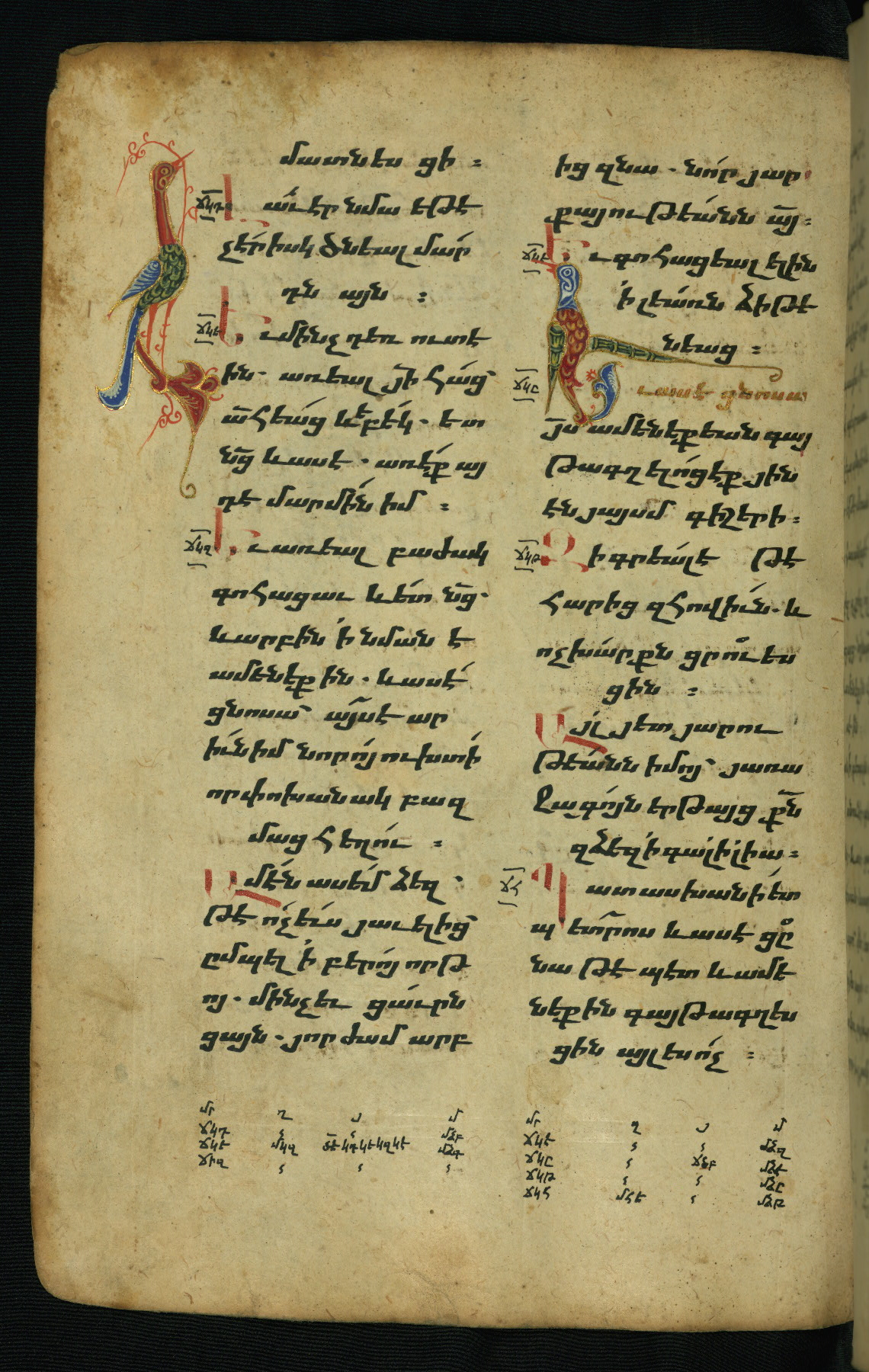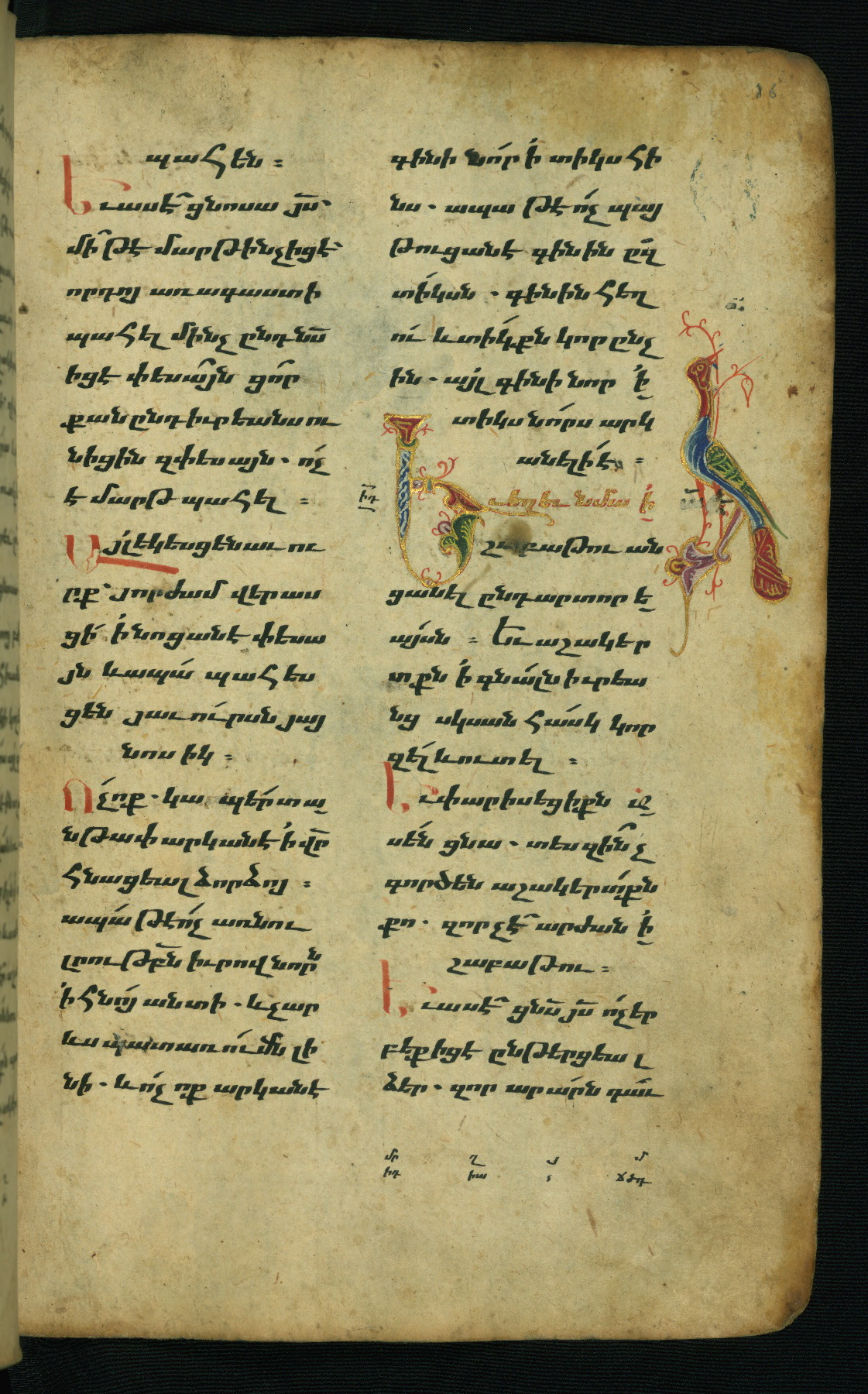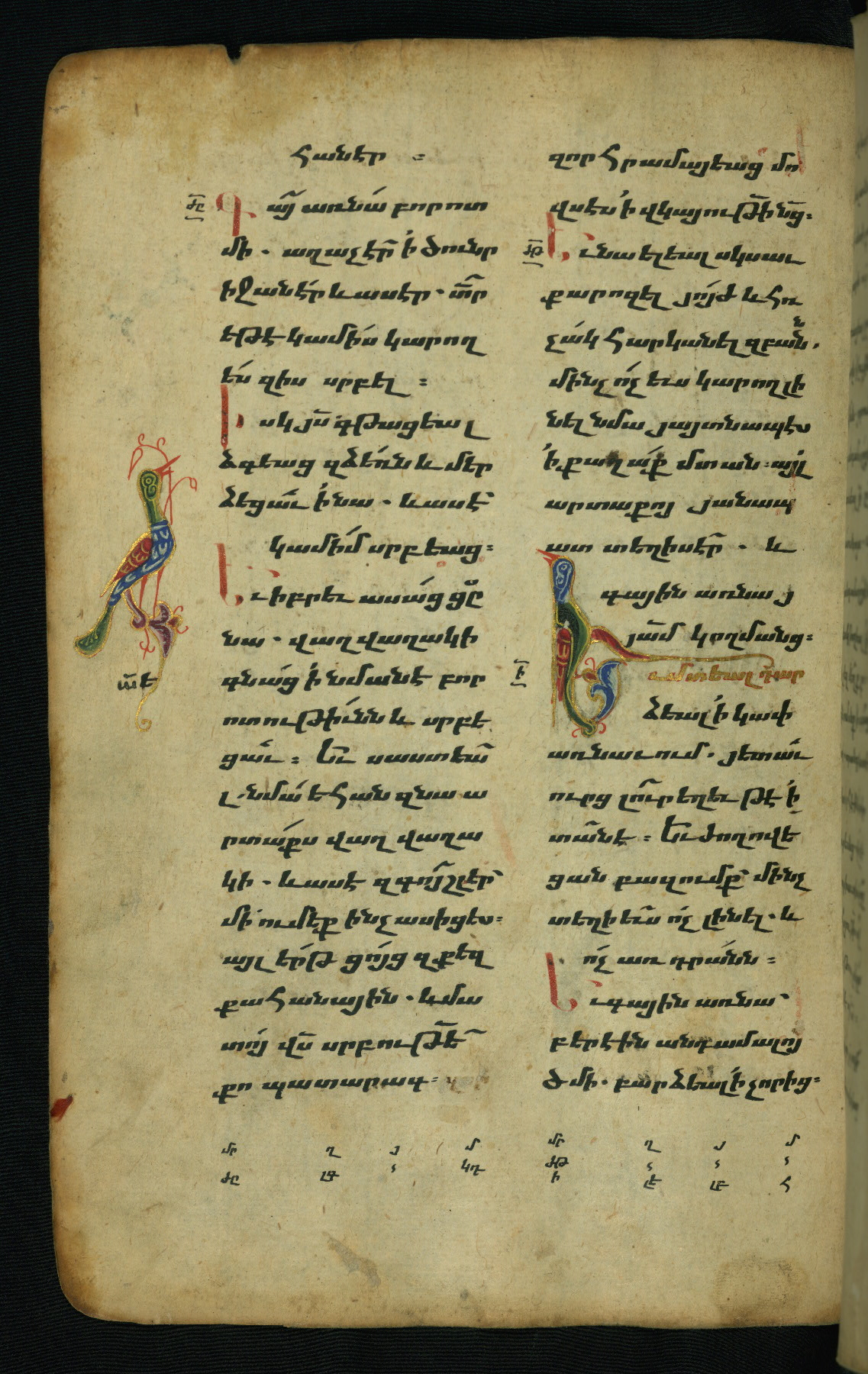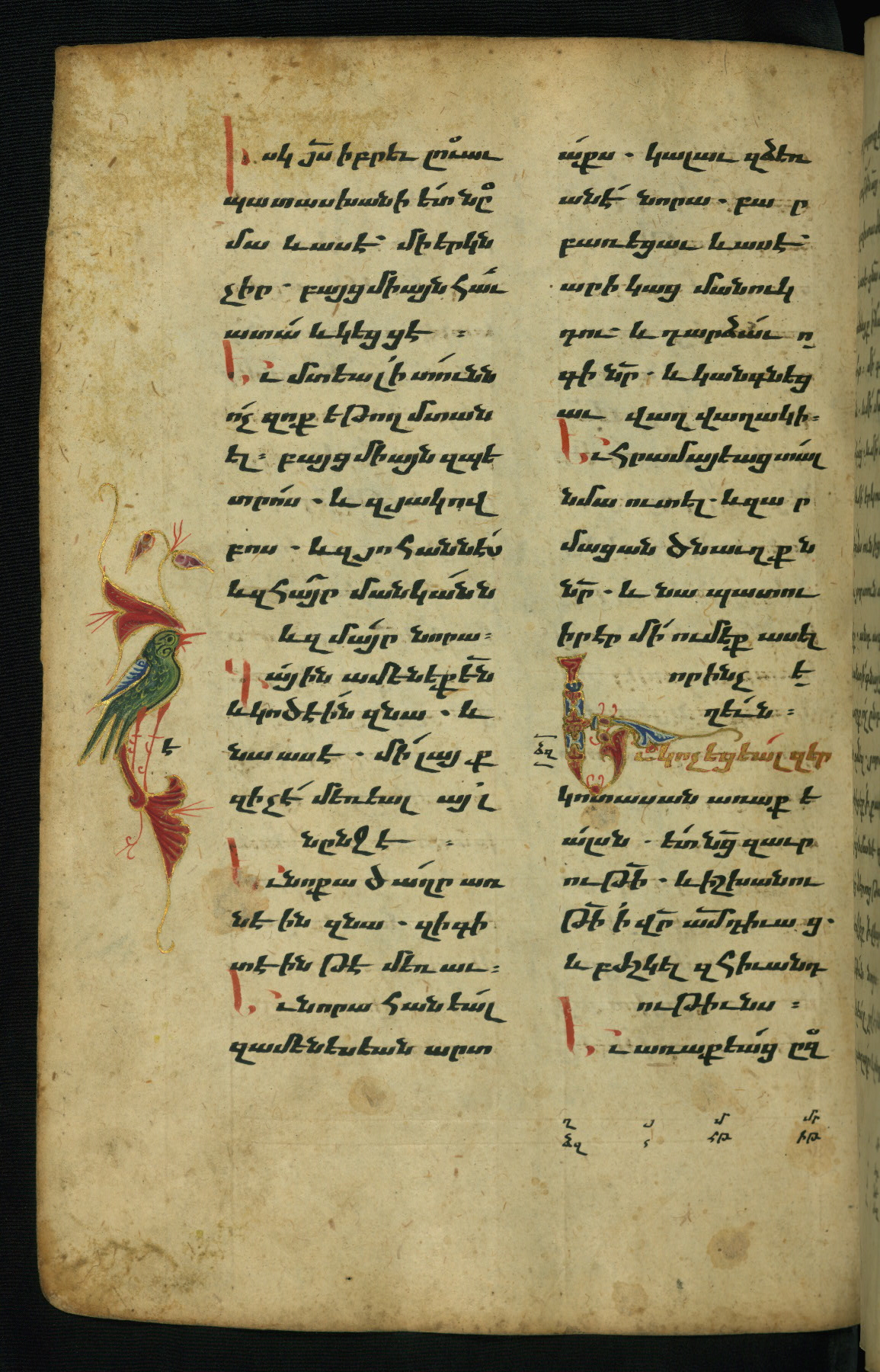This manuscript was executed in 1475 CE by a scribe identified as Aristakes for a priest named Hakob. It contains a series of sixteen images on the life of Christ preceding the text of the Gospels, as well as the traditional Evangelist portraits, and there are marginal illustrations throughout. The style of the miniatures, which employ brilliant colors and emphasize decorative patterns, is characteristic of manuscript production in the region around Lake Van during the fifteenth century. The style of Lake Van has often been described in relation to schools of Islamic arts of the book. Numerous inscriptions (on fols. 258-260) spanning a few centuries attest to the manuscript's long history of use and revered preservation. The codex's later history included a rebinding with silver covers from Kayseri that date to approximately 1700. This jeweled and enameled silver binding bears a composition of the Adoration of the Magi on the front and the Ascension on the back.