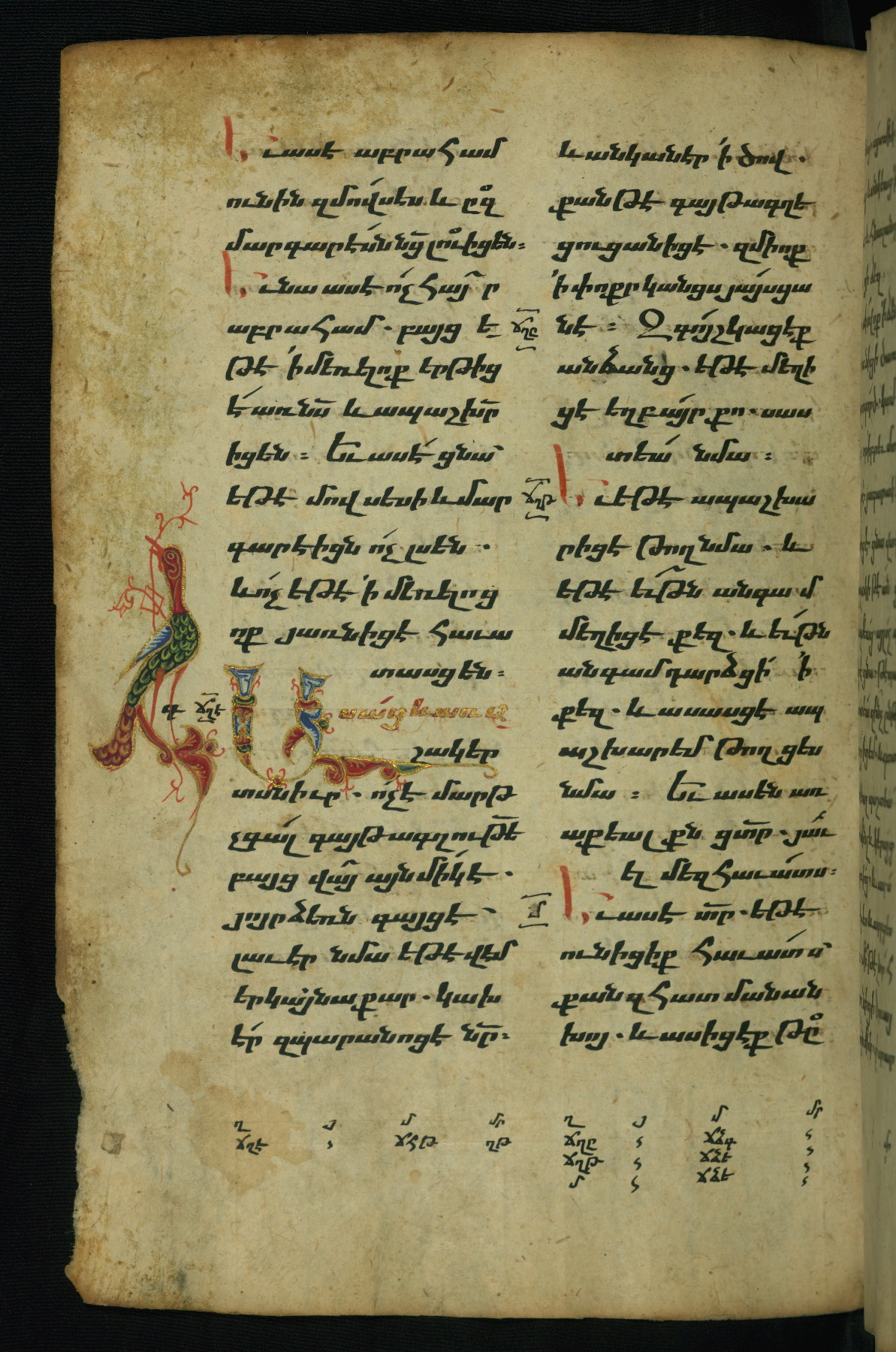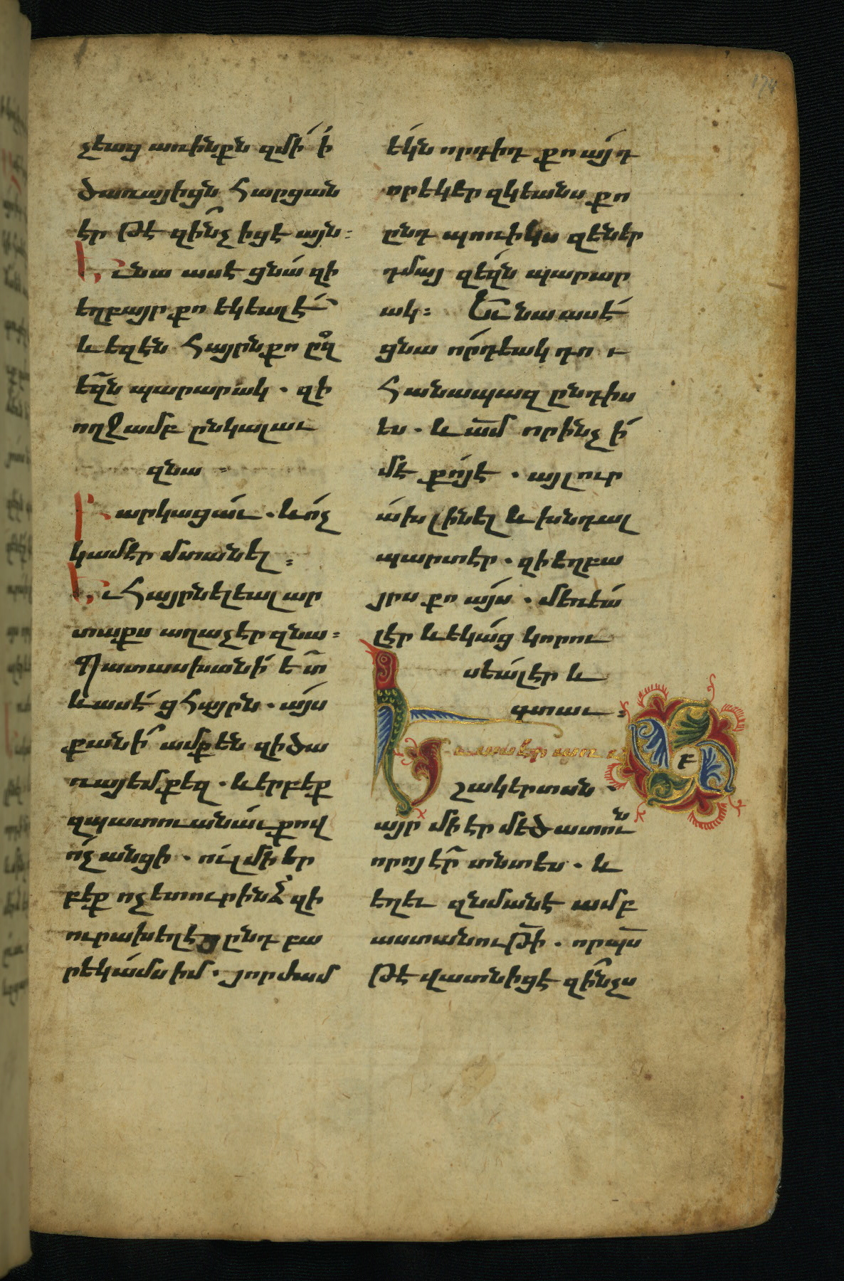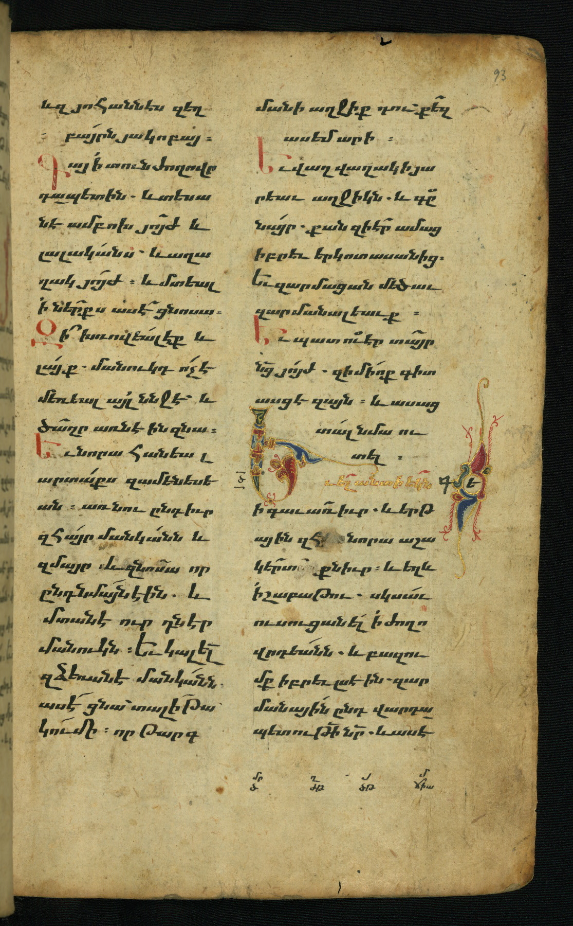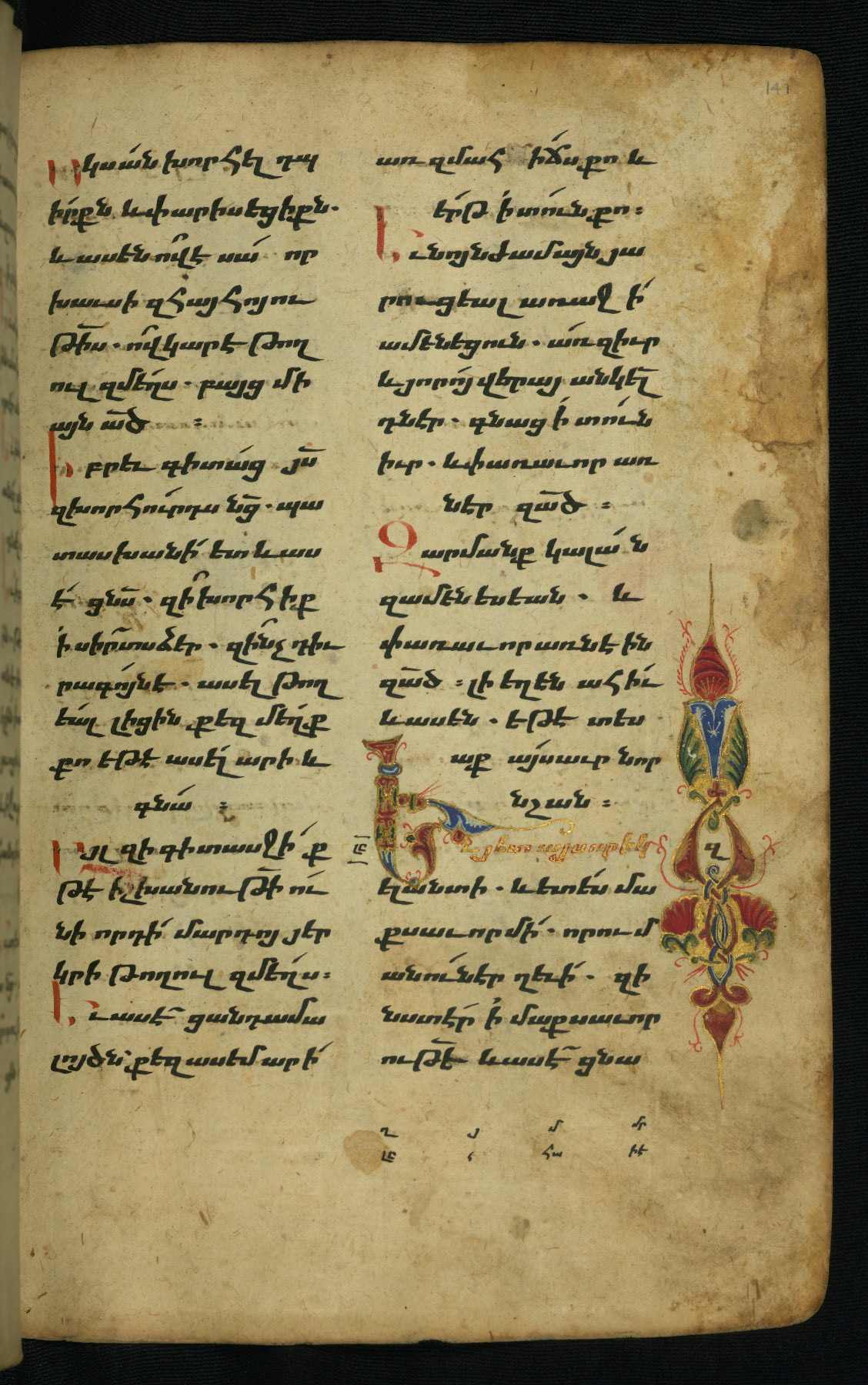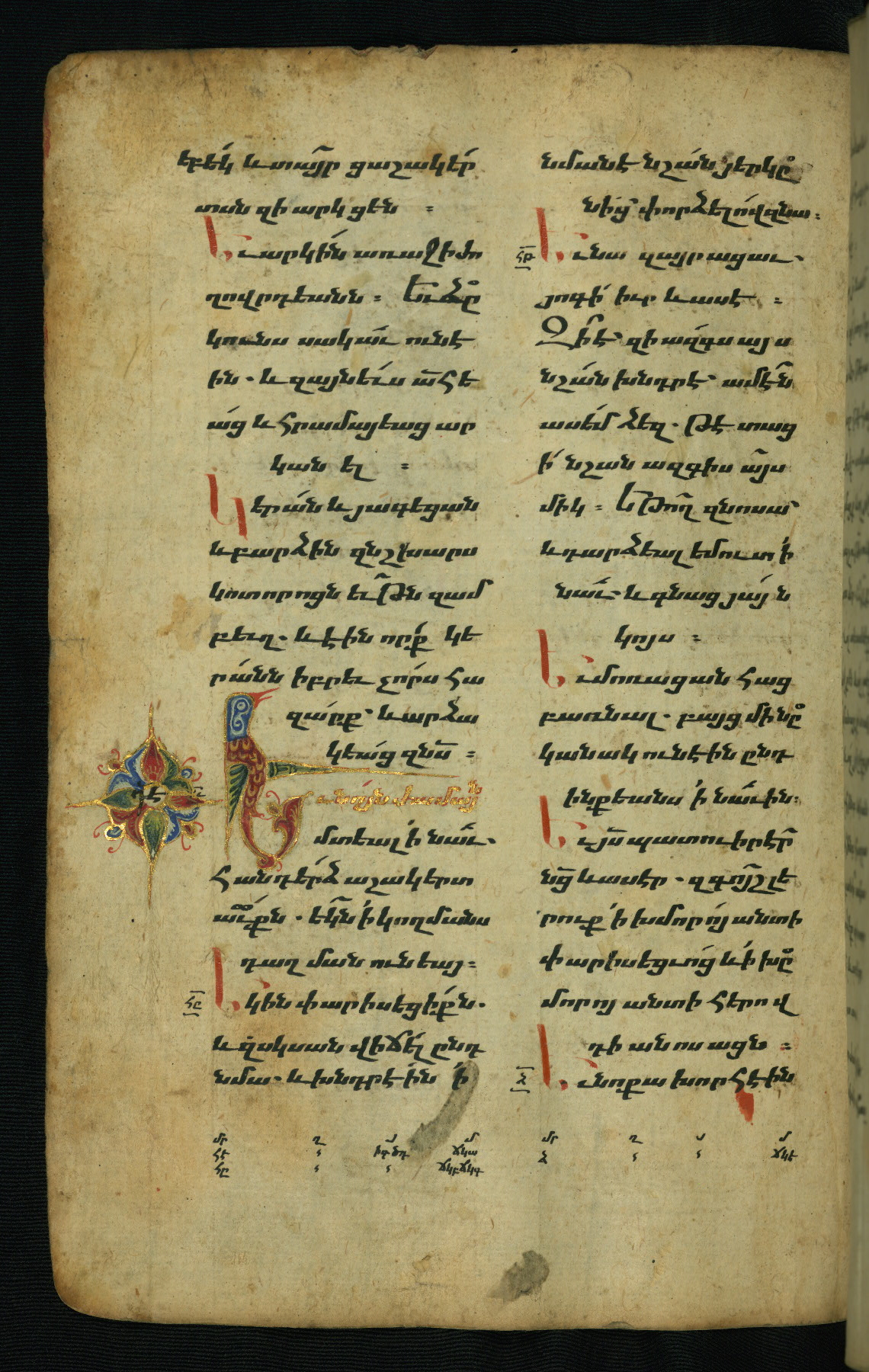 This manuscript was executed in 1475 CE by a scribe identified as Aristakes for a priest named Hakob. It contains a series of sixteen images on the life of Christ preceding the text of the Gospels, as well as the traditional Evangelist portraits, and there are marginal illustrations throughout. The style of the miniatures, which employ brilliant colors and emphasize decorative patterns, is characteristic of manuscript production in the region around Lake Van during the fifteenth century. The style of Lake Van has often been described in relation to schools of Islamic arts of the book. Numerous inscriptions (on fols. 258-260) spanning a few centuries attest to the manuscript's long history of use and revered preservation. The codex's later history included a rebinding with silver covers from Kayseri that date to approximately 1700. This jeweled and enameled silver binding bears a composition of the Adoration of the Magi on the front and the Ascension on the back.