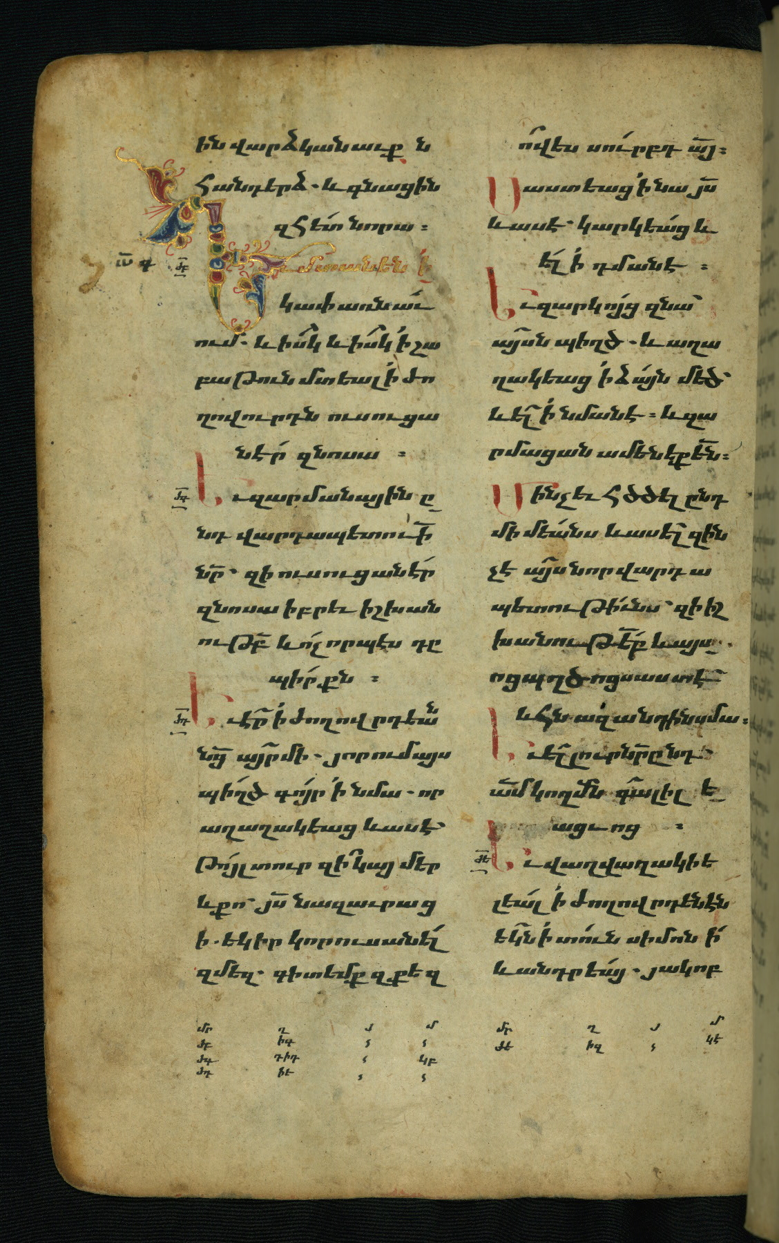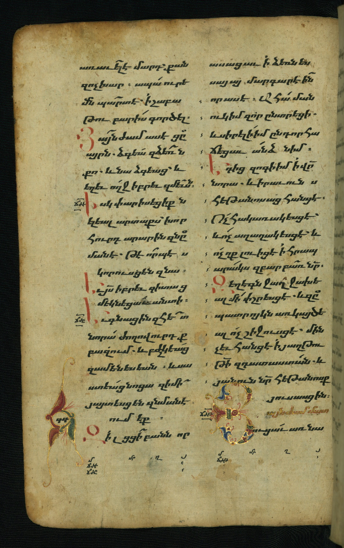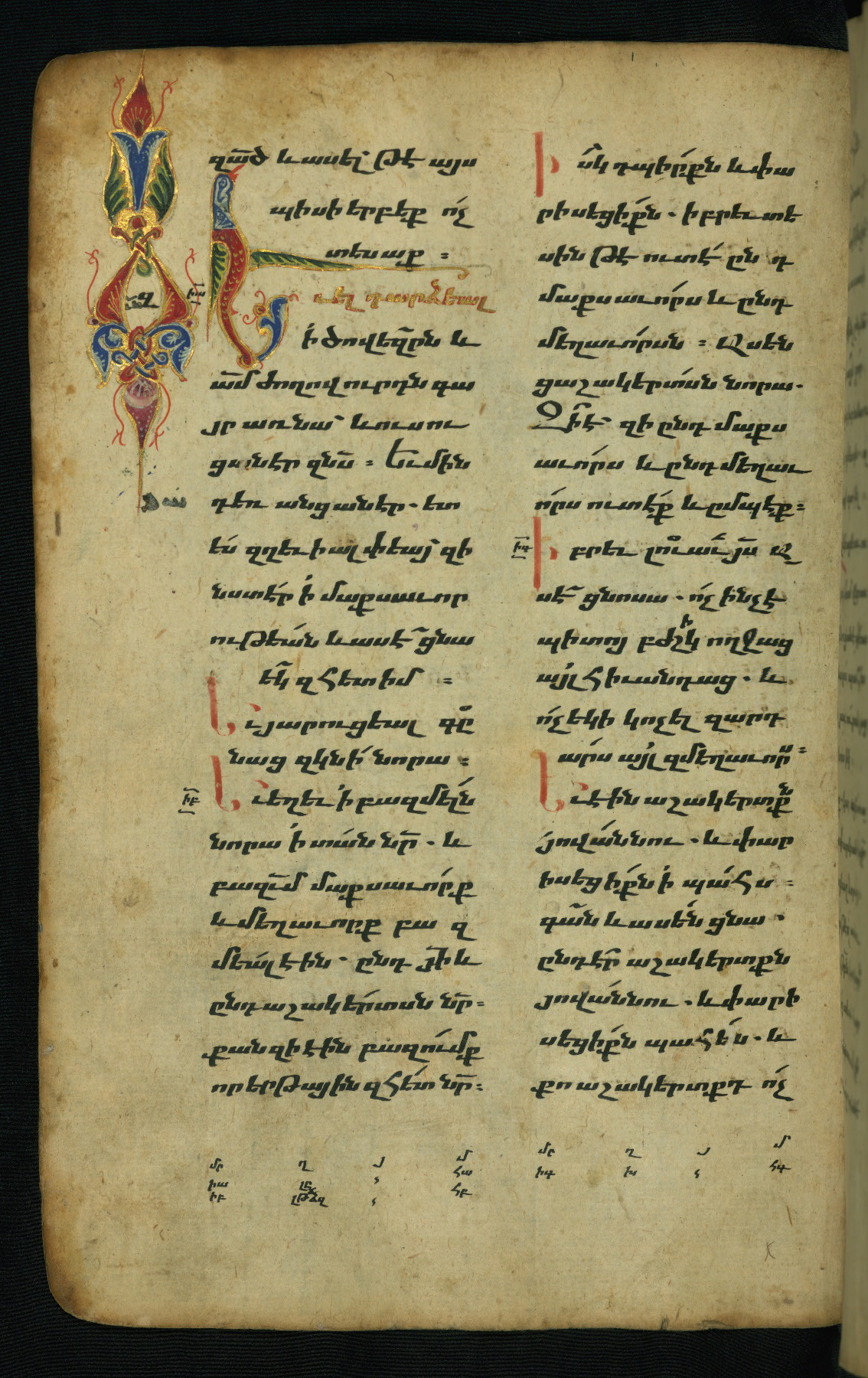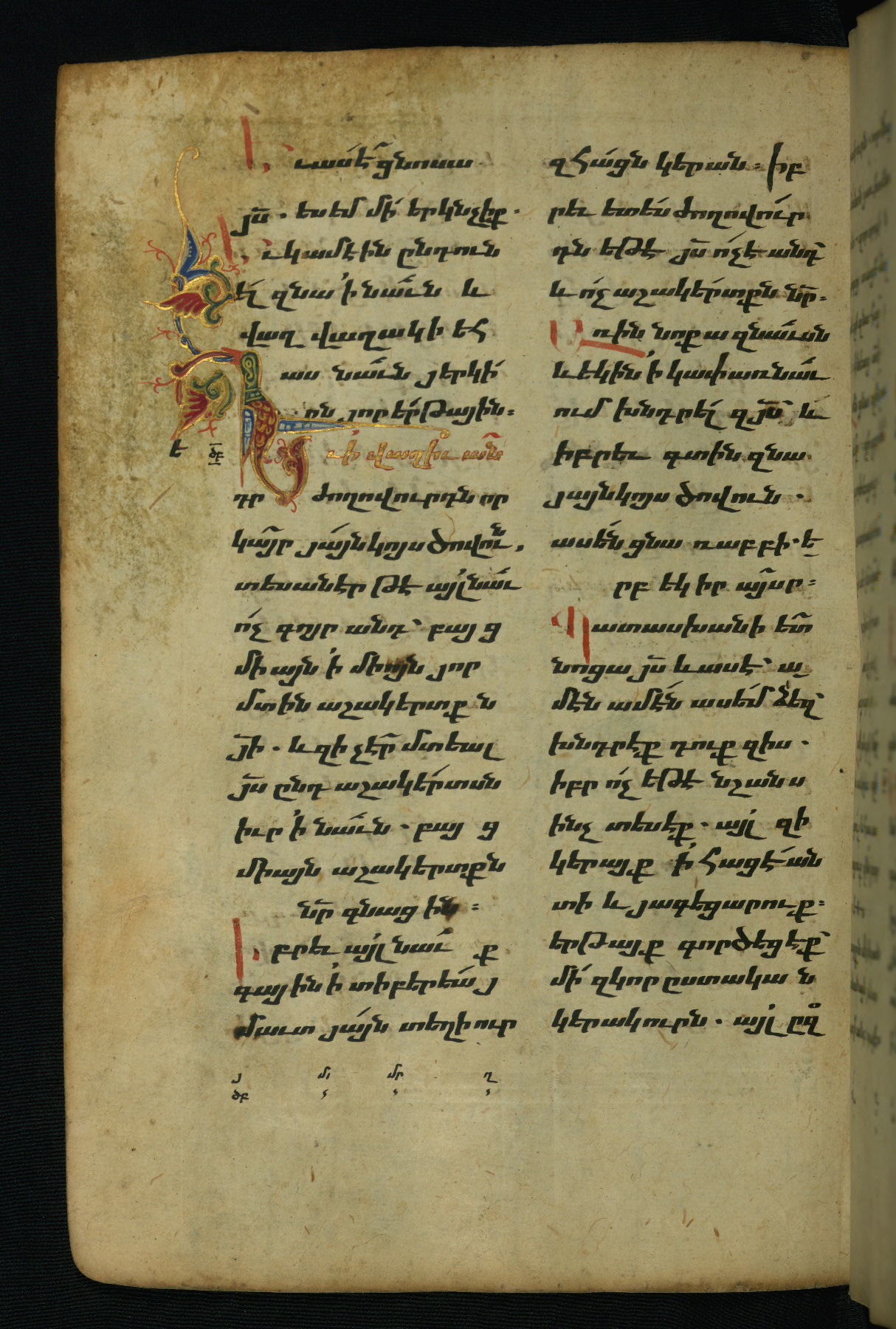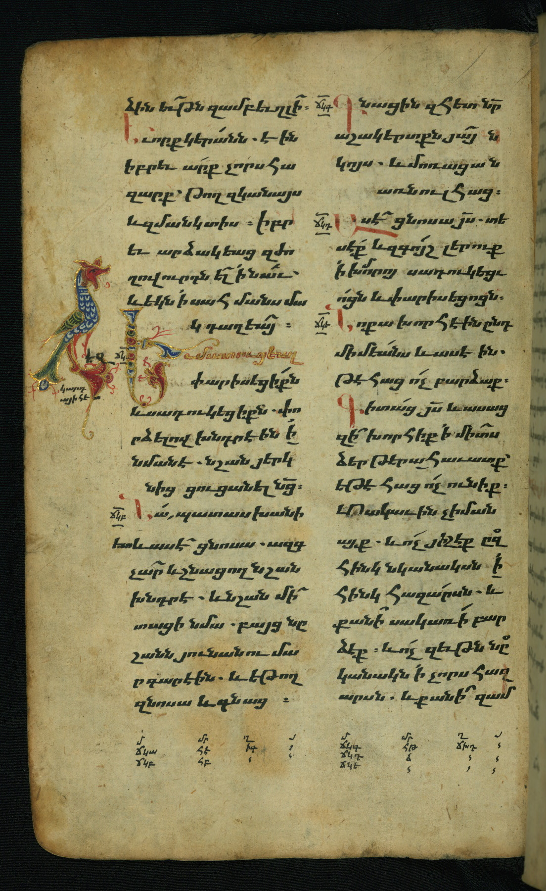 This manuscript was executed in 1475 CE by a scribe identified as Aristakes for a priest named Hakob. It contains a series of sixteen images on the life of Christ preceding the text of the Gospels, as well as the traditional Evangelist portraits, and there are marginal illustrations throughout. The style of the miniatures, which employ brilliant colors and emphasize decorative patterns, is characteristic of manuscript production in the region around Lake Van during the fifteenth century. The style of Lake Van has often been described in relation to schools of Islamic arts of the book. Numerous inscriptions (on fols. 258-260) spanning a few centuries attest to the manuscript's long history of use and revered preservation. The codex's later history included a rebinding with silver covers from Kayseri that date to approximately 1700. This jeweled and enameled silver binding bears a composition of the Adoration of the Magi on the front and the Ascension on the back.