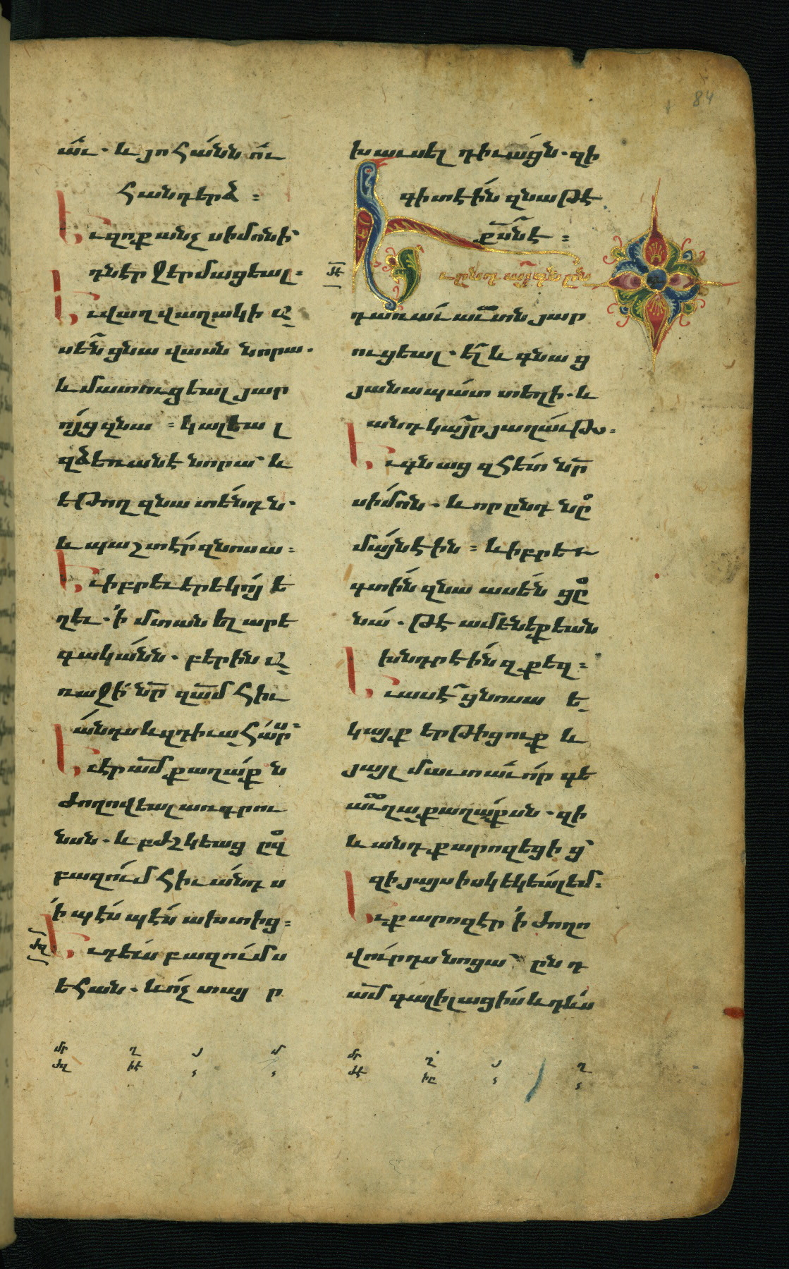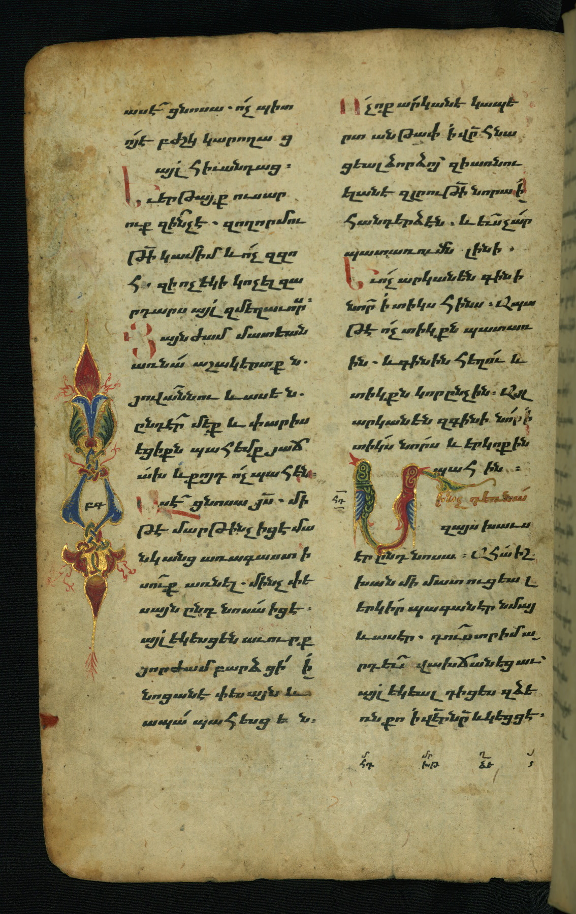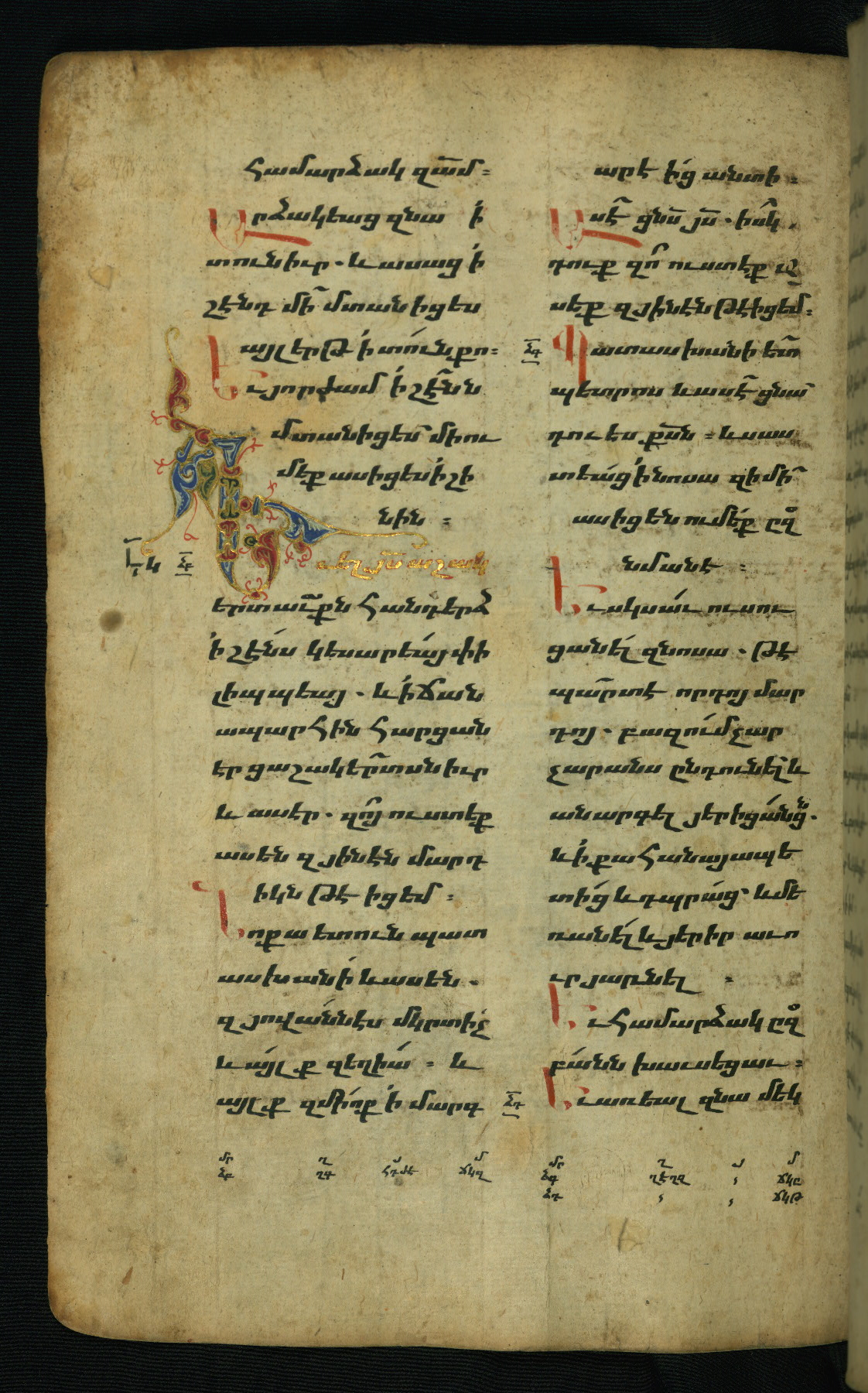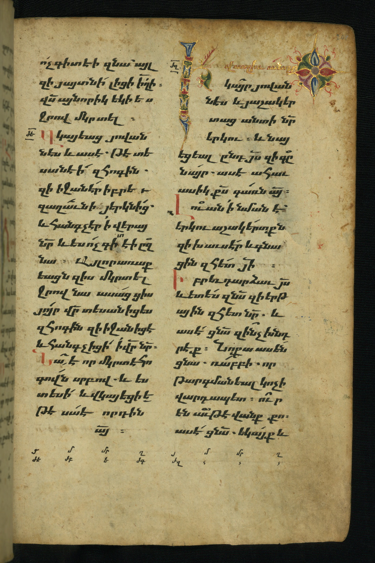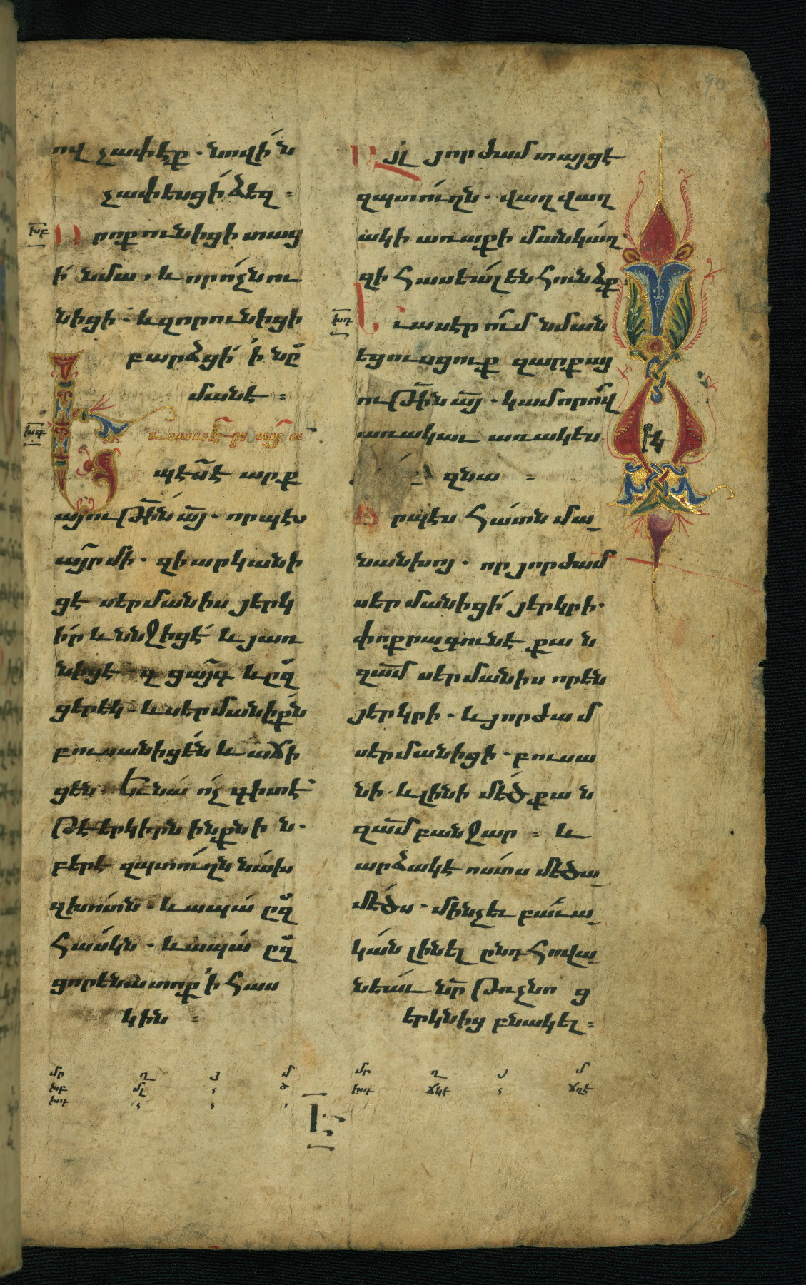 This manuscript was executed in 1475 CE by a scribe identified as Aristakes for a priest named Hakob. It contains a series of sixteen images on the life of Christ preceding the text of the Gospels, as well as the traditional Evangelist portraits, and there are marginal illustrations throughout. The style of the miniatures, which employ brilliant colors and emphasize decorative patterns, is characteristic of manuscript production in the region around Lake Van during the fifteenth century. The style of Lake Van has often been described in relation to schools of Islamic arts of the book. Numerous inscriptions (on fols. 258-260) spanning a few centuries attest to the manuscript's long history of use and revered preservation. The codex's later history included a rebinding with silver covers from Kayseri that date to approximately 1700. This jeweled and enameled silver binding bears a composition of the Adoration of the Magi on the front and the Ascension on the back.