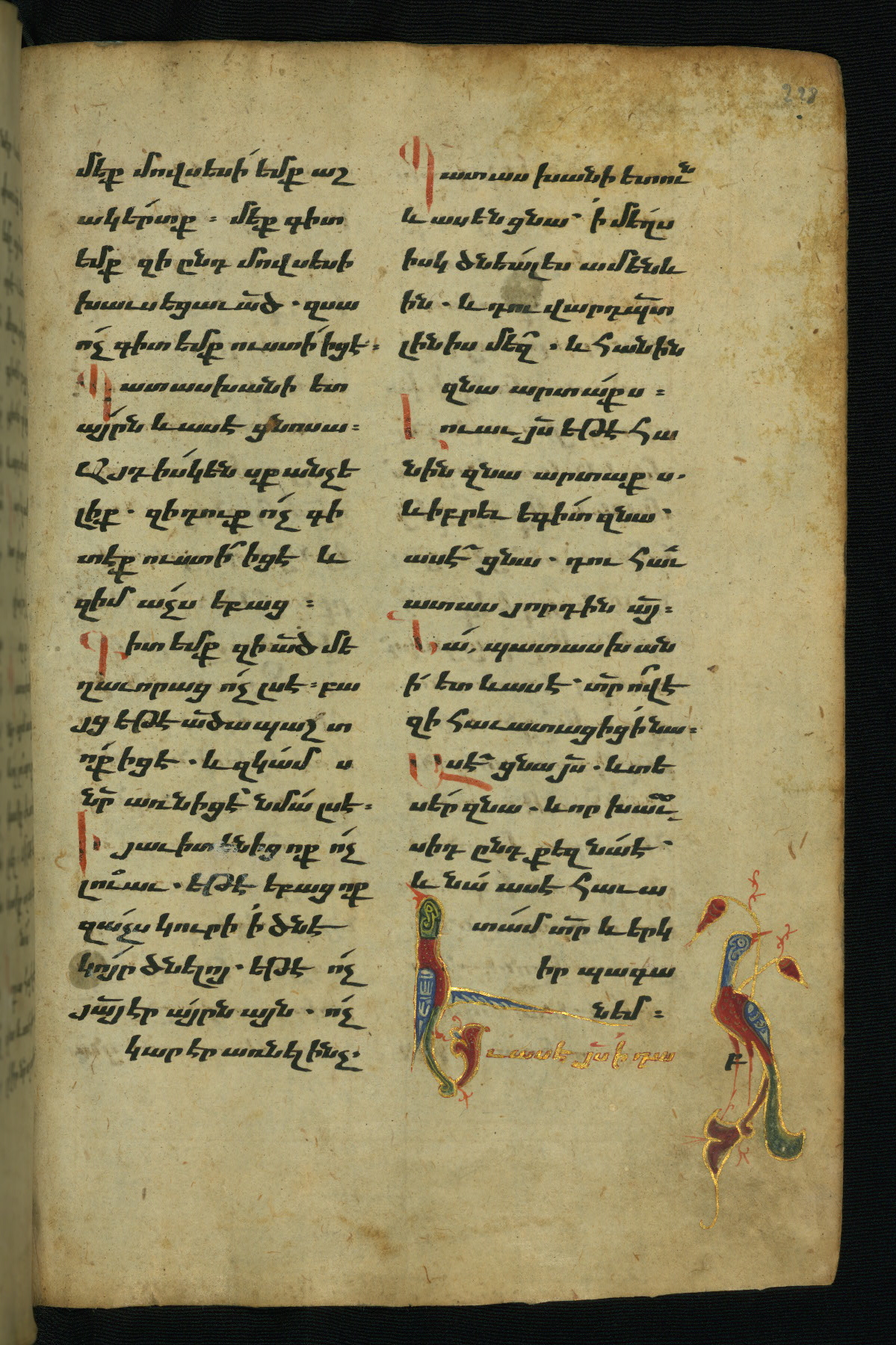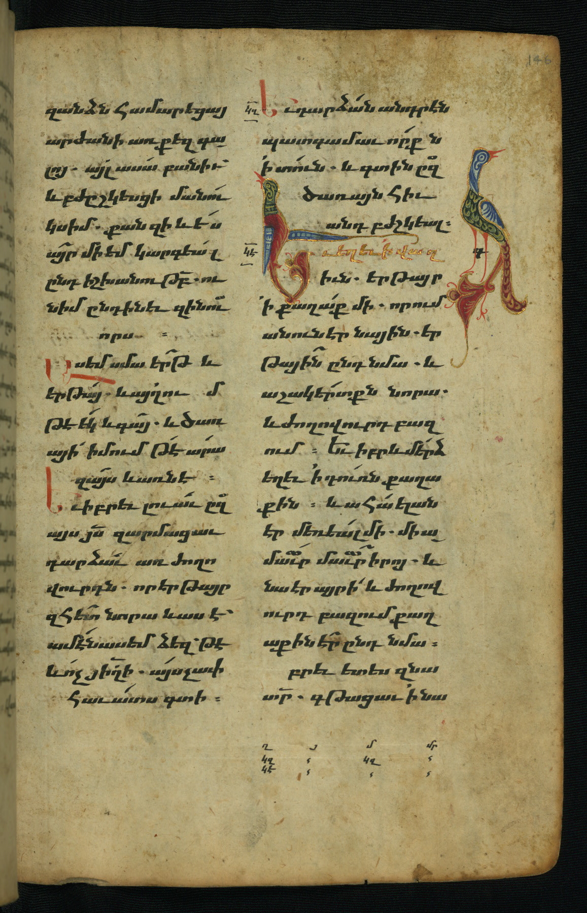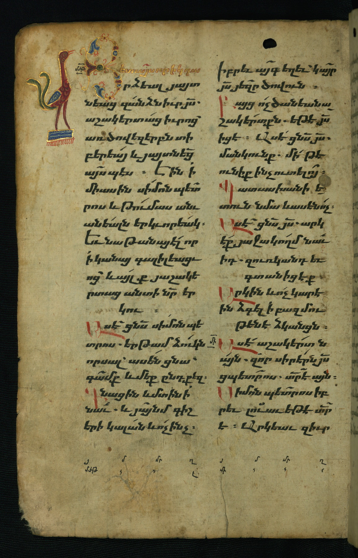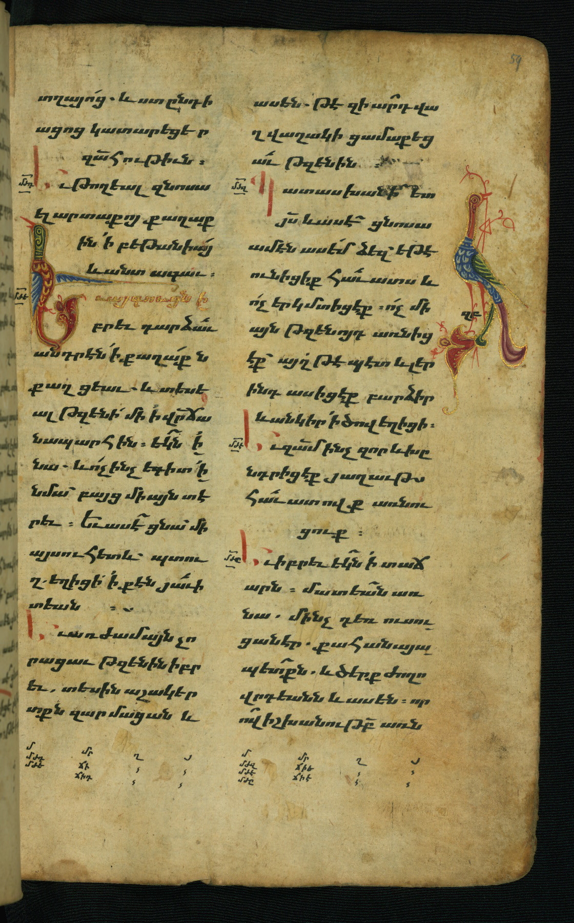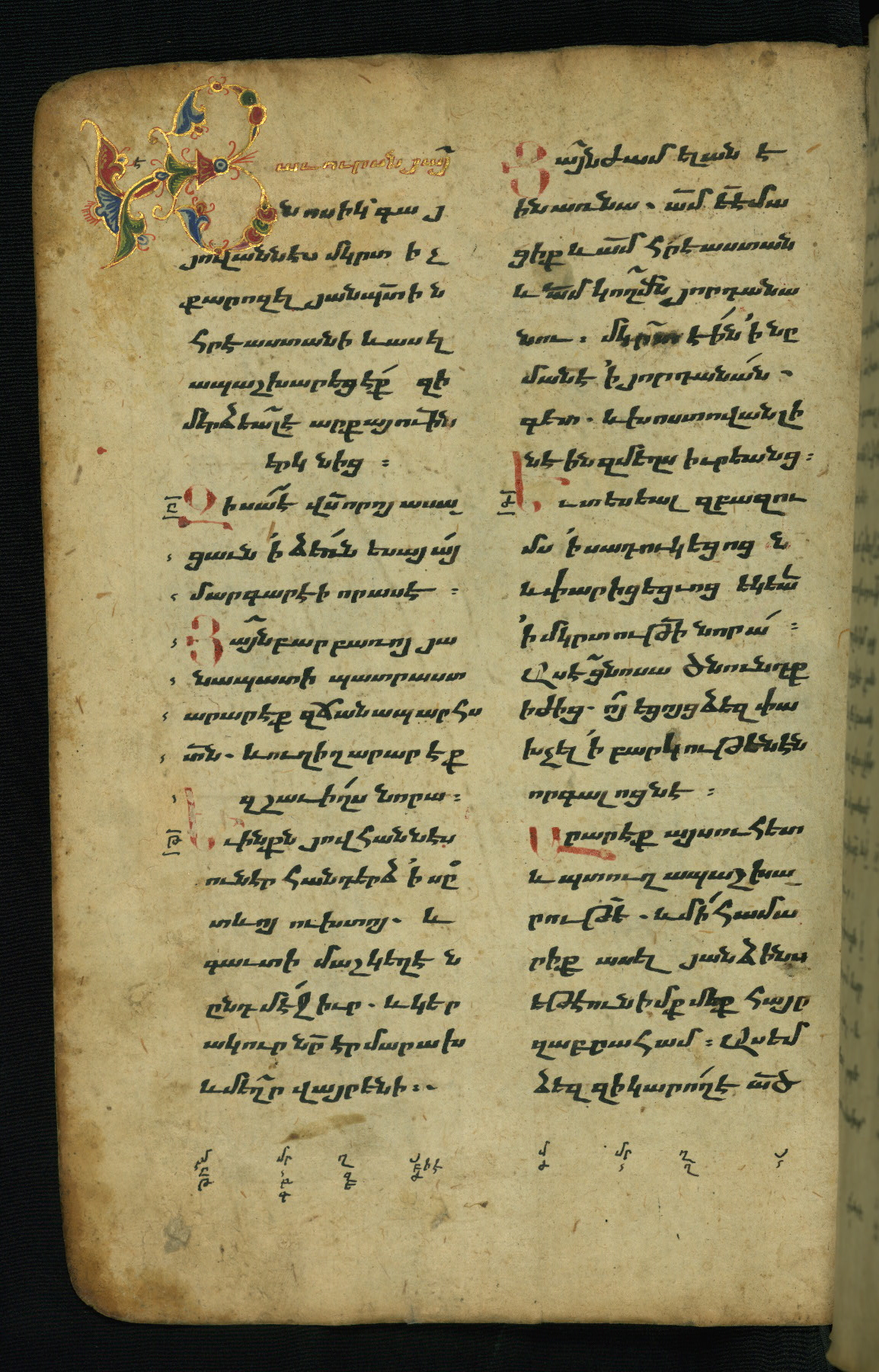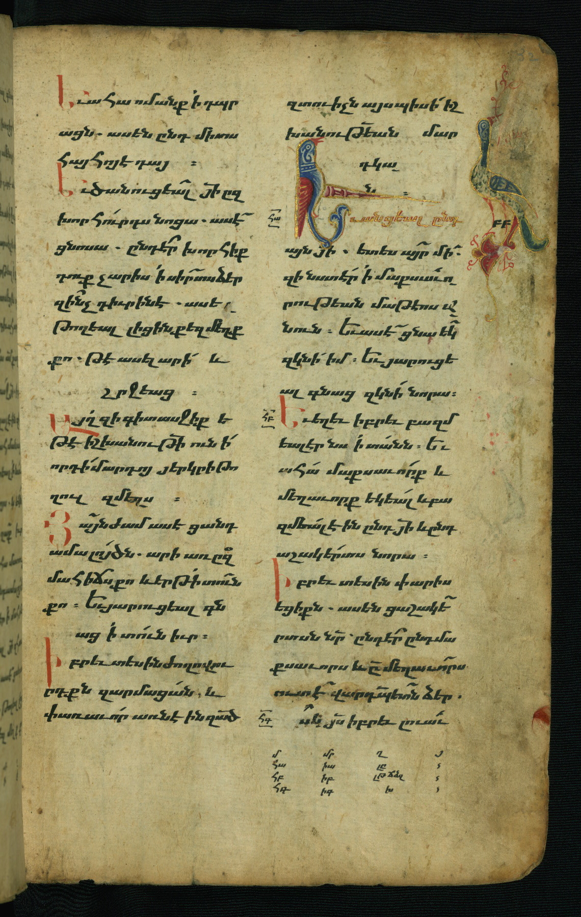 This manuscript was executed in 1475 CE by a scribe identified as Aristakes for a priest named Hakob. It contains a series of sixteen images on the life of Christ preceding the text of the Gospels, as well as the traditional Evangelist portraits, and there are marginal illustrations throughout. The style of the miniatures, which employ brilliant colors and emphasize decorative patterns, is characteristic of manuscript production in the region around Lake Van during the fifteenth century. The style of Lake Van has often been described in relation to schools of Islamic arts of the book. Numerous inscriptions (on fols. 258-260) spanning a few centuries attest to the manuscript's long history of use and revered preservation. The codex's later history included a rebinding with silver covers from Kayseri that date to approximately 1700. This jeweled and enameled silver binding bears a composition of the Adoration of the Magi on the front and the Ascension on the back.