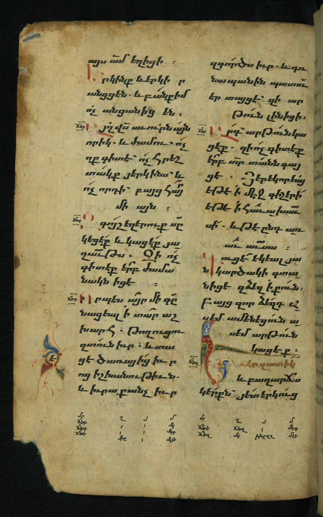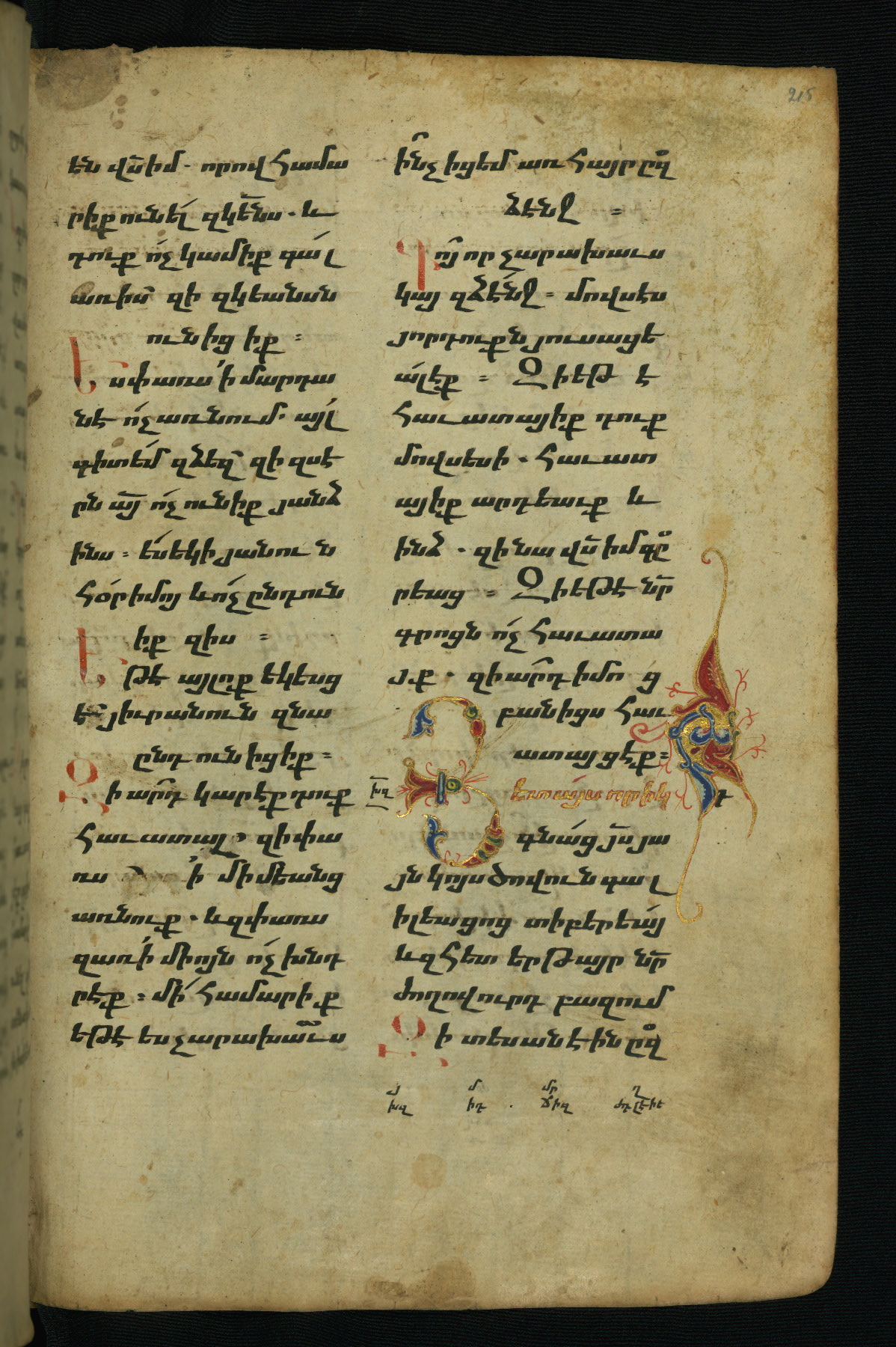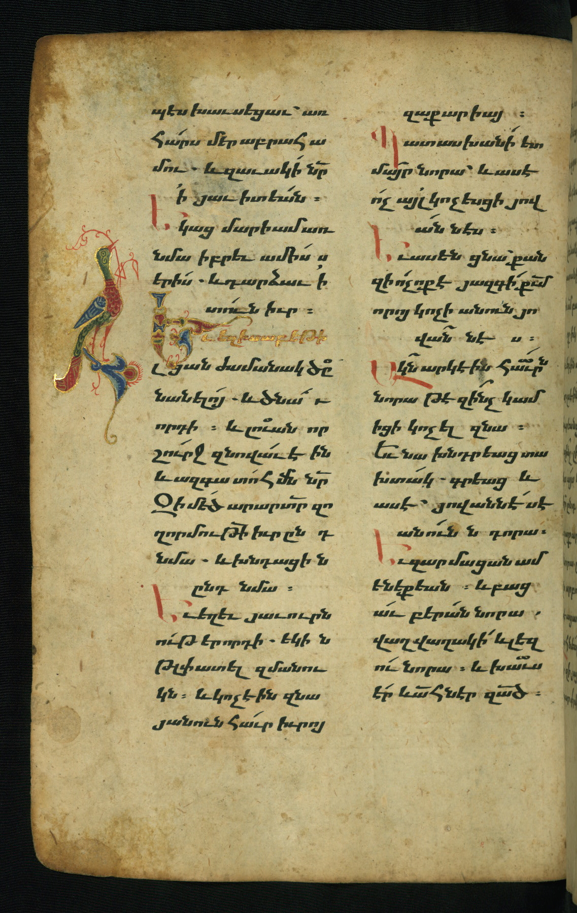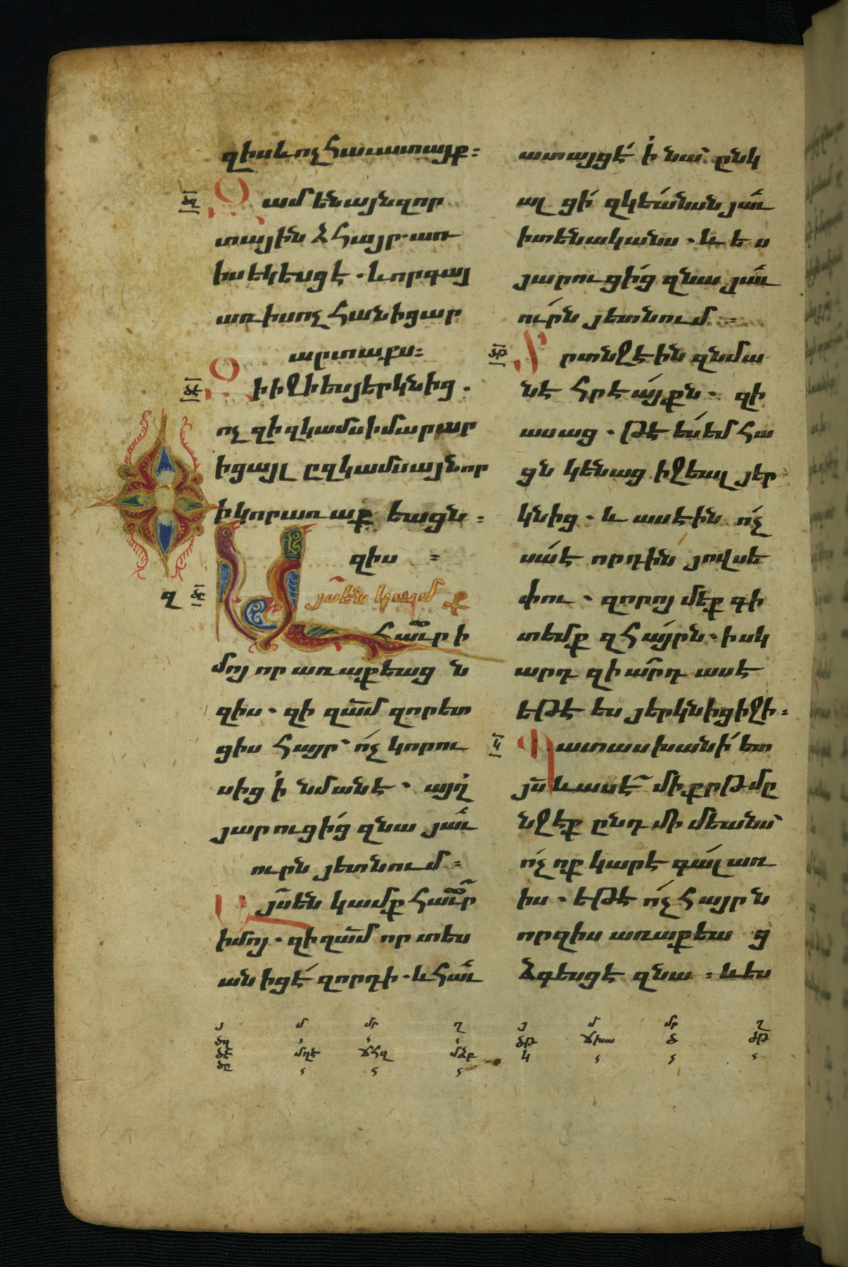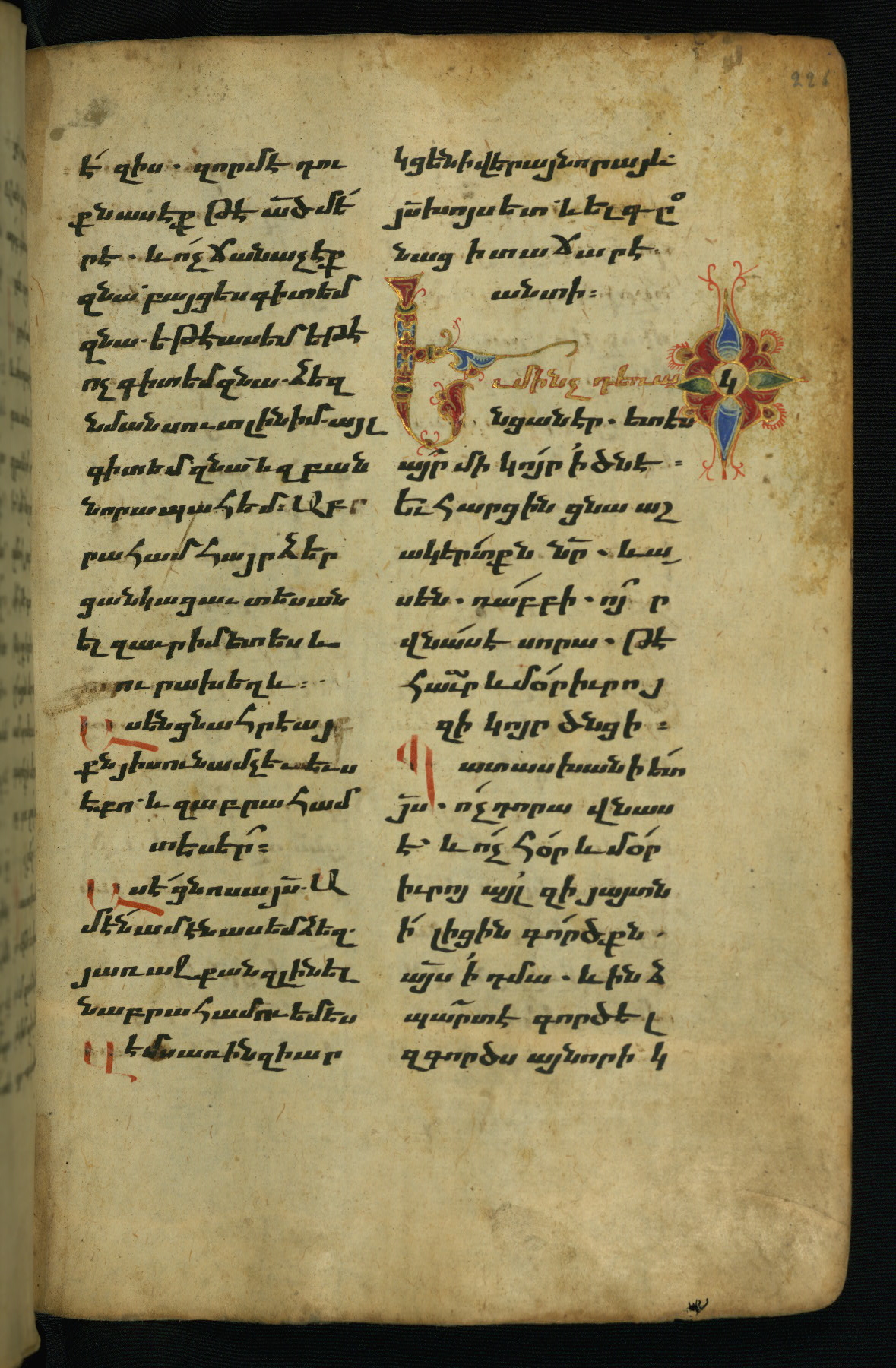 This manuscript was executed in 1475 CE by a scribe identified as Aristakes for a priest named Hakob. It contains a series of sixteen images on the life of Christ preceding the text of the Gospels, as well as the traditional Evangelist portraits, and there are marginal illustrations throughout. The style of the miniatures, which employ brilliant colors and emphasize decorative patterns, is characteristic of manuscript production in the region around Lake Van during the fifteenth century. The style of Lake Van has often been described in relation to schools of Islamic arts of the book. Numerous inscriptions (on fols. 258-260) spanning a few centuries attest to the manuscript's long history of use and revered preservation. The codex's later history included a rebinding with silver covers from Kayseri that date to approximately 1700. This jeweled and enameled silver binding bears a composition of the Adoration of the Magi on the front and the Ascension on the back.