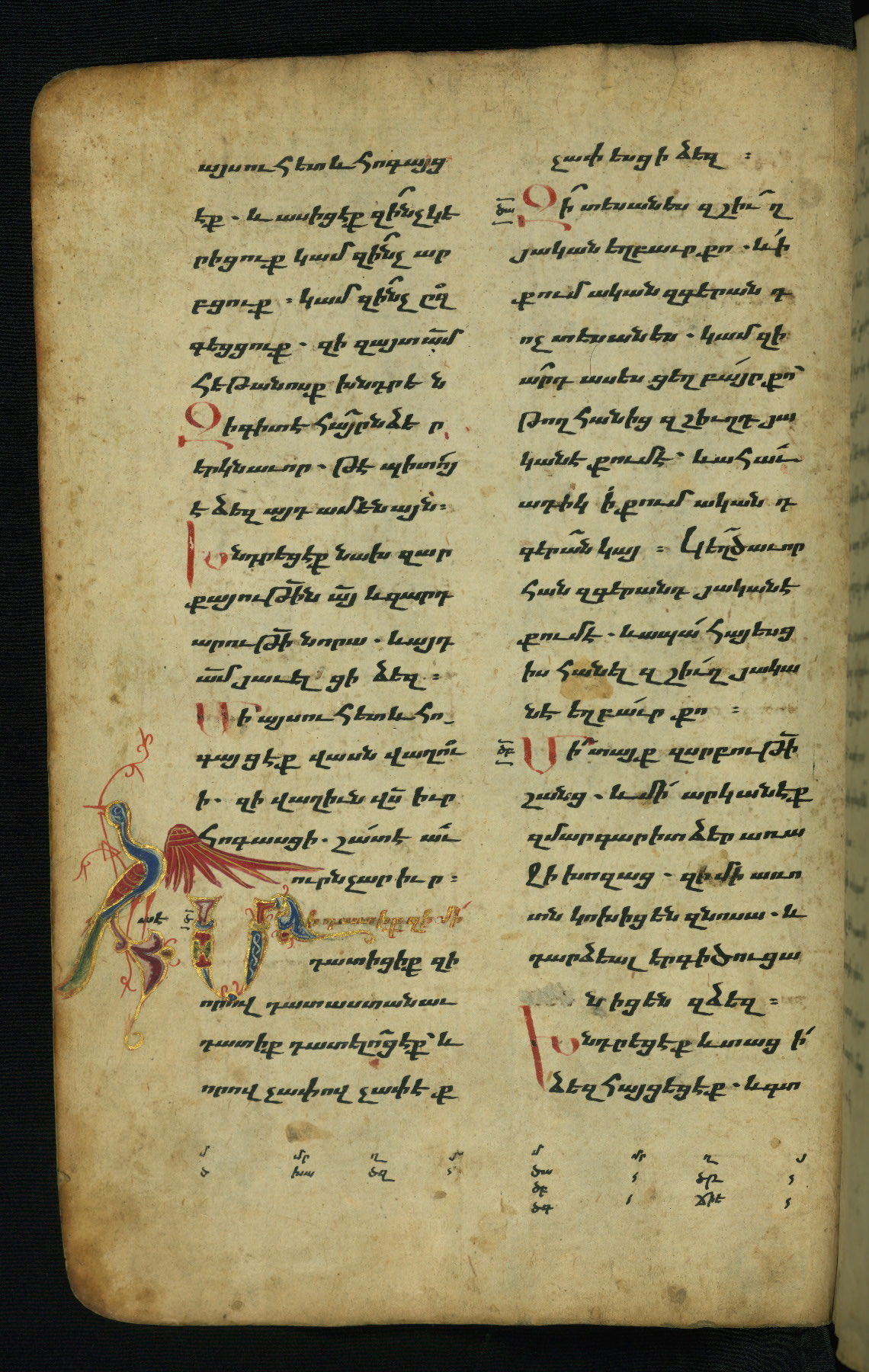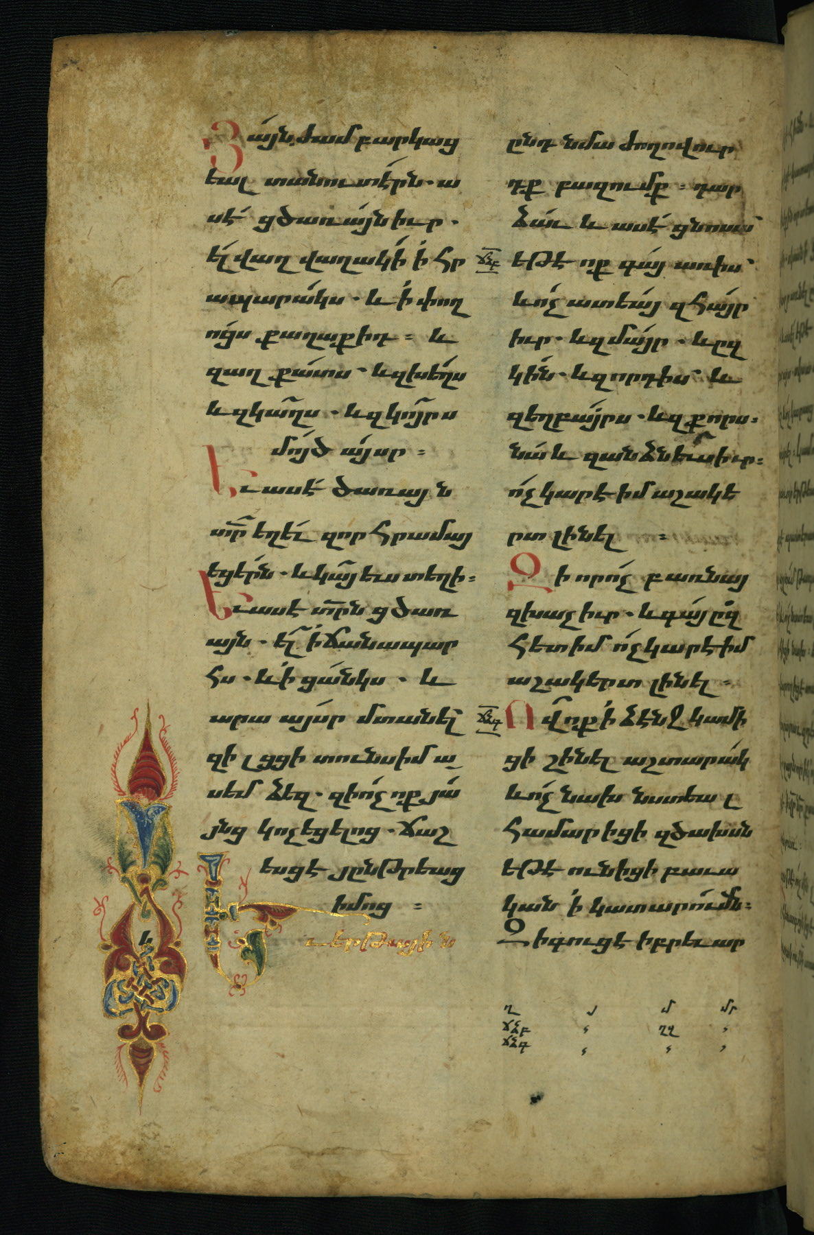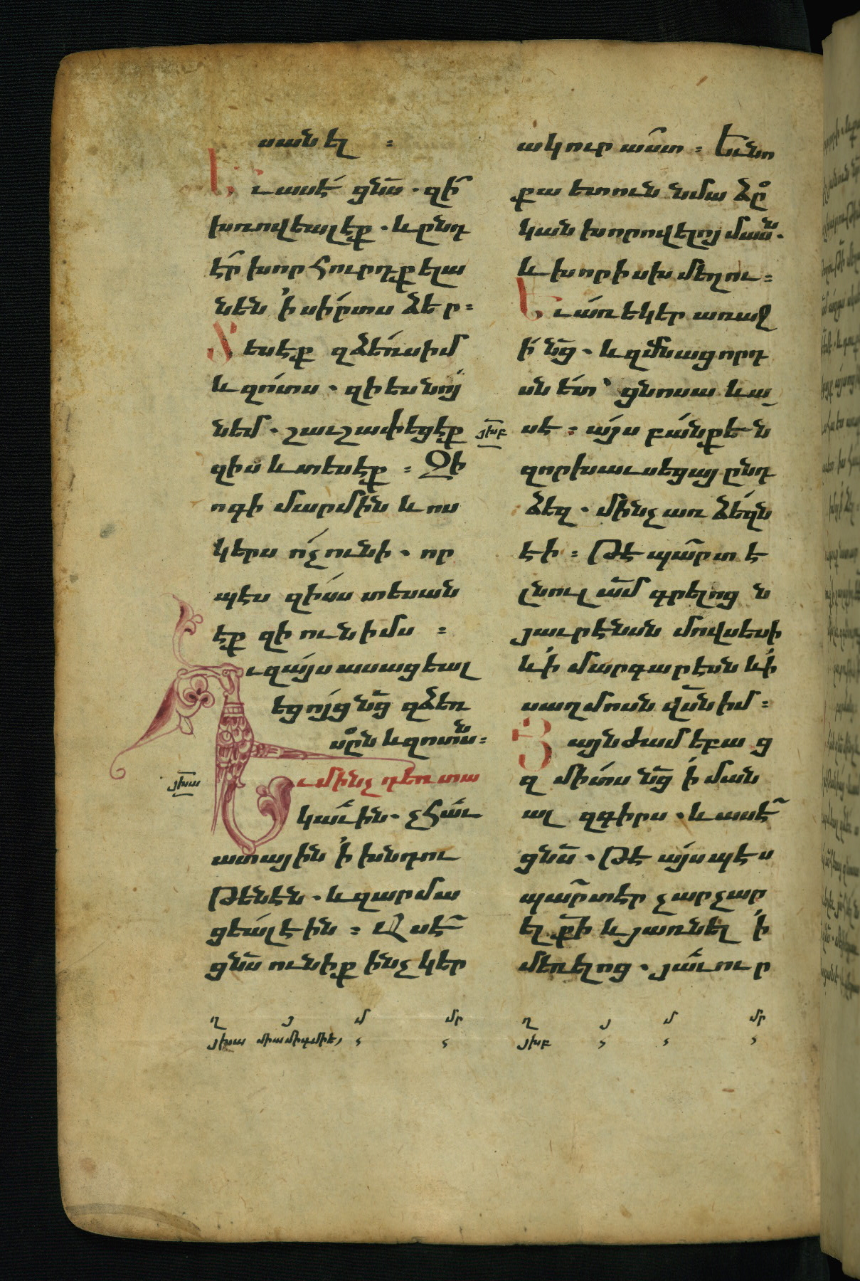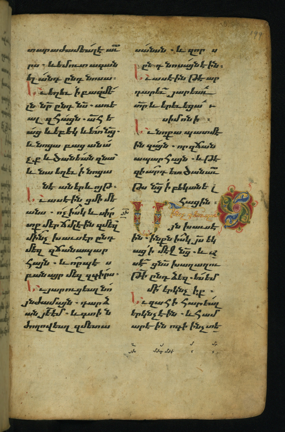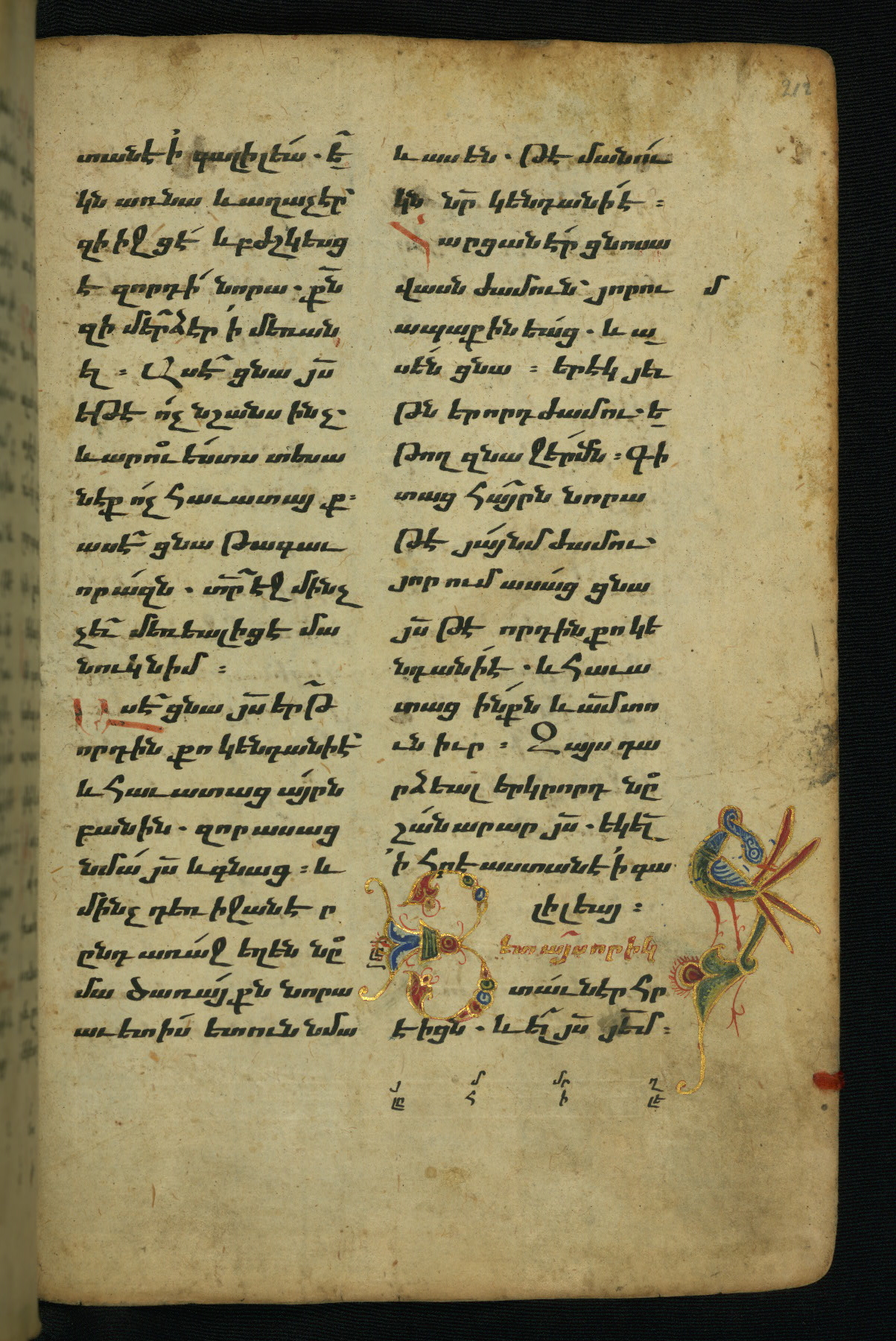 This manuscript was executed in 1475 CE by a scribe identified as Aristakes for a priest named Hakob. It contains a series of sixteen images on the life of Christ preceding the text of the Gospels, as well as the traditional Evangelist portraits, and there are marginal illustrations throughout. The style of the miniatures, which employ brilliant colors and emphasize decorative patterns, is characteristic of manuscript production in the region around Lake Van during the fifteenth century. The style of Lake Van has often been described in relation to schools of Islamic arts of the book. Numerous inscriptions (on fols. 258-260) spanning a few centuries attest to the manuscript's long history of use and revered preservation. The codex's later history included a rebinding with silver covers from Kayseri that date to approximately 1700. This jeweled and enameled silver binding bears a composition of the Adoration of the Magi on the front and the Ascension on the back.