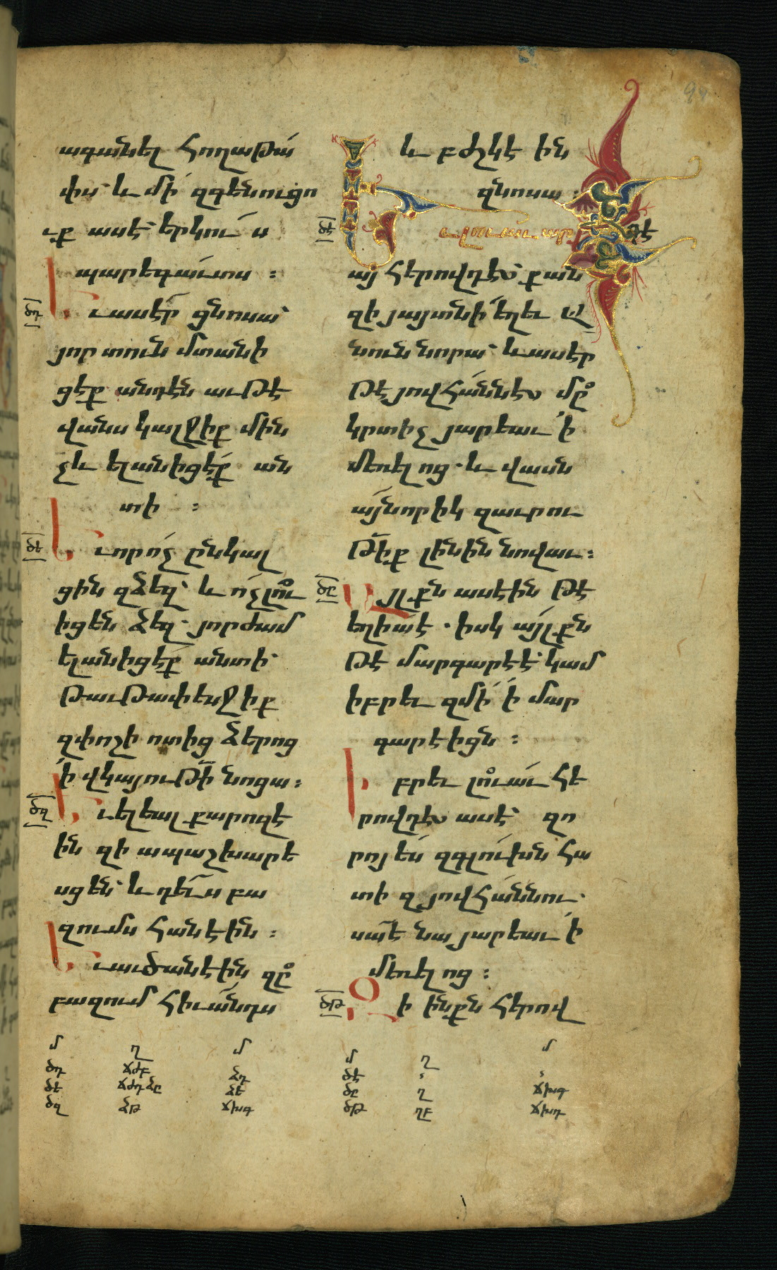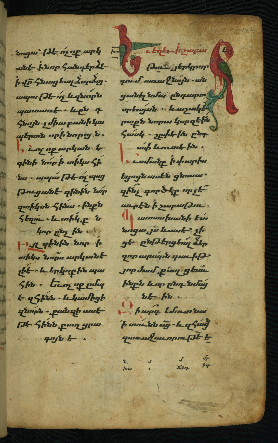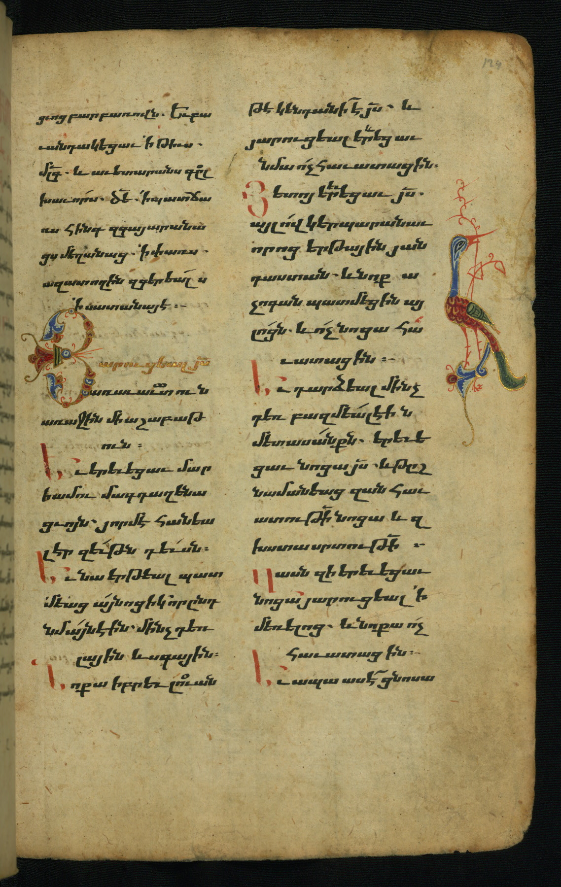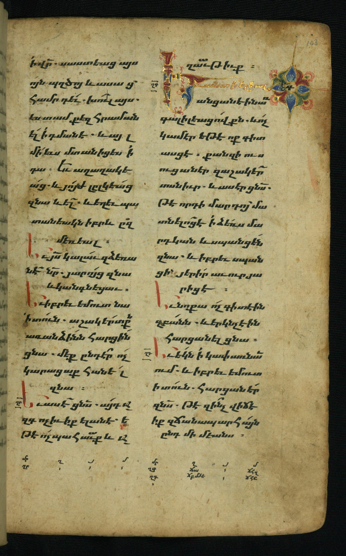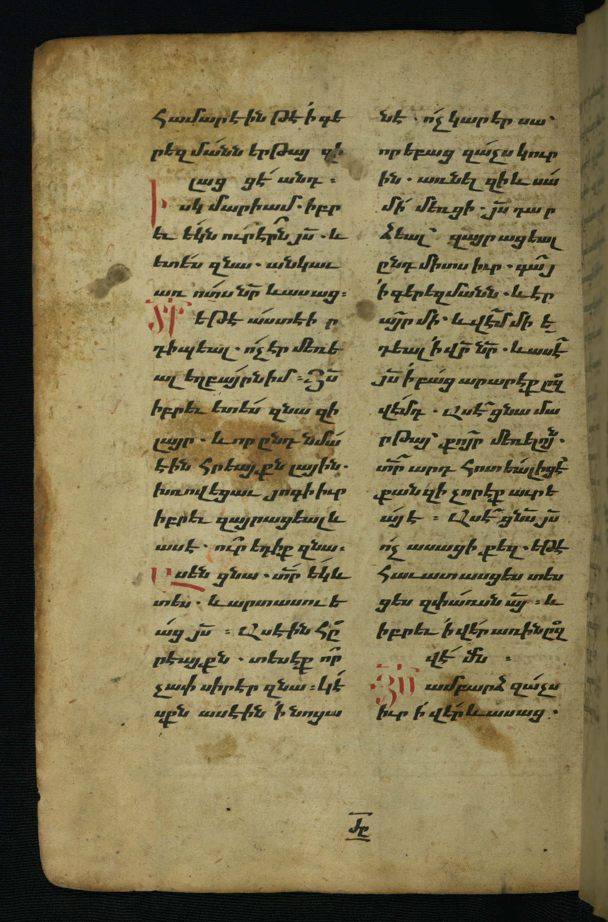 This manuscript was executed in 1475 CE by a scribe identified as Aristakes for a priest named Hakob. It contains a series of sixteen images on the life of Christ preceding the text of the Gospels, as well as the traditional Evangelist portraits, and there are marginal illustrations throughout. The style of the miniatures, which employ brilliant colors and emphasize decorative patterns, is characteristic of manuscript production in the region around Lake Van during the fifteenth century. The style of Lake Van has often been described in relation to schools of Islamic arts of the book. Numerous inscriptions (on fols. 258-260) spanning a few centuries attest to the manuscript's long history of use and revered preservation. The codex's later history included a rebinding with silver covers from Kayseri that date to approximately 1700. This jeweled and enameled silver binding bears a composition of the Adoration of the Magi on the front and the Ascension on the back.