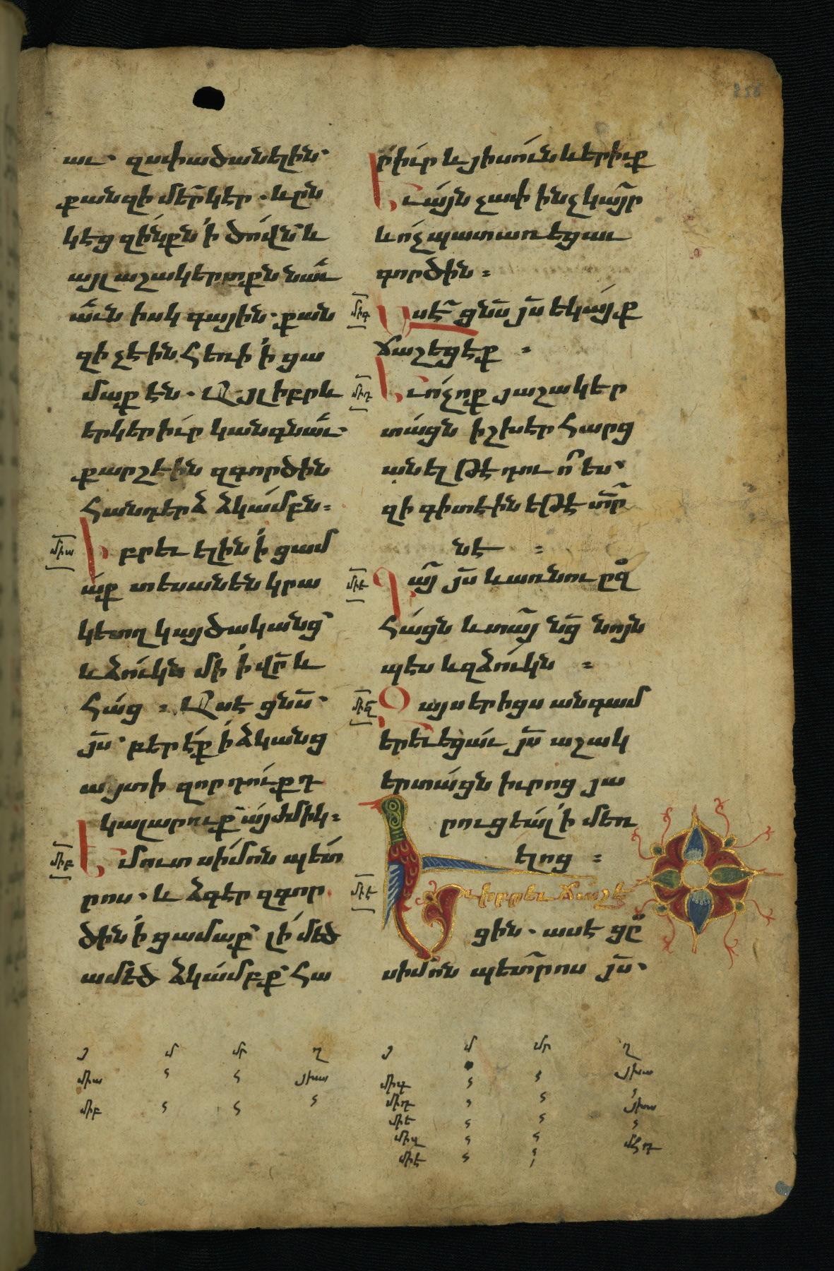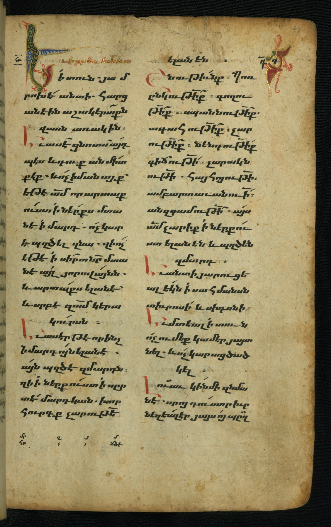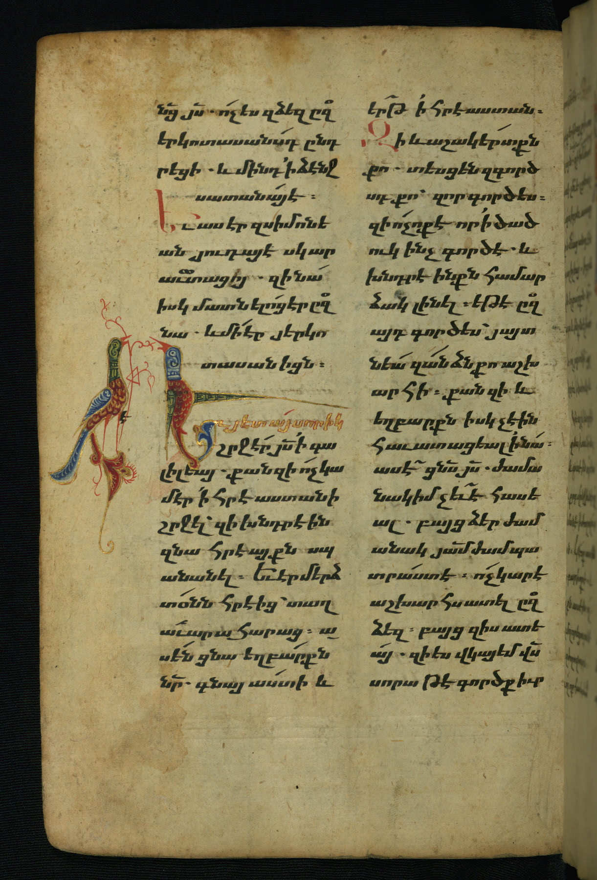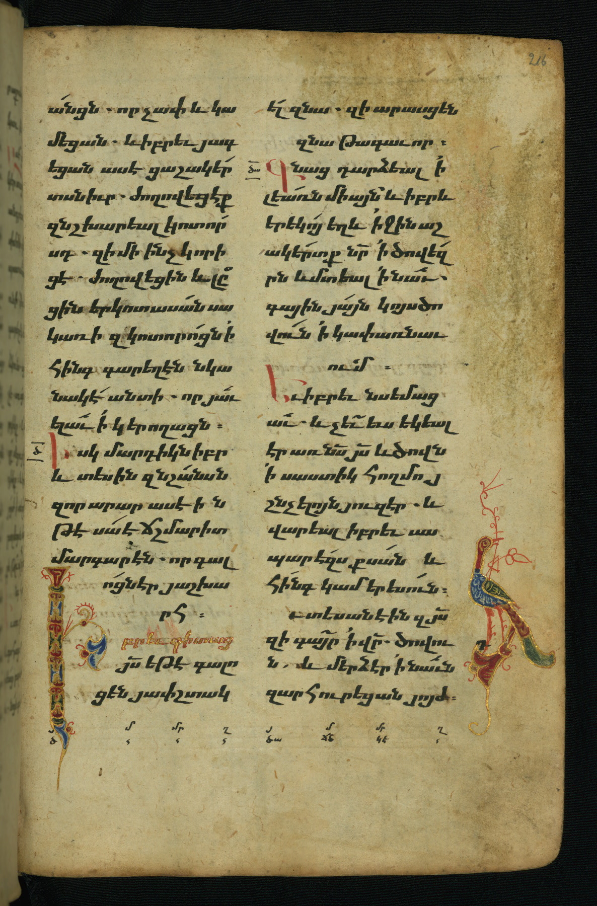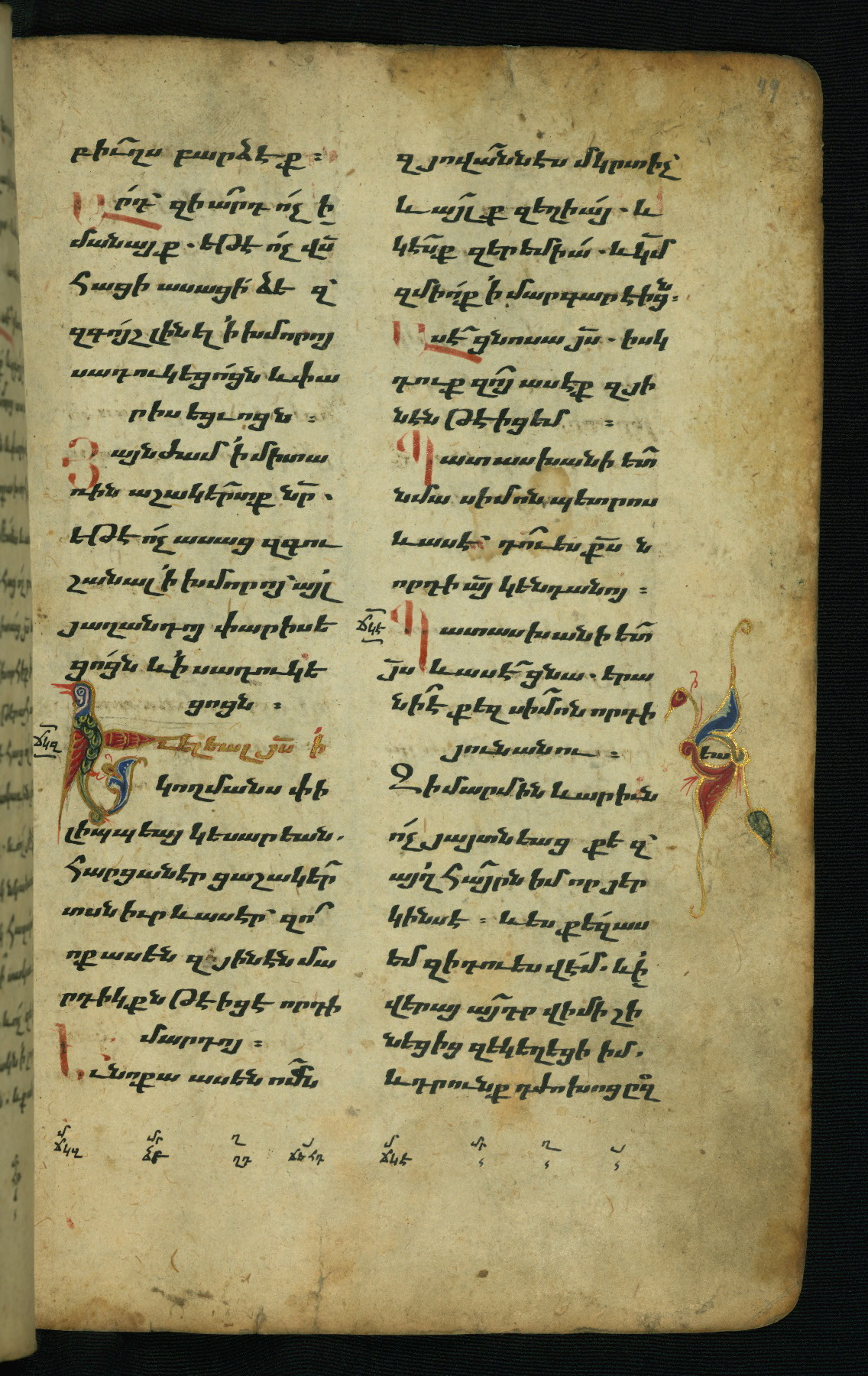 This manuscript was executed in 1475 CE by a scribe identified as Aristakes for a priest named Hakob. It contains a series of sixteen images on the life of Christ preceding the text of the Gospels, as well as the traditional Evangelist portraits, and there are marginal illustrations throughout. The style of the miniatures, which employ brilliant colors and emphasize decorative patterns, is characteristic of manuscript production in the region around Lake Van during the fifteenth century. The style of Lake Van has often been described in relation to schools of Islamic arts of the book. Numerous inscriptions (on fols. 258-260) spanning a few centuries attest to the manuscript's long history of use and revered preservation. The codex's later history included a rebinding with silver covers from Kayseri that date to approximately 1700. This jeweled and enameled silver binding bears a composition of the Adoration of the Magi on the front and the Ascension on the back.