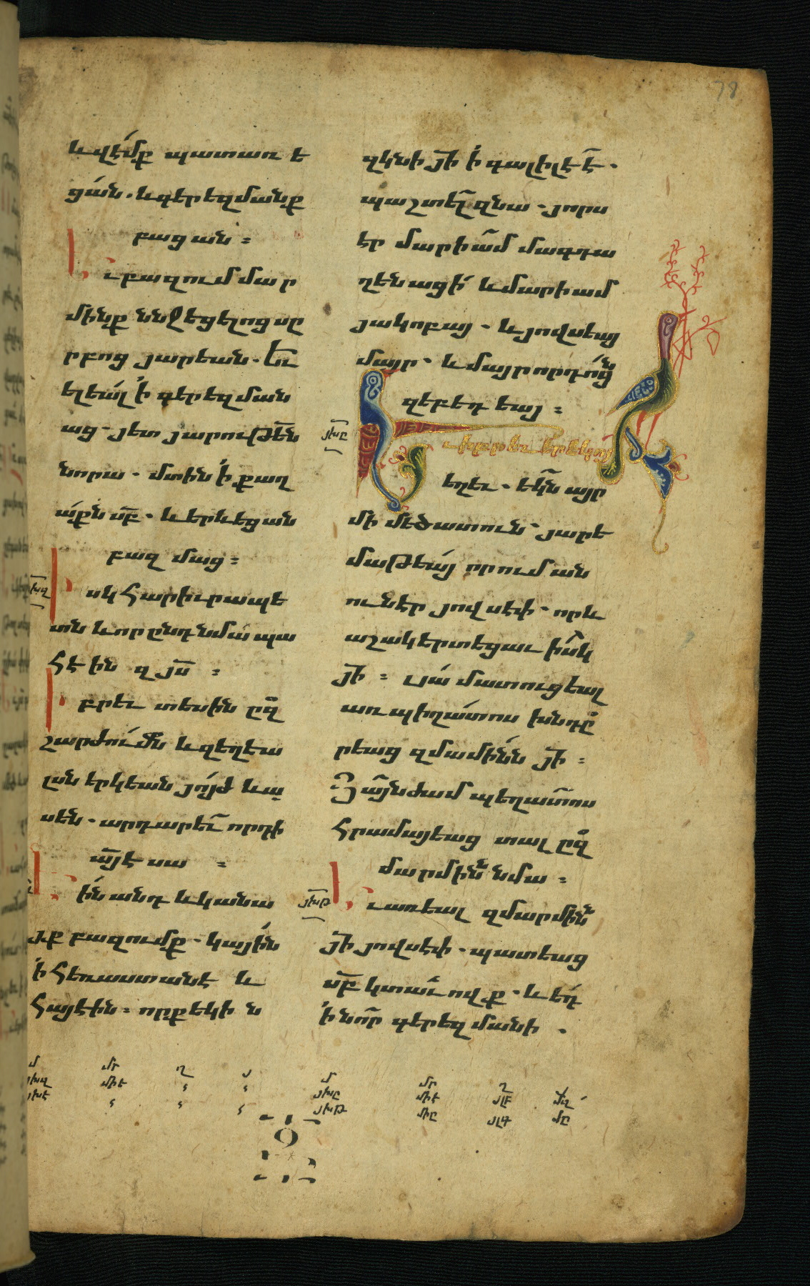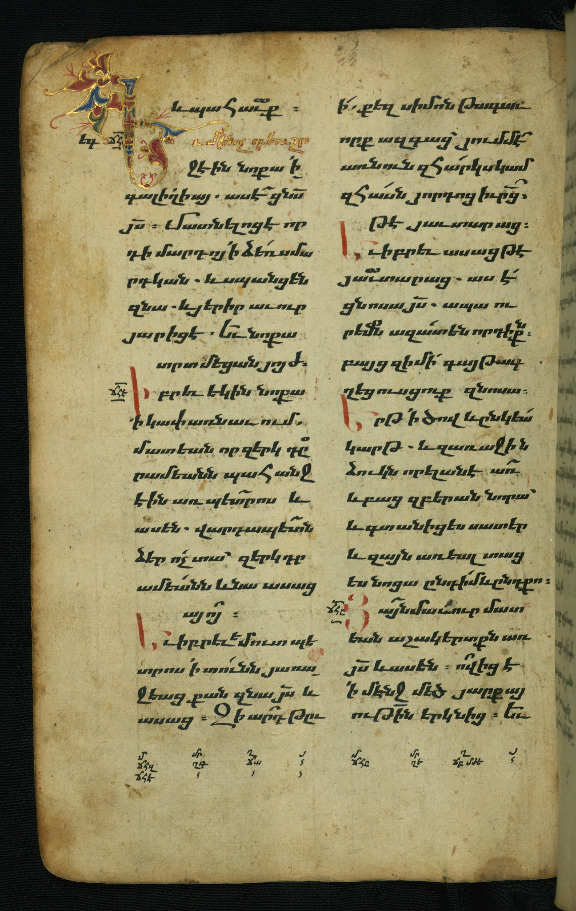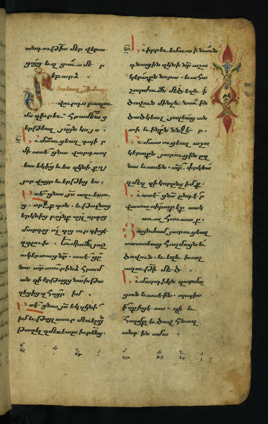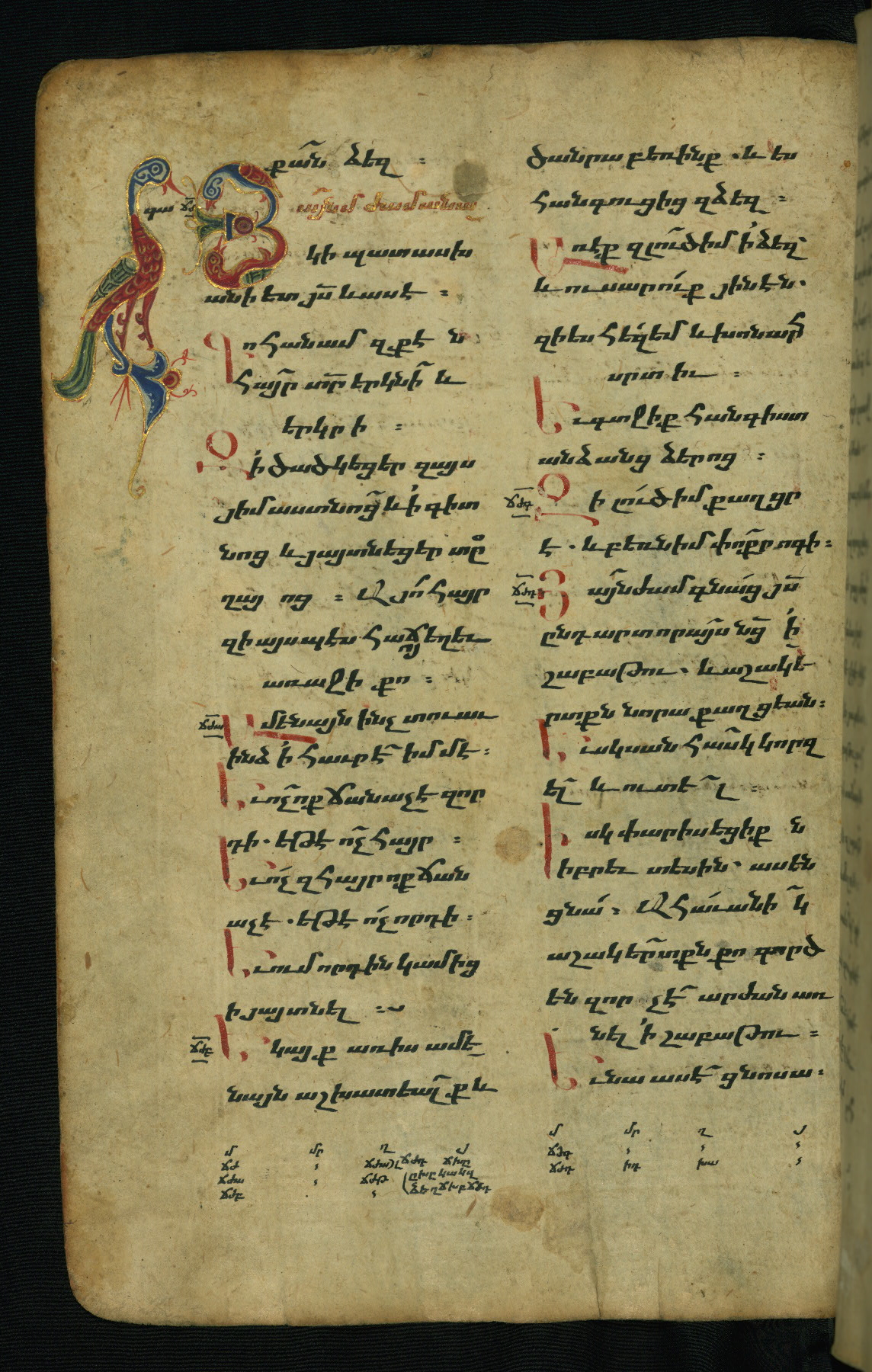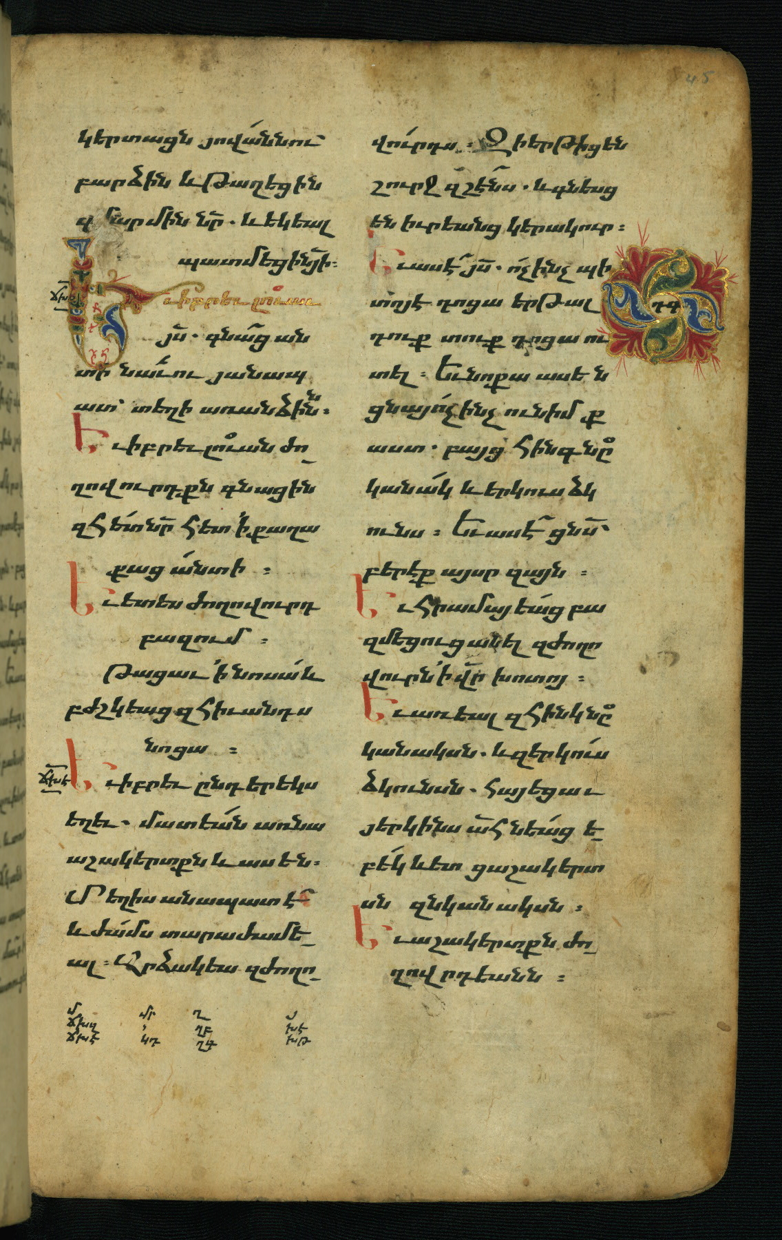 This manuscript was executed in 1475 CE by a scribe identified as Aristakes for a priest named Hakob. It contains a series of sixteen images on the life of Christ preceding the text of the Gospels, as well as the traditional Evangelist portraits, and there are marginal illustrations throughout. The style of the miniatures, which employ brilliant colors and emphasize decorative patterns, is characteristic of manuscript production in the region around Lake Van during the fifteenth century. The style of Lake Van has often been described in relation to schools of Islamic arts of the book. Numerous inscriptions (on fols. 258-260) spanning a few centuries attest to the manuscript's long history of use and revered preservation. The codex's later history included a rebinding with silver covers from Kayseri that date to approximately 1700. This jeweled and enameled silver binding bears a composition of the Adoration of the Magi on the front and the Ascension on the back.