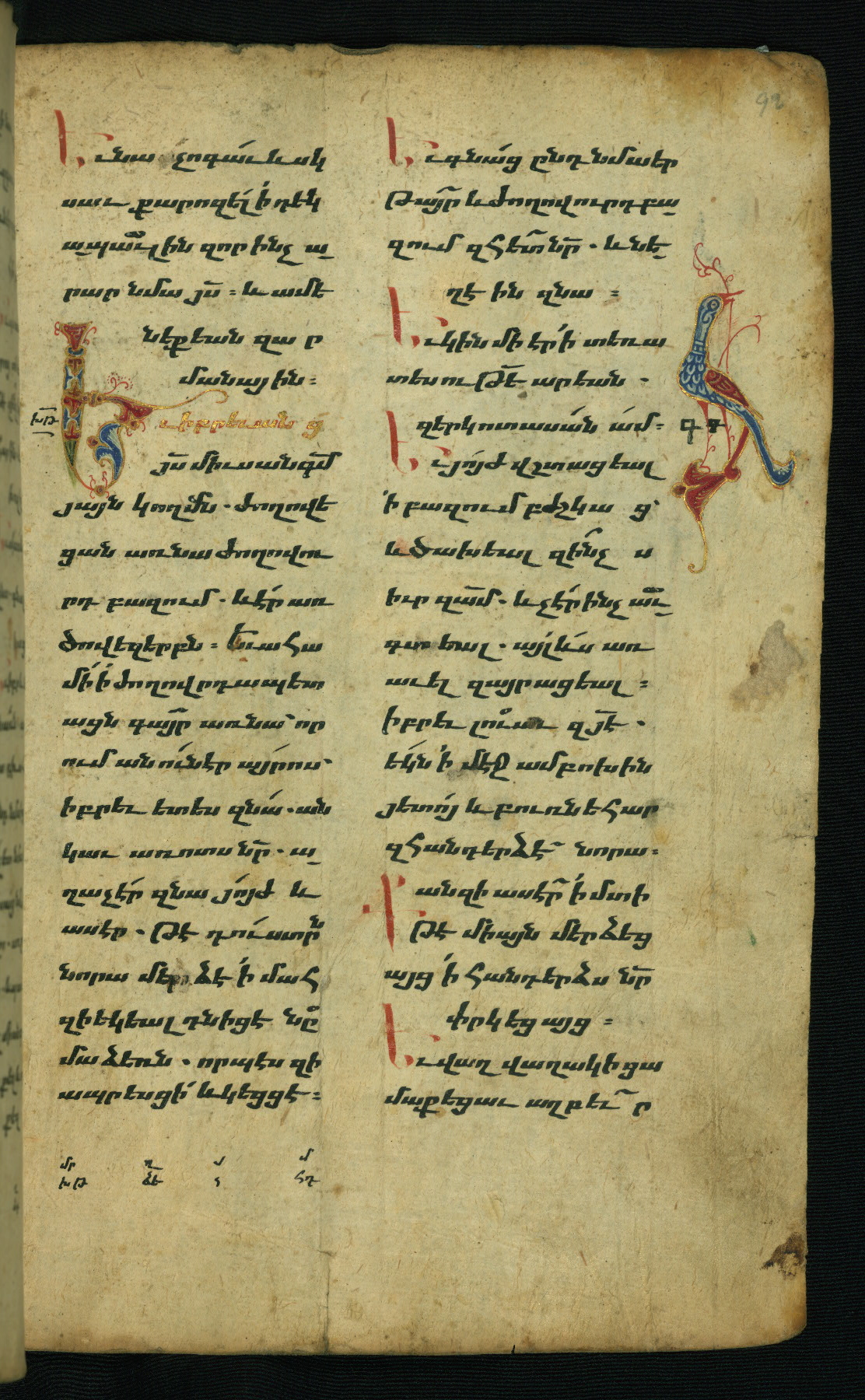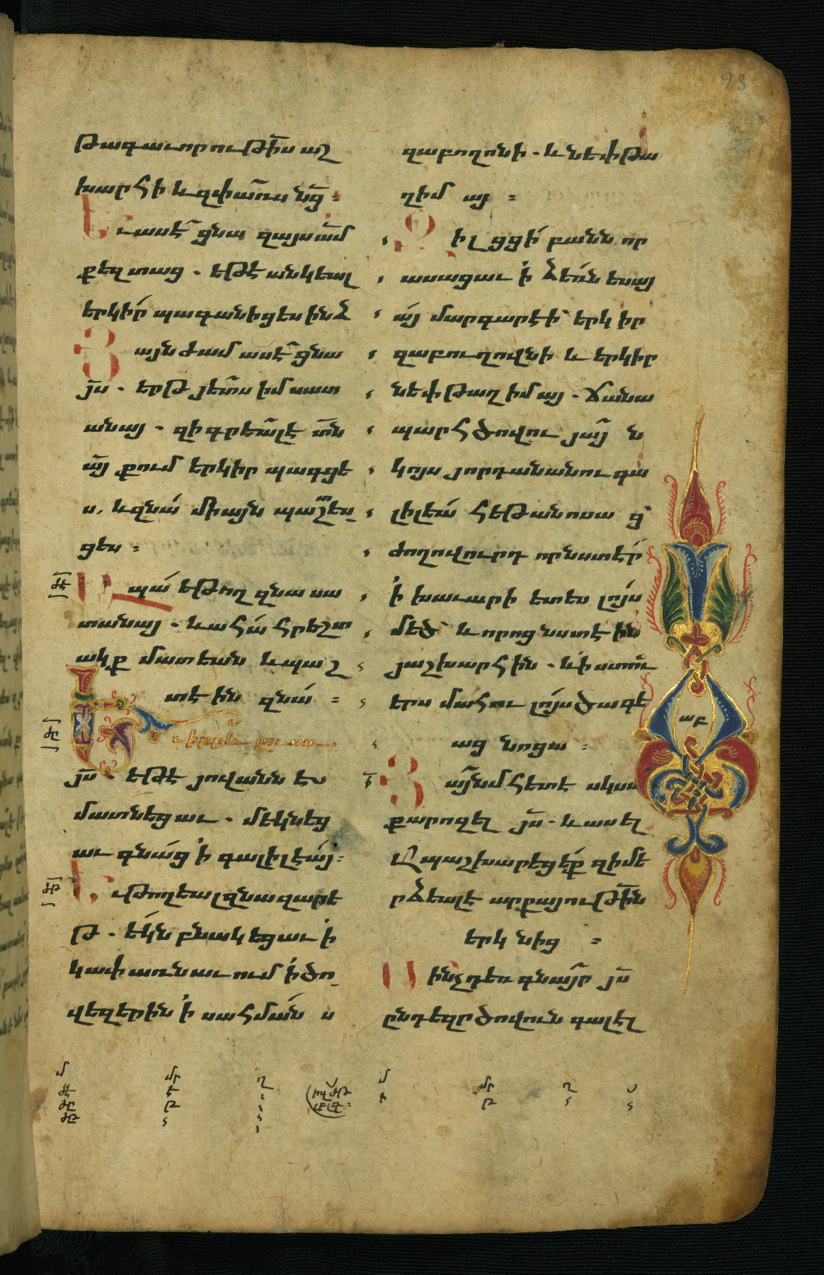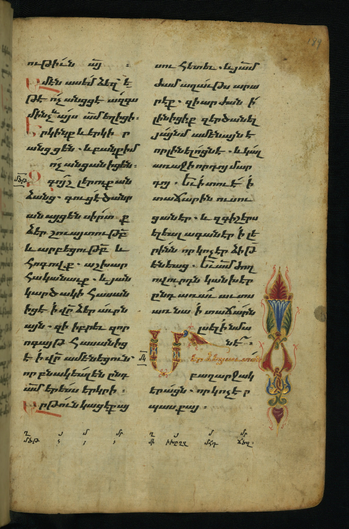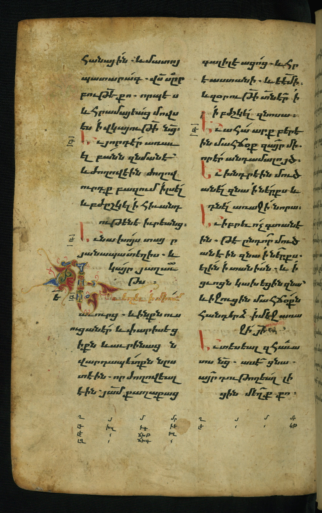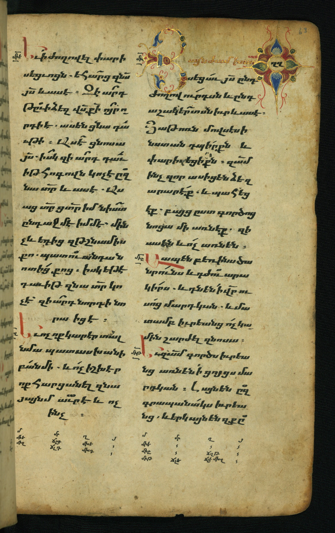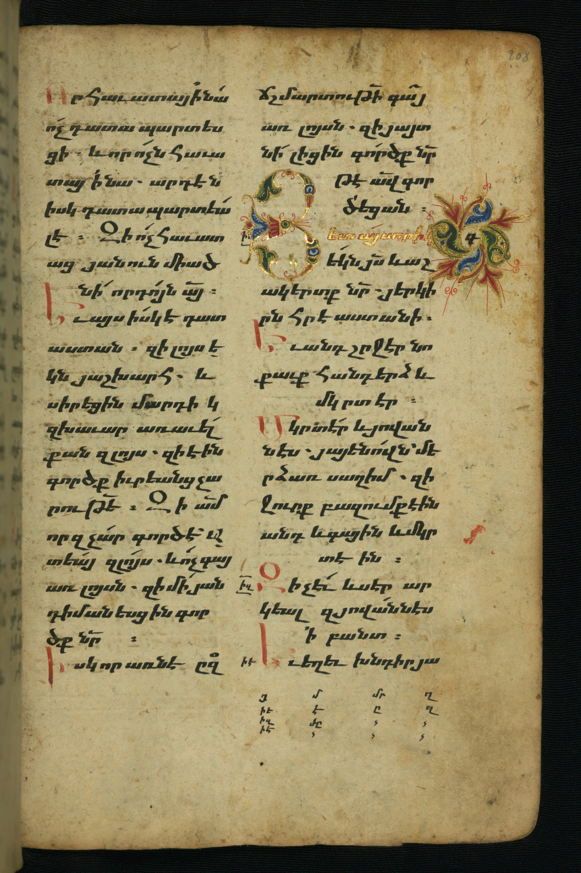 This manuscript was executed in 1475 CE by a scribe identified as Aristakes for a priest named Hakob. It contains a series of sixteen images on the life of Christ preceding the text of the Gospels, as well as the traditional Evangelist portraits, and there are marginal illustrations throughout. The style of the miniatures, which employ brilliant colors and emphasize decorative patterns, is characteristic of manuscript production in the region around Lake Van during the fifteenth century. The style of Lake Van has often been described in relation to schools of Islamic arts of the book. Numerous inscriptions (on fols. 258-260) spanning a few centuries attest to the manuscript's long history of use and revered preservation. The codex's later history included a rebinding with silver covers from Kayseri that date to approximately 1700. This jeweled and enameled silver binding bears a composition of the Adoration of the Magi on the front and the Ascension on the back.