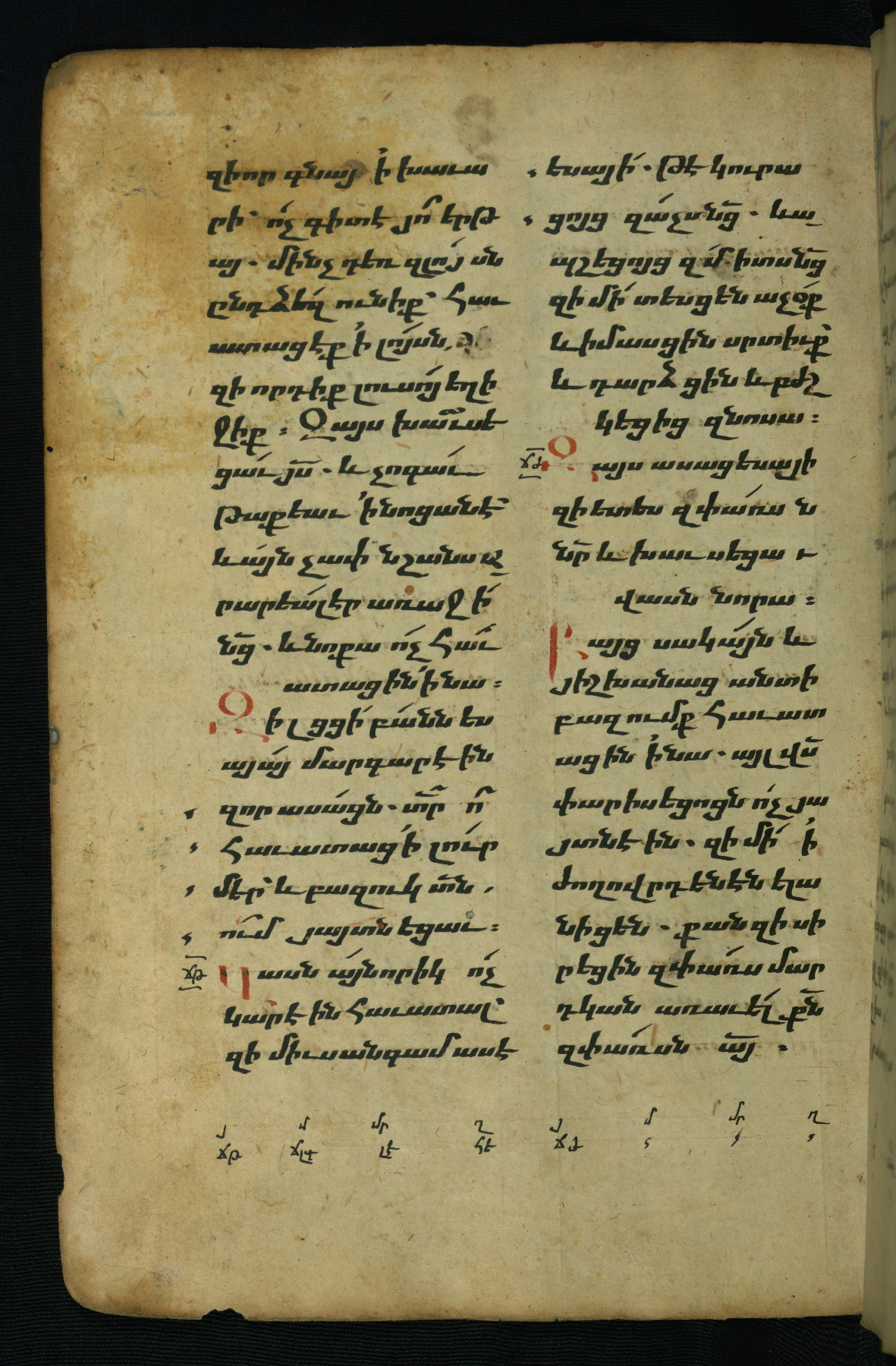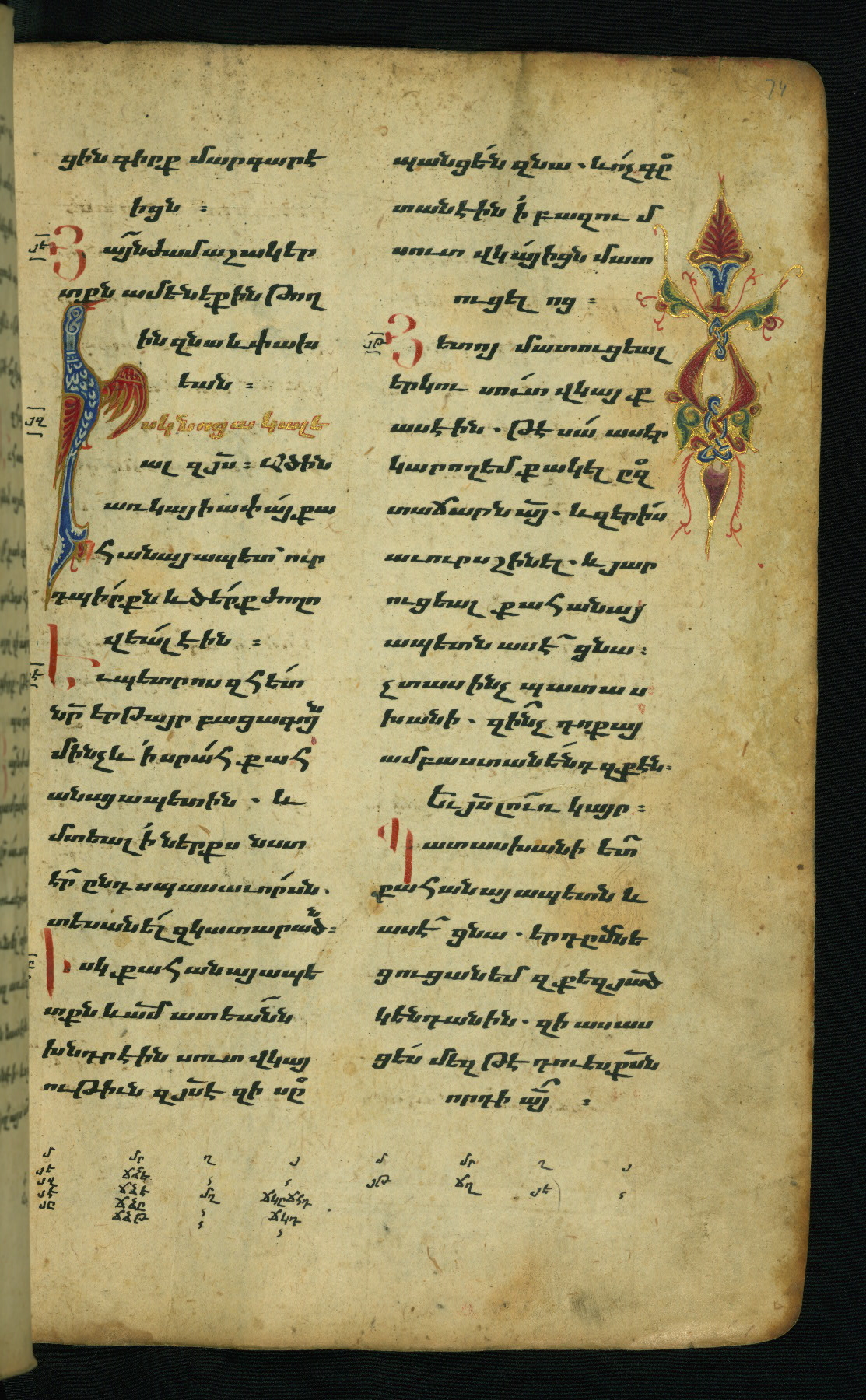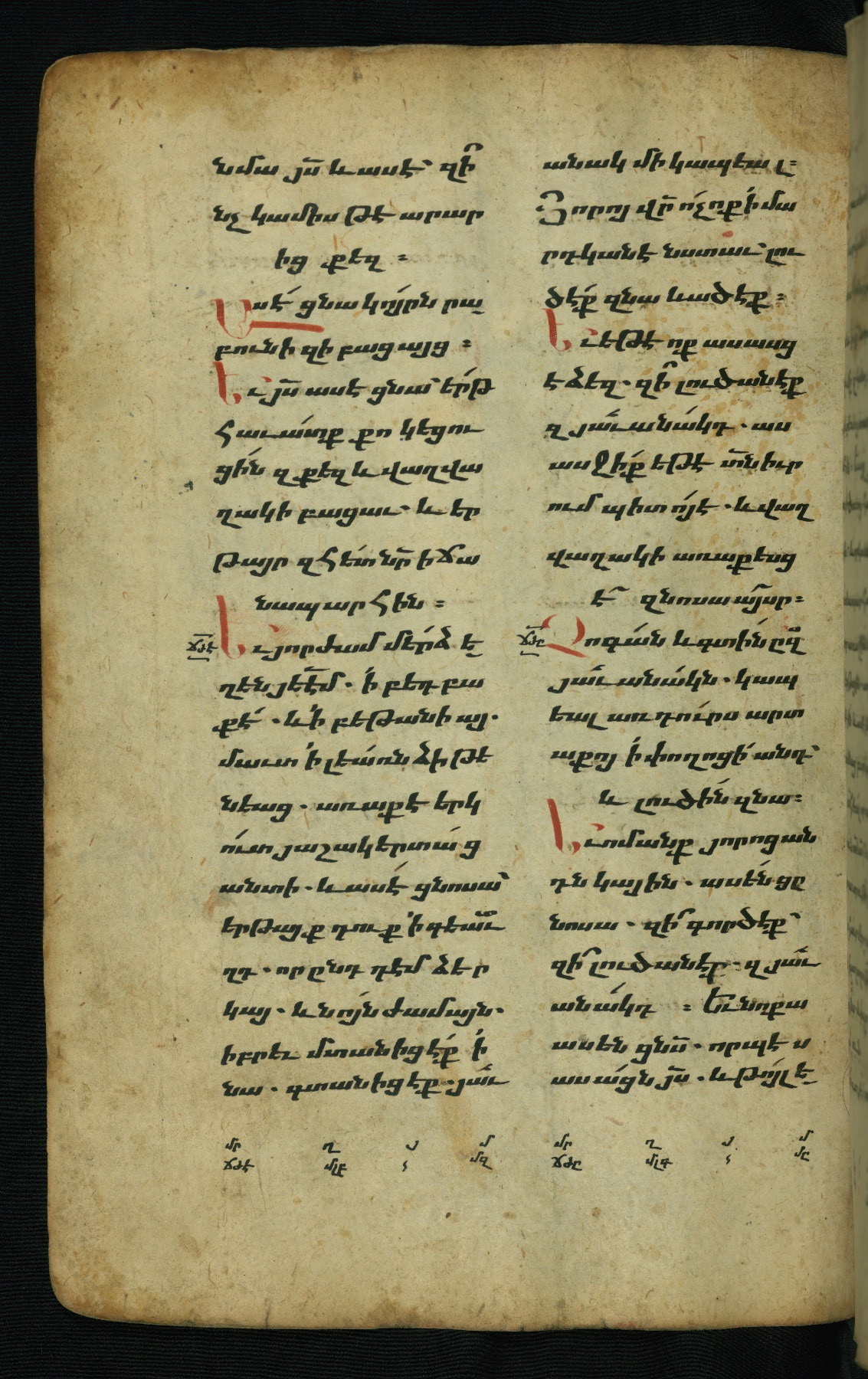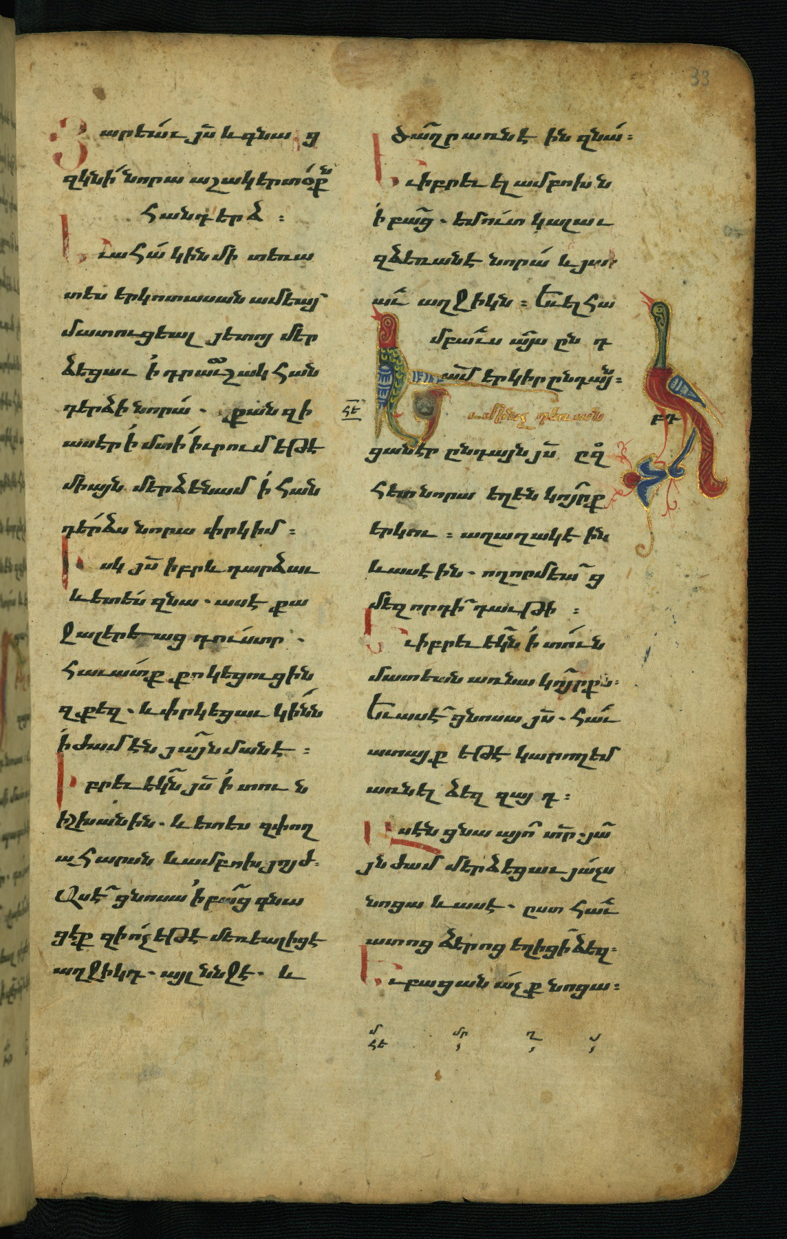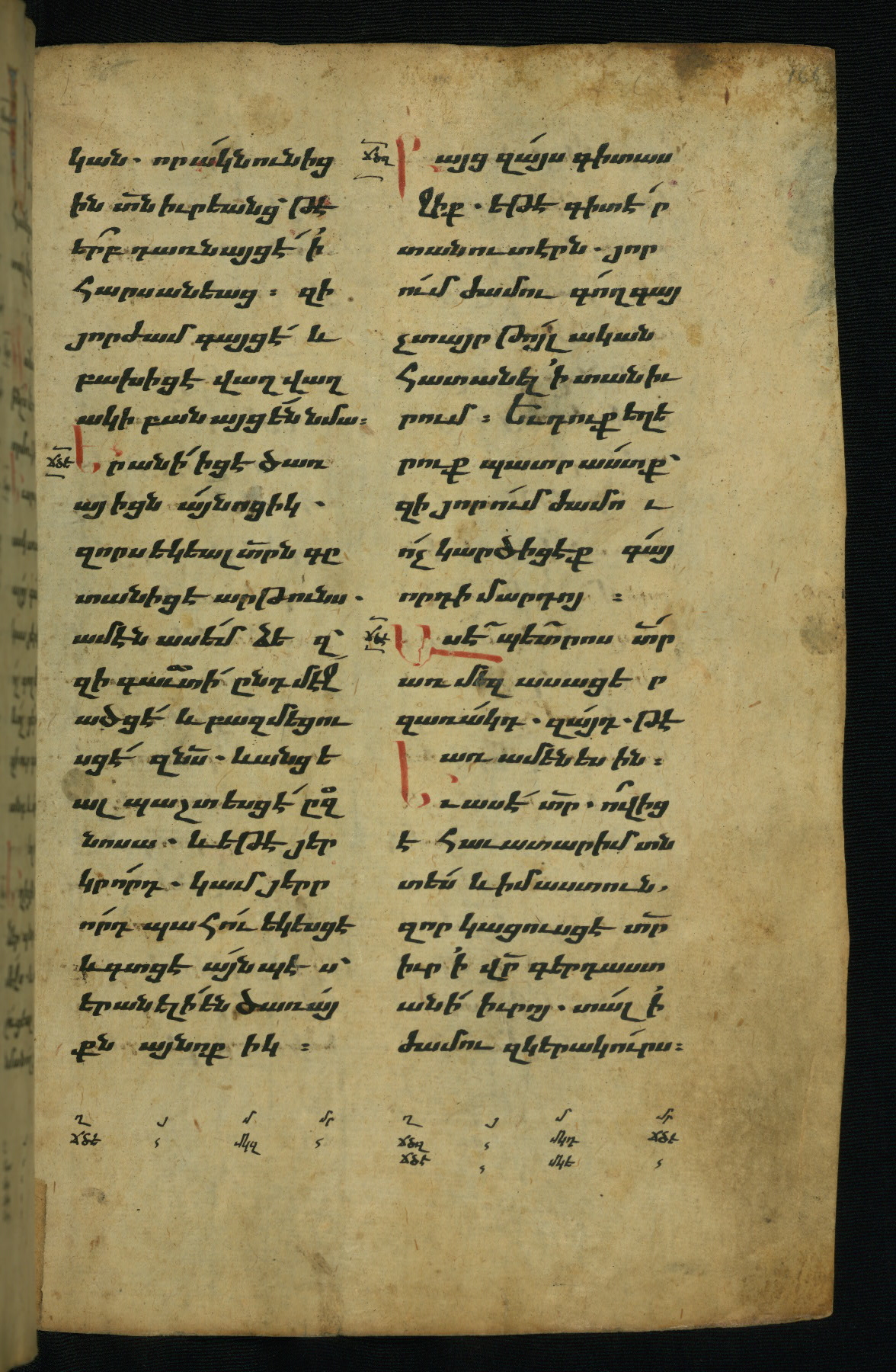 This manuscript was executed in 1475 CE by a scribe identified as Aristakes for a priest named Hakob. It contains a series of sixteen images on the life of Christ preceding the text of the Gospels, as well as the traditional Evangelist portraits, and there are marginal illustrations throughout. The style of the miniatures, which employ brilliant colors and emphasize decorative patterns, is characteristic of manuscript production in the region around Lake Van during the fifteenth century. The style of Lake Van has often been described in relation to schools of Islamic arts of the book. Numerous inscriptions (on fols. 258-260) spanning a few centuries attest to the manuscript's long history of use and revered preservation. The codex's later history included a rebinding with silver covers from Kayseri that date to approximately 1700. This jeweled and enameled silver binding bears a composition of the Adoration of the Magi on the front and the Ascension on the back.