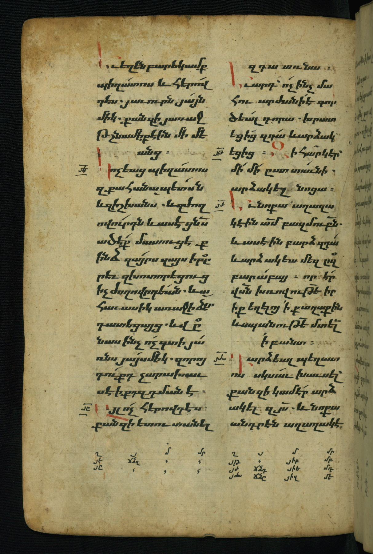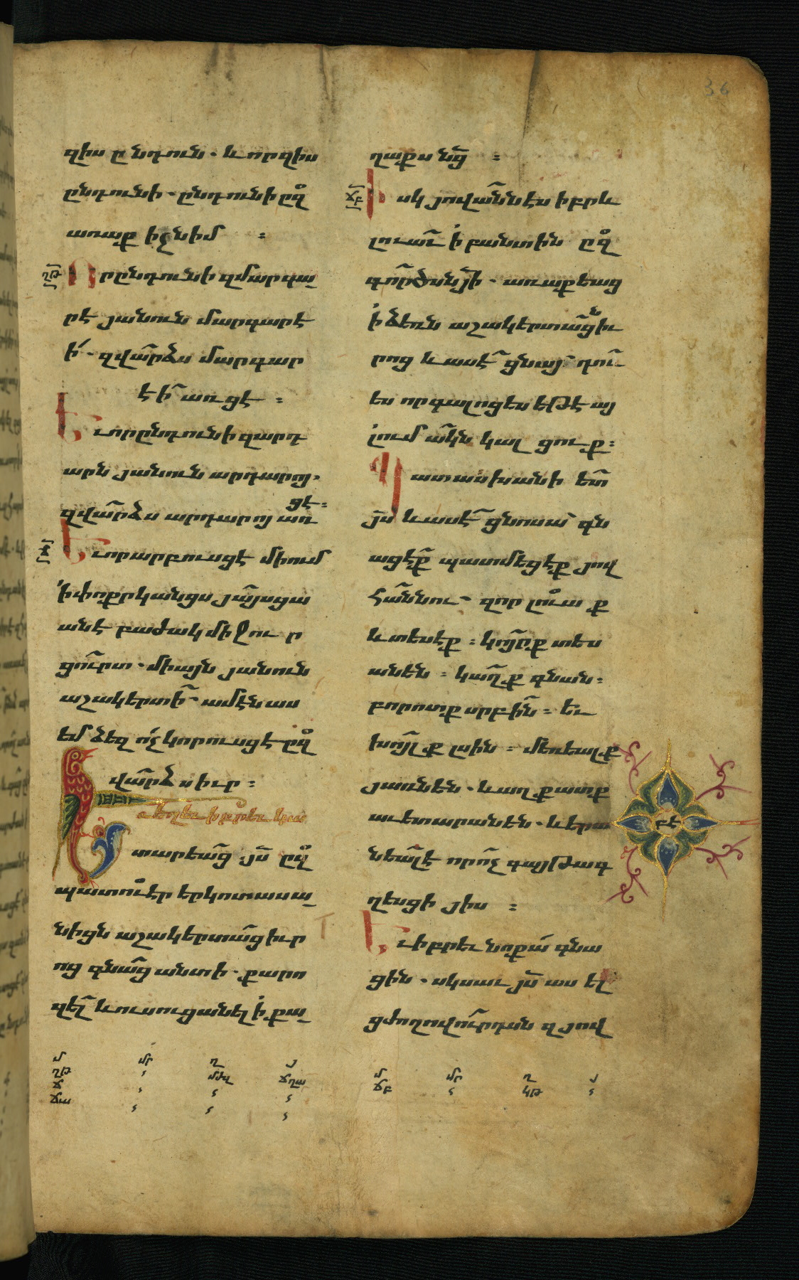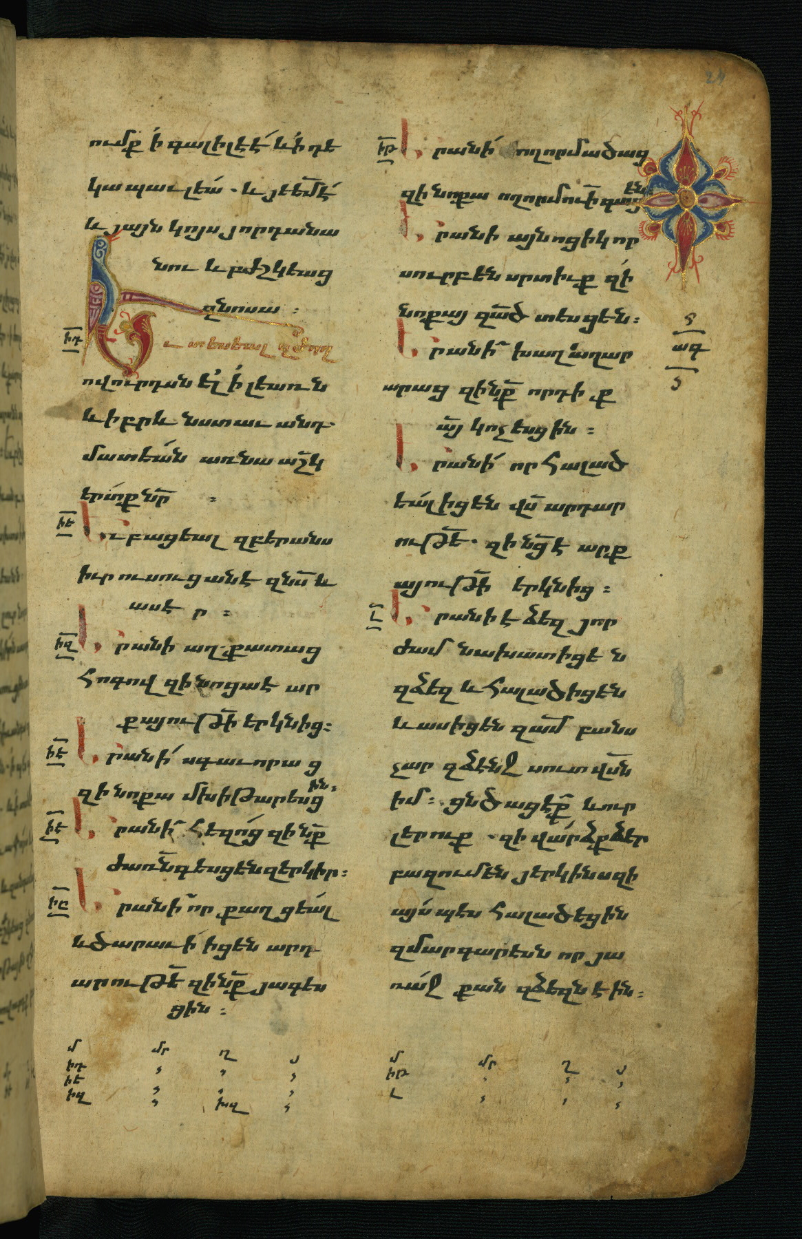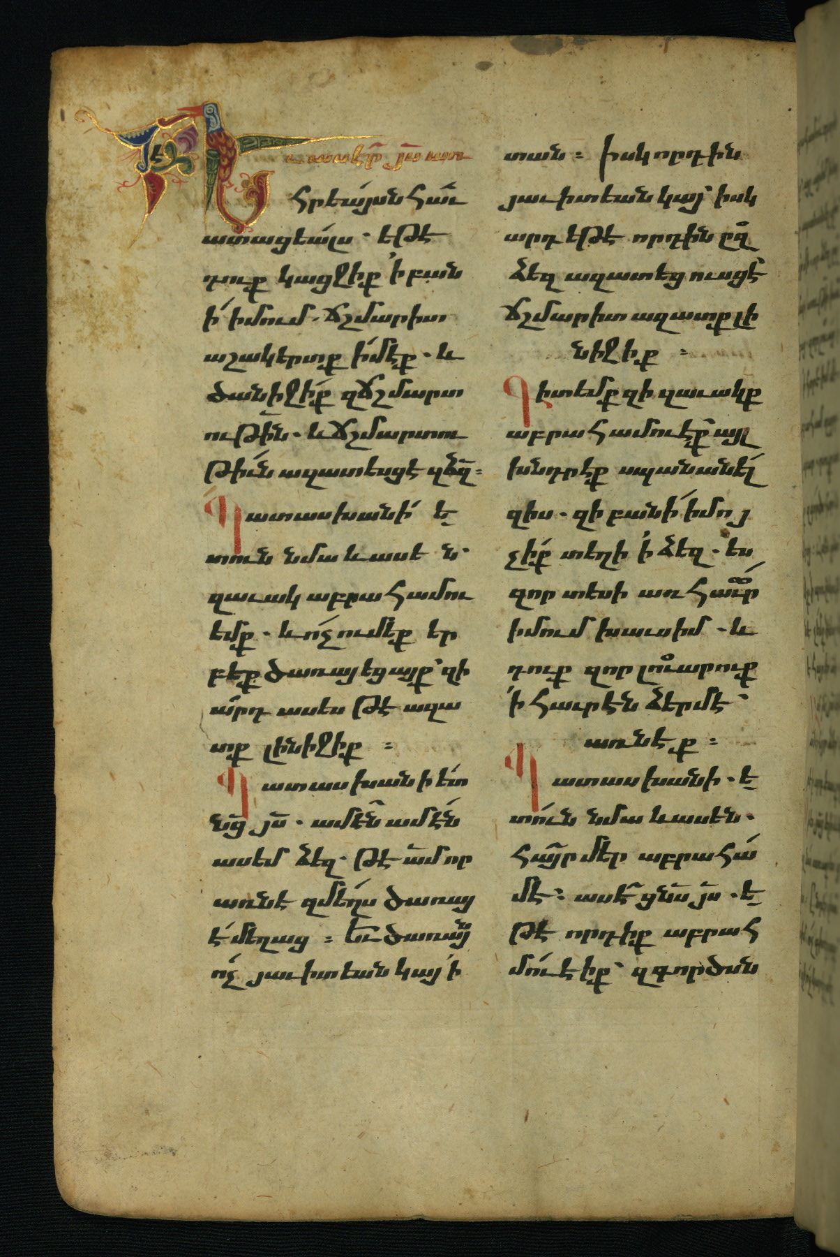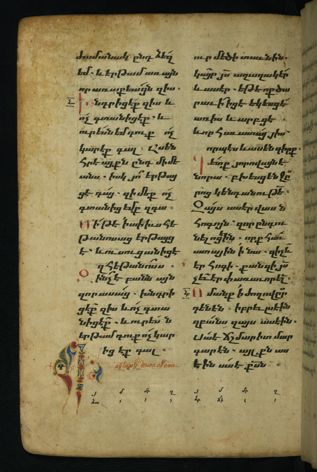 This manuscript was executed in 1475 CE by a scribe identified as Aristakes for a priest named Hakob. It contains a series of sixteen images on the life of Christ preceding the text of the Gospels, as well as the traditional Evangelist portraits, and there are marginal illustrations throughout. The style of the miniatures, which employ brilliant colors and emphasize decorative patterns, is characteristic of manuscript production in the region around Lake Van during the fifteenth century. The style of Lake Van has often been described in relation to schools of Islamic arts of the book. Numerous inscriptions (on fols. 258-260) spanning a few centuries attest to the manuscript's long history of use and revered preservation. The codex's later history included a rebinding with silver covers from Kayseri that date to approximately 1700. This jeweled and enameled silver binding bears a composition of the Adoration of the Magi on the front and the Ascension on the back.