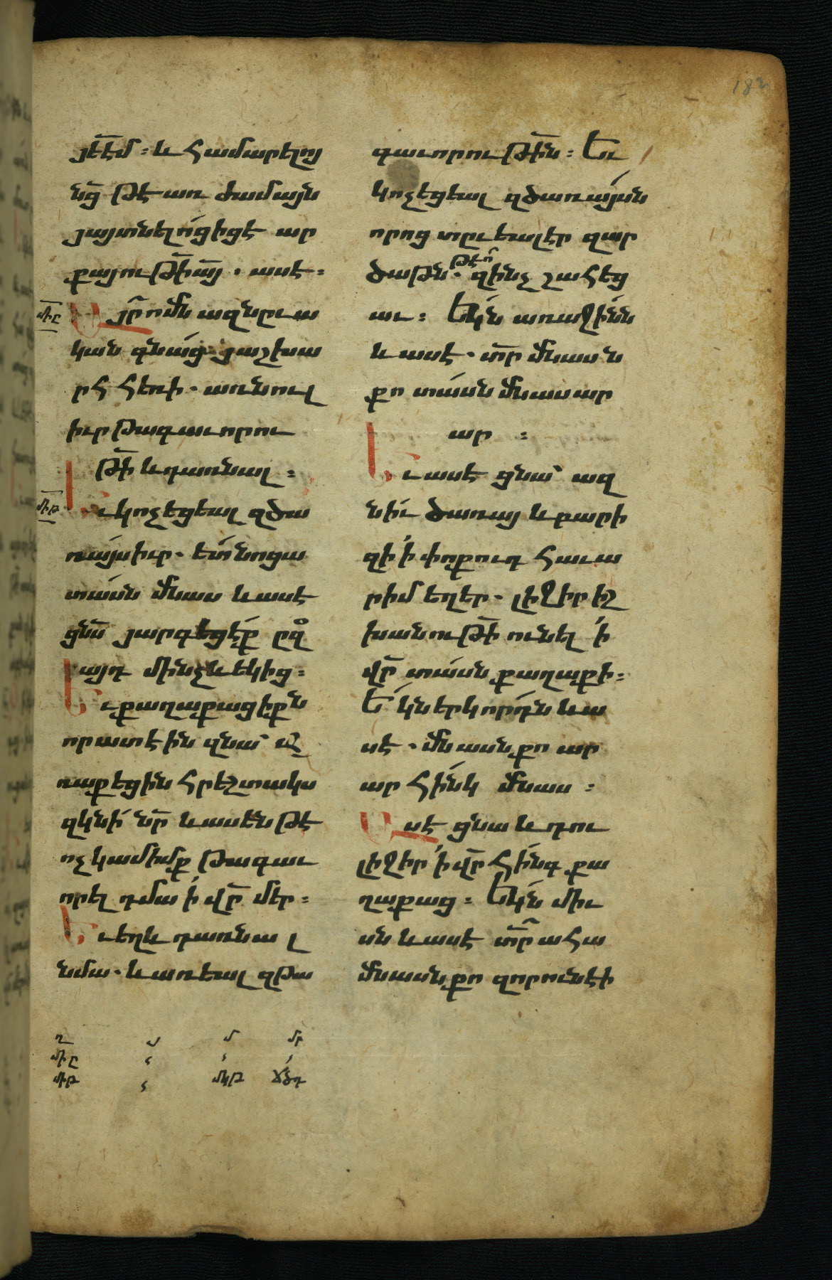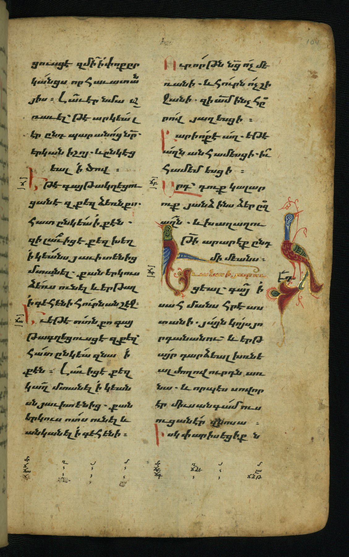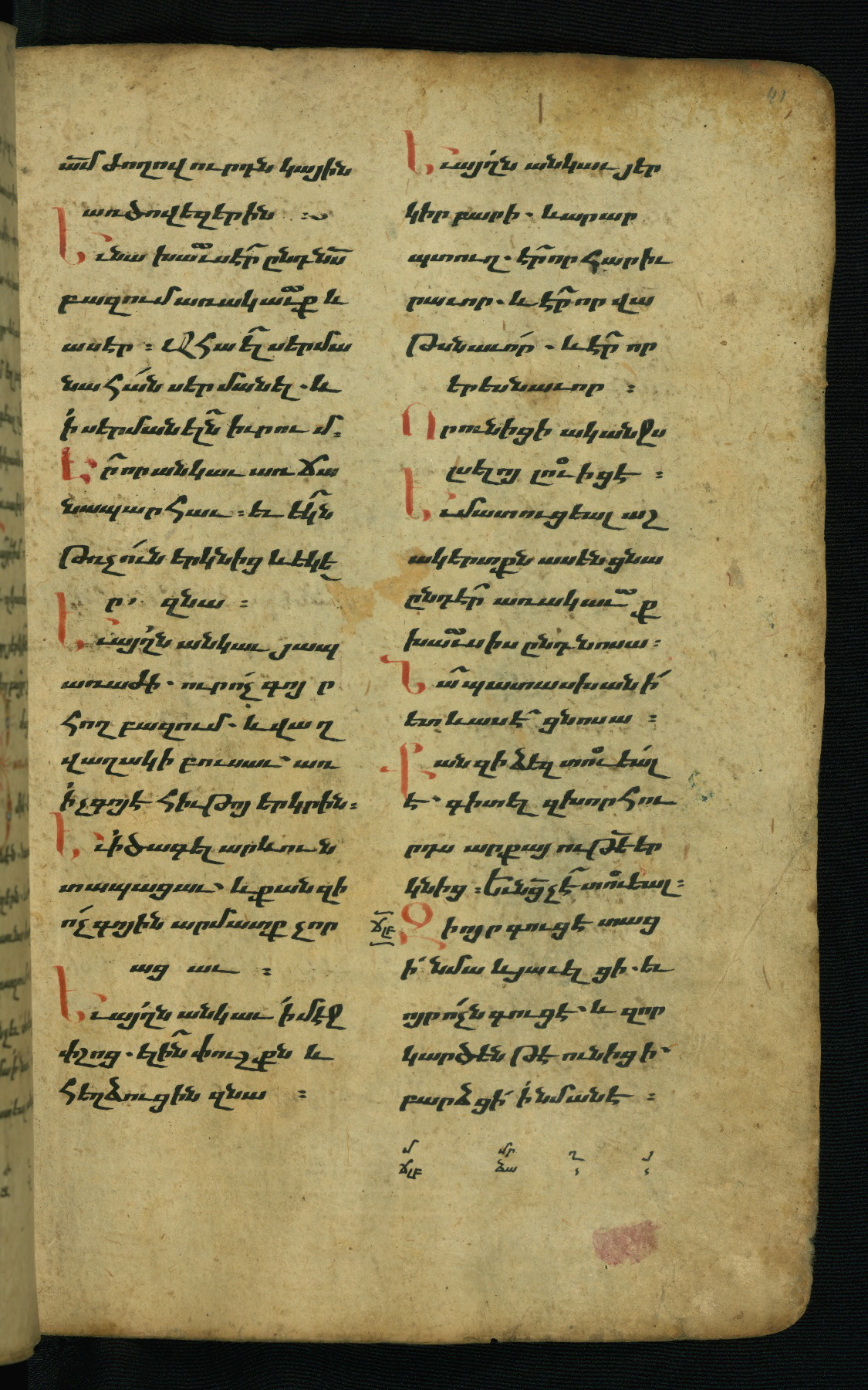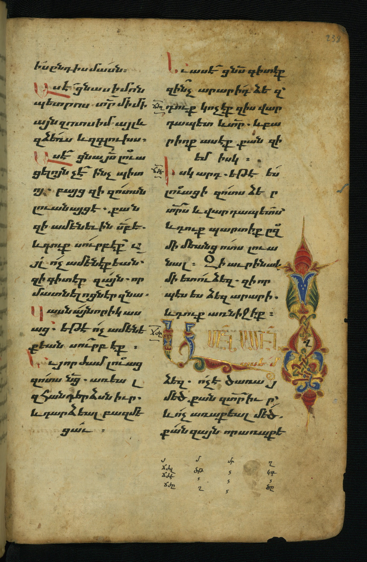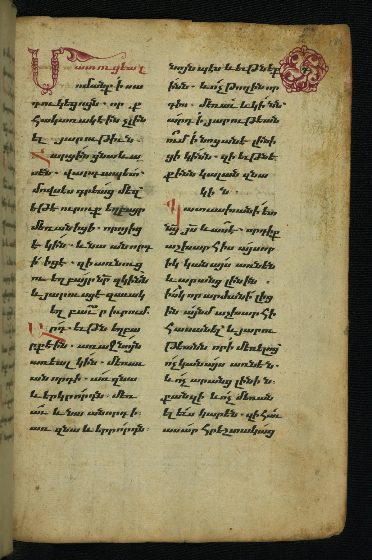 This manuscript was executed in 1475 CE by a scribe identified as Aristakes for a priest named Hakob. It contains a series of sixteen images on the life of Christ preceding the text of the Gospels, as well as the traditional Evangelist portraits, and there are marginal illustrations throughout. The style of the miniatures, which employ brilliant colors and emphasize decorative patterns, is characteristic of manuscript production in the region around Lake Van during the fifteenth century. The style of Lake Van has often been described in relation to schools of Islamic arts of the book. Numerous inscriptions (on fols. 258-260) spanning a few centuries attest to the manuscript's long history of use and revered preservation. The codex's later history included a rebinding with silver covers from Kayseri that date to approximately 1700. This jeweled and enameled silver binding bears a composition of the Adoration of the Magi on the front and the Ascension on the back.