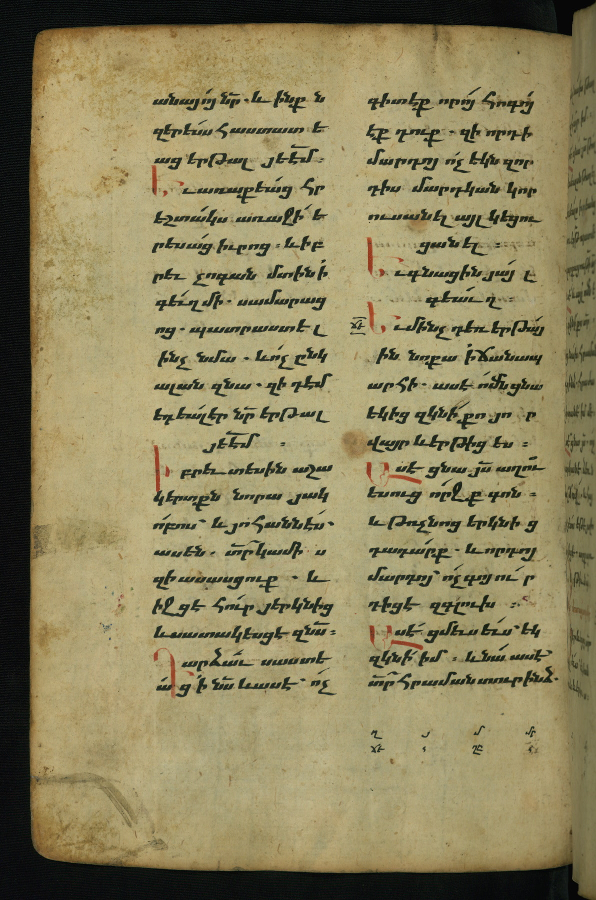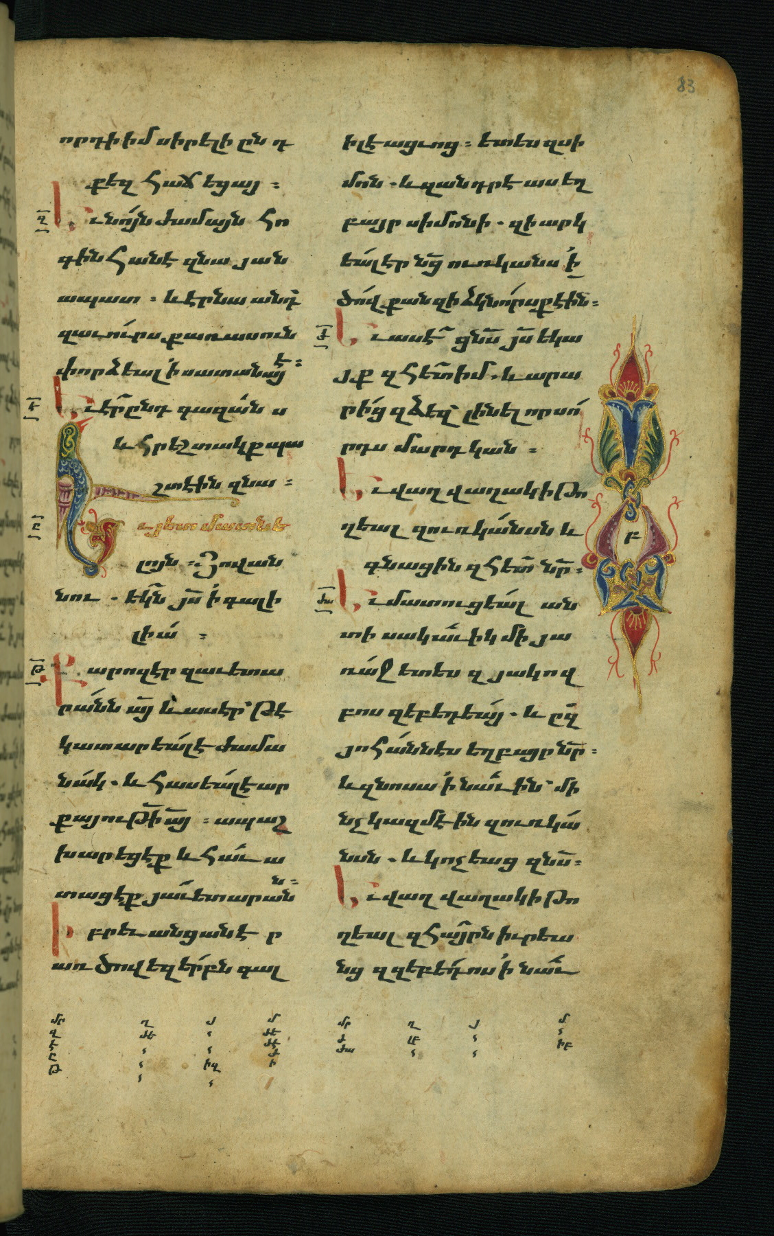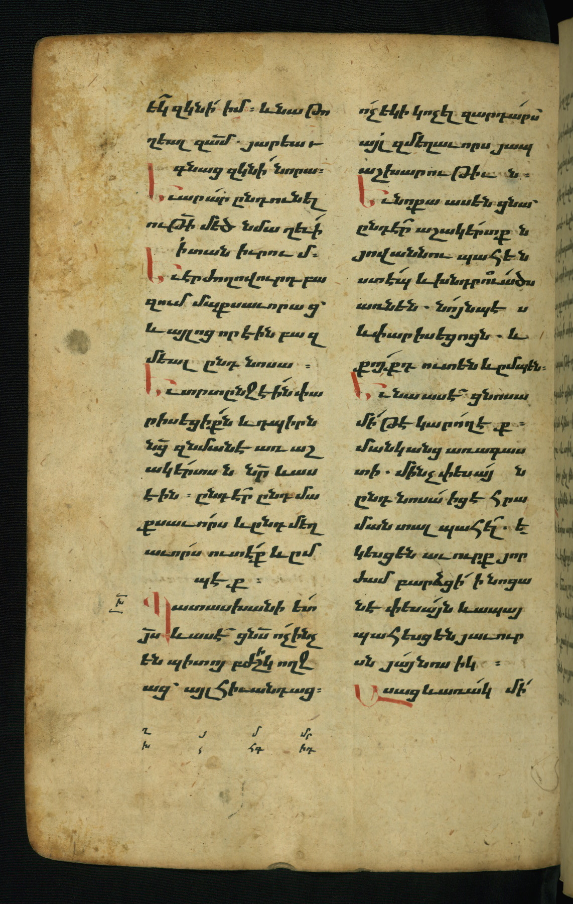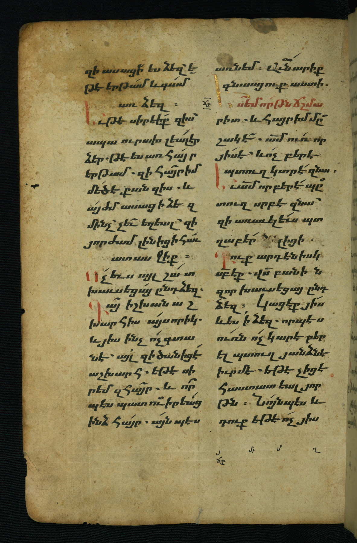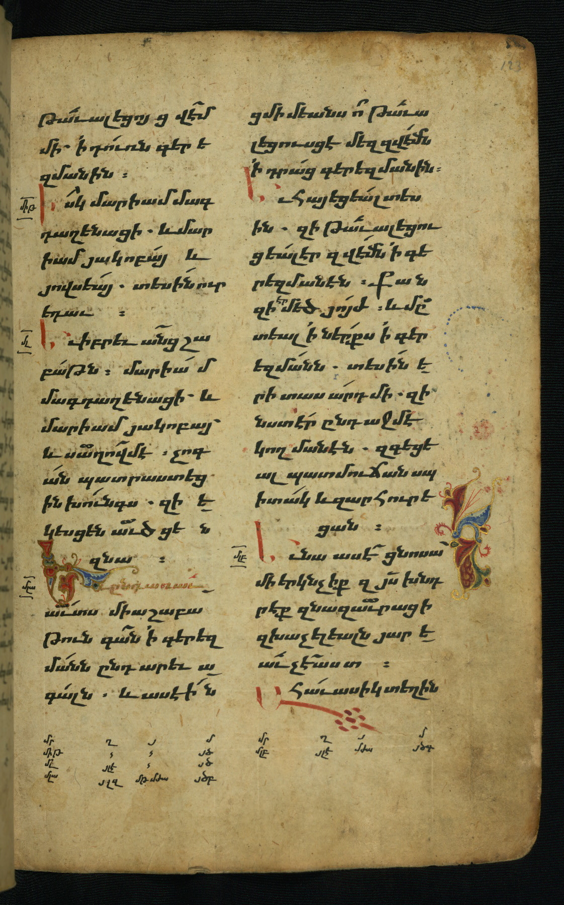 This manuscript was executed in 1475 CE by a scribe identified as Aristakes for a priest named Hakob. It contains a series of sixteen images on the life of Christ preceding the text of the Gospels, as well as the traditional Evangelist portraits, and there are marginal illustrations throughout. The style of the miniatures, which employ brilliant colors and emphasize decorative patterns, is characteristic of manuscript production in the region around Lake Van during the fifteenth century. The style of Lake Van has often been described in relation to schools of Islamic arts of the book. Numerous inscriptions (on fols. 258-260) spanning a few centuries attest to the manuscript's long history of use and revered preservation. The codex's later history included a rebinding with silver covers from Kayseri that date to approximately 1700. This jeweled and enameled silver binding bears a composition of the Adoration of the Magi on the front and the Ascension on the back.