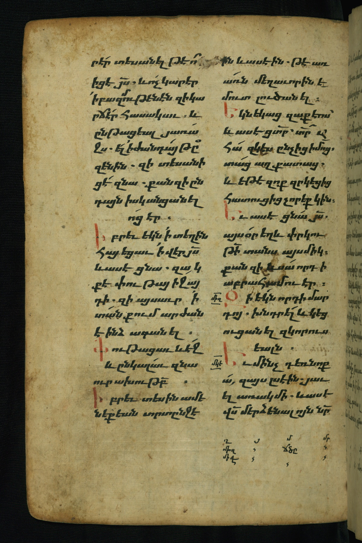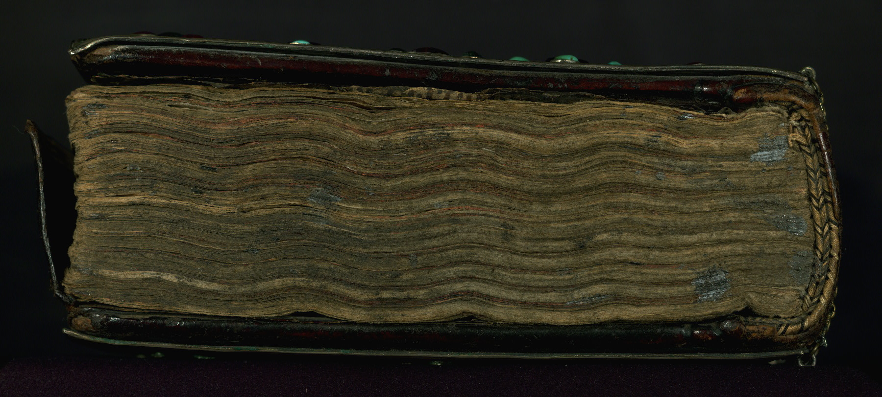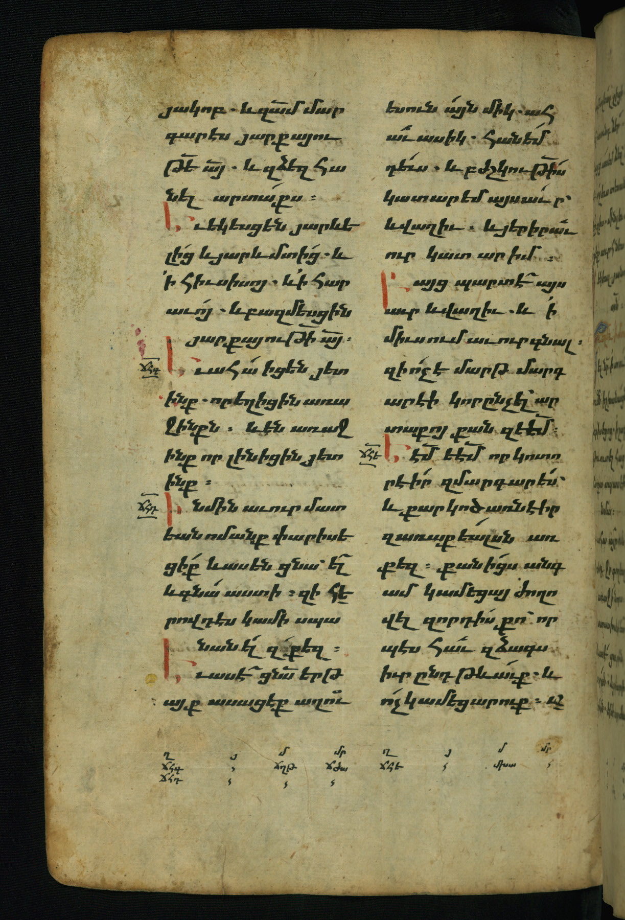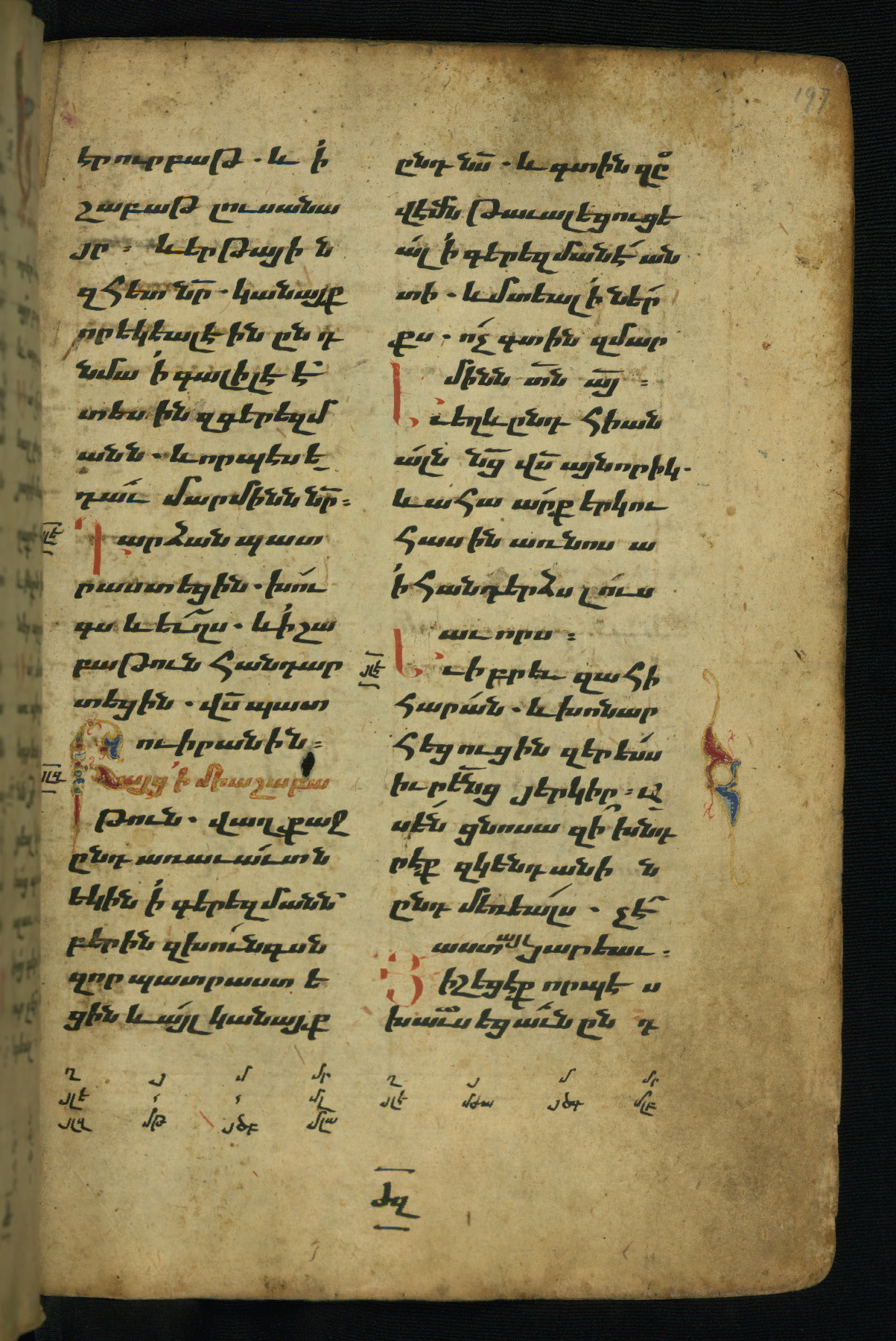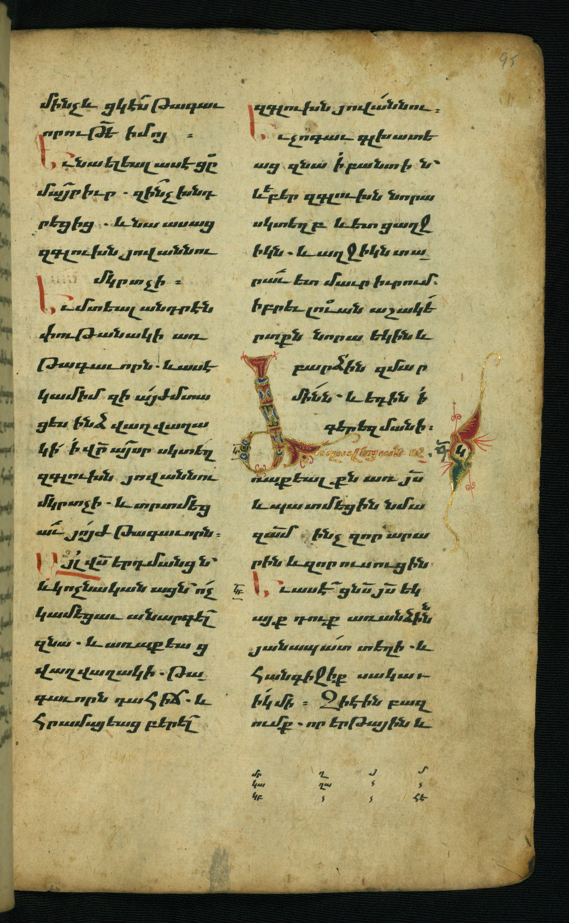 This manuscript was executed in 1475 CE by a scribe identified as Aristakes for a priest named Hakob. It contains a series of sixteen images on the life of Christ preceding the text of the Gospels, as well as the traditional Evangelist portraits, and there are marginal illustrations throughout. The style of the miniatures, which employ brilliant colors and emphasize decorative patterns, is characteristic of manuscript production in the region around Lake Van during the fifteenth century. The style of Lake Van has often been described in relation to schools of Islamic arts of the book. Numerous inscriptions (on fols. 258-260) spanning a few centuries attest to the manuscript's long history of use and revered preservation. The codex's later history included a rebinding with silver covers from Kayseri that date to approximately 1700. This jeweled and enameled silver binding bears a composition of the Adoration of the Magi on the front and the Ascension on the back.