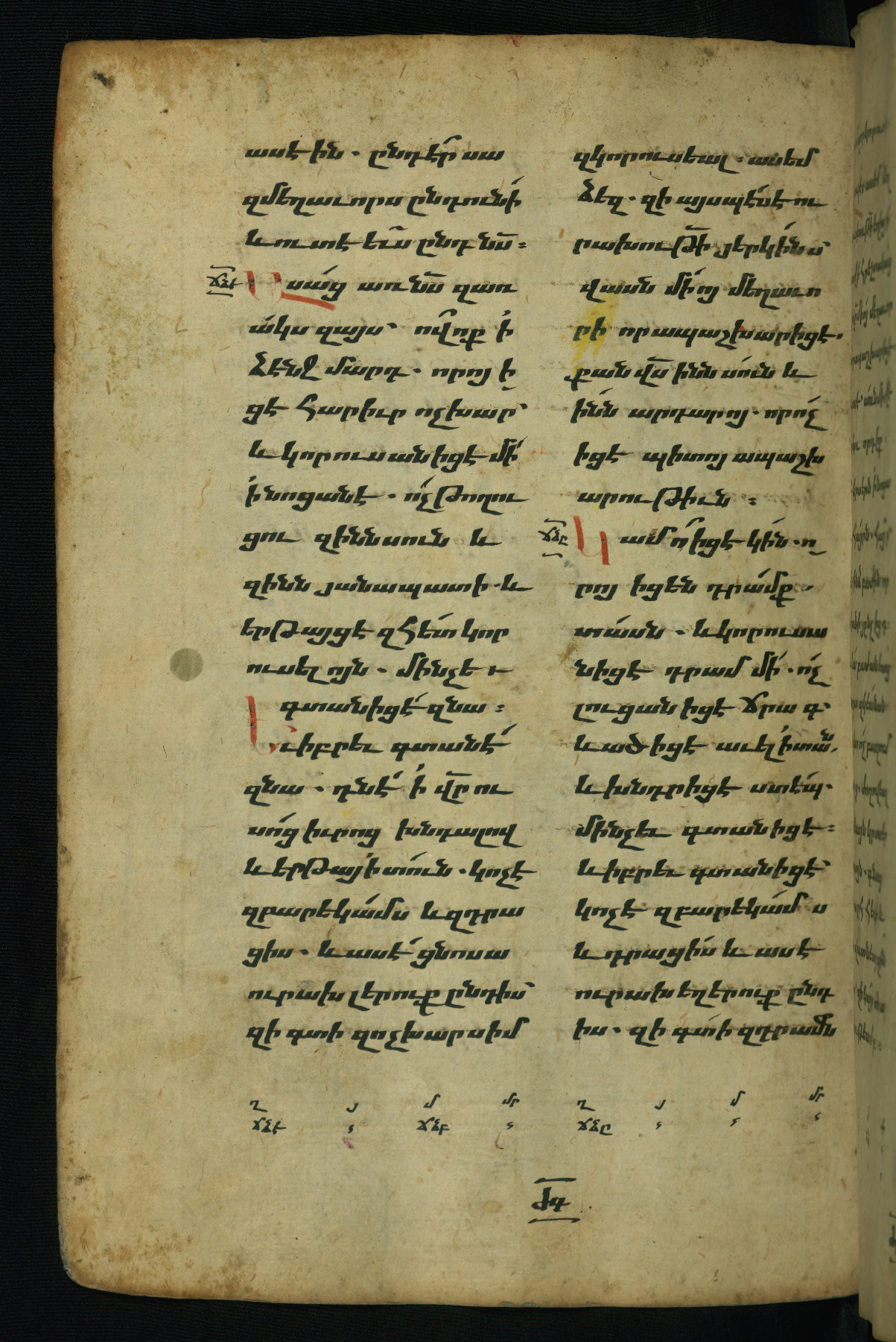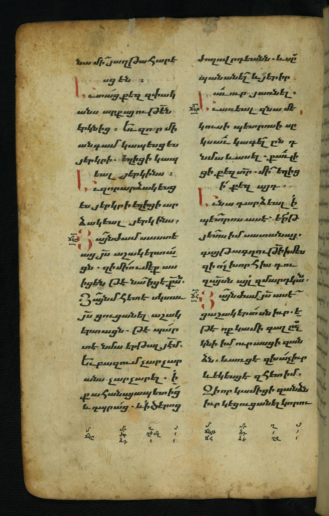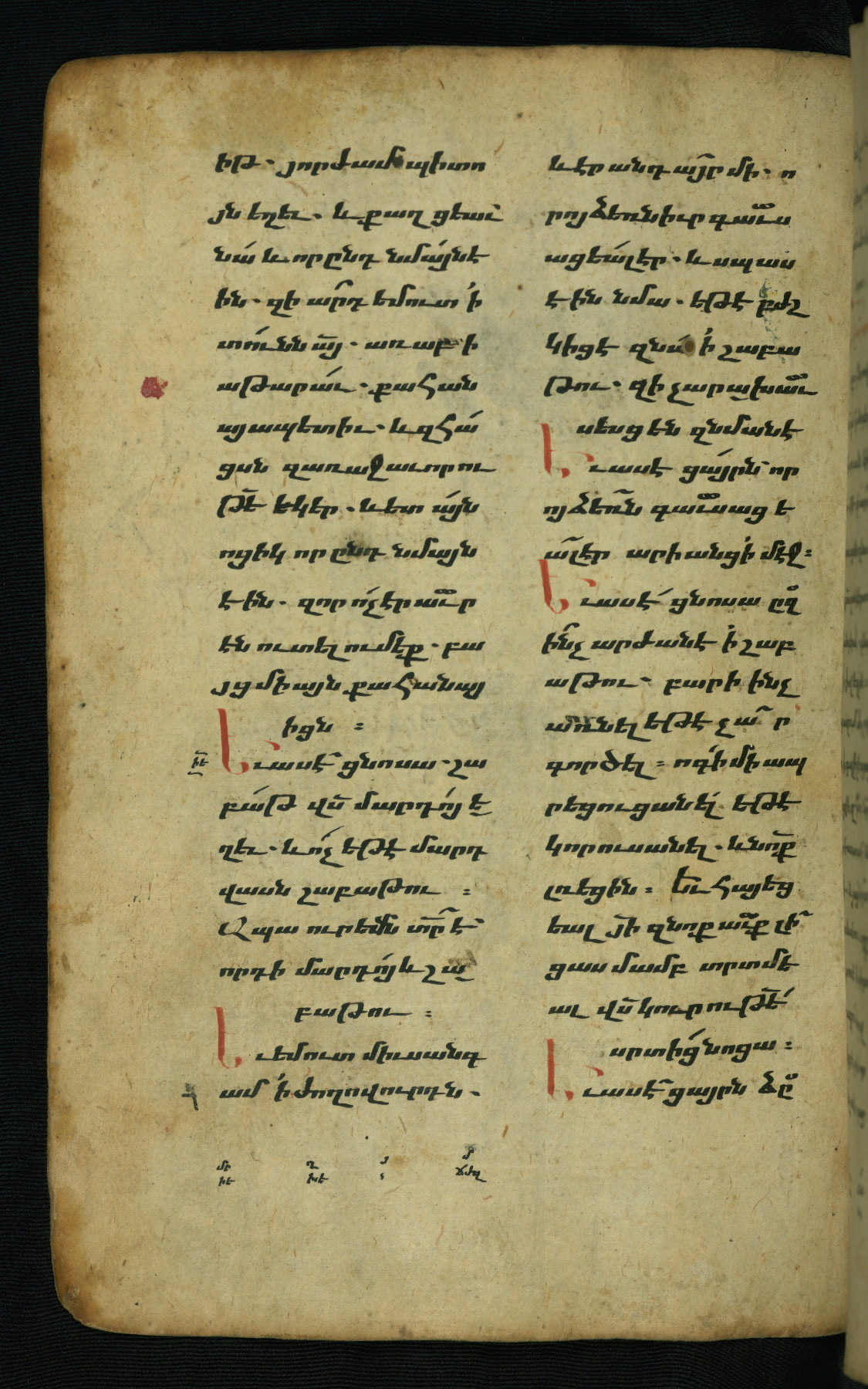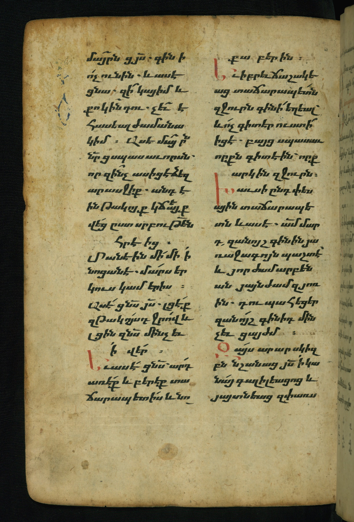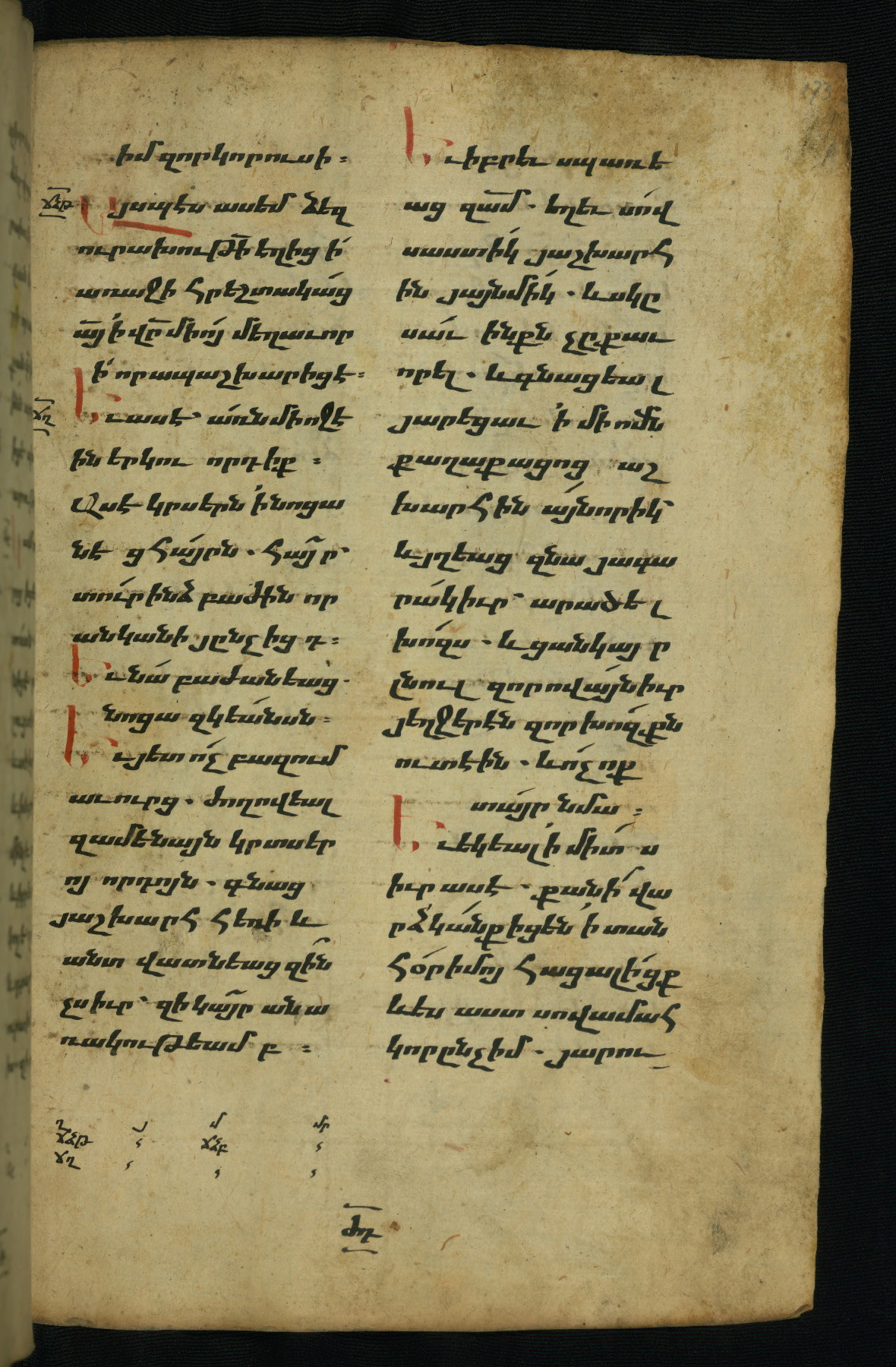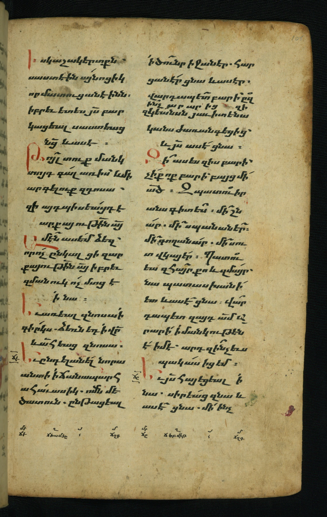 This manuscript was executed in 1475 CE by a scribe identified as Aristakes for a priest named Hakob. It contains a series of sixteen images on the life of Christ preceding the text of the Gospels, as well as the traditional Evangelist portraits, and there are marginal illustrations throughout. The style of the miniatures, which employ brilliant colors and emphasize decorative patterns, is characteristic of manuscript production in the region around Lake Van during the fifteenth century. The style of Lake Van has often been described in relation to schools of Islamic arts of the book. Numerous inscriptions (on fols. 258-260) spanning a few centuries attest to the manuscript's long history of use and revered preservation. The codex's later history included a rebinding with silver covers from Kayseri that date to approximately 1700. This jeweled and enameled silver binding bears a composition of the Adoration of the Magi on the front and the Ascension on the back.