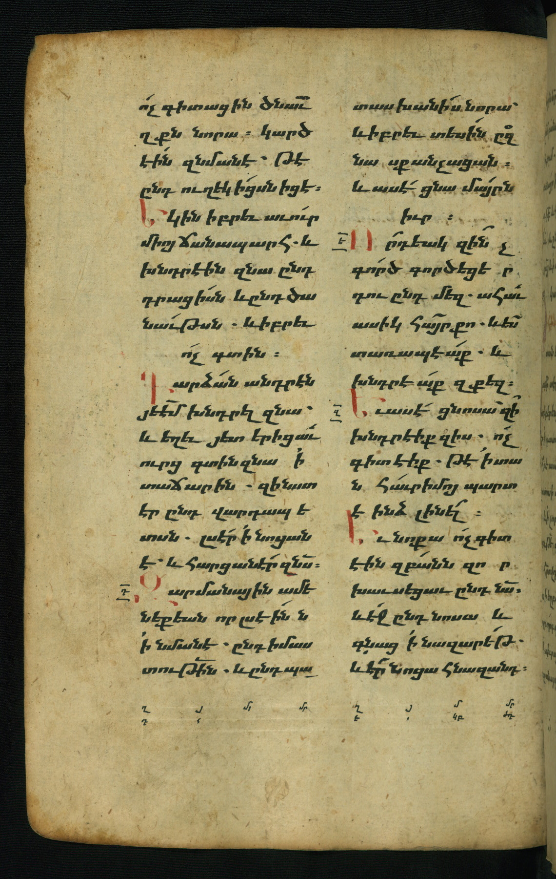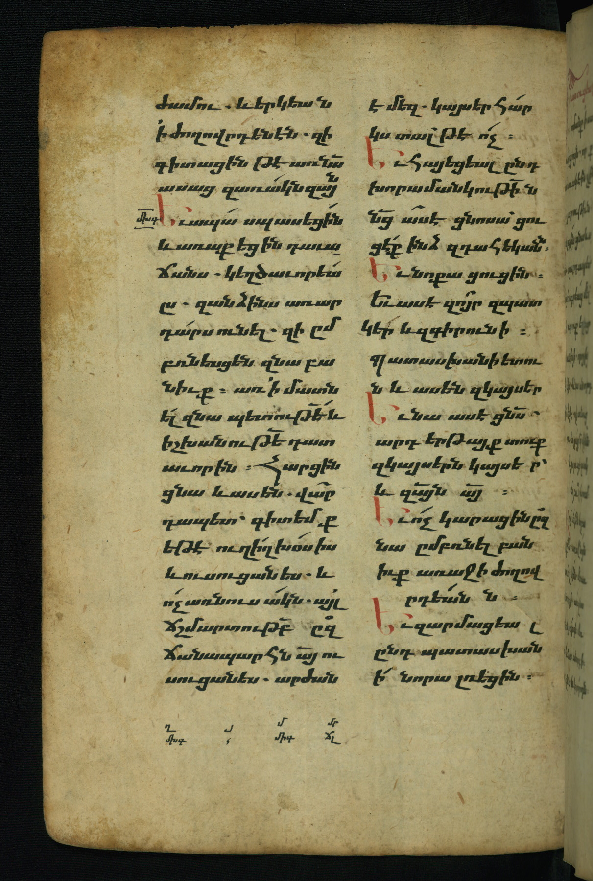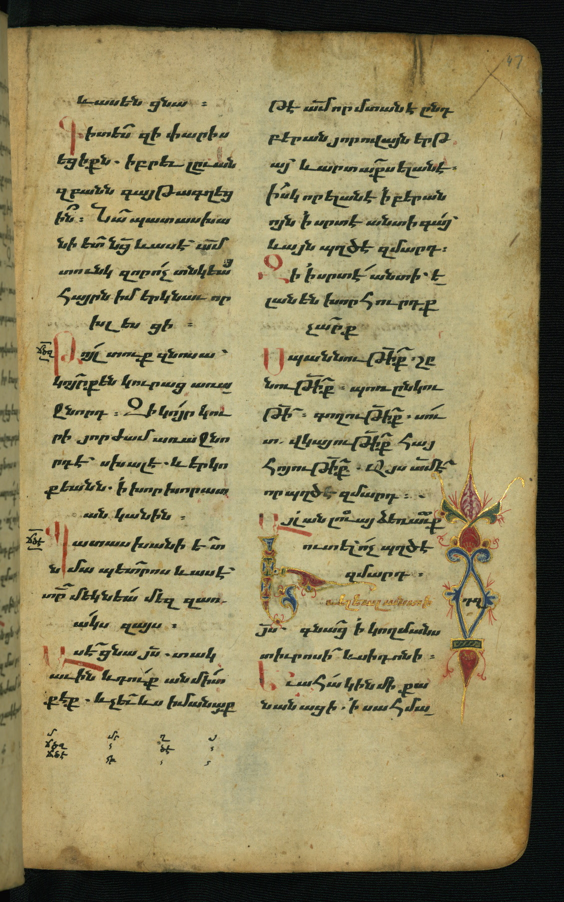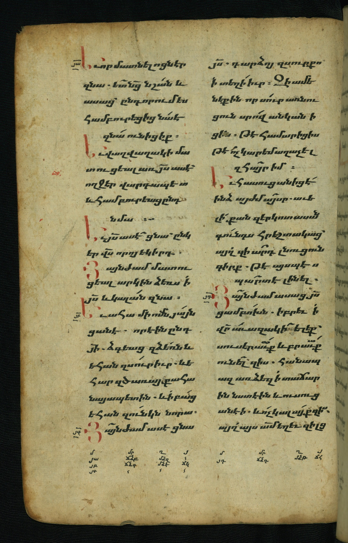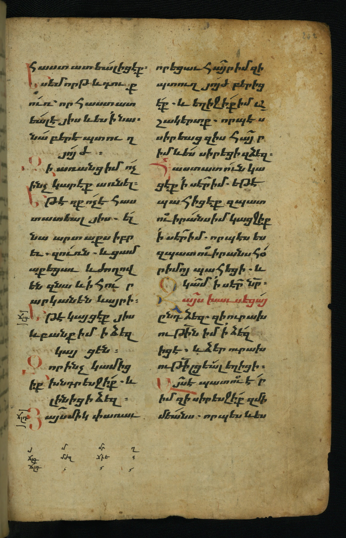 This manuscript was executed in 1475 CE by a scribe identified as Aristakes for a priest named Hakob. It contains a series of sixteen images on the life of Christ preceding the text of the Gospels, as well as the traditional Evangelist portraits, and there are marginal illustrations throughout. The style of the miniatures, which employ brilliant colors and emphasize decorative patterns, is characteristic of manuscript production in the region around Lake Van during the fifteenth century. The style of Lake Van has often been described in relation to schools of Islamic arts of the book. Numerous inscriptions (on fols. 258-260) spanning a few centuries attest to the manuscript's long history of use and revered preservation. The codex's later history included a rebinding with silver covers from Kayseri that date to approximately 1700. This jeweled and enameled silver binding bears a composition of the Adoration of the Magi on the front and the Ascension on the back.