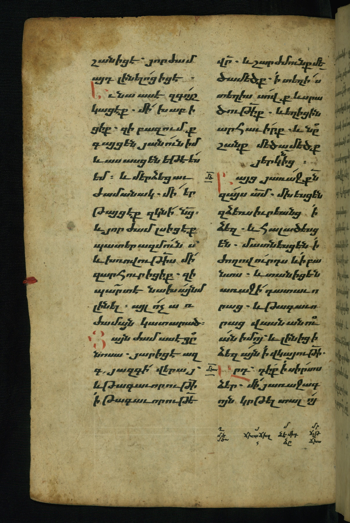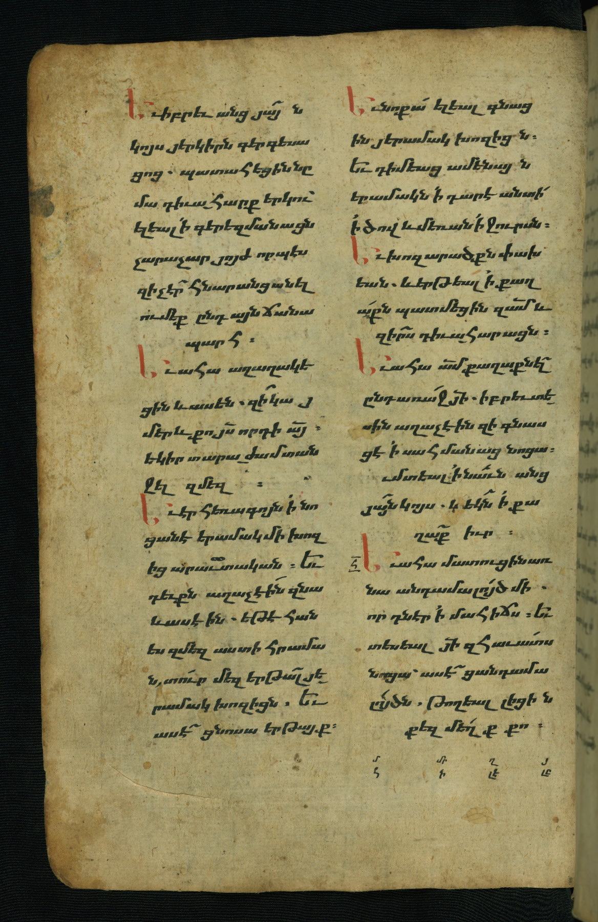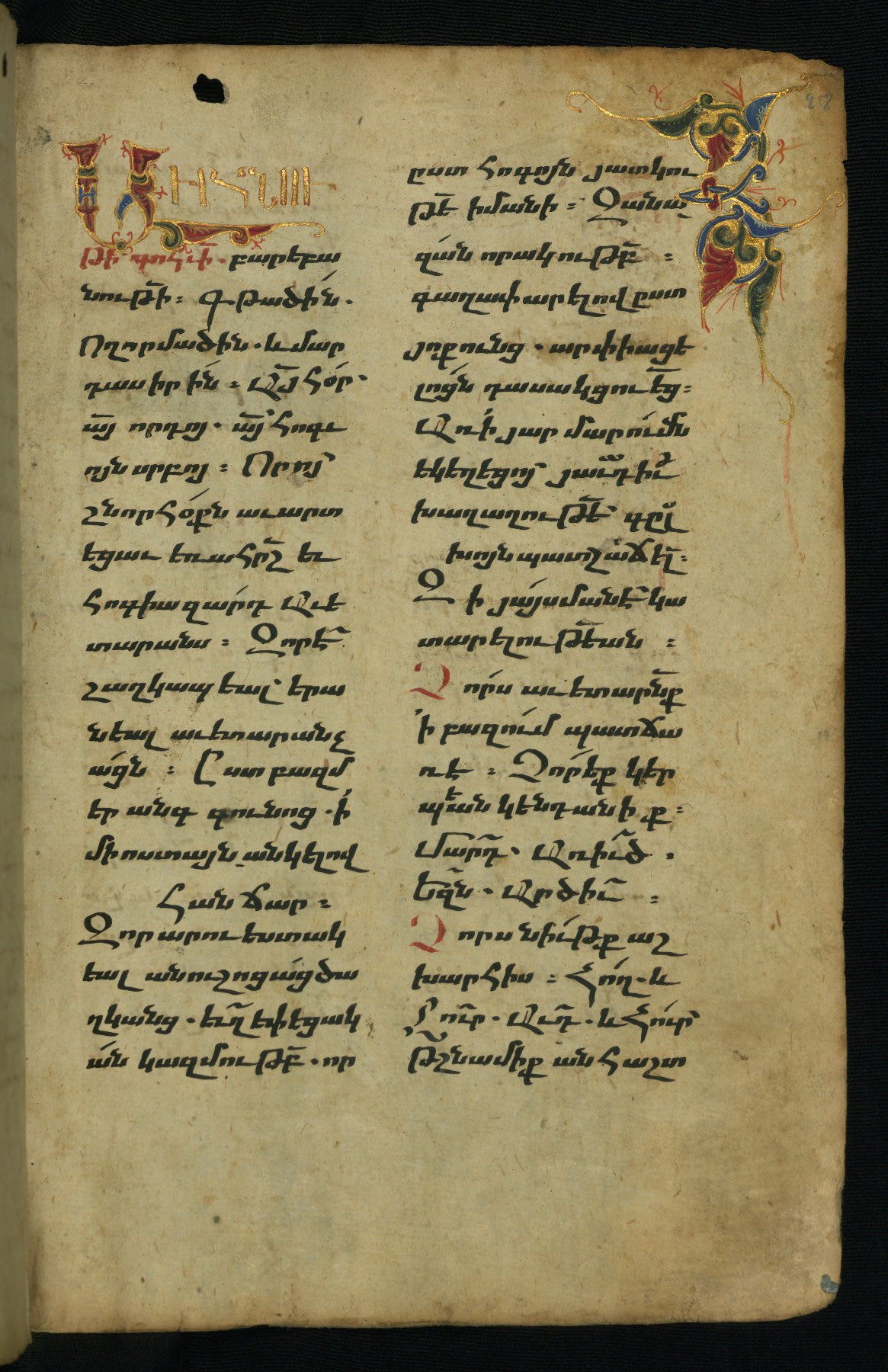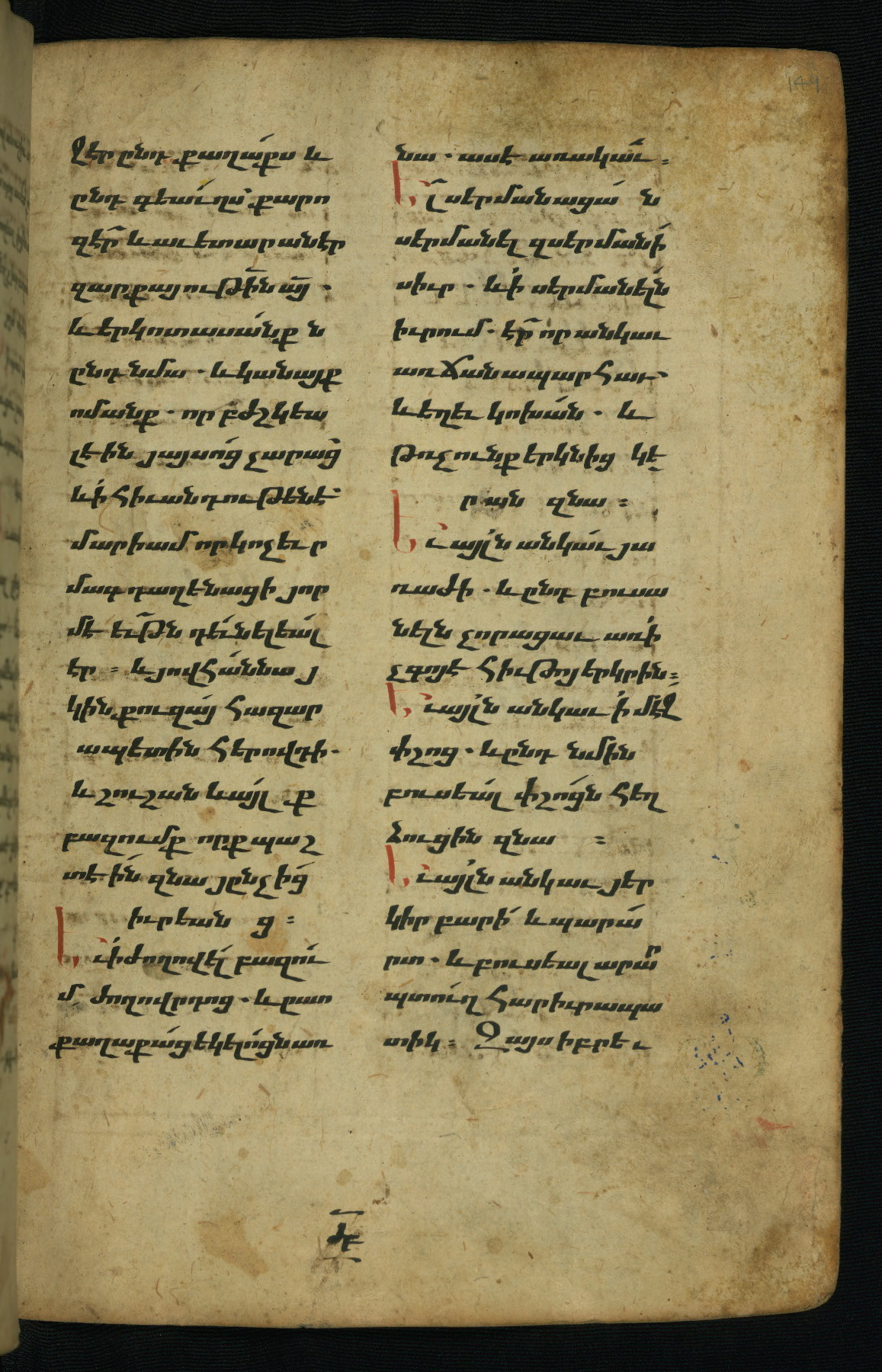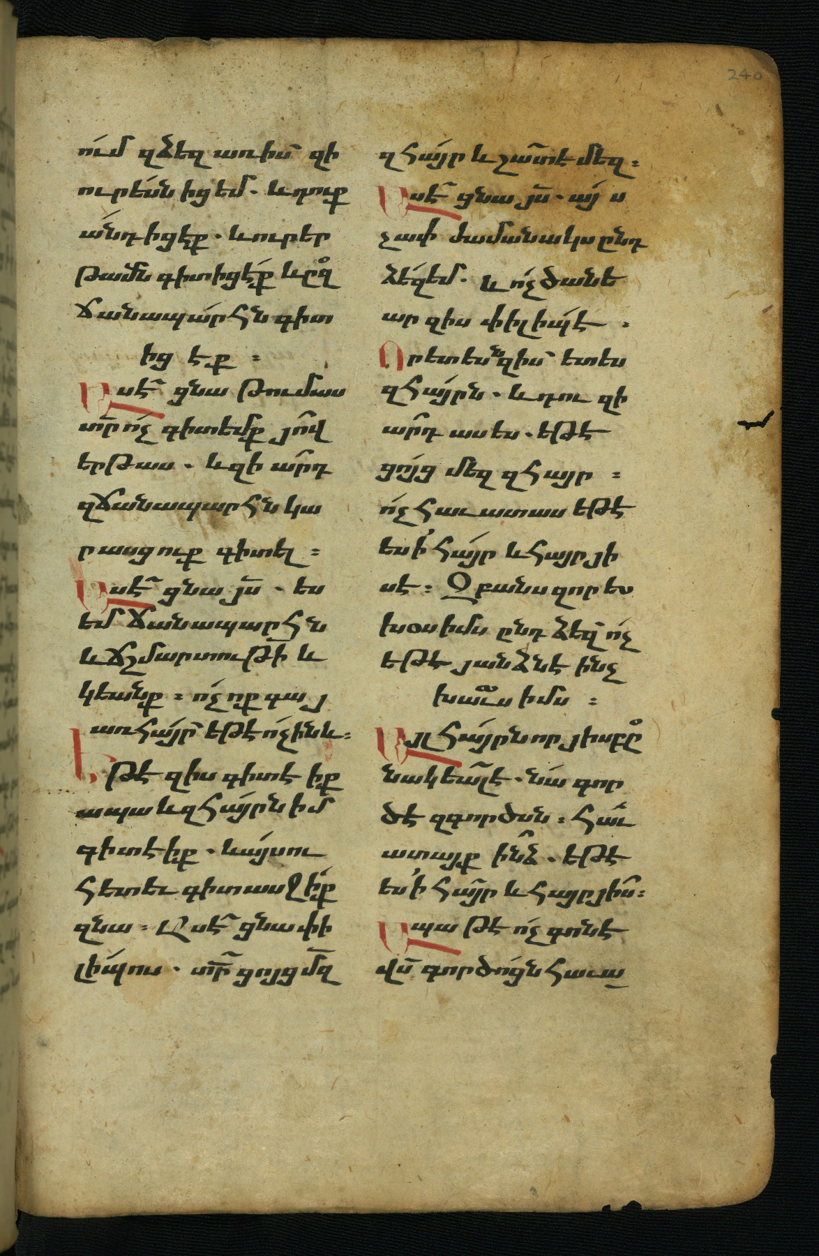 This manuscript was executed in 1475 CE by a scribe identified as Aristakes for a priest named Hakob. It contains a series of sixteen images on the life of Christ preceding the text of the Gospels, as well as the traditional Evangelist portraits, and there are marginal illustrations throughout. The style of the miniatures, which employ brilliant colors and emphasize decorative patterns, is characteristic of manuscript production in the region around Lake Van during the fifteenth century. The style of Lake Van has often been described in relation to schools of Islamic arts of the book. Numerous inscriptions (on fols. 258-260) spanning a few centuries attest to the manuscript's long history of use and revered preservation. The codex's later history included a rebinding with silver covers from Kayseri that date to approximately 1700. This jeweled and enameled silver binding bears a composition of the Adoration of the Magi on the front and the Ascension on the back.