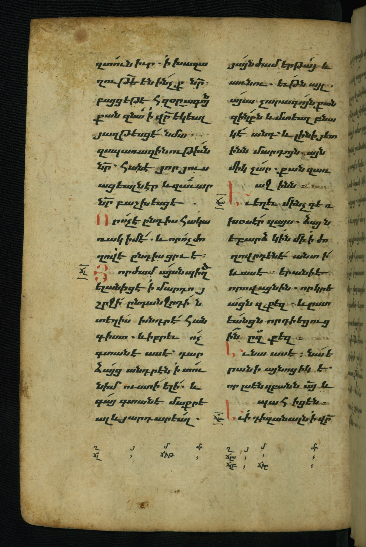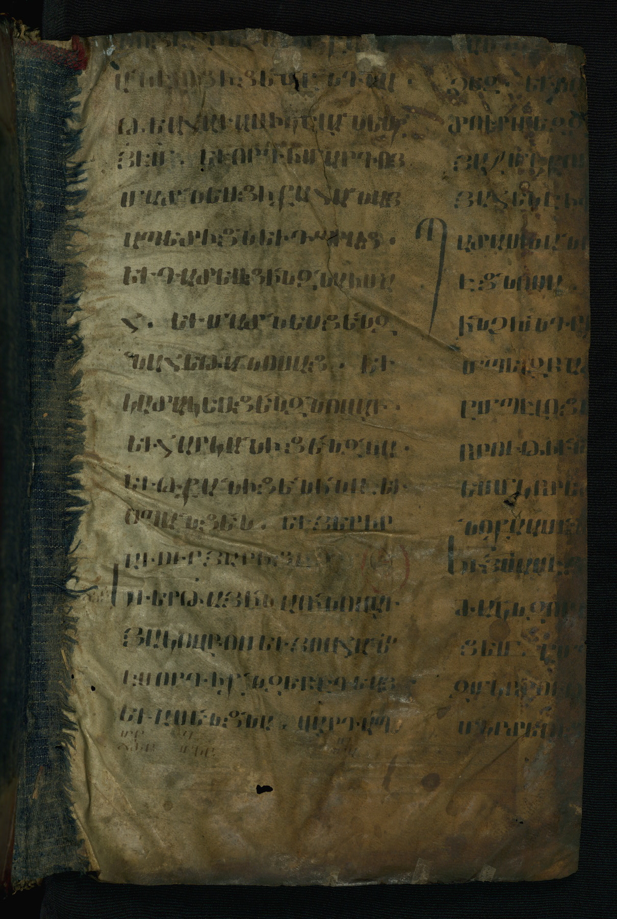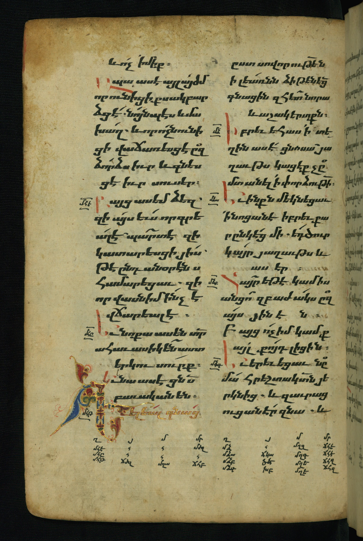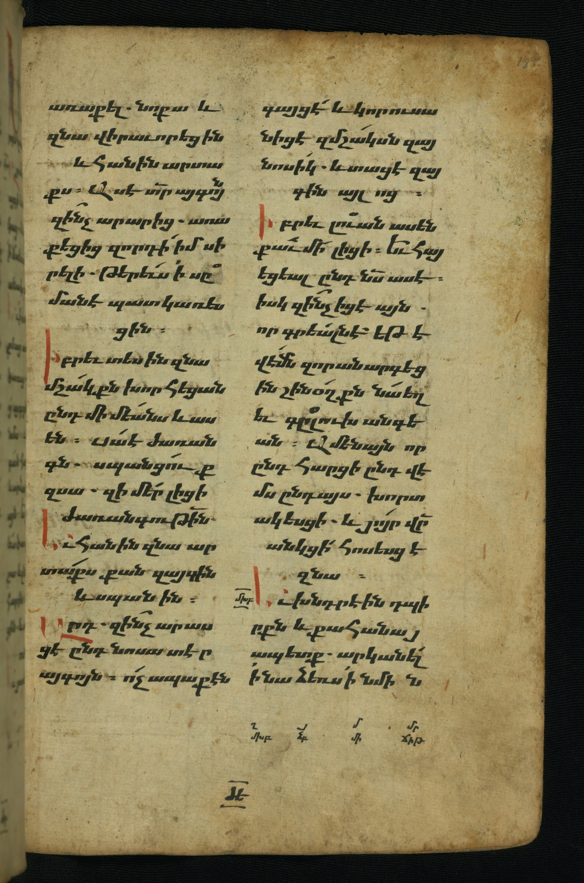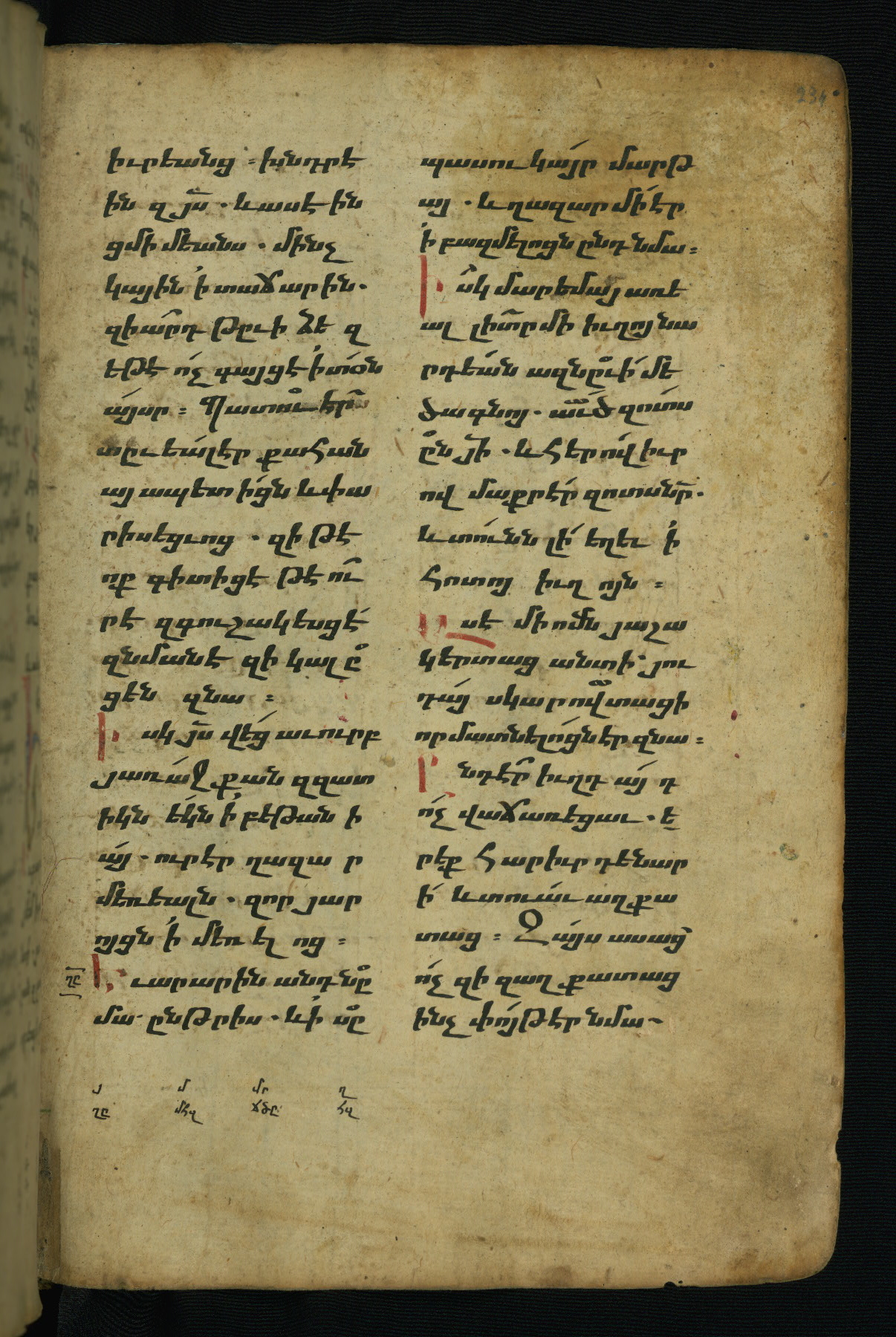 This manuscript was executed in 1475 CE by a scribe identified as Aristakes for a priest named Hakob. It contains a series of sixteen images on the life of Christ preceding the text of the Gospels, as well as the traditional Evangelist portraits, and there are marginal illustrations throughout. The style of the miniatures, which employ brilliant colors and emphasize decorative patterns, is characteristic of manuscript production in the region around Lake Van during the fifteenth century. The style of Lake Van has often been described in relation to schools of Islamic arts of the book. Numerous inscriptions (on fols. 258-260) spanning a few centuries attest to the manuscript's long history of use and revered preservation. The codex's later history included a rebinding with silver covers from Kayseri that date to approximately 1700. This jeweled and enameled silver binding bears a composition of the Adoration of the Magi on the front and the Ascension on the back.