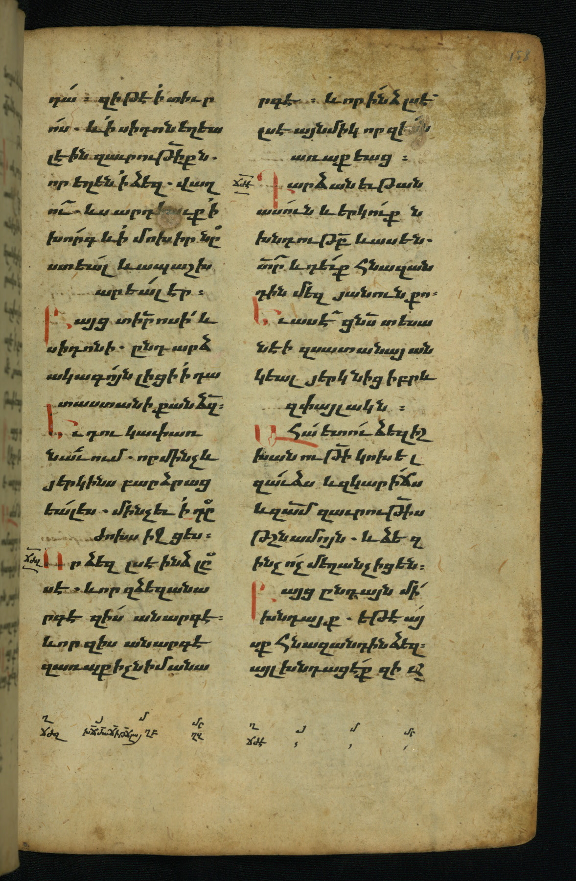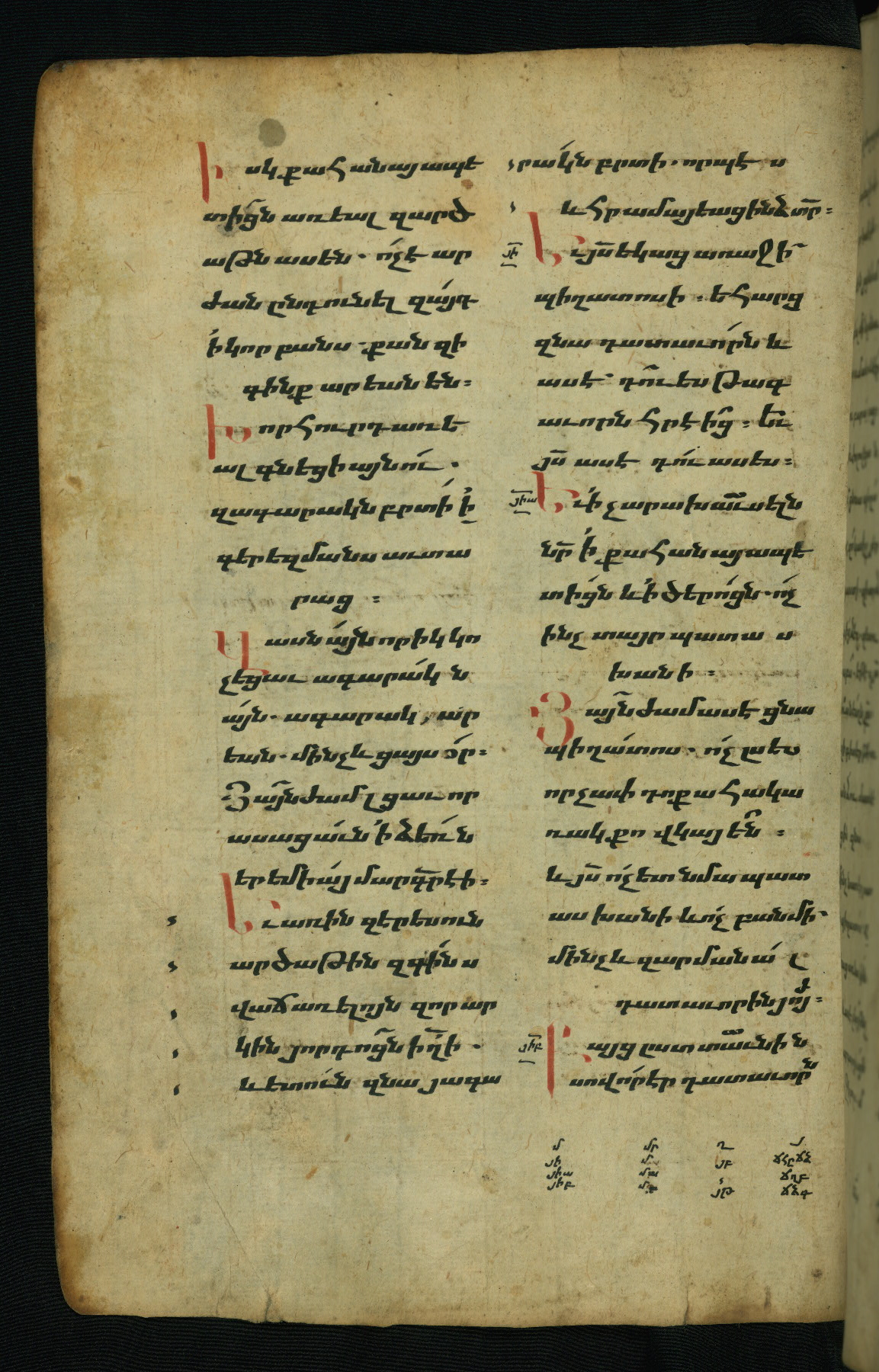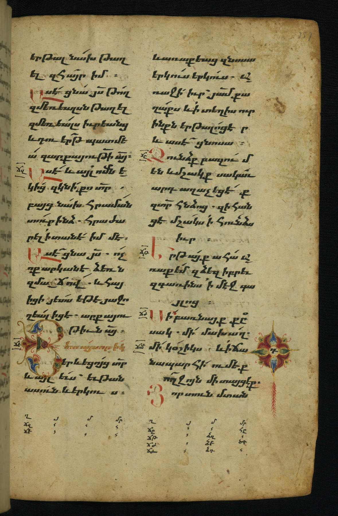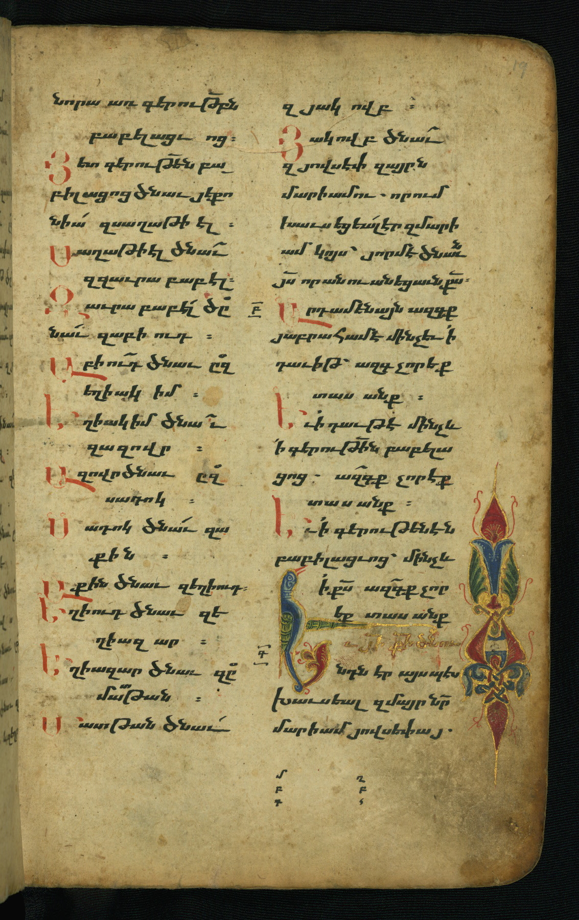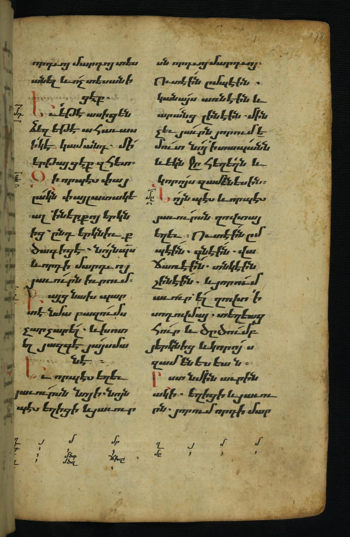 This manuscript was executed in 1475 CE by a scribe identified as Aristakes for a priest named Hakob. It contains a series of sixteen images on the life of Christ preceding the text of the Gospels, as well as the traditional Evangelist portraits, and there are marginal illustrations throughout. The style of the miniatures, which employ brilliant colors and emphasize decorative patterns, is characteristic of manuscript production in the region around Lake Van during the fifteenth century. The style of Lake Van has often been described in relation to schools of Islamic arts of the book. Numerous inscriptions (on fols. 258-260) spanning a few centuries attest to the manuscript's long history of use and revered preservation. The codex's later history included a rebinding with silver covers from Kayseri that date to approximately 1700. This jeweled and enameled silver binding bears a composition of the Adoration of the Magi on the front and the Ascension on the back.