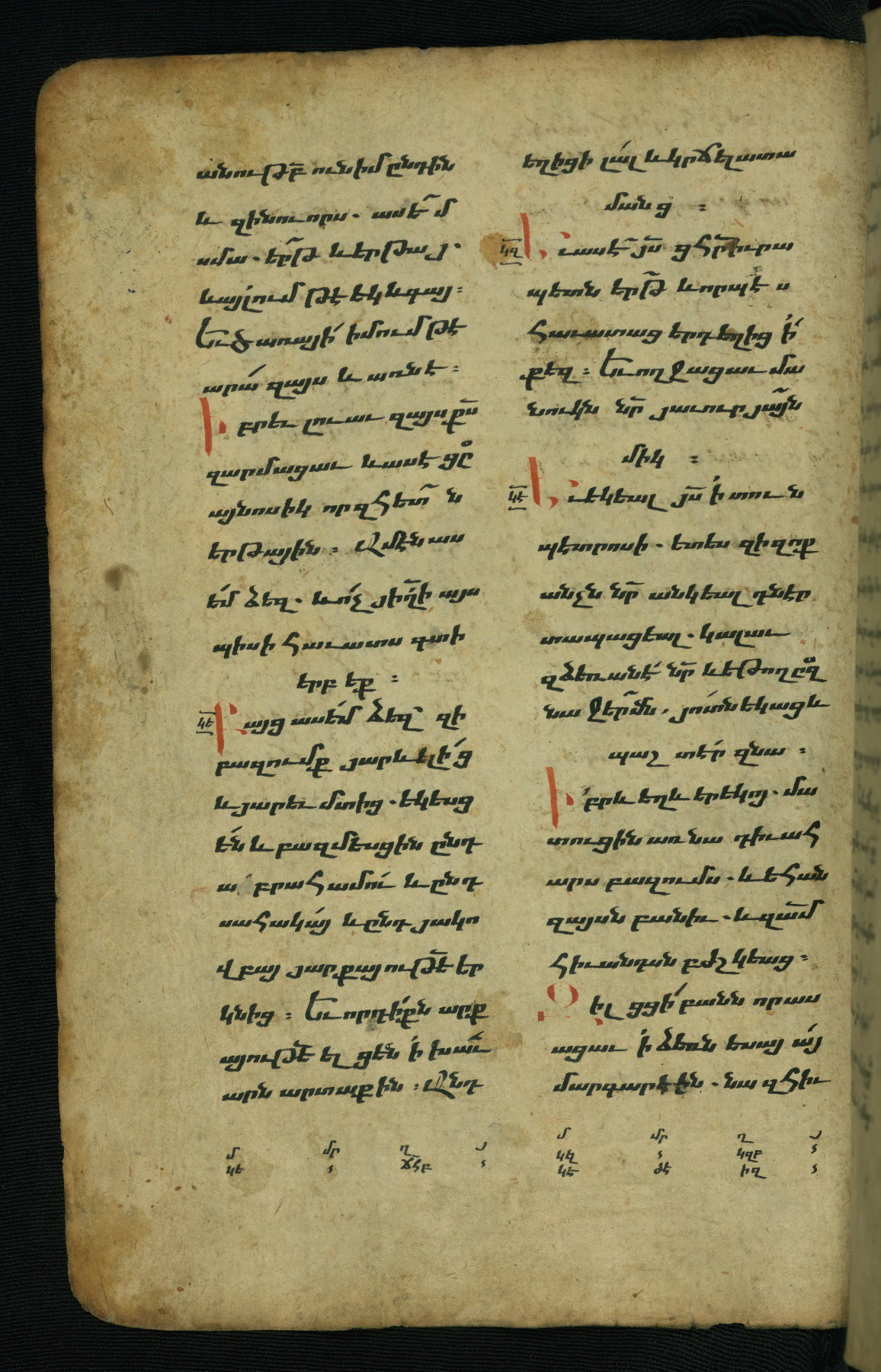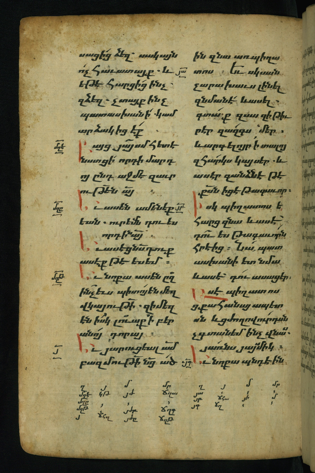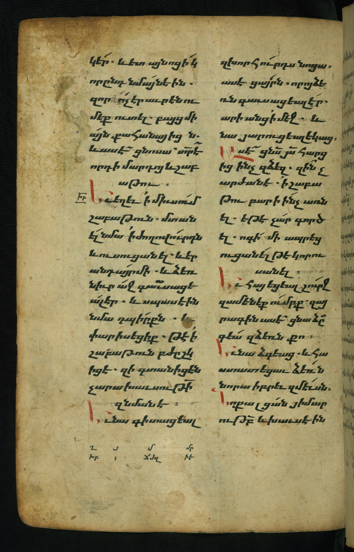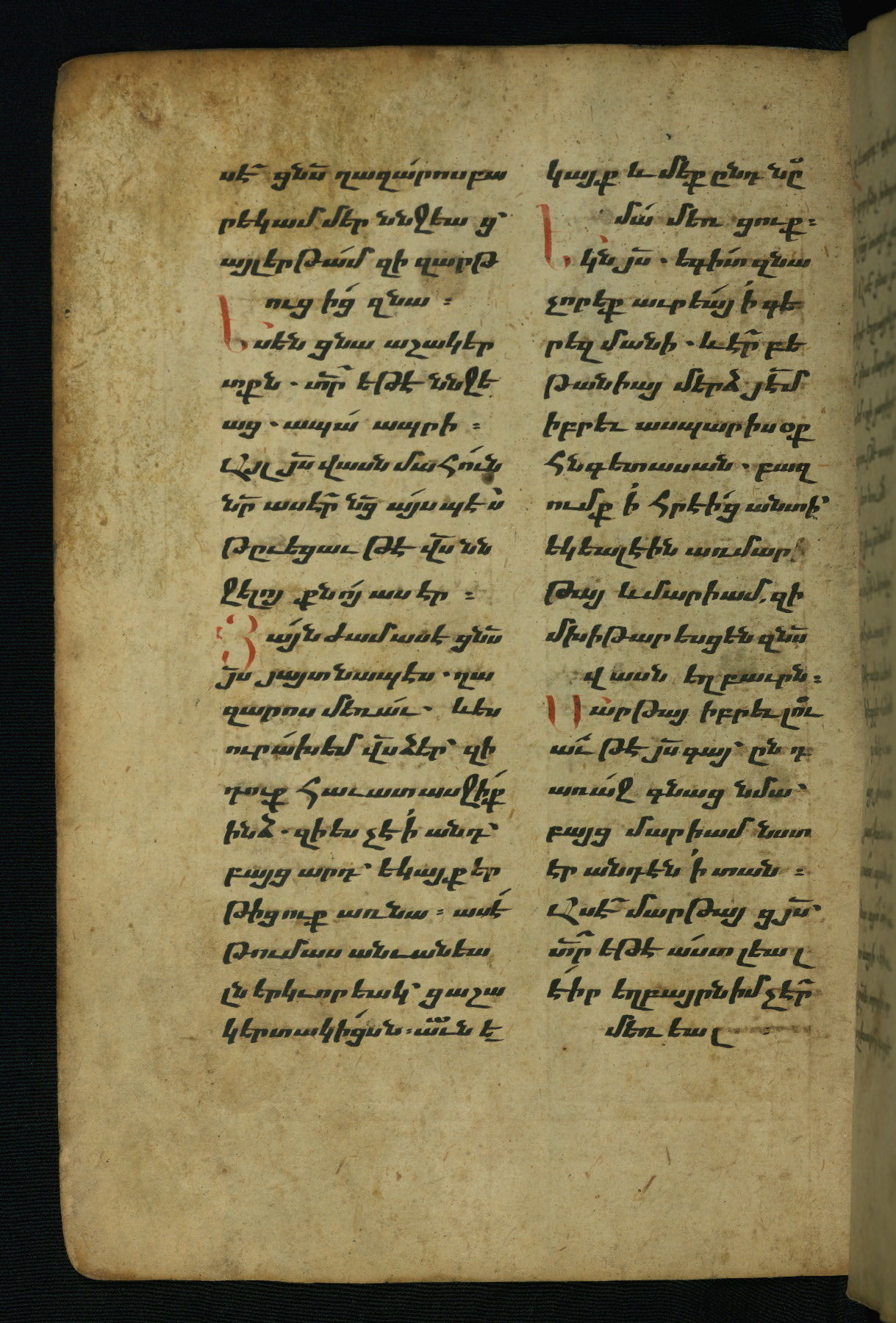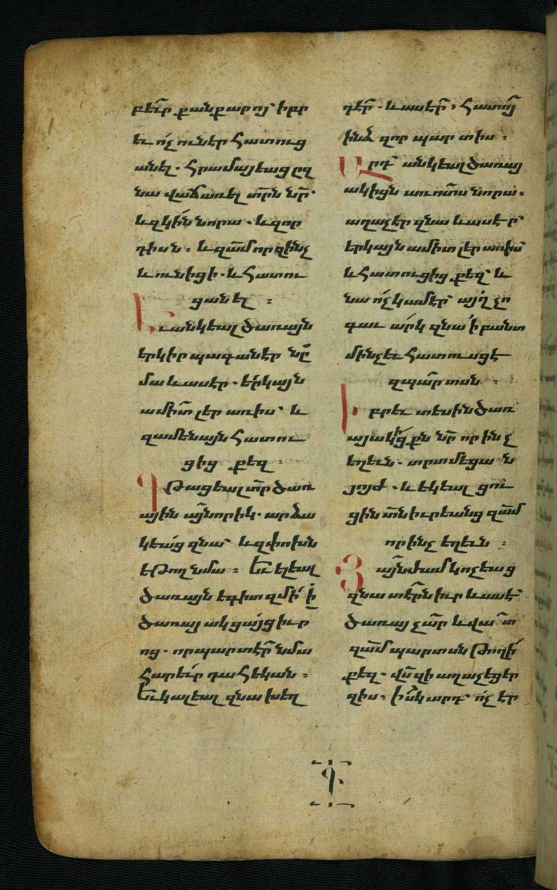 This manuscript was executed in 1475 CE by a scribe identified as Aristakes for a priest named Hakob. It contains a series of sixteen images on the life of Christ preceding the text of the Gospels, as well as the traditional Evangelist portraits, and there are marginal illustrations throughout. The style of the miniatures, which employ brilliant colors and emphasize decorative patterns, is characteristic of manuscript production in the region around Lake Van during the fifteenth century. The style of Lake Van has often been described in relation to schools of Islamic arts of the book. Numerous inscriptions (on fols. 258-260) spanning a few centuries attest to the manuscript's long history of use and revered preservation. The codex's later history included a rebinding with silver covers from Kayseri that date to approximately 1700. This jeweled and enameled silver binding bears a composition of the Adoration of the Magi on the front and the Ascension on the back.