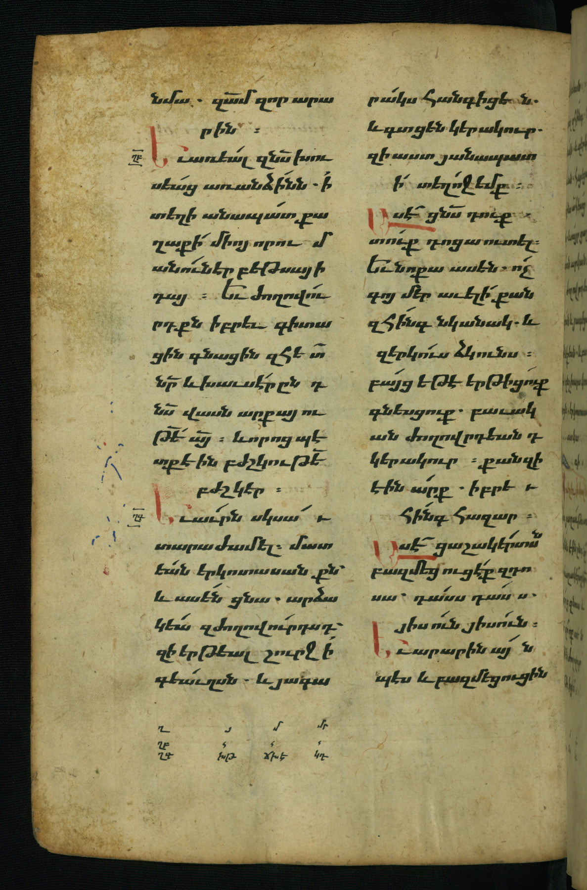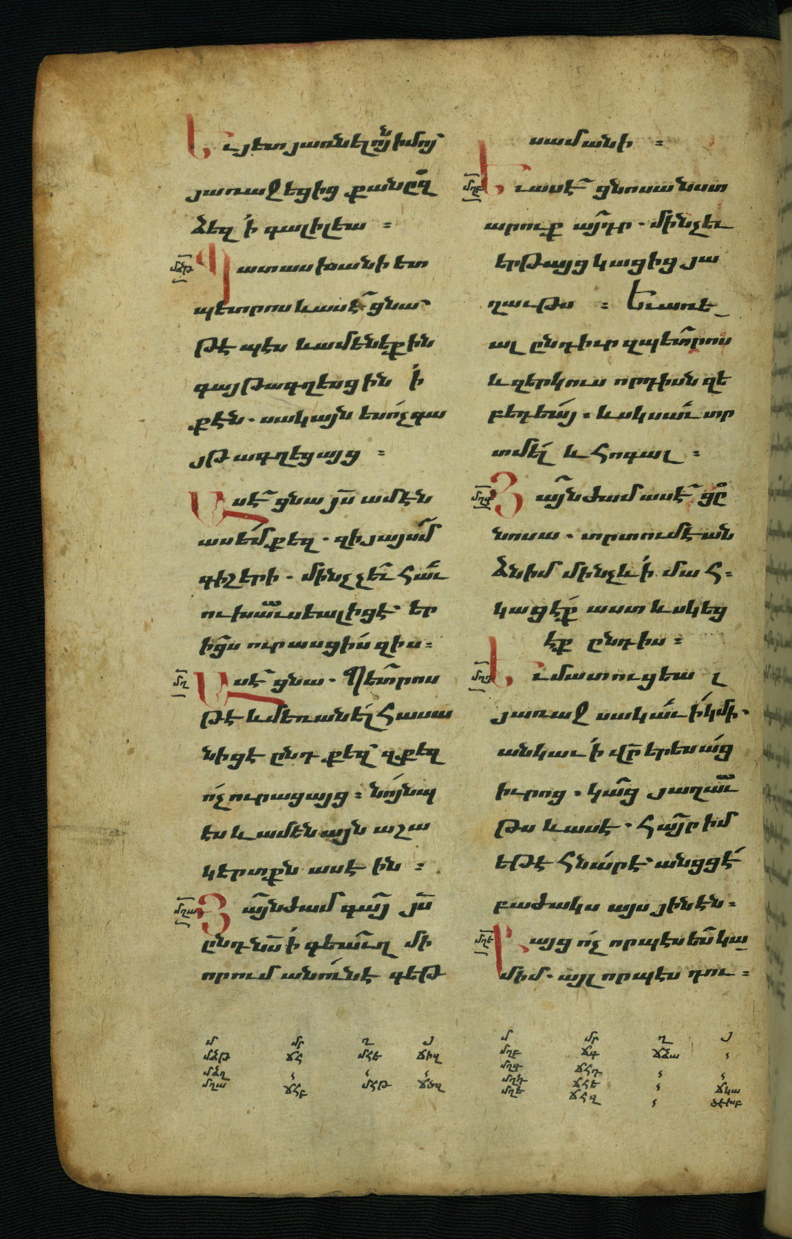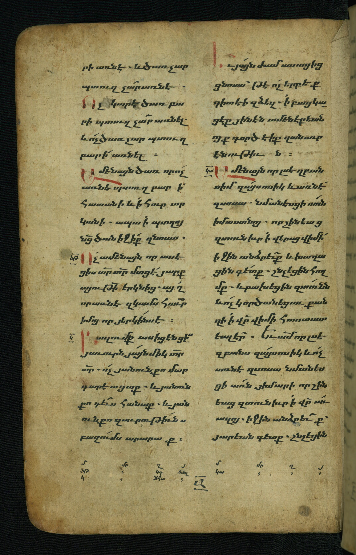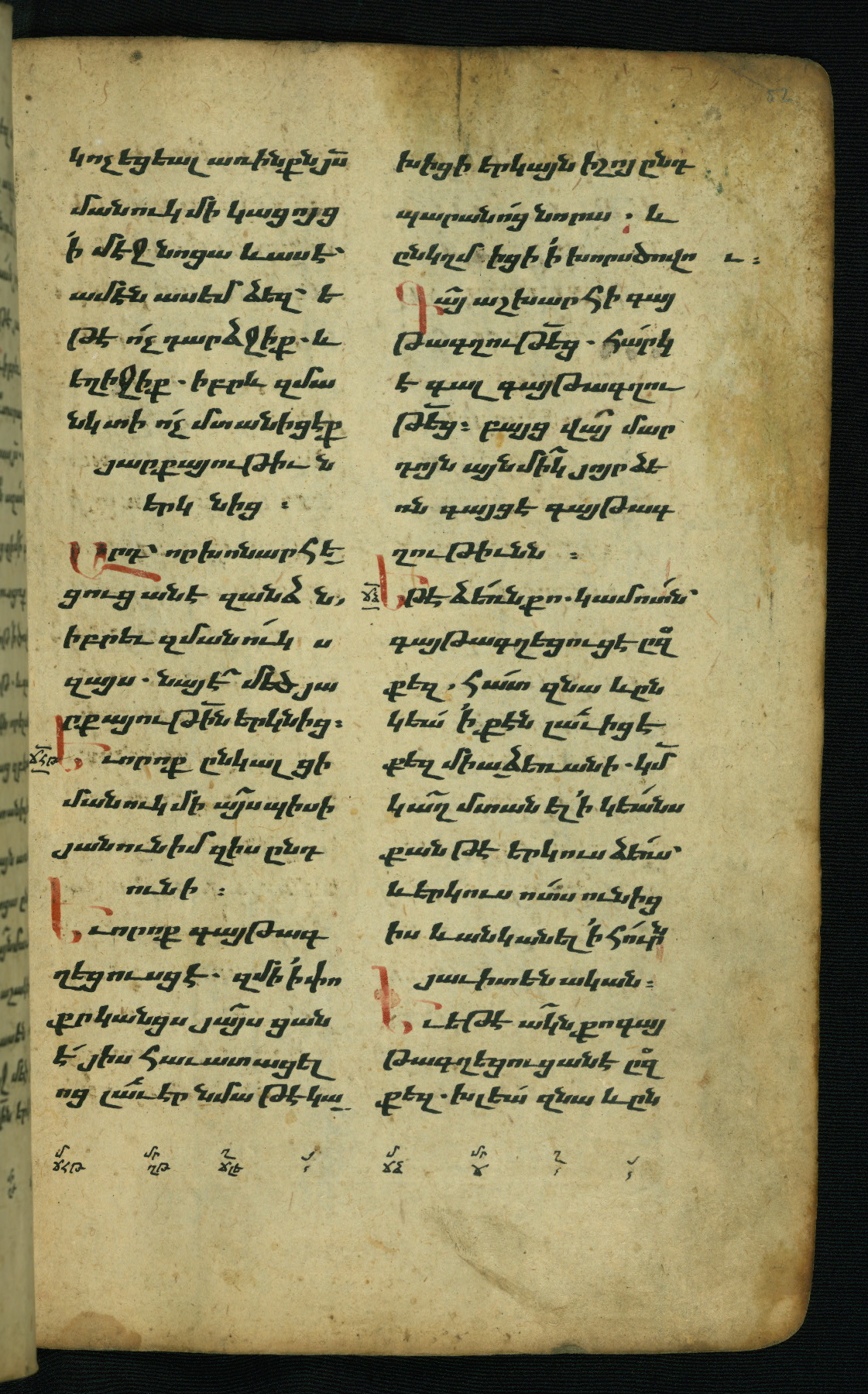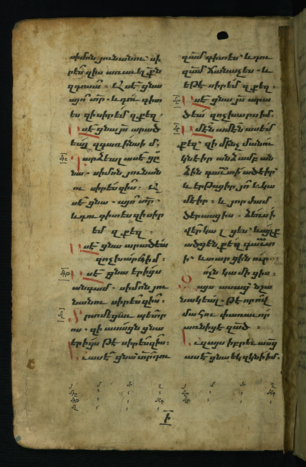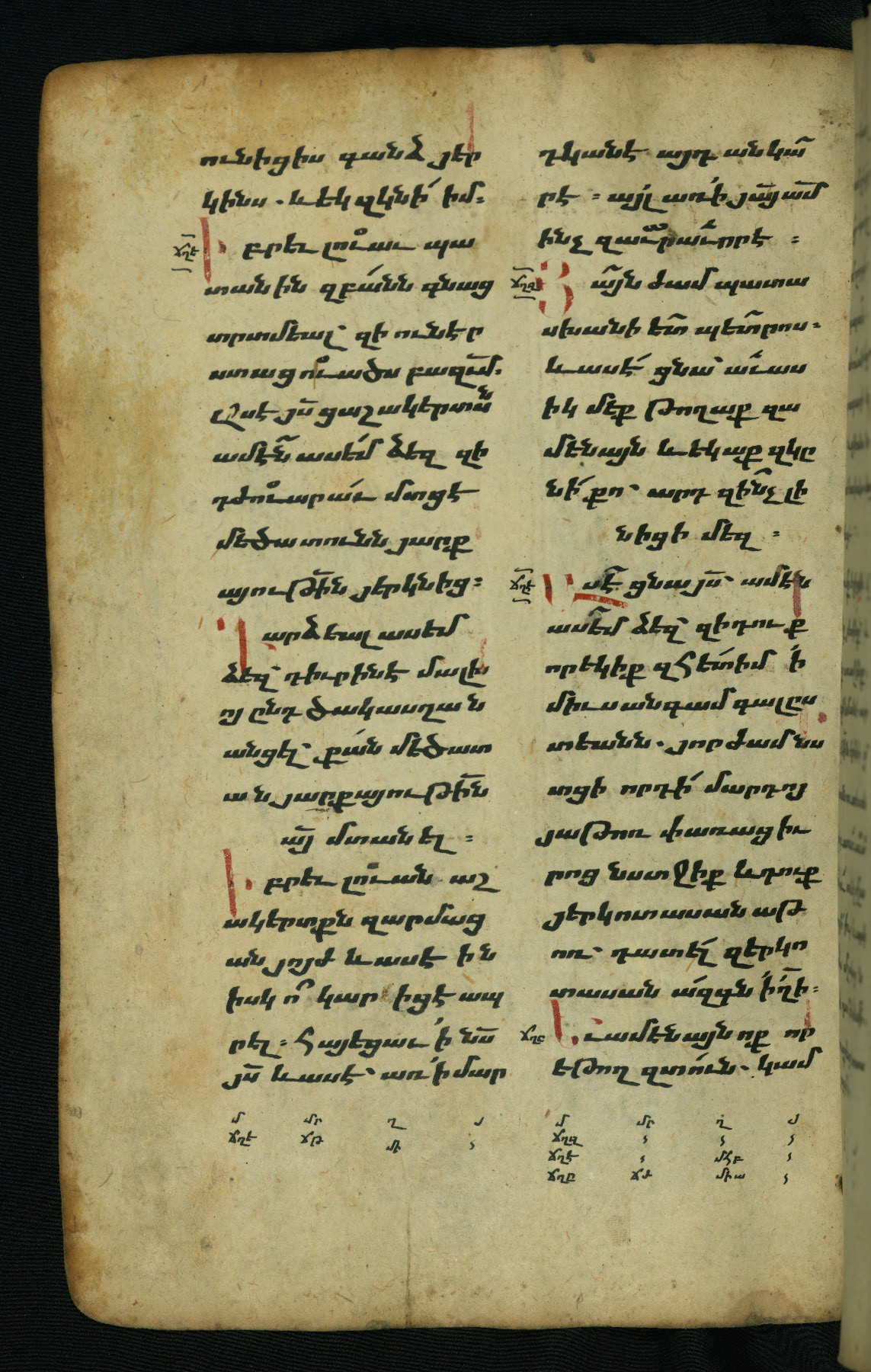 This manuscript was executed in 1475 CE by a scribe identified as Aristakes for a priest named Hakob. It contains a series of sixteen images on the life of Christ preceding the text of the Gospels, as well as the traditional Evangelist portraits, and there are marginal illustrations throughout. The style of the miniatures, which employ brilliant colors and emphasize decorative patterns, is characteristic of manuscript production in the region around Lake Van during the fifteenth century. The style of Lake Van has often been described in relation to schools of Islamic arts of the book. Numerous inscriptions (on fols. 258-260) spanning a few centuries attest to the manuscript's long history of use and revered preservation. The codex's later history included a rebinding with silver covers from Kayseri that date to approximately 1700. This jeweled and enameled silver binding bears a composition of the Adoration of the Magi on the front and the Ascension on the back.