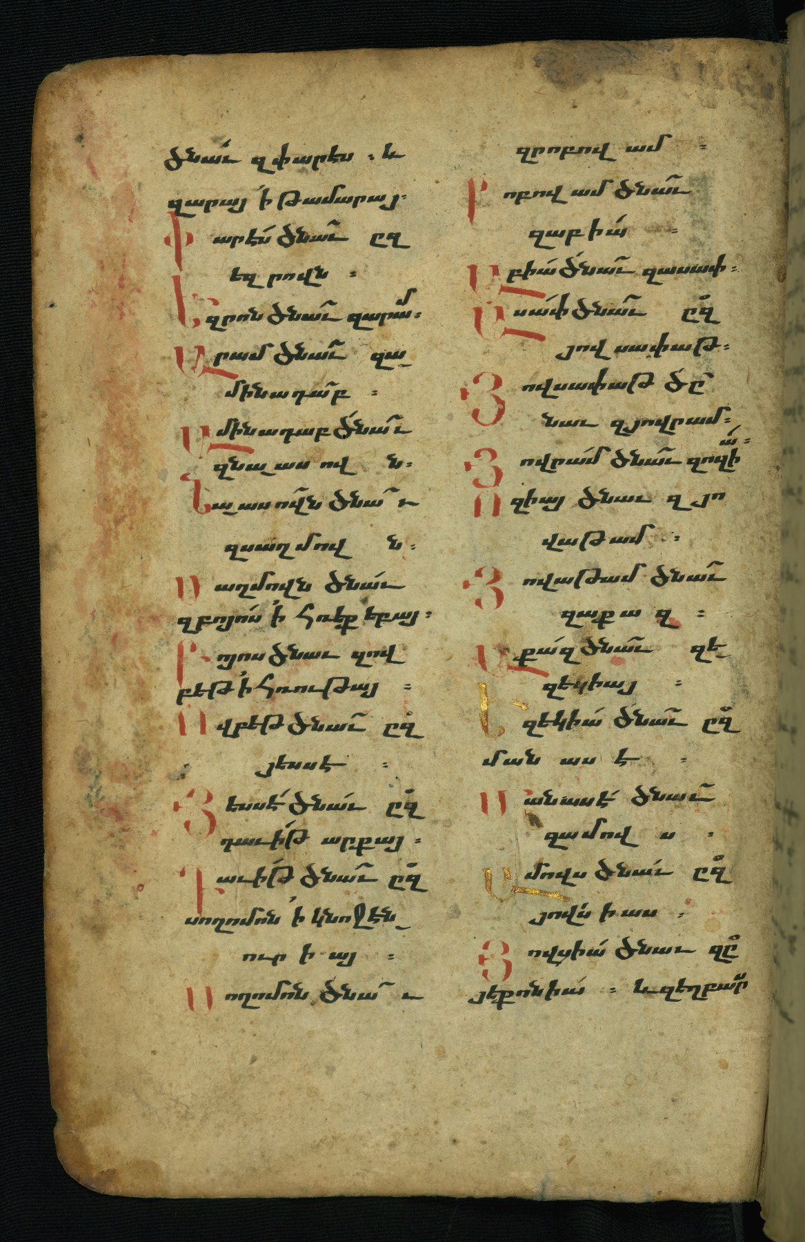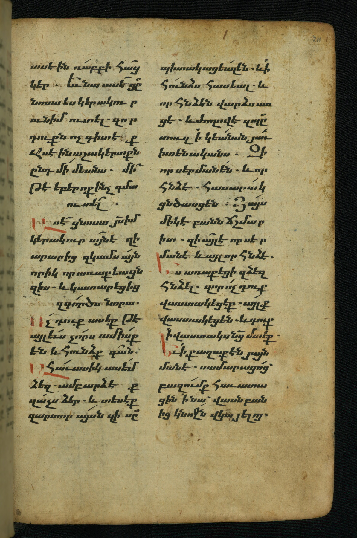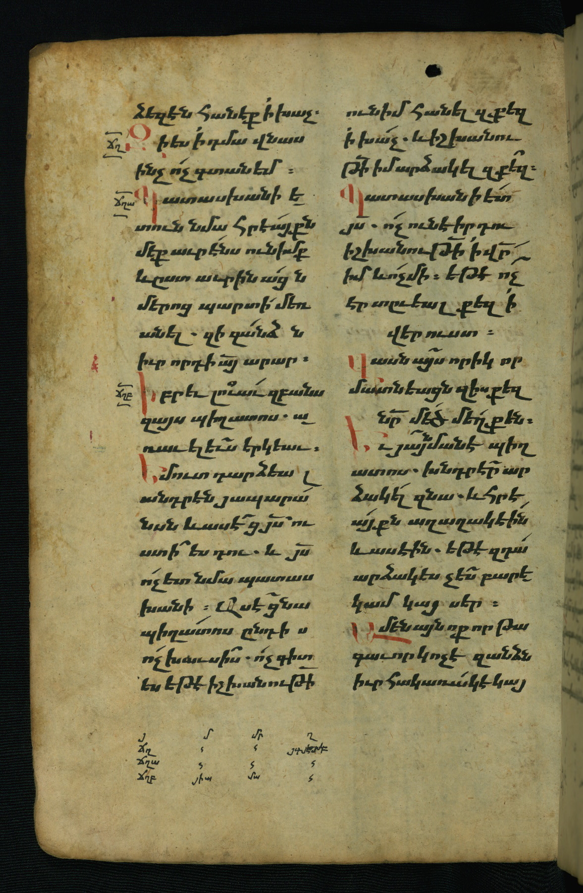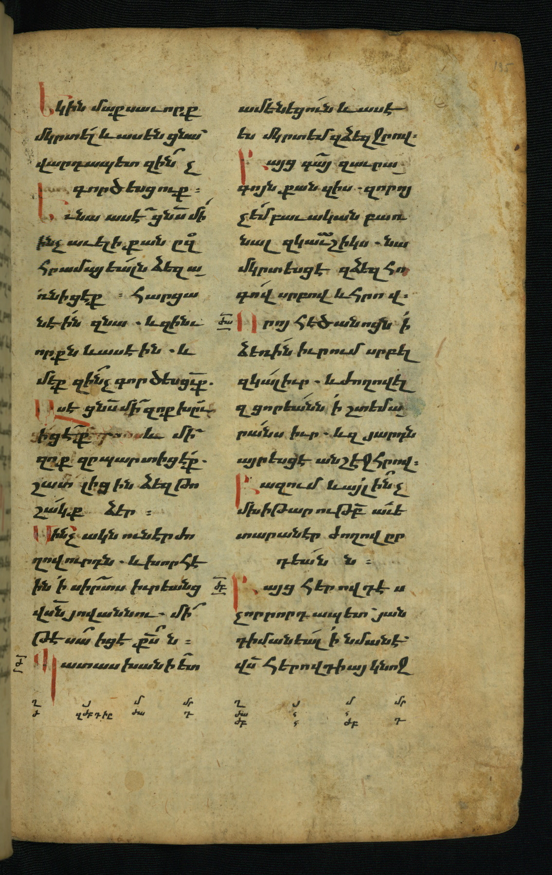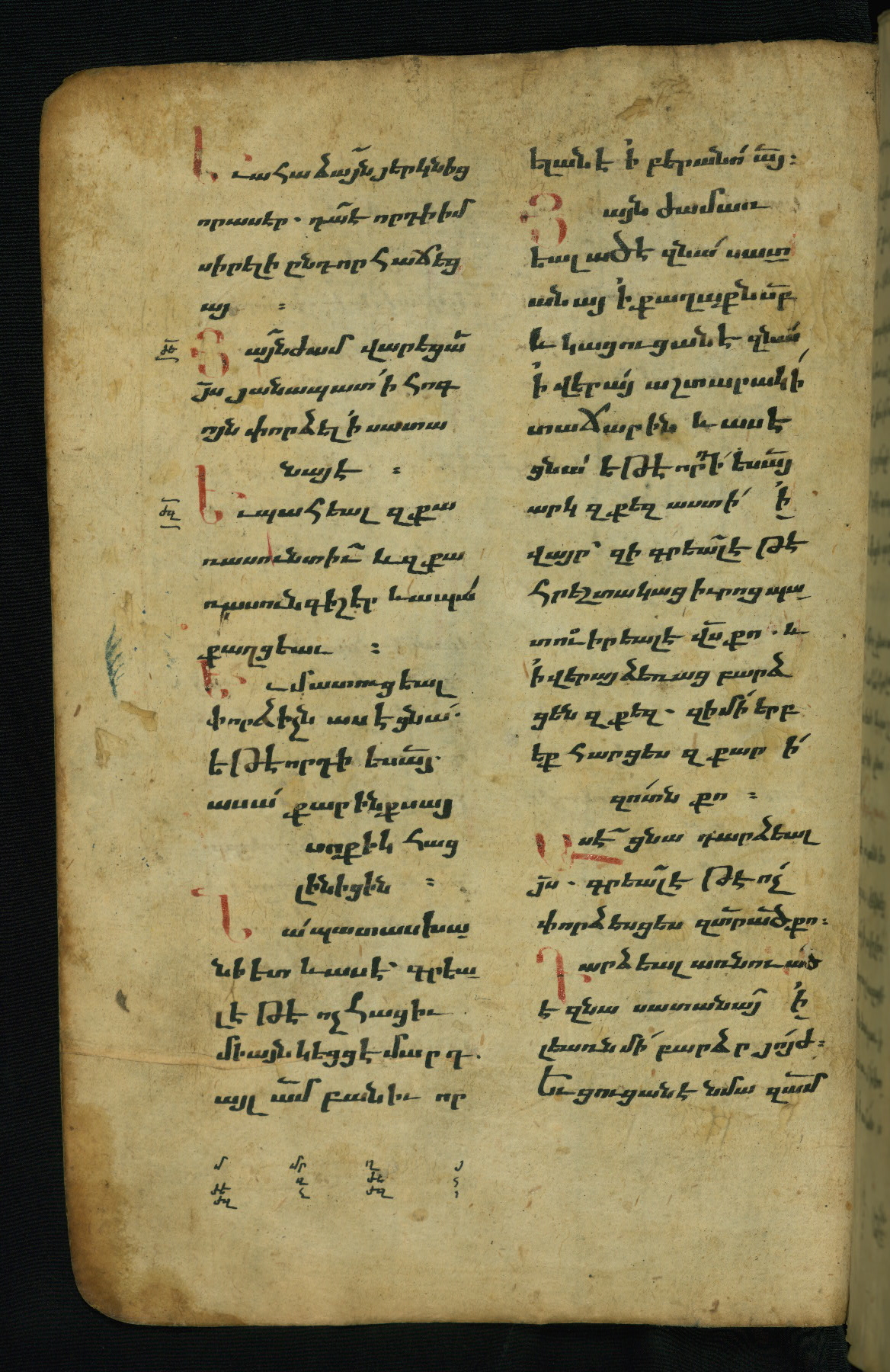This manuscript was executed in 1475 CE by a scribe identified as Aristakes for a priest named Hakob. It contains a series of sixteen images on the life of Christ preceding the text of the Gospels, as well as the traditional Evangelist portraits, and there are marginal illustrations throughout. The style of the miniatures, which employ brilliant colors and emphasize decorative patterns, is characteristic of manuscript production in the region around Lake Van during the fifteenth century. The style of Lake Van has often been described in relation to schools of Islamic arts of the book. Numerous inscriptions (on fols. 258-260) spanning a few centuries attest to the manuscript's long history of use and revered preservation. The codex's later history included a rebinding with silver covers from Kayseri that date to approximately 1700. This jeweled and enameled silver binding bears a composition of the Adoration of the Magi on the front and the Ascension on the back.