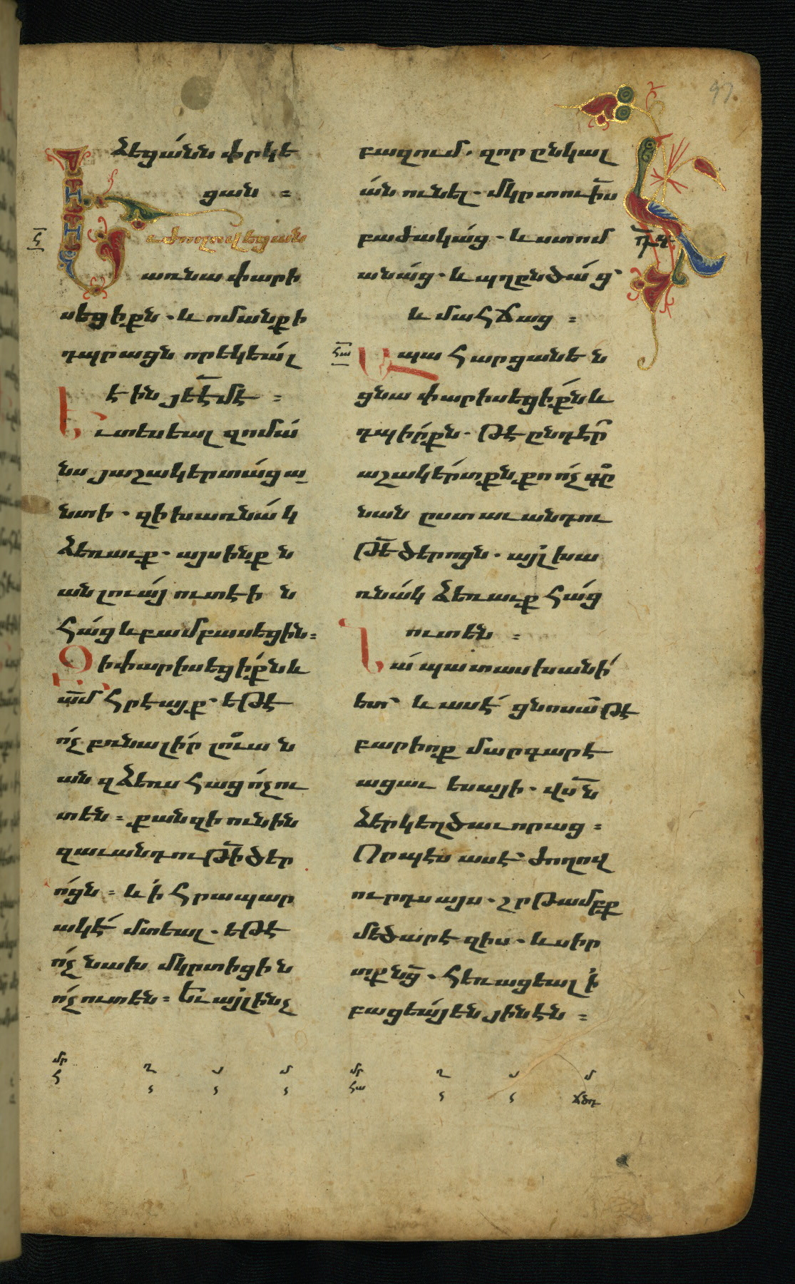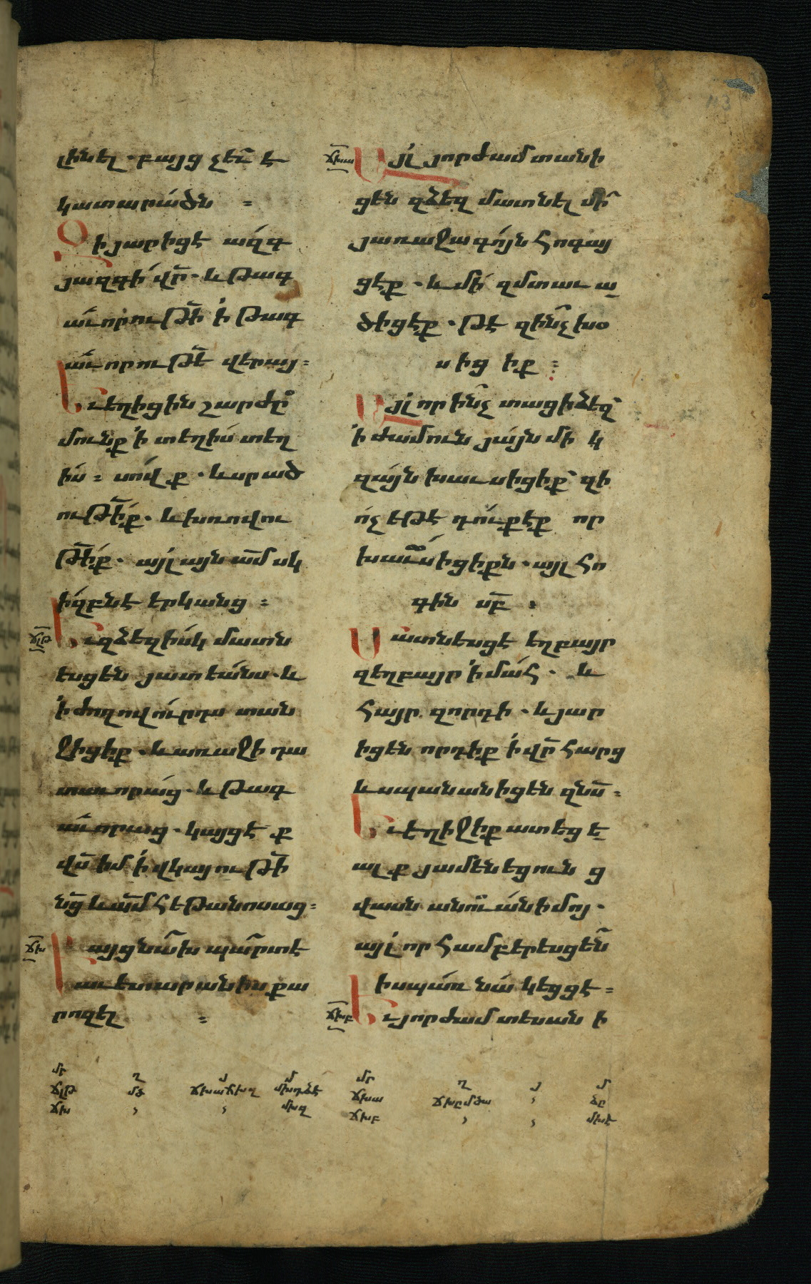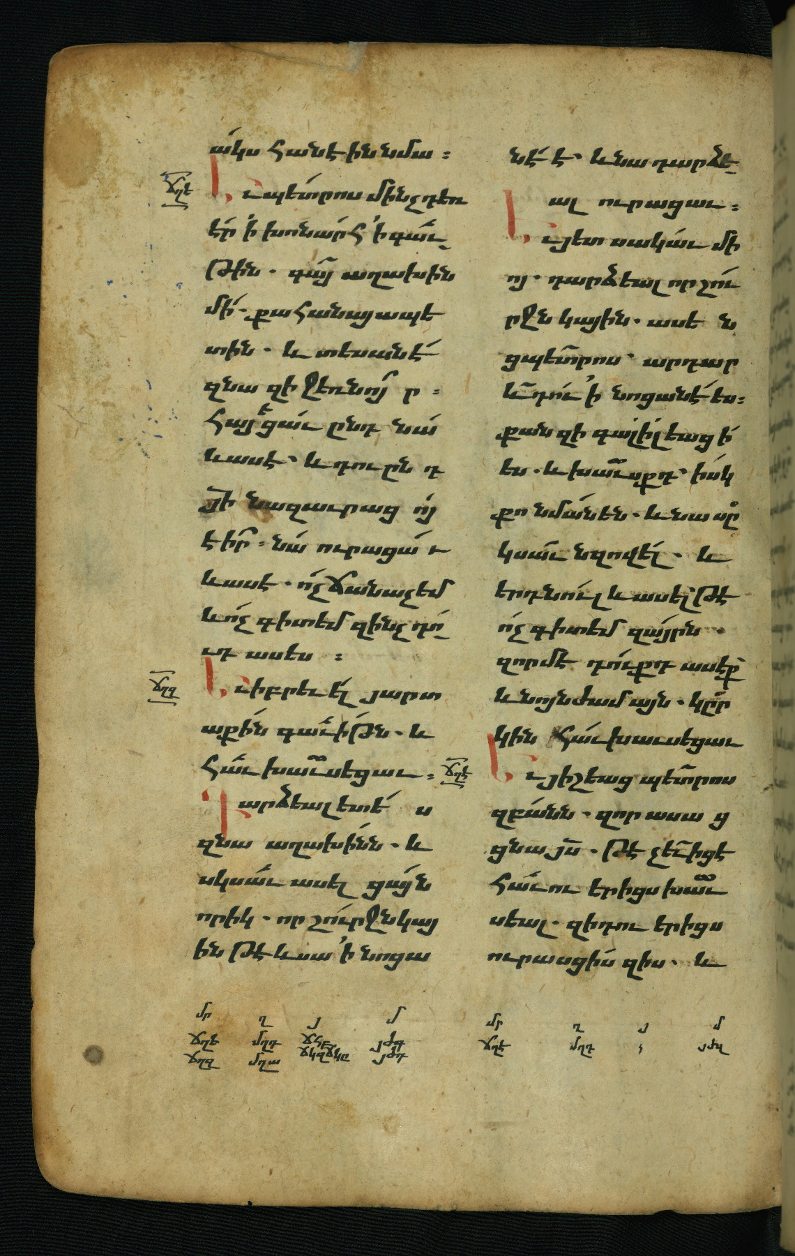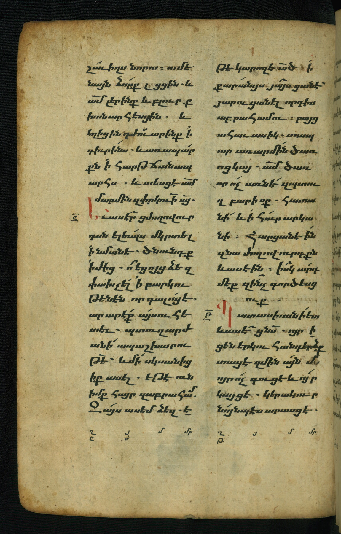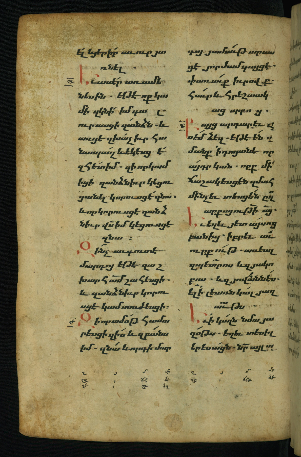 This manuscript was executed in 1475 CE by a scribe identified as Aristakes for a priest named Hakob. It contains a series of sixteen images on the life of Christ preceding the text of the Gospels, as well as the traditional Evangelist portraits, and there are marginal illustrations throughout. The style of the miniatures, which employ brilliant colors and emphasize decorative patterns, is characteristic of manuscript production in the region around Lake Van during the fifteenth century. The style of Lake Van has often been described in relation to schools of Islamic arts of the book. Numerous inscriptions (on fols. 258-260) spanning a few centuries attest to the manuscript's long history of use and revered preservation. The codex's later history included a rebinding with silver covers from Kayseri that date to approximately 1700. This jeweled and enameled silver binding bears a composition of the Adoration of the Magi on the front and the Ascension on the back.