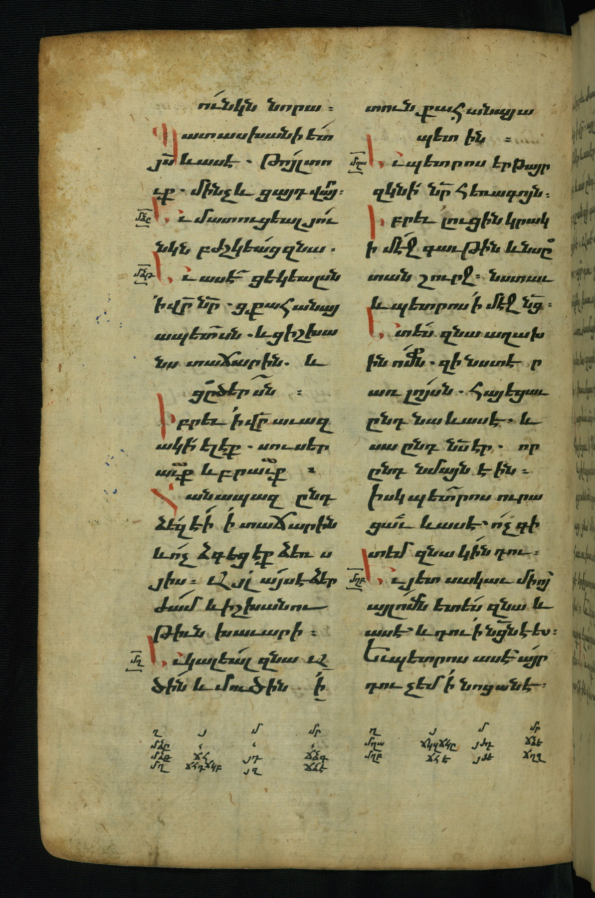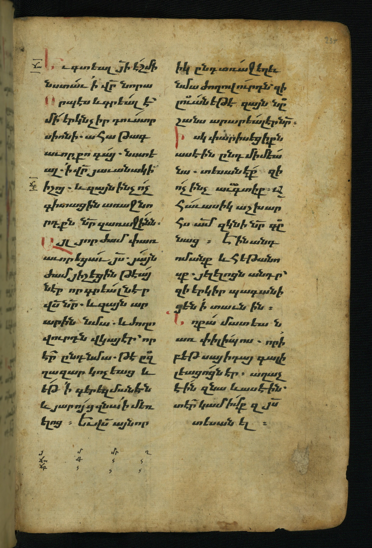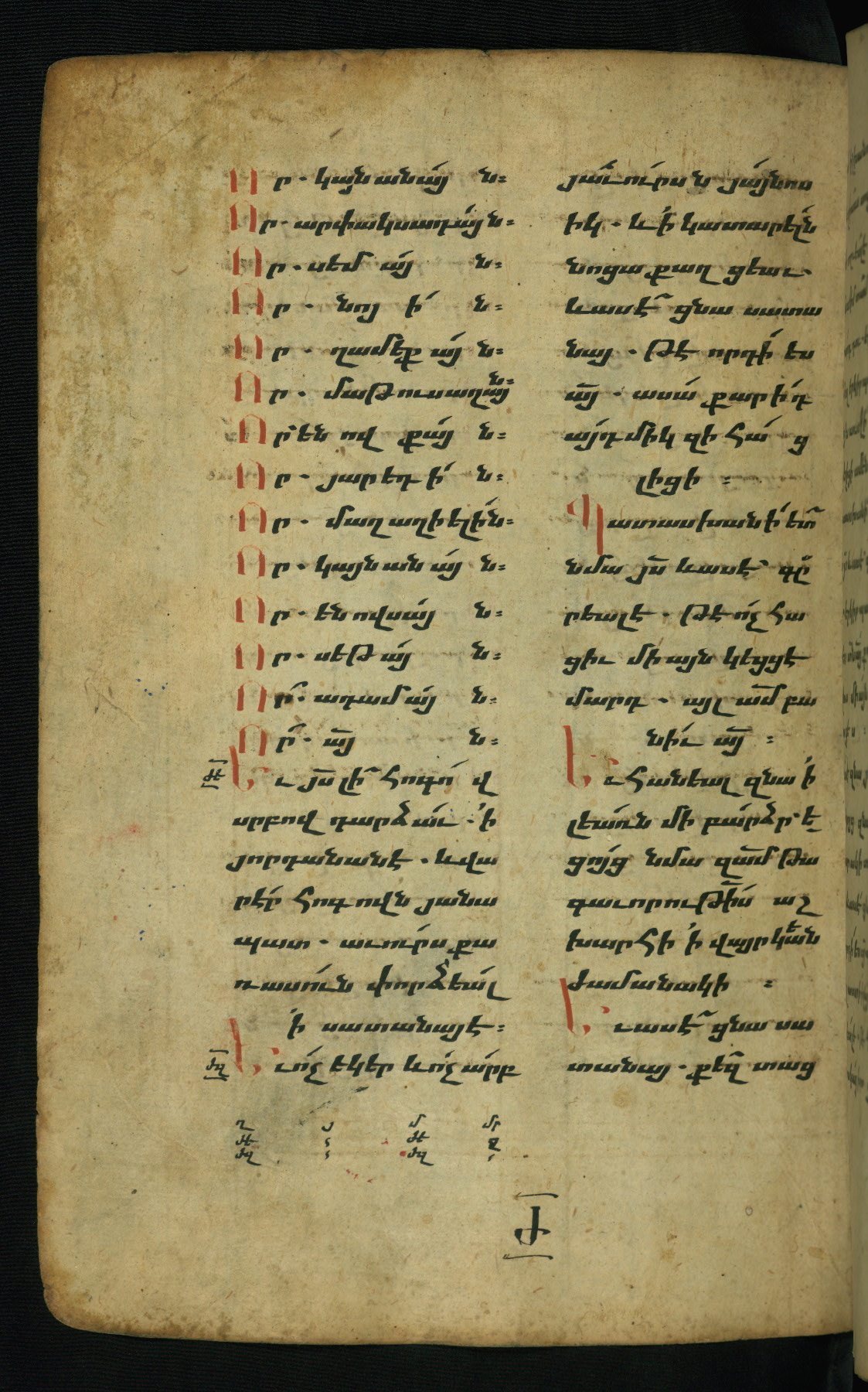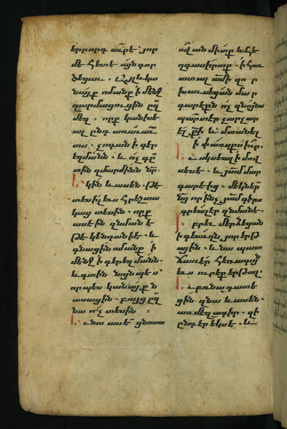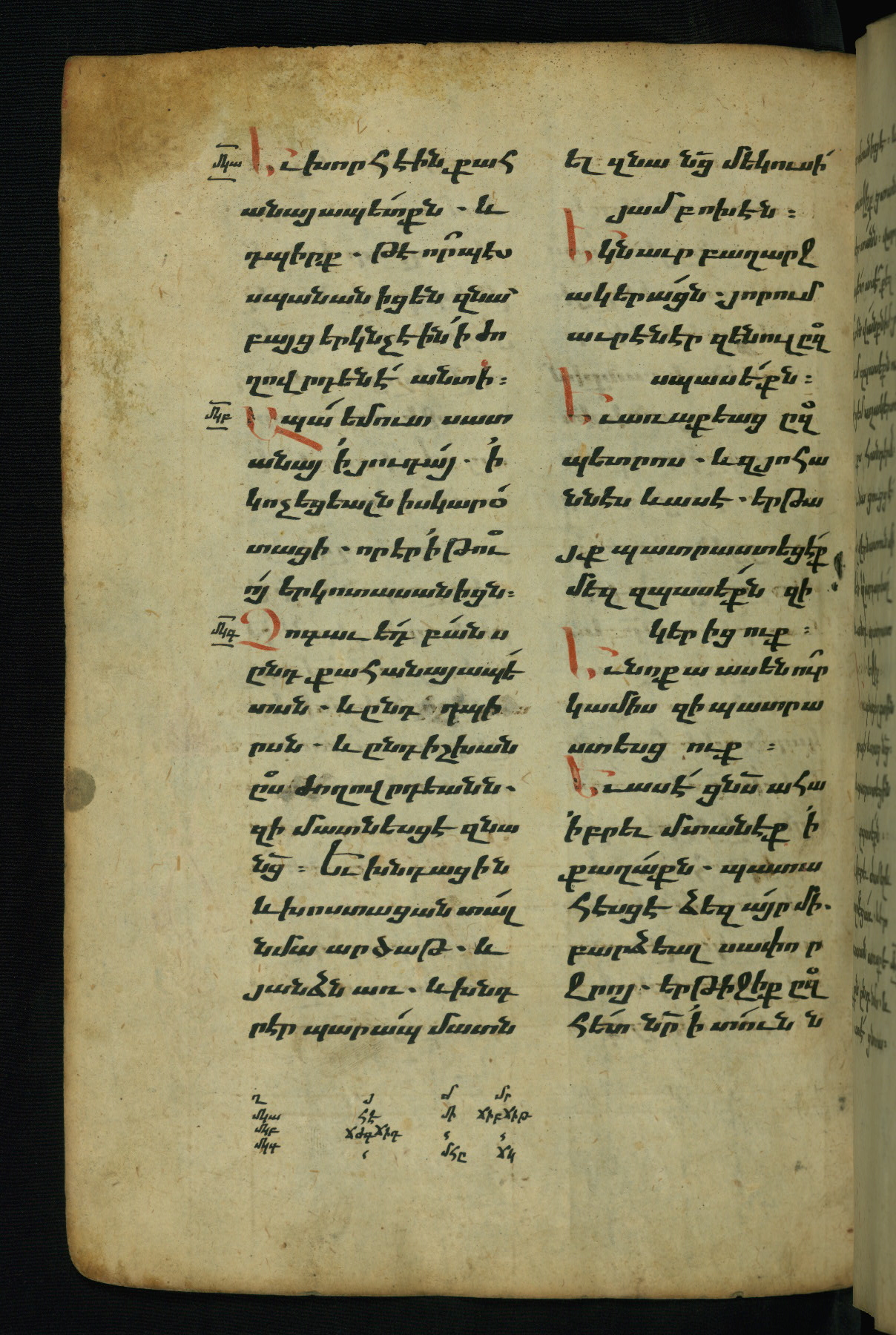 This manuscript was executed in 1475 CE by a scribe identified as Aristakes for a priest named Hakob. It contains a series of sixteen images on the life of Christ preceding the text of the Gospels, as well as the traditional Evangelist portraits, and there are marginal illustrations throughout. The style of the miniatures, which employ brilliant colors and emphasize decorative patterns, is characteristic of manuscript production in the region around Lake Van during the fifteenth century. The style of Lake Van has often been described in relation to schools of Islamic arts of the book. Numerous inscriptions (on fols. 258-260) spanning a few centuries attest to the manuscript's long history of use and revered preservation. The codex's later history included a rebinding with silver covers from Kayseri that date to approximately 1700. This jeweled and enameled silver binding bears a composition of the Adoration of the Magi on the front and the Ascension on the back.