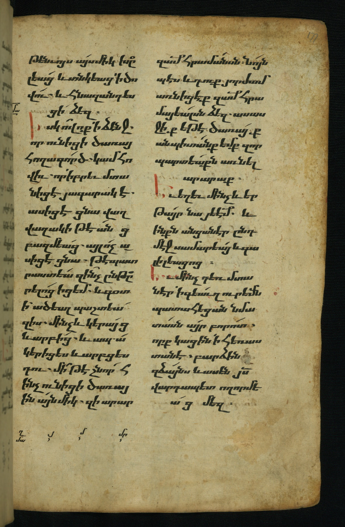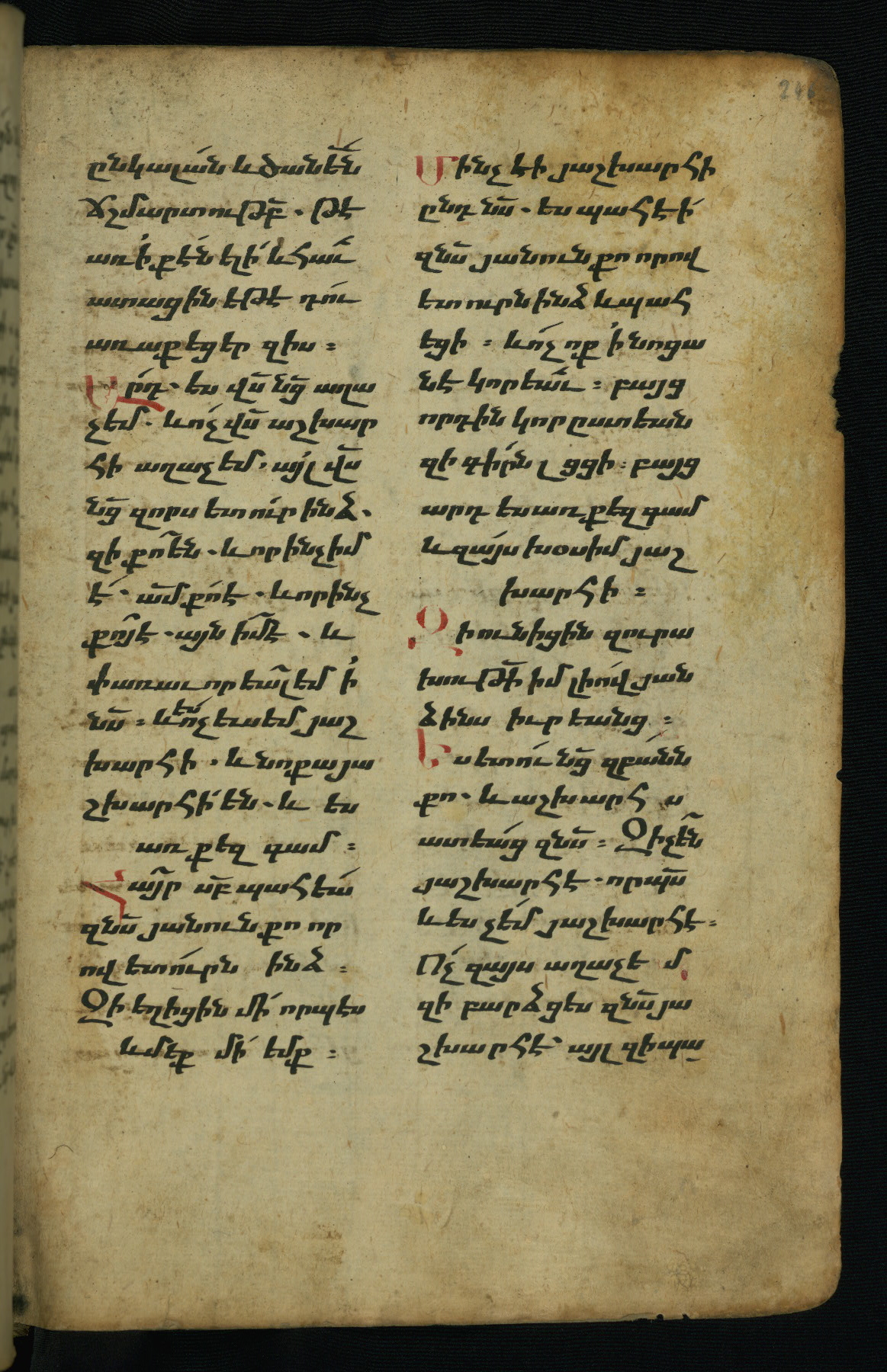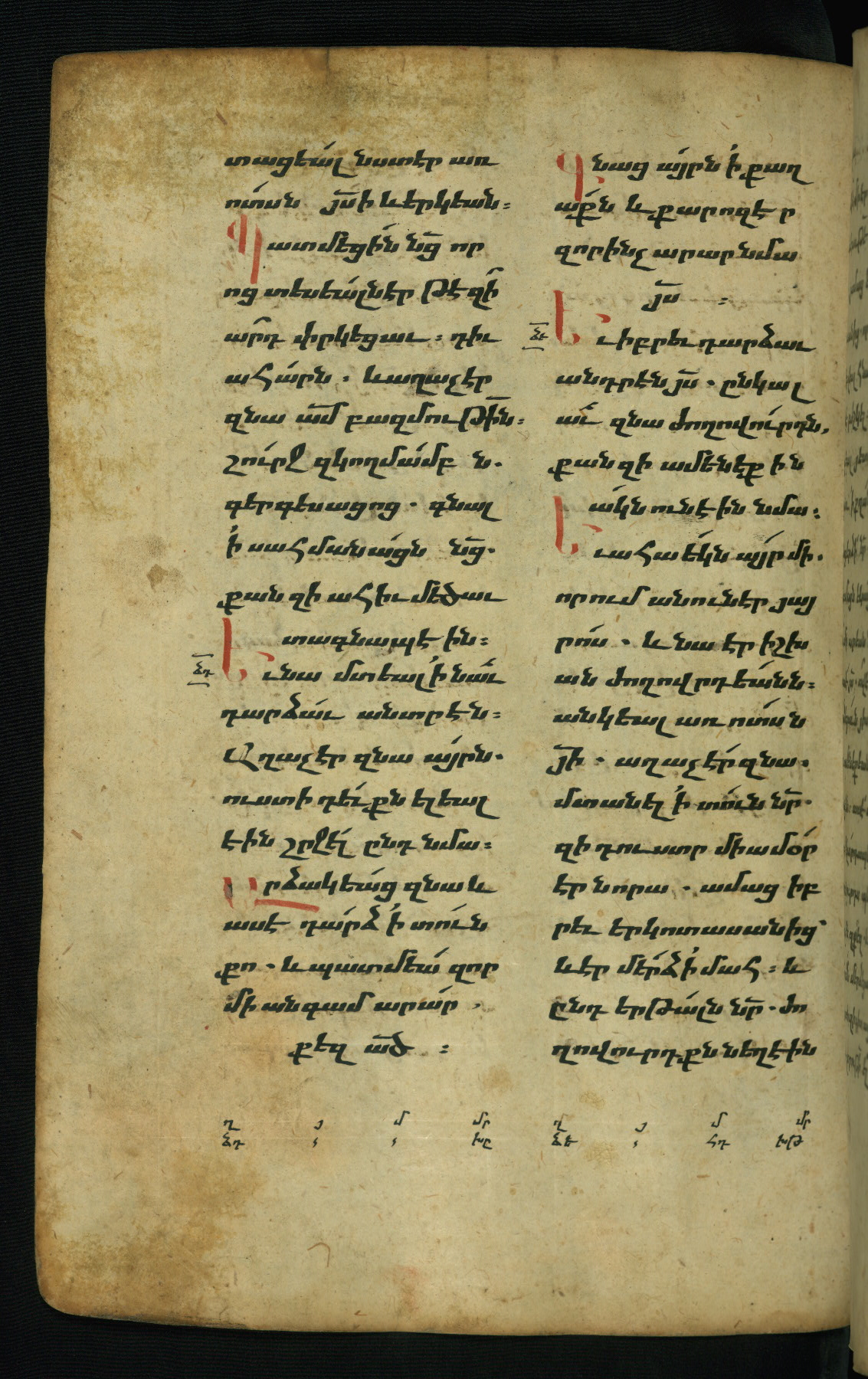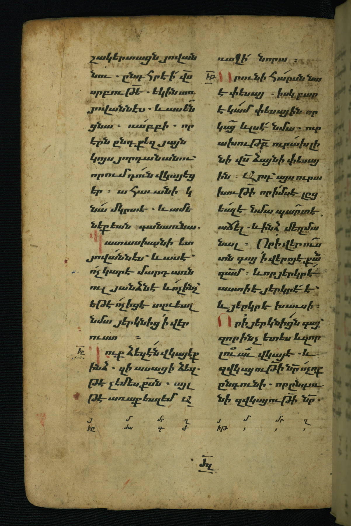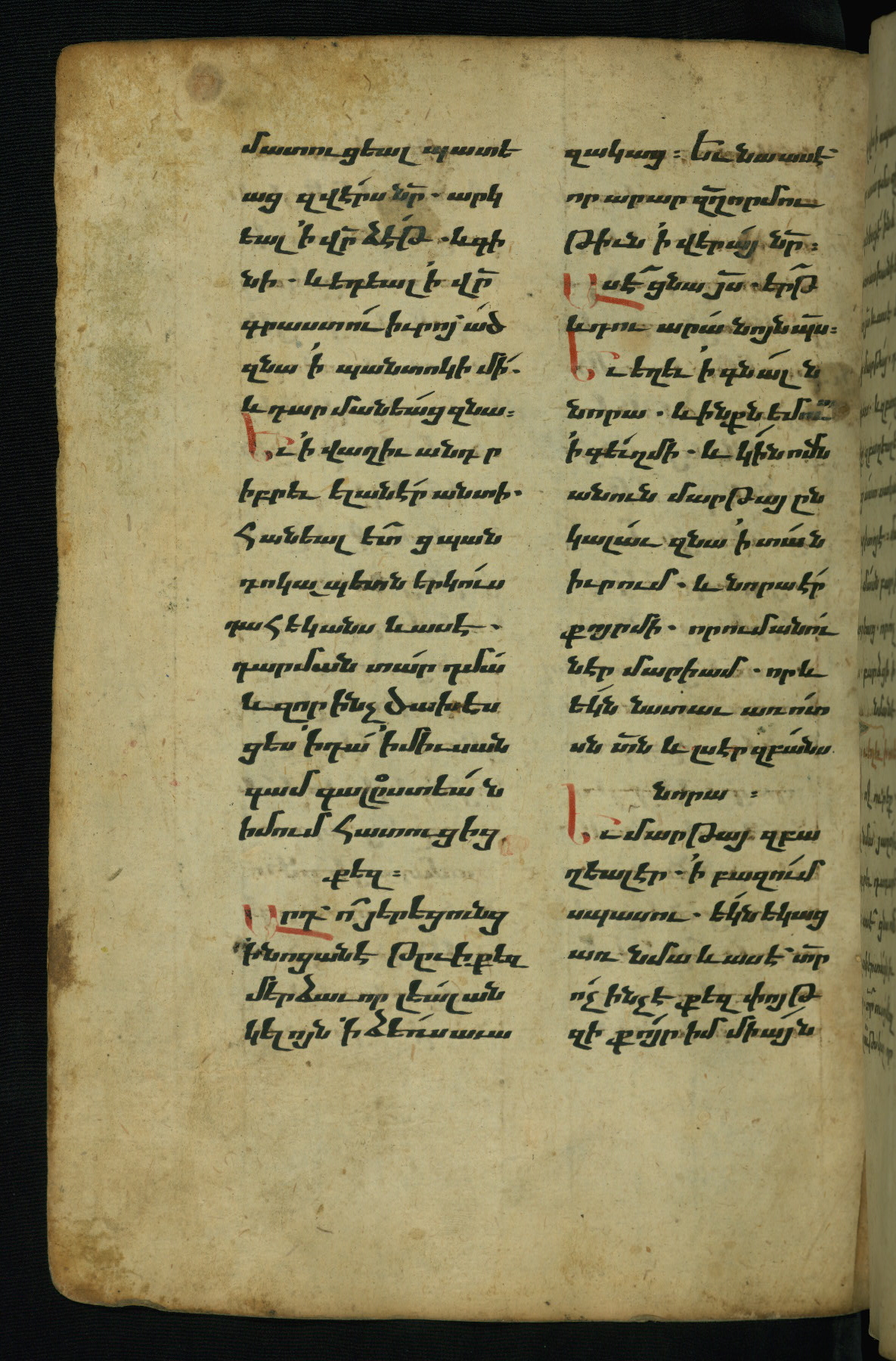 This manuscript was executed in 1475 CE by a scribe identified as Aristakes for a priest named Hakob. It contains a series of sixteen images on the life of Christ preceding the text of the Gospels, as well as the traditional Evangelist portraits, and there are marginal illustrations throughout. The style of the miniatures, which employ brilliant colors and emphasize decorative patterns, is characteristic of manuscript production in the region around Lake Van during the fifteenth century. The style of Lake Van has often been described in relation to schools of Islamic arts of the book. Numerous inscriptions (on fols. 258-260) spanning a few centuries attest to the manuscript's long history of use and revered preservation. The codex's later history included a rebinding with silver covers from Kayseri that date to approximately 1700. This jeweled and enameled silver binding bears a composition of the Adoration of the Magi on the front and the Ascension on the back.