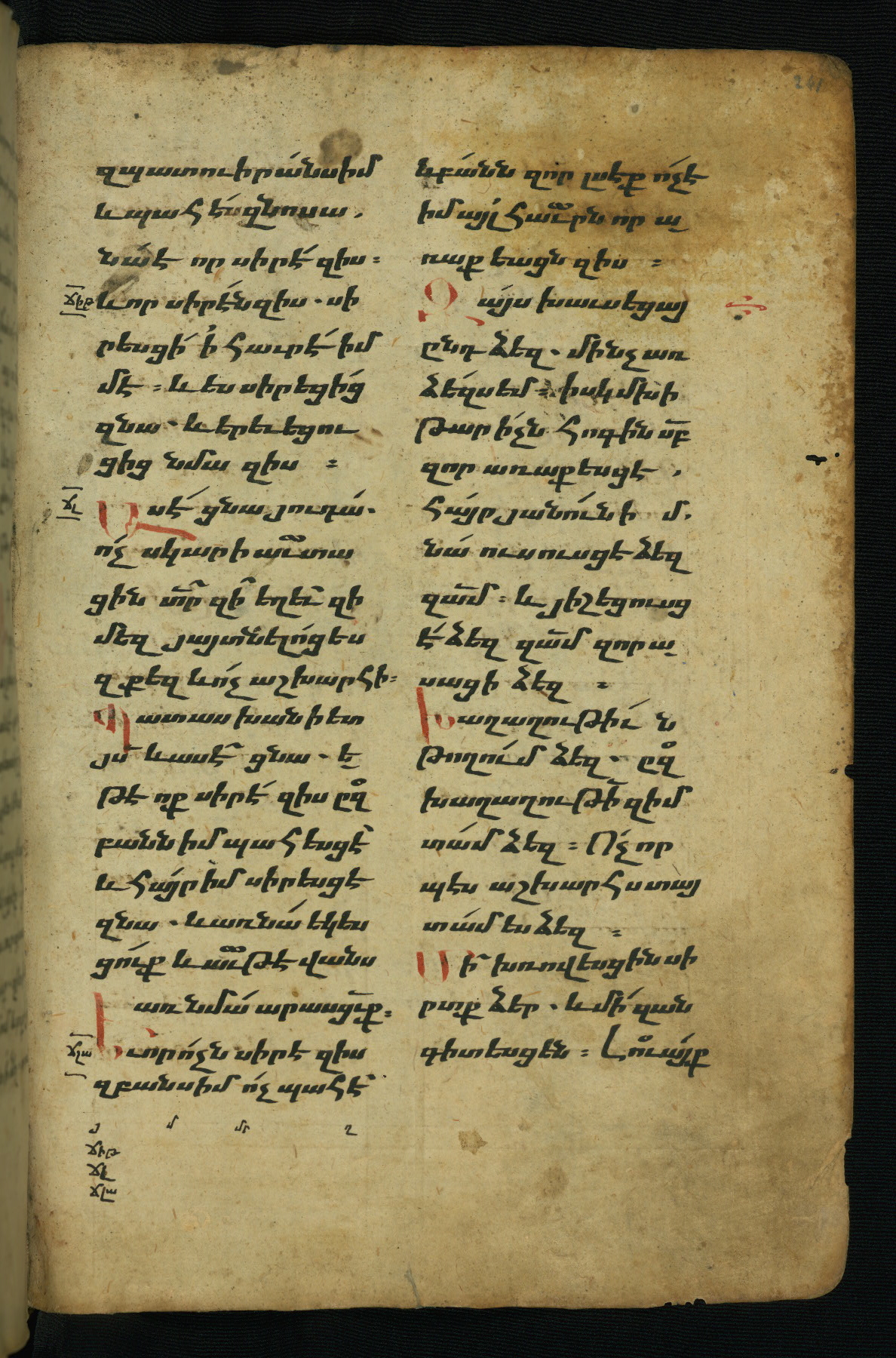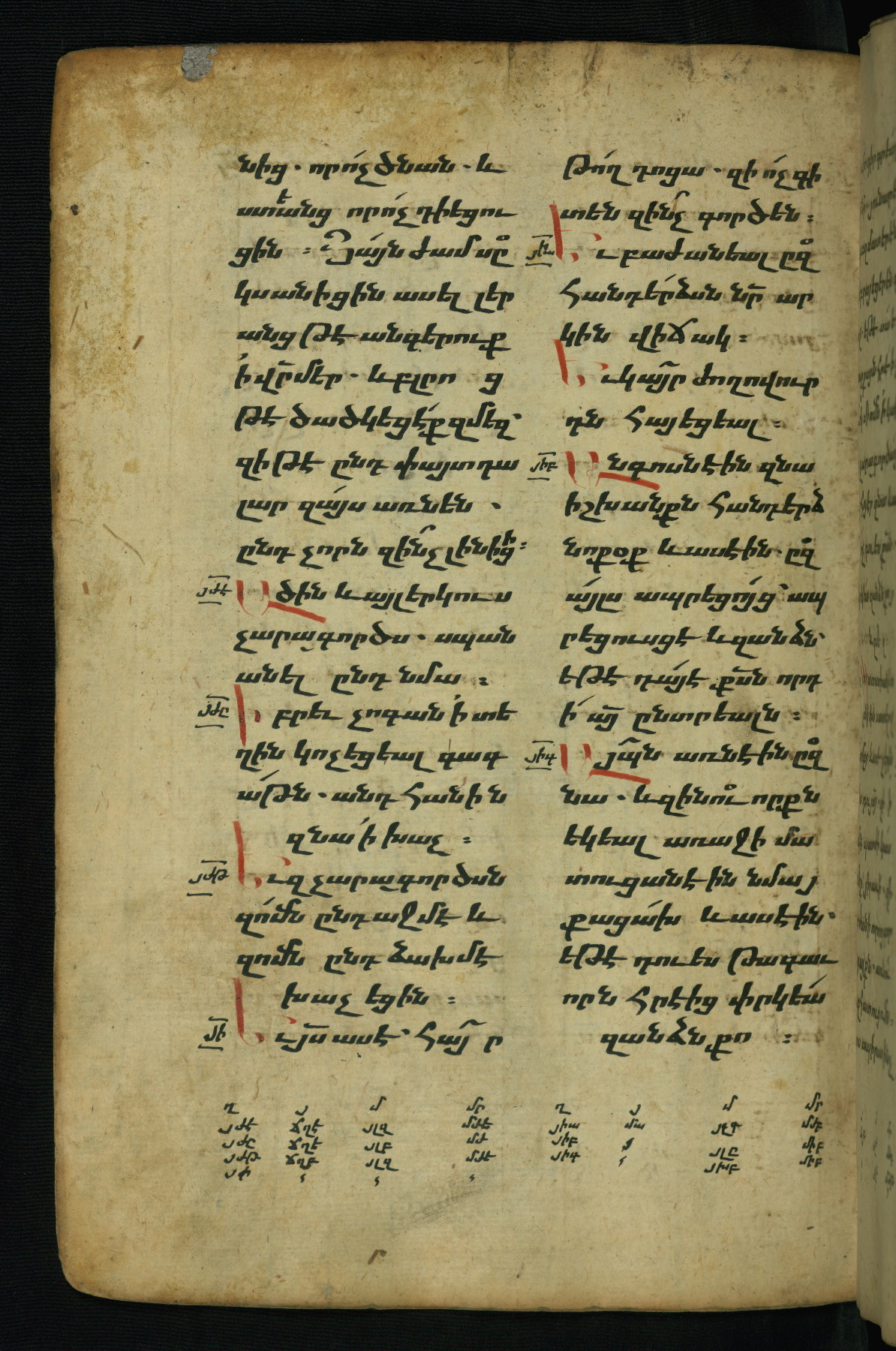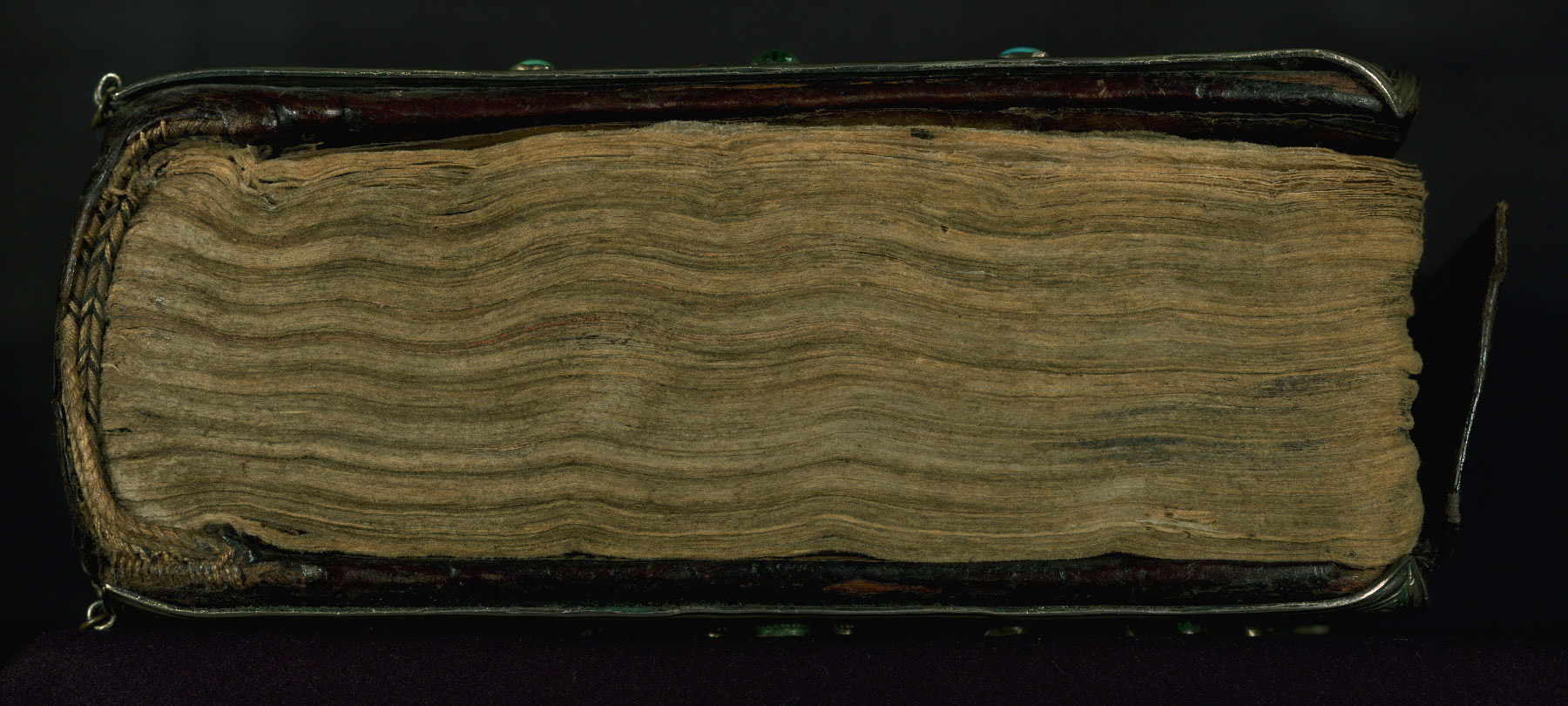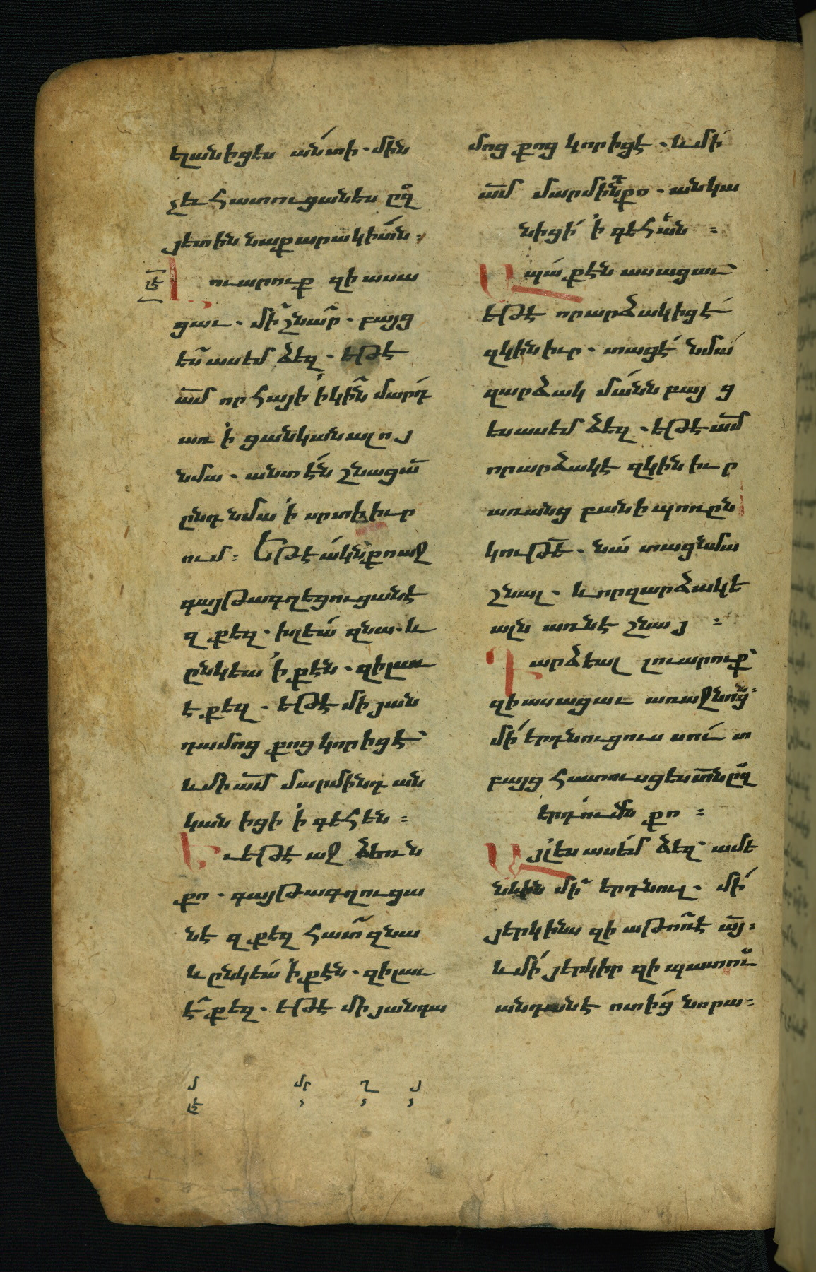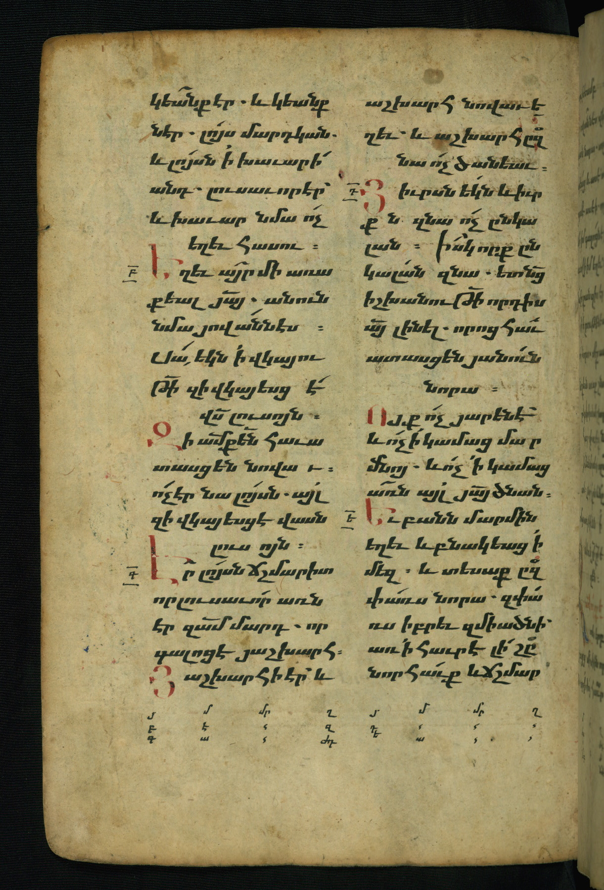 This manuscript was executed in 1475 CE by a scribe identified as Aristakes for a priest named Hakob. It contains a series of sixteen images on the life of Christ preceding the text of the Gospels, as well as the traditional Evangelist portraits, and there are marginal illustrations throughout. The style of the miniatures, which employ brilliant colors and emphasize decorative patterns, is characteristic of manuscript production in the region around Lake Van during the fifteenth century. The style of Lake Van has often been described in relation to schools of Islamic arts of the book. Numerous inscriptions (on fols. 258-260) spanning a few centuries attest to the manuscript's long history of use and revered preservation. The codex's later history included a rebinding with silver covers from Kayseri that date to approximately 1700. This jeweled and enameled silver binding bears a composition of the Adoration of the Magi on the front and the Ascension on the back.