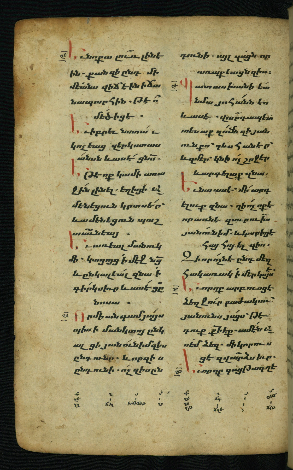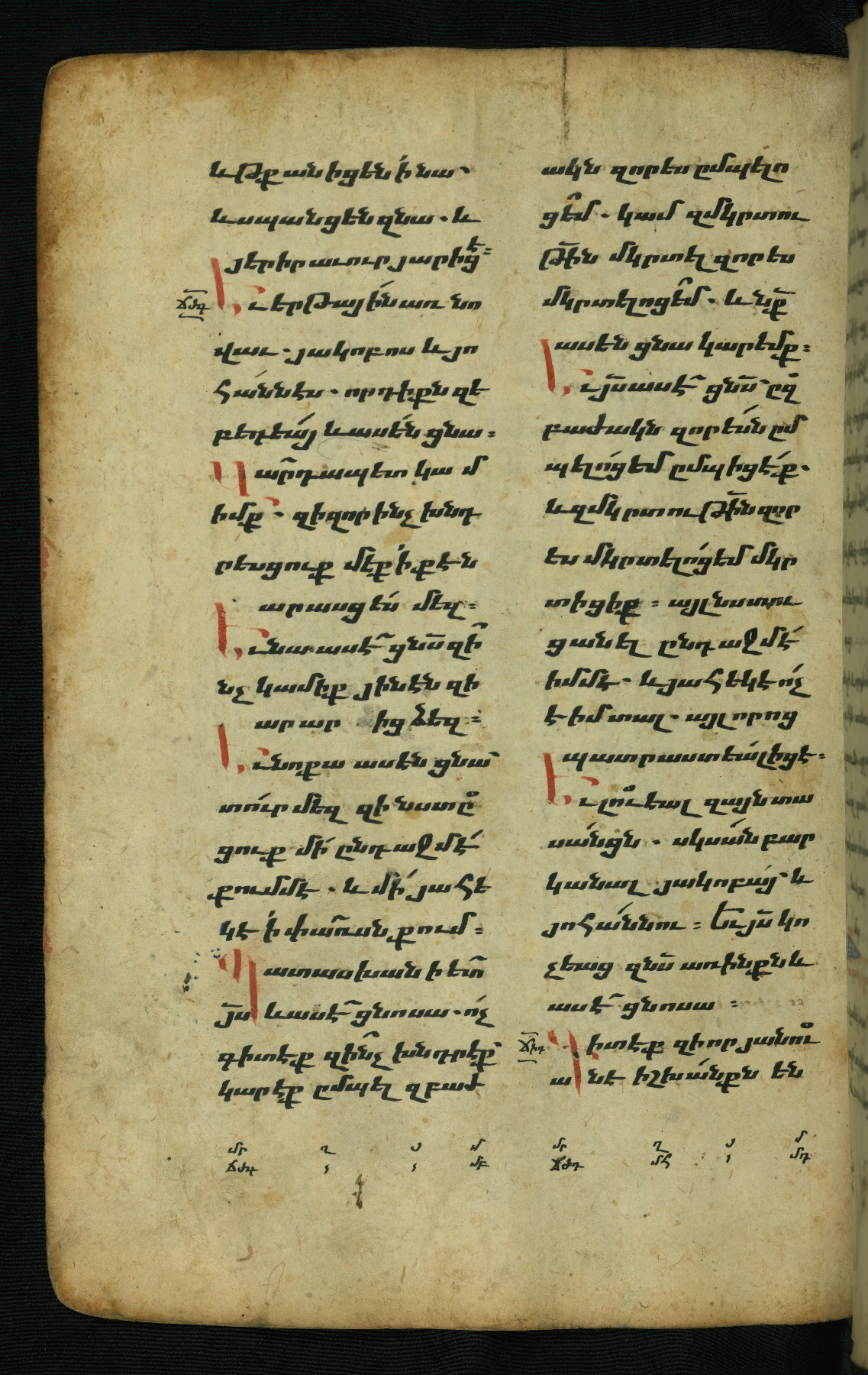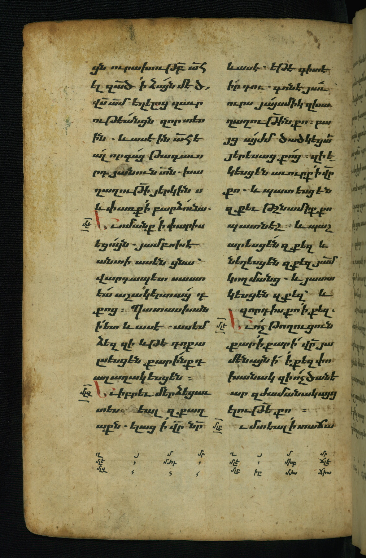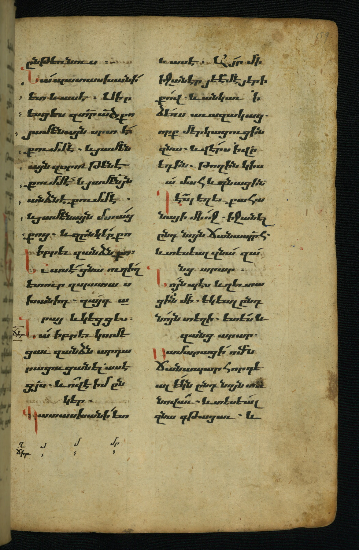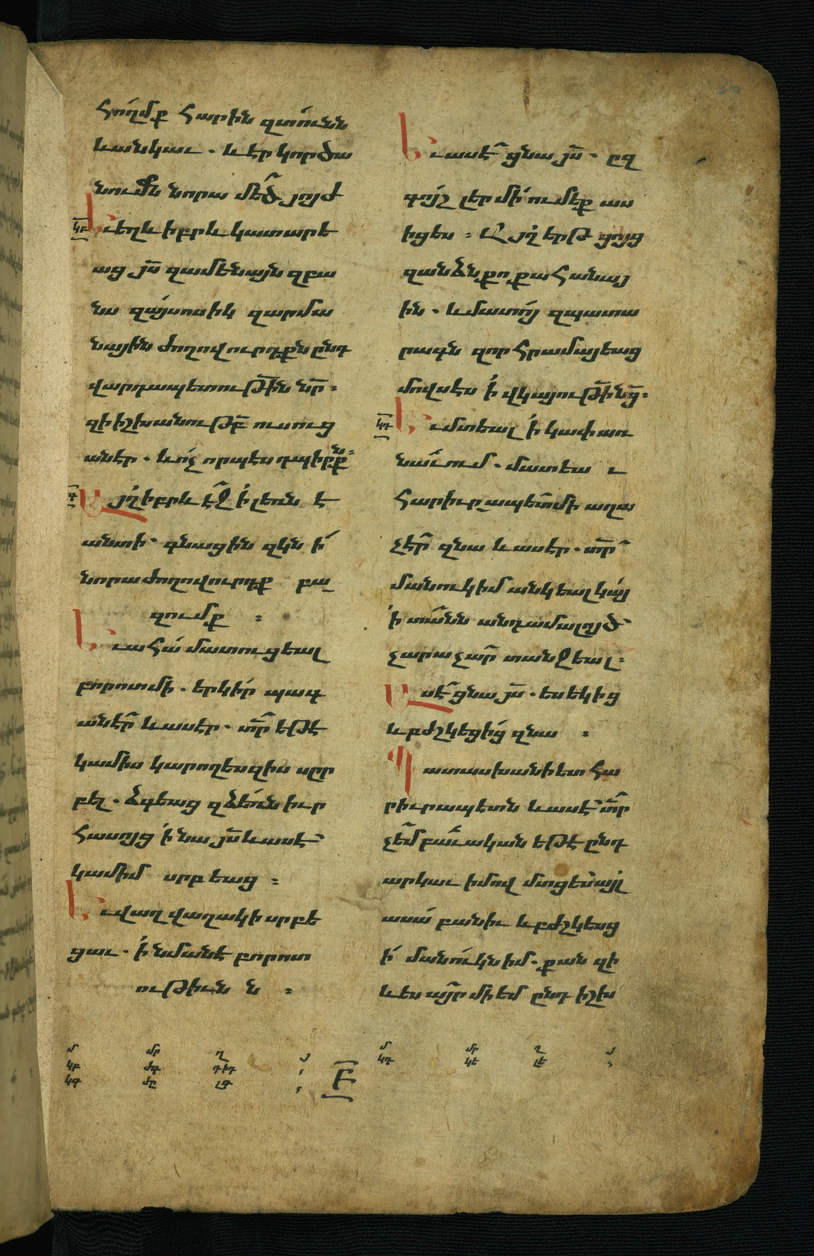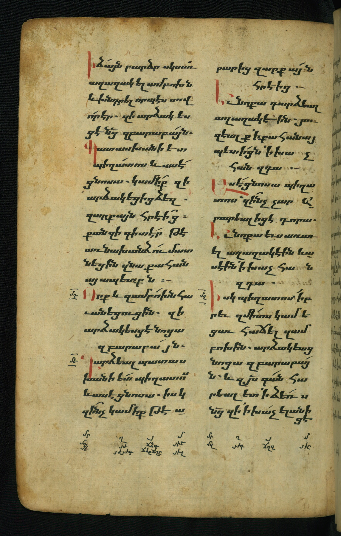 This manuscript was executed in 1475 CE by a scribe identified as Aristakes for a priest named Hakob. It contains a series of sixteen images on the life of Christ preceding the text of the Gospels, as well as the traditional Evangelist portraits, and there are marginal illustrations throughout. The style of the miniatures, which employ brilliant colors and emphasize decorative patterns, is characteristic of manuscript production in the region around Lake Van during the fifteenth century. The style of Lake Van has often been described in relation to schools of Islamic arts of the book. Numerous inscriptions (on fols. 258-260) spanning a few centuries attest to the manuscript's long history of use and revered preservation. The codex's later history included a rebinding with silver covers from Kayseri that date to approximately 1700. This jeweled and enameled silver binding bears a composition of the Adoration of the Magi on the front and the Ascension on the back.