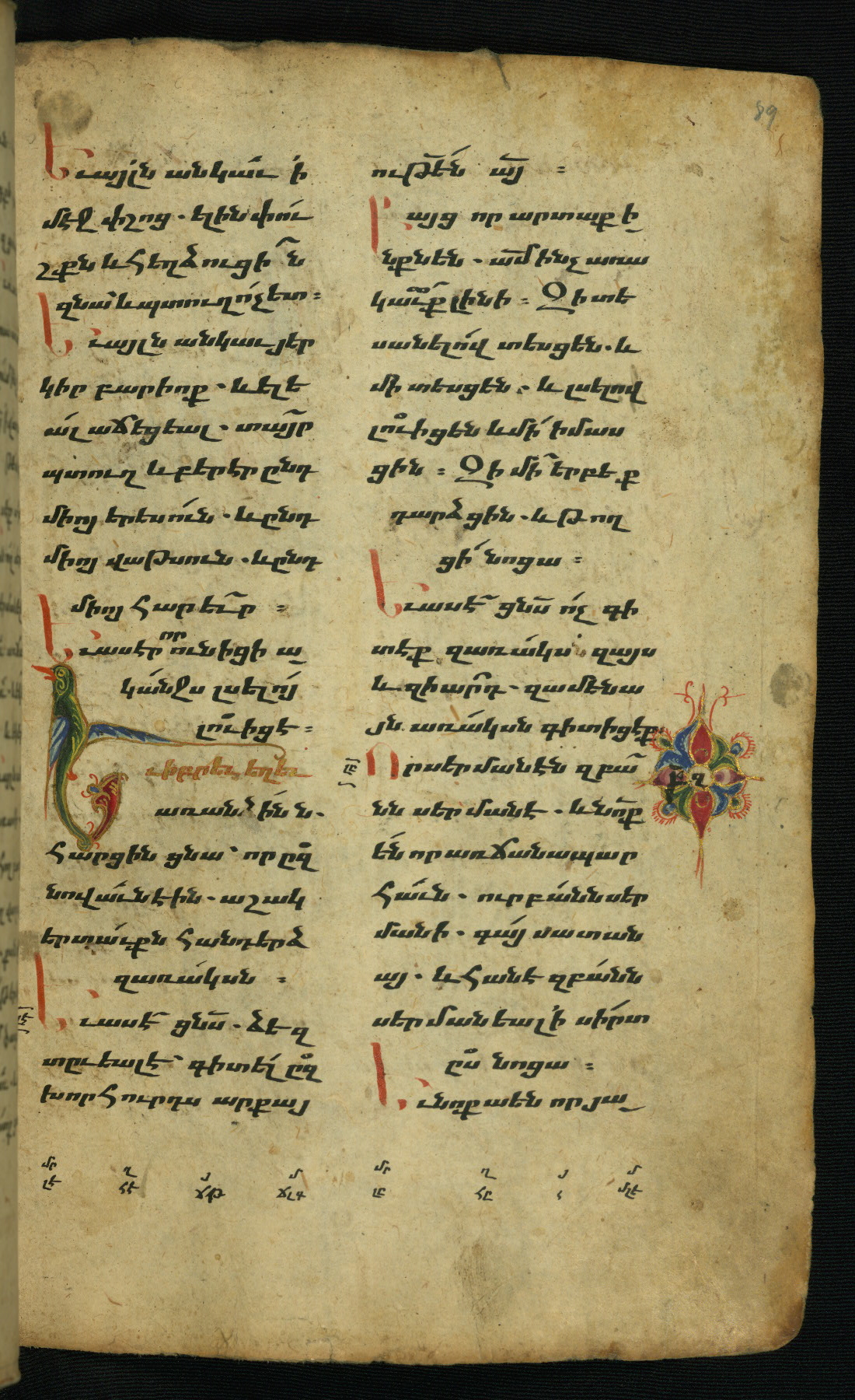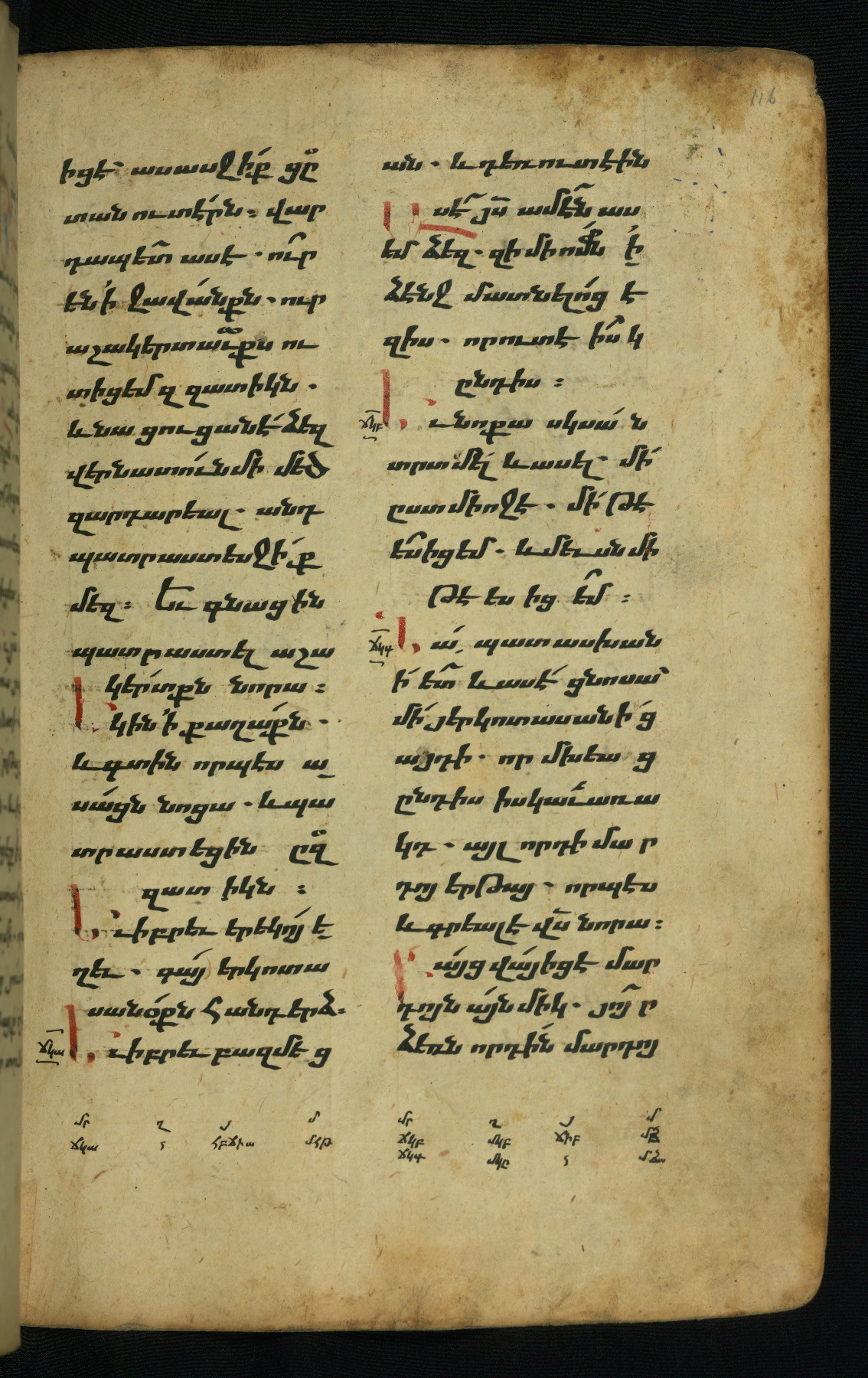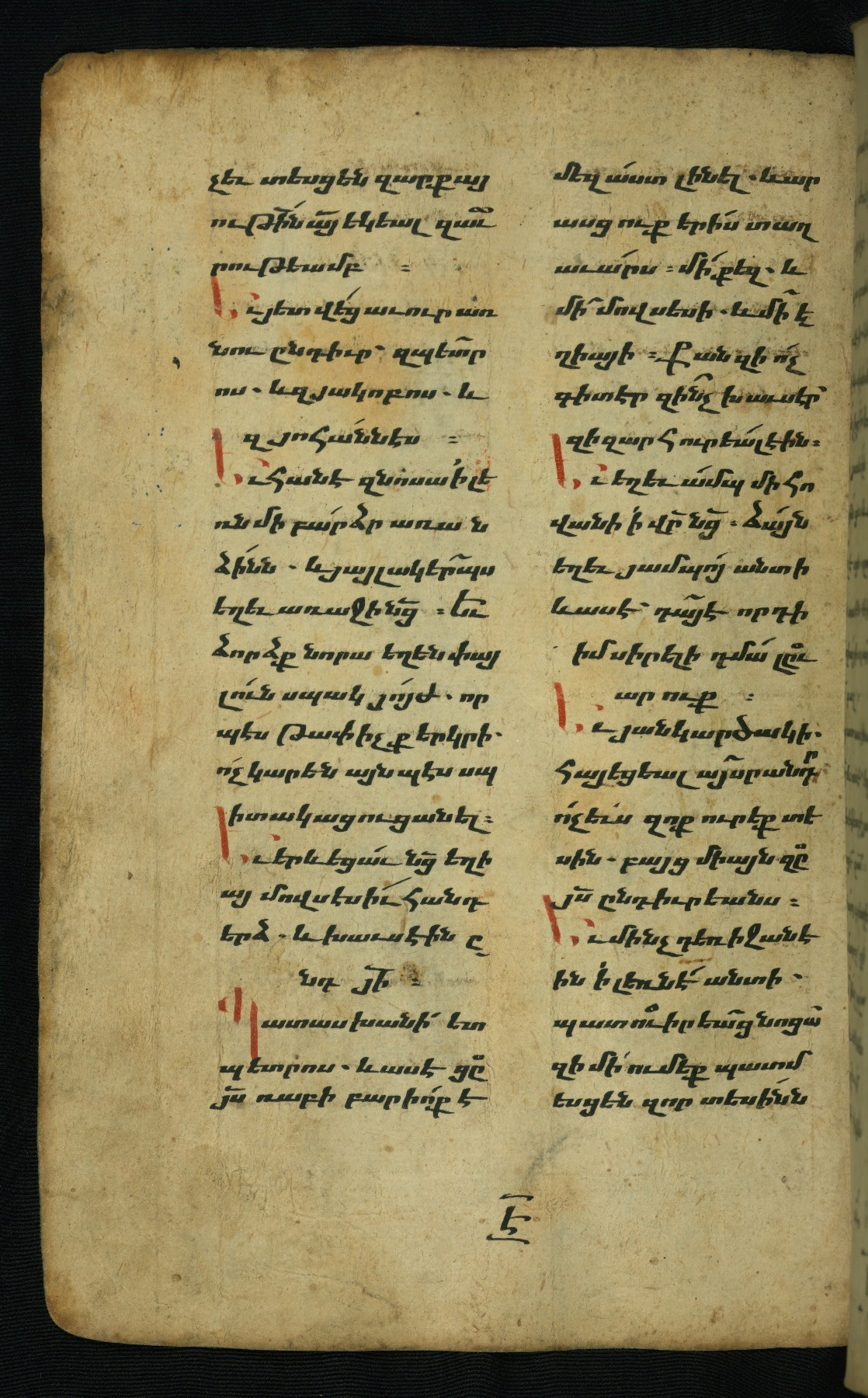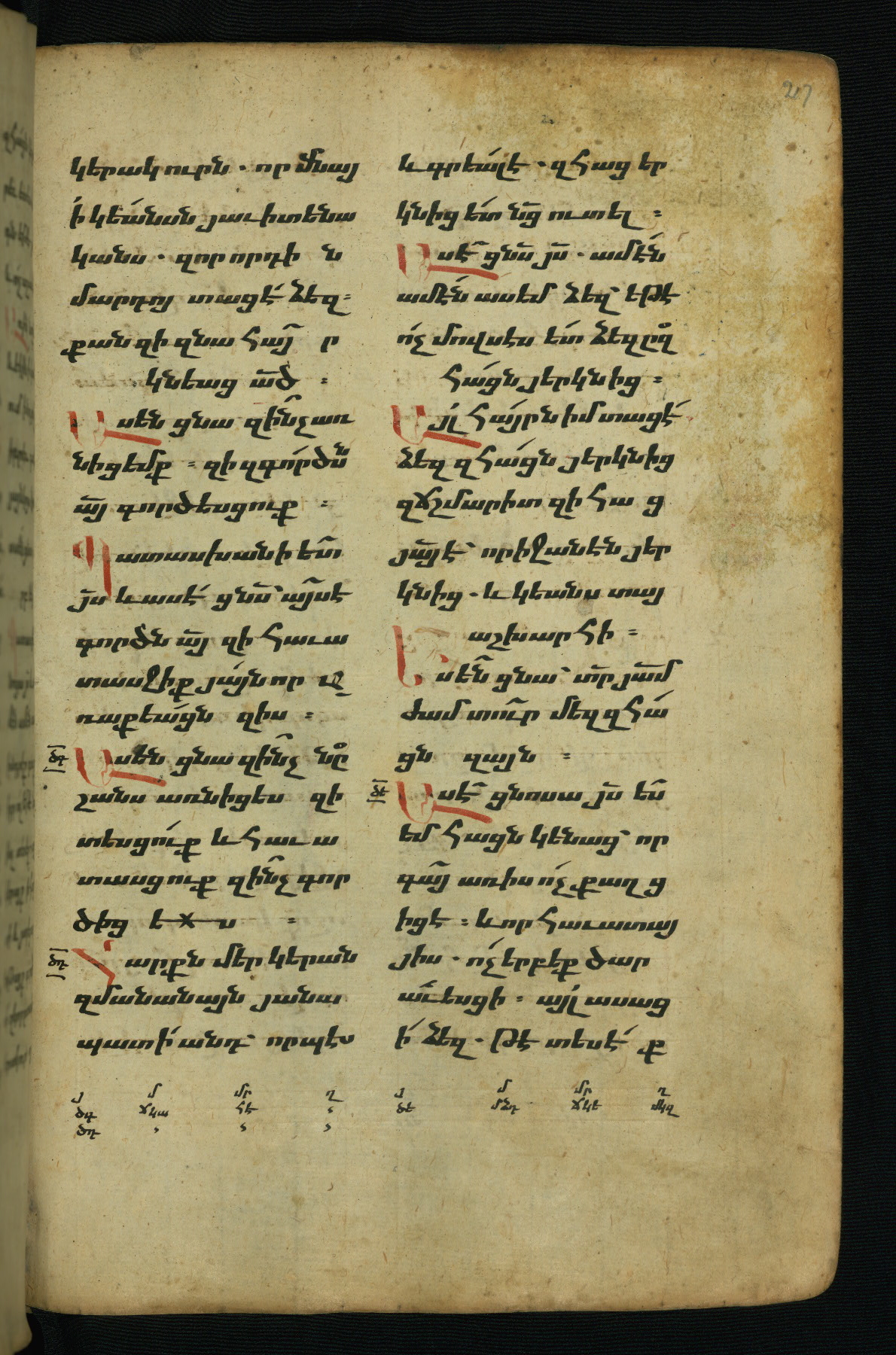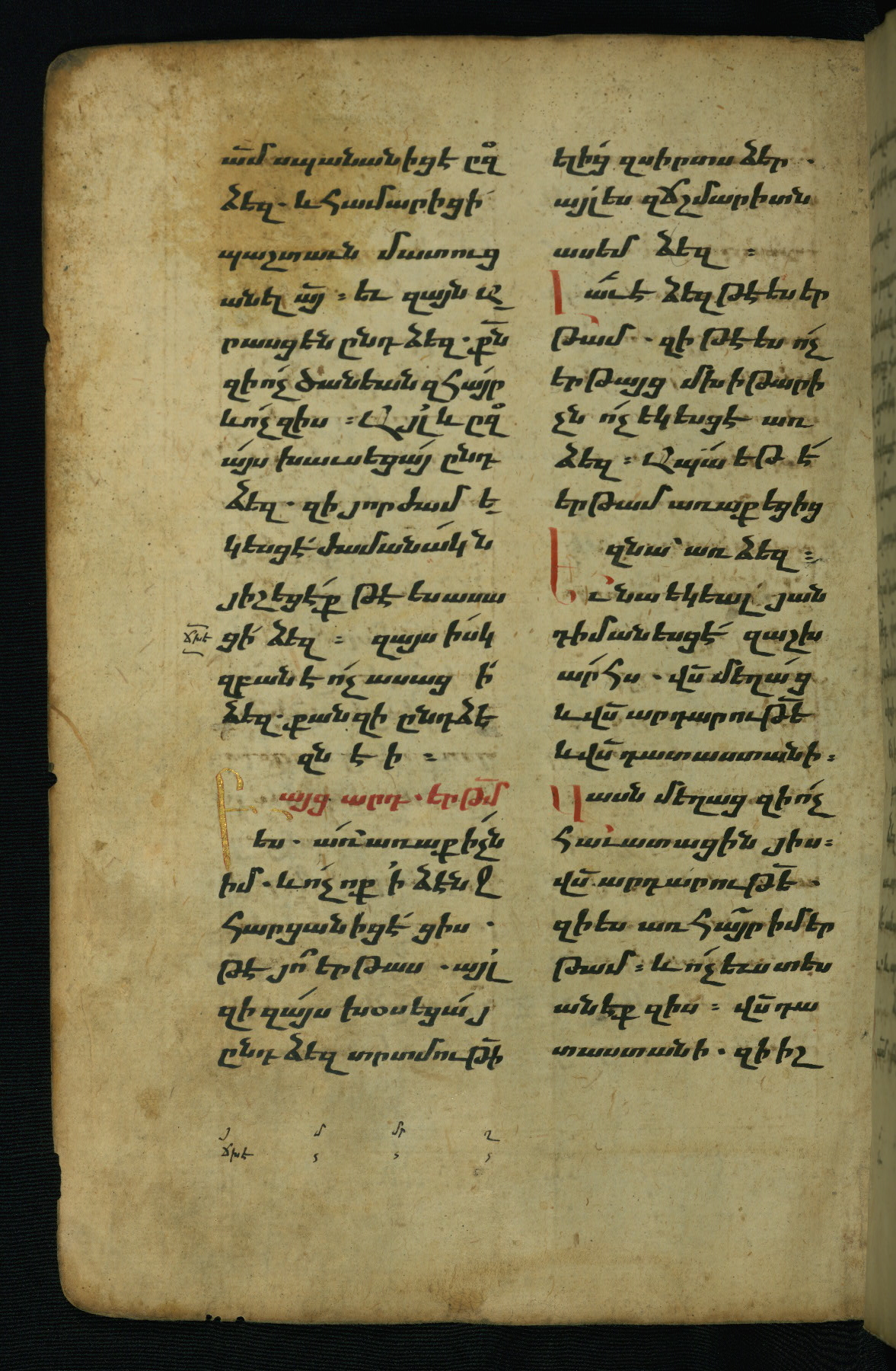 This manuscript was executed in 1475 CE by a scribe identified as Aristakes for a priest named Hakob. It contains a series of sixteen images on the life of Christ preceding the text of the Gospels, as well as the traditional Evangelist portraits, and there are marginal illustrations throughout. The style of the miniatures, which employ brilliant colors and emphasize decorative patterns, is characteristic of manuscript production in the region around Lake Van during the fifteenth century. The style of Lake Van has often been described in relation to schools of Islamic arts of the book. Numerous inscriptions (on fols. 258-260) spanning a few centuries attest to the manuscript's long history of use and revered preservation. The codex's later history included a rebinding with silver covers from Kayseri that date to approximately 1700. This jeweled and enameled silver binding bears a composition of the Adoration of the Magi on the front and the Ascension on the back.