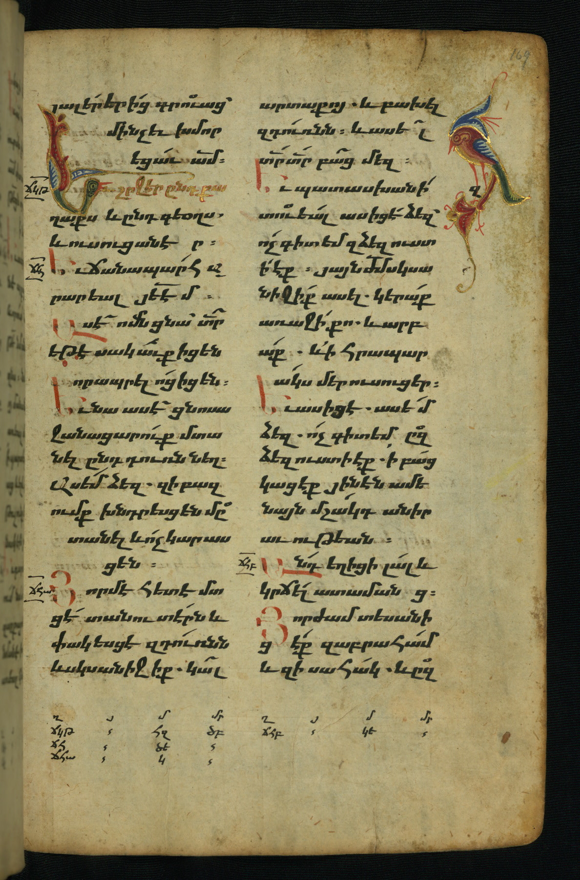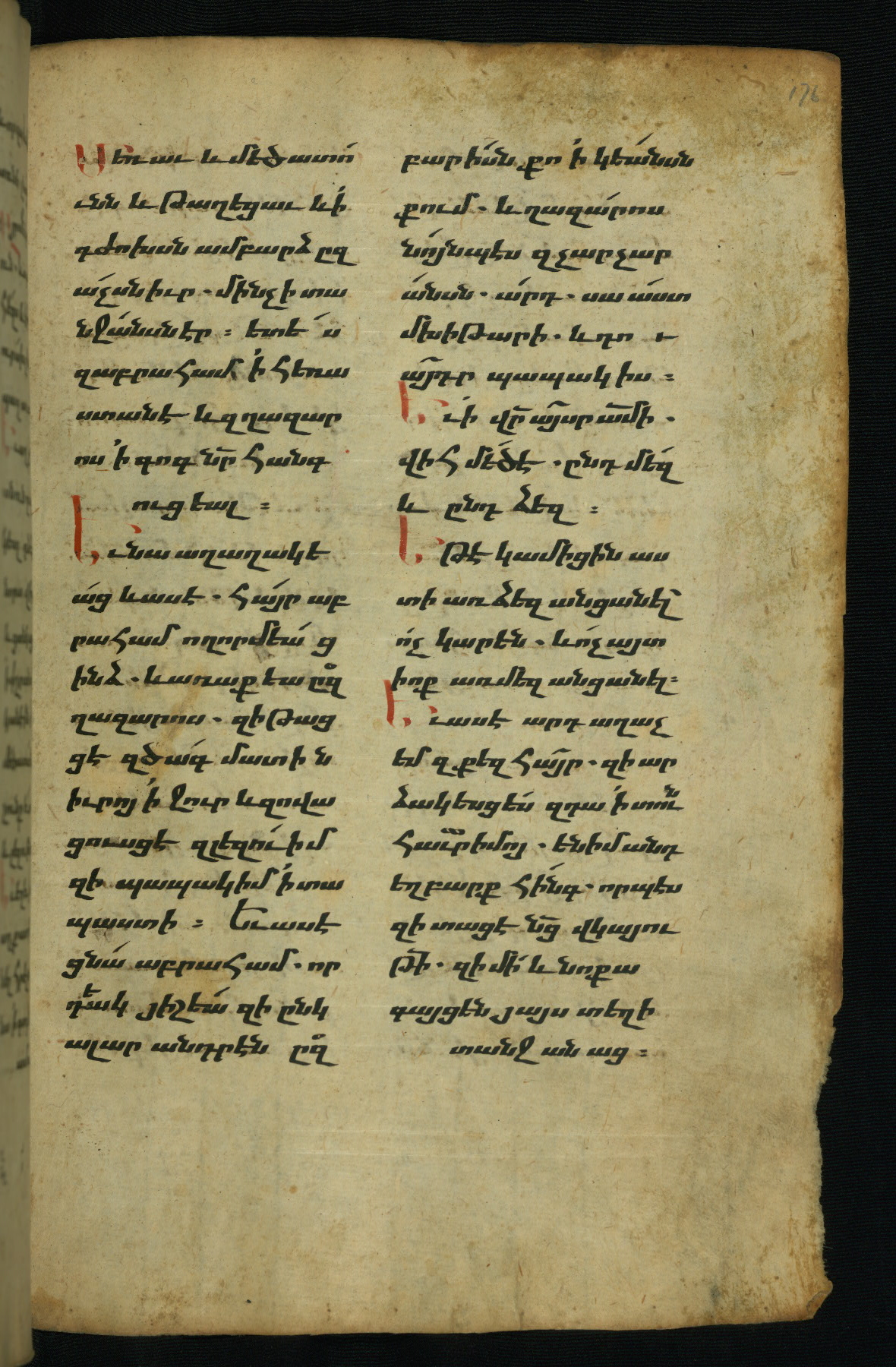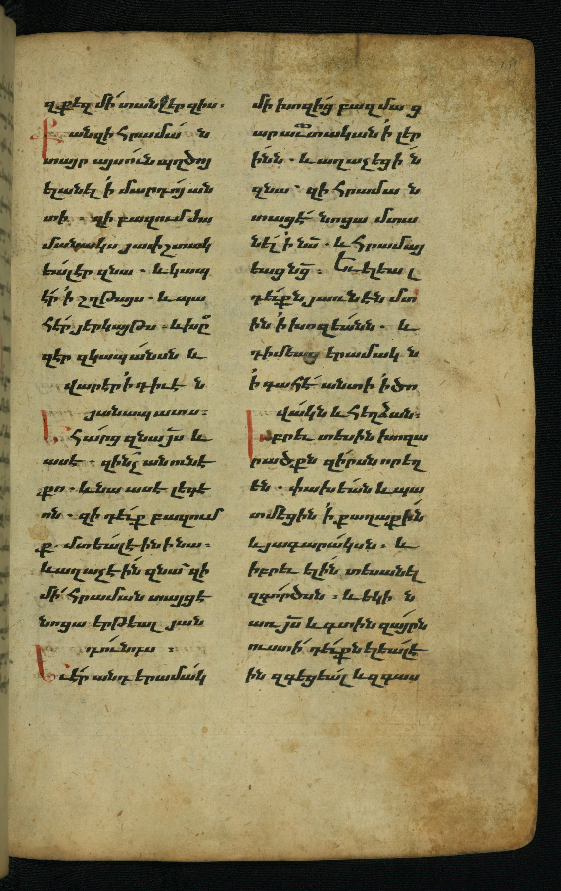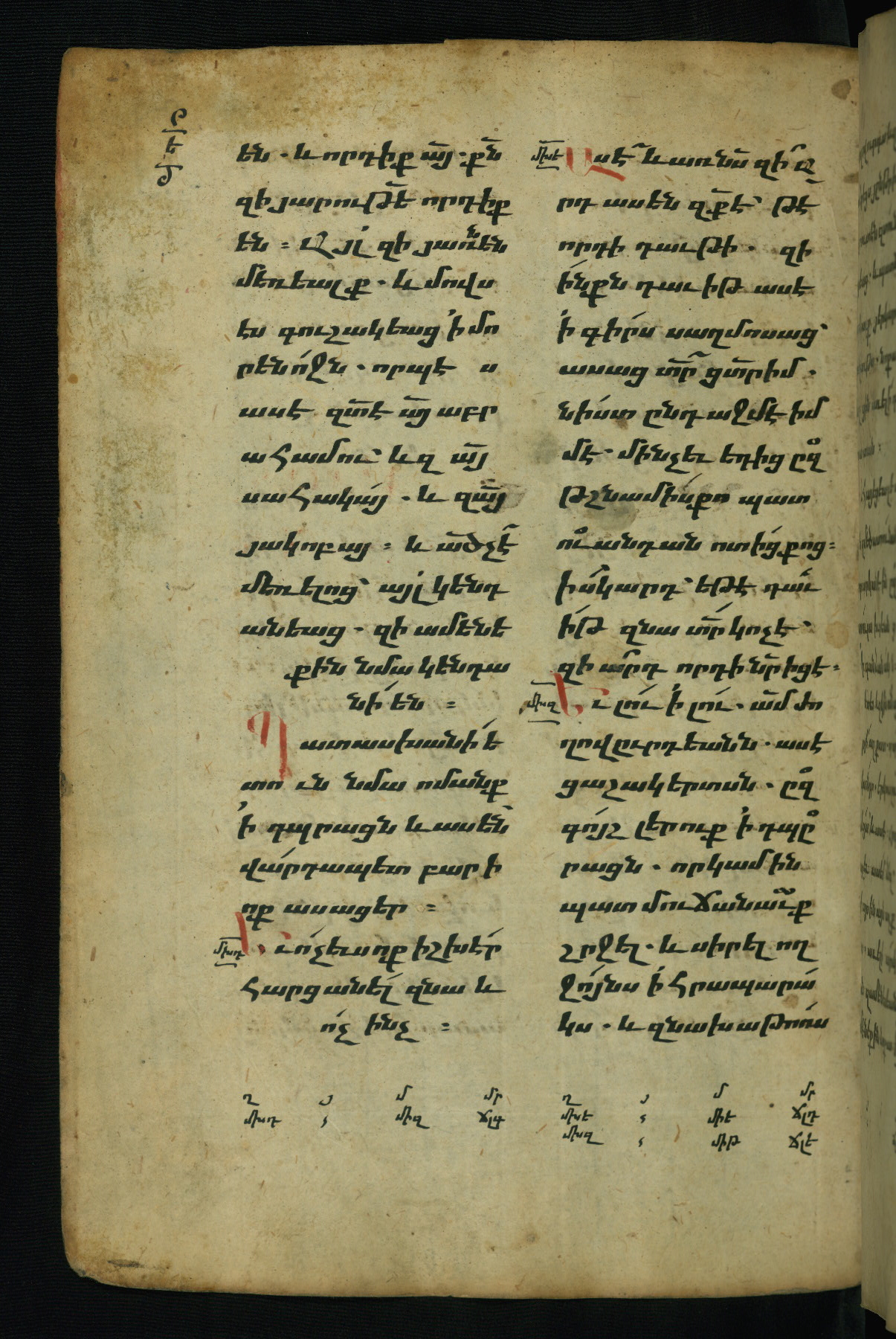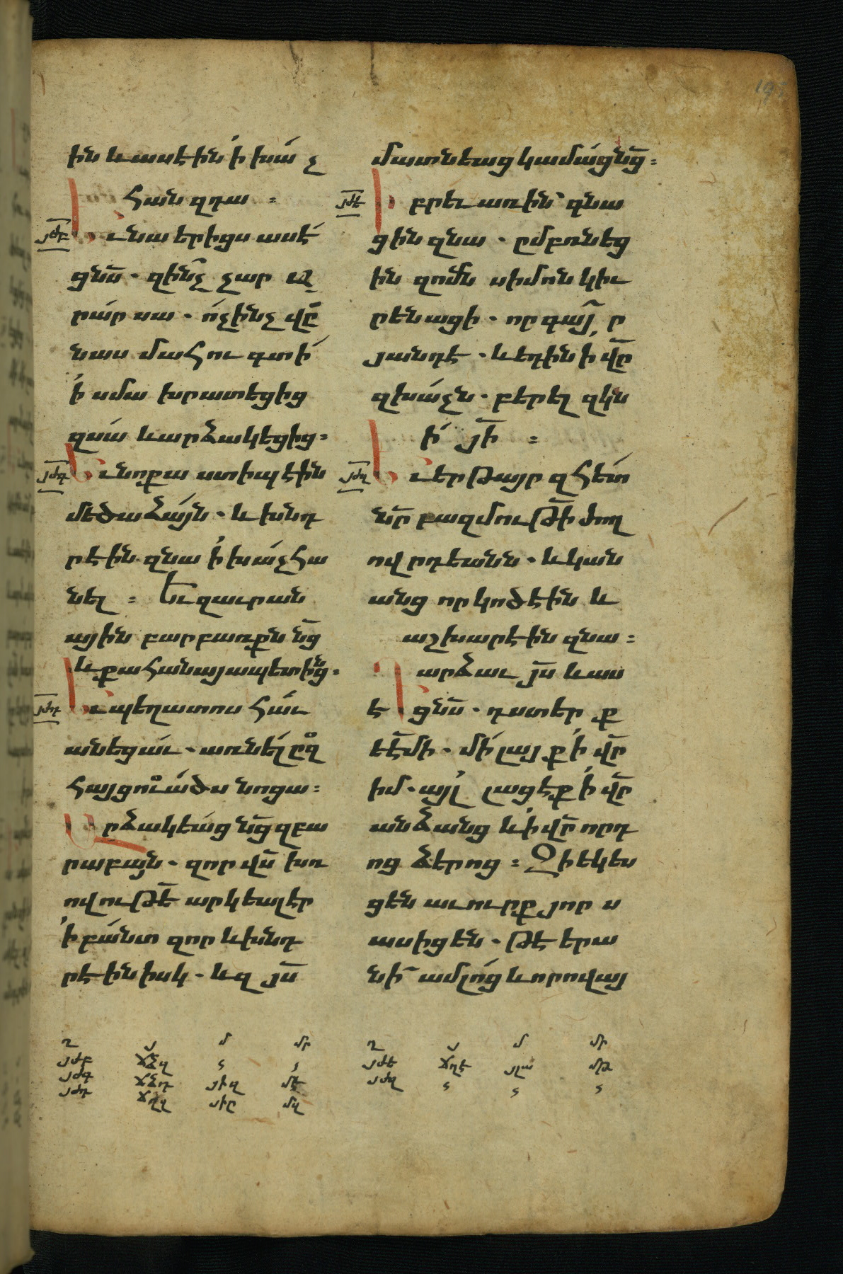 This manuscript was executed in 1475 CE by a scribe identified as Aristakes for a priest named Hakob. It contains a series of sixteen images on the life of Christ preceding the text of the Gospels, as well as the traditional Evangelist portraits, and there are marginal illustrations throughout. The style of the miniatures, which employ brilliant colors and emphasize decorative patterns, is characteristic of manuscript production in the region around Lake Van during the fifteenth century. The style of Lake Van has often been described in relation to schools of Islamic arts of the book. Numerous inscriptions (on fols. 258-260) spanning a few centuries attest to the manuscript's long history of use and revered preservation. The codex's later history included a rebinding with silver covers from Kayseri that date to approximately 1700. This jeweled and enameled silver binding bears a composition of the Adoration of the Magi on the front and the Ascension on the back.