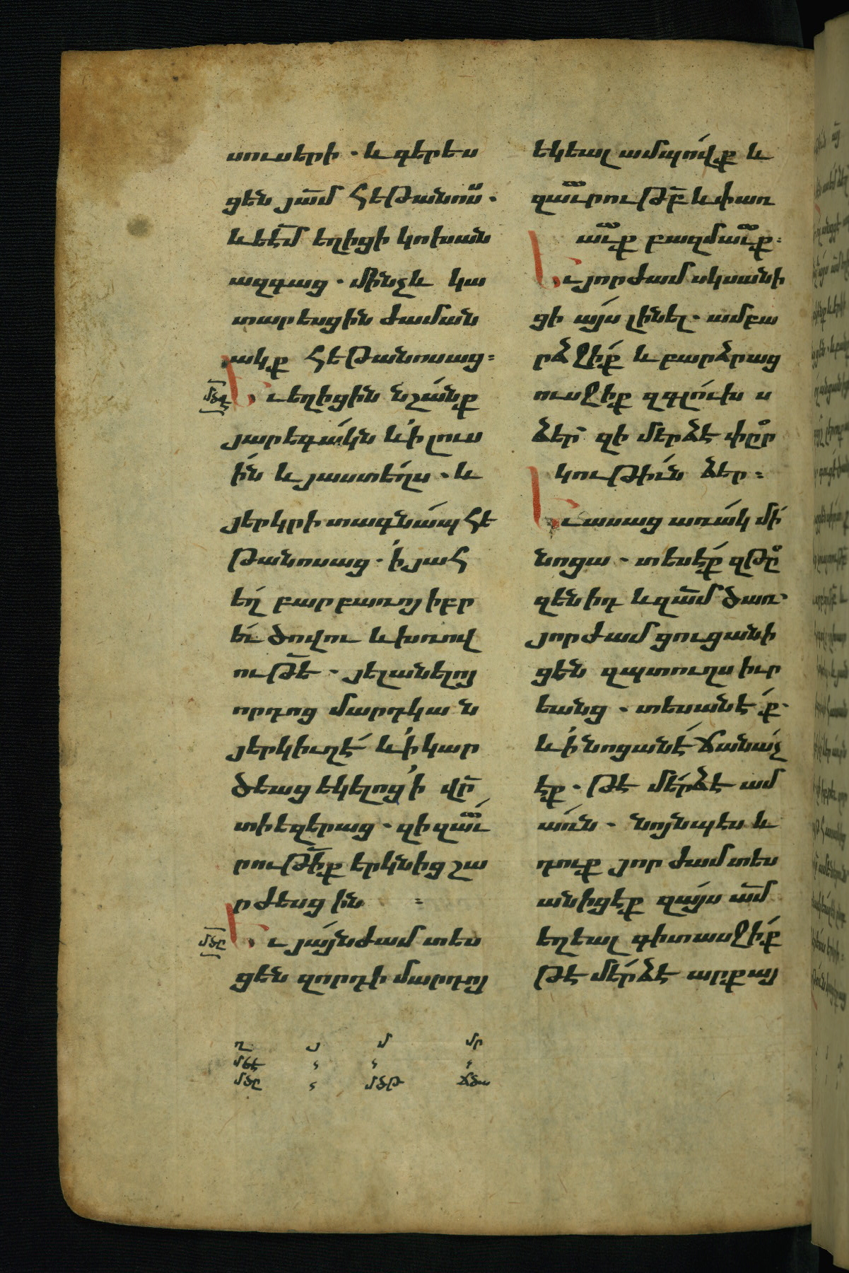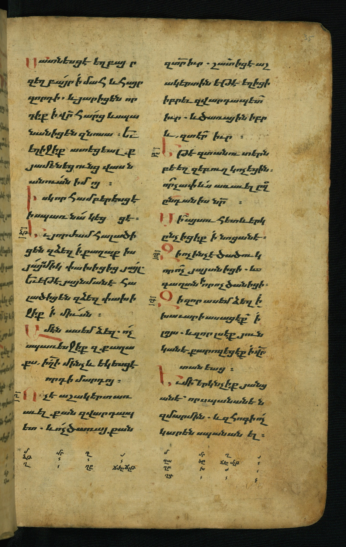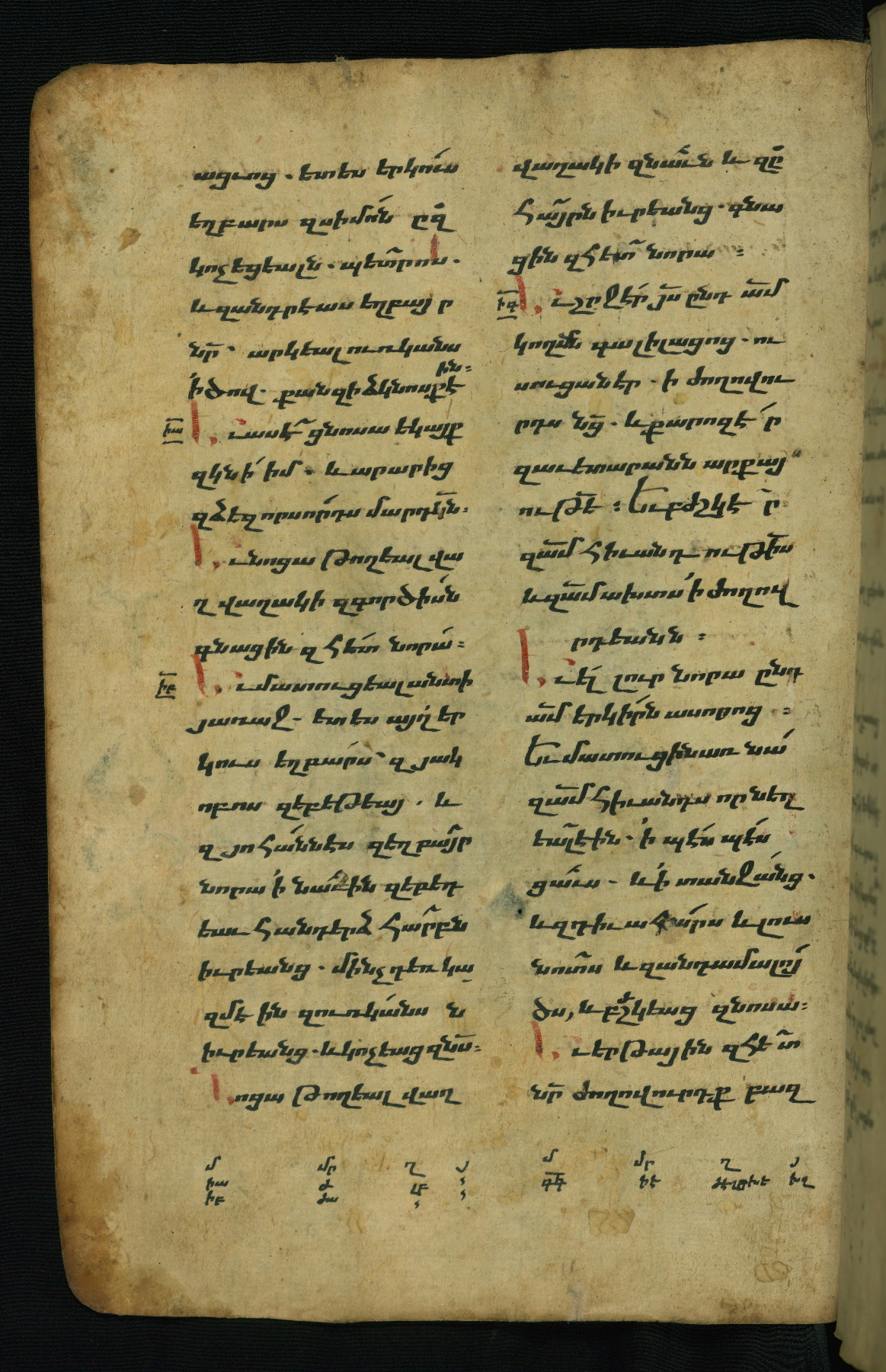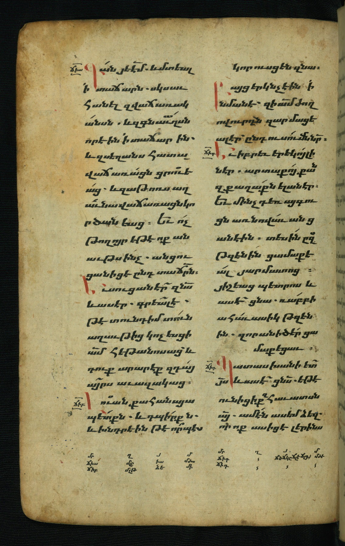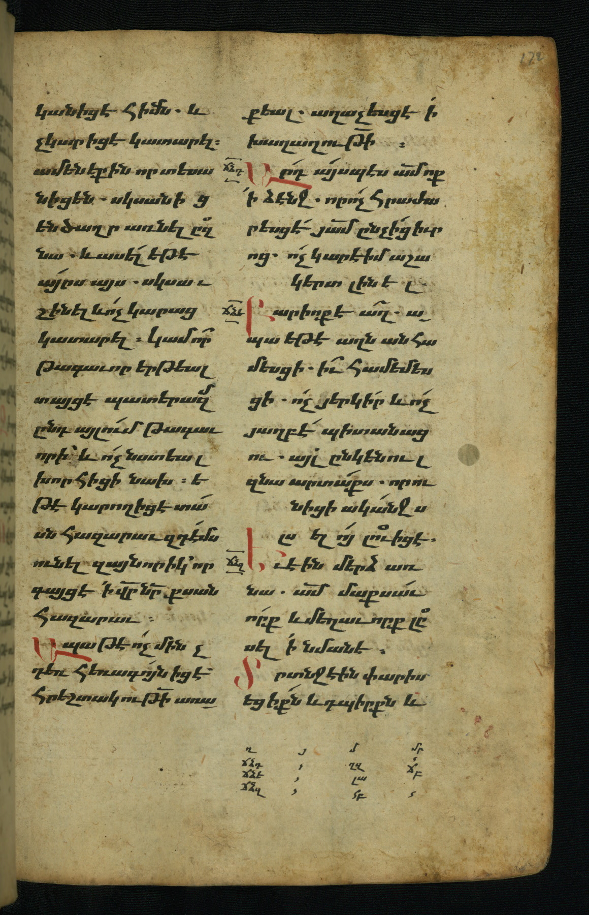This manuscript was executed in 1475 CE by a scribe identified as Aristakes for a priest named Hakob. It contains a series of sixteen images on the life of Christ preceding the text of the Gospels, as well as the traditional Evangelist portraits, and there are marginal illustrations throughout. The style of the miniatures, which employ brilliant colors and emphasize decorative patterns, is characteristic of manuscript production in the region around Lake Van during the fifteenth century. The style of Lake Van has often been described in relation to schools of Islamic arts of the book. Numerous inscriptions (on fols. 258-260) spanning a few centuries attest to the manuscript's long history of use and revered preservation. The codex's later history included a rebinding with silver covers from Kayseri that date to approximately 1700. This jeweled and enameled silver binding bears a composition of the Adoration of the Magi on the front and the Ascension on the back.