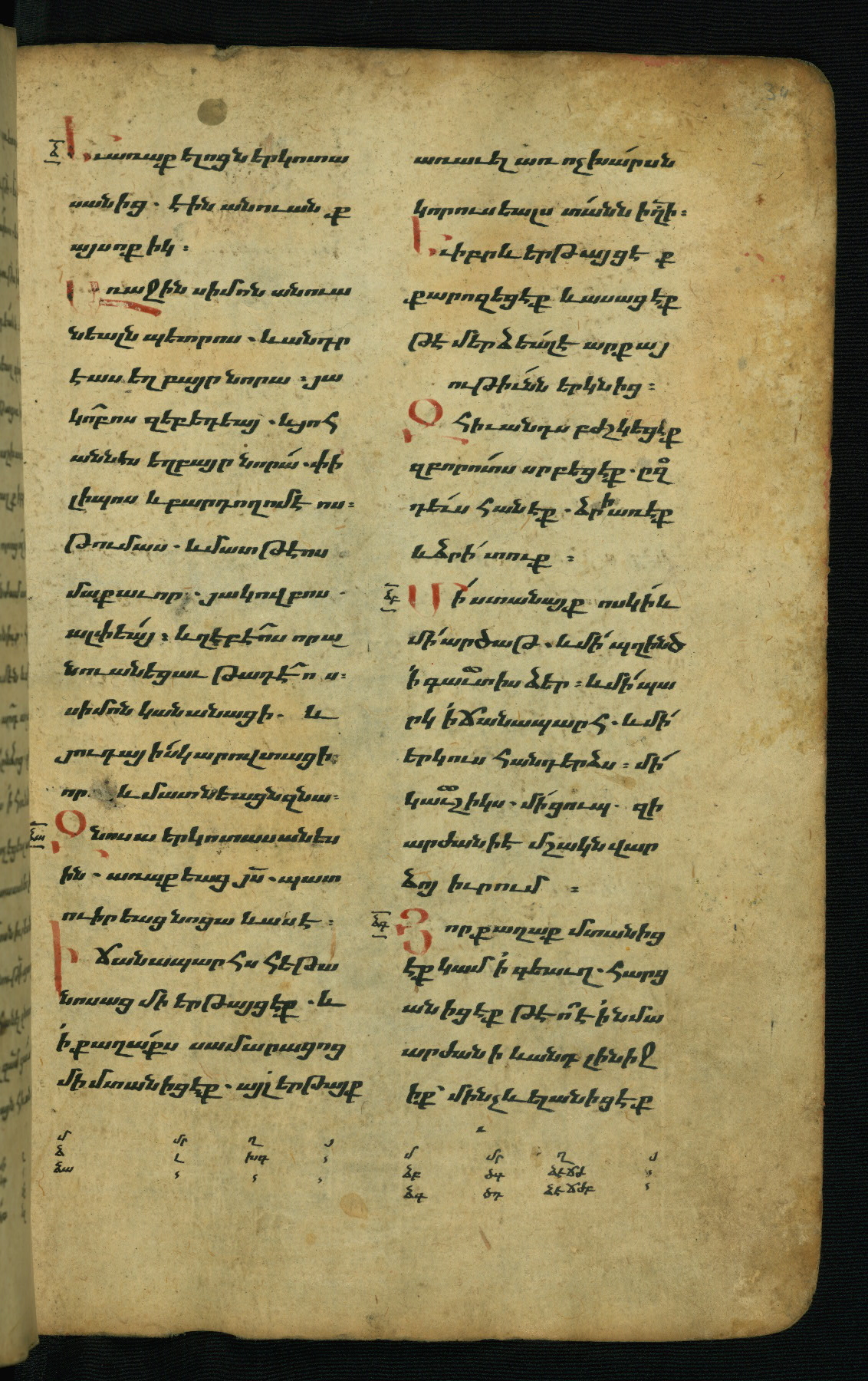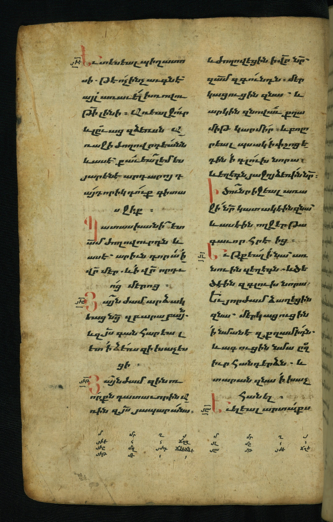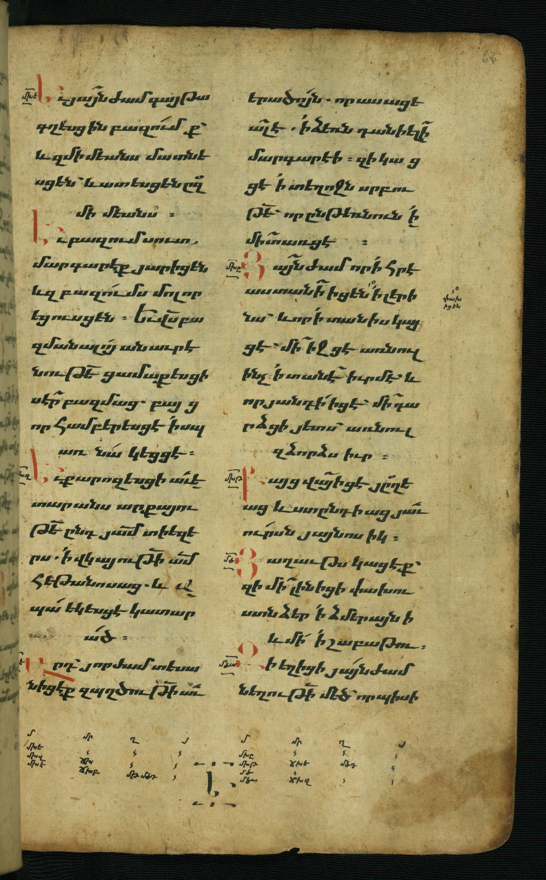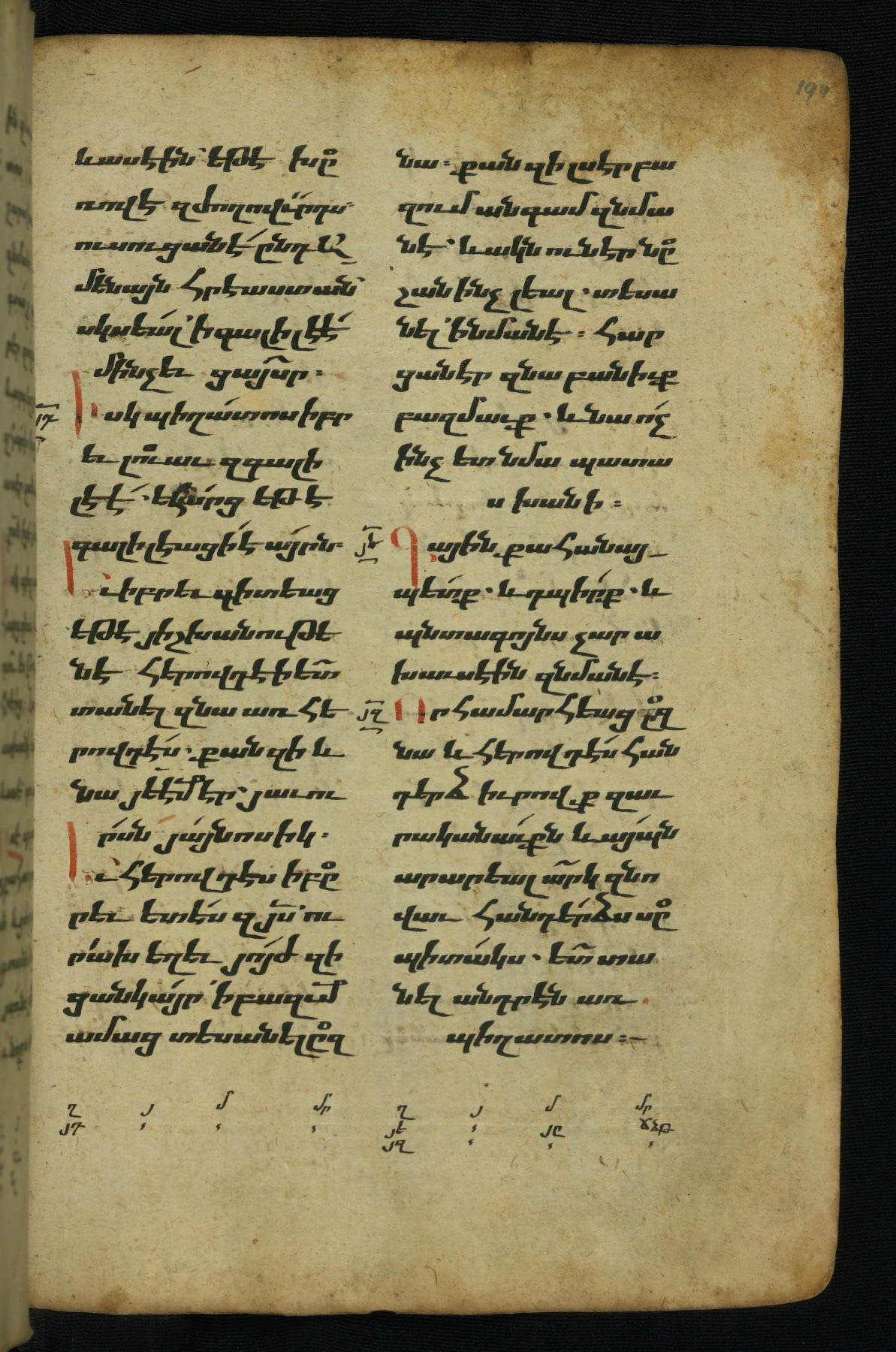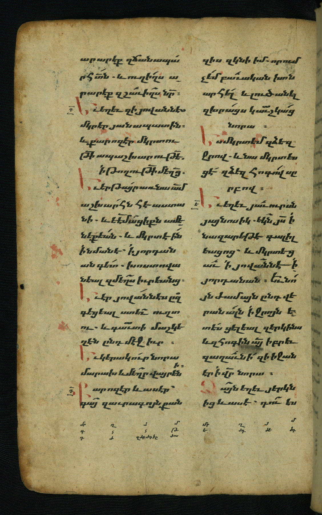 This manuscript was executed in 1475 CE by a scribe identified as Aristakes for a priest named Hakob. It contains a series of sixteen images on the life of Christ preceding the text of the Gospels, as well as the traditional Evangelist portraits, and there are marginal illustrations throughout. The style of the miniatures, which employ brilliant colors and emphasize decorative patterns, is characteristic of manuscript production in the region around Lake Van during the fifteenth century. The style of Lake Van has often been described in relation to schools of Islamic arts of the book. Numerous inscriptions (on fols. 258-260) spanning a few centuries attest to the manuscript's long history of use and revered preservation. The codex's later history included a rebinding with silver covers from Kayseri that date to approximately 1700. This jeweled and enameled silver binding bears a composition of the Adoration of the Magi on the front and the Ascension on the back.