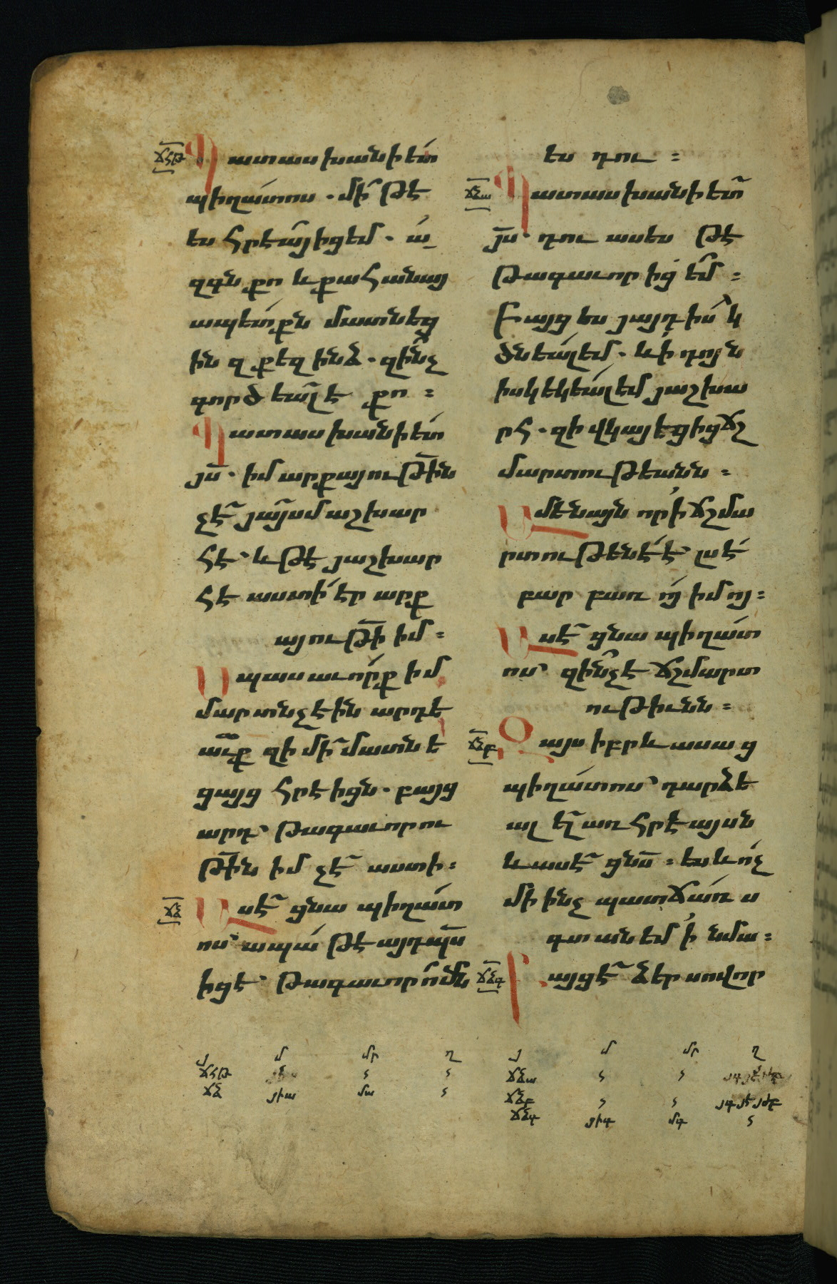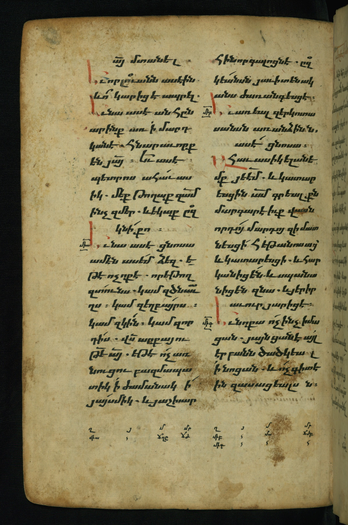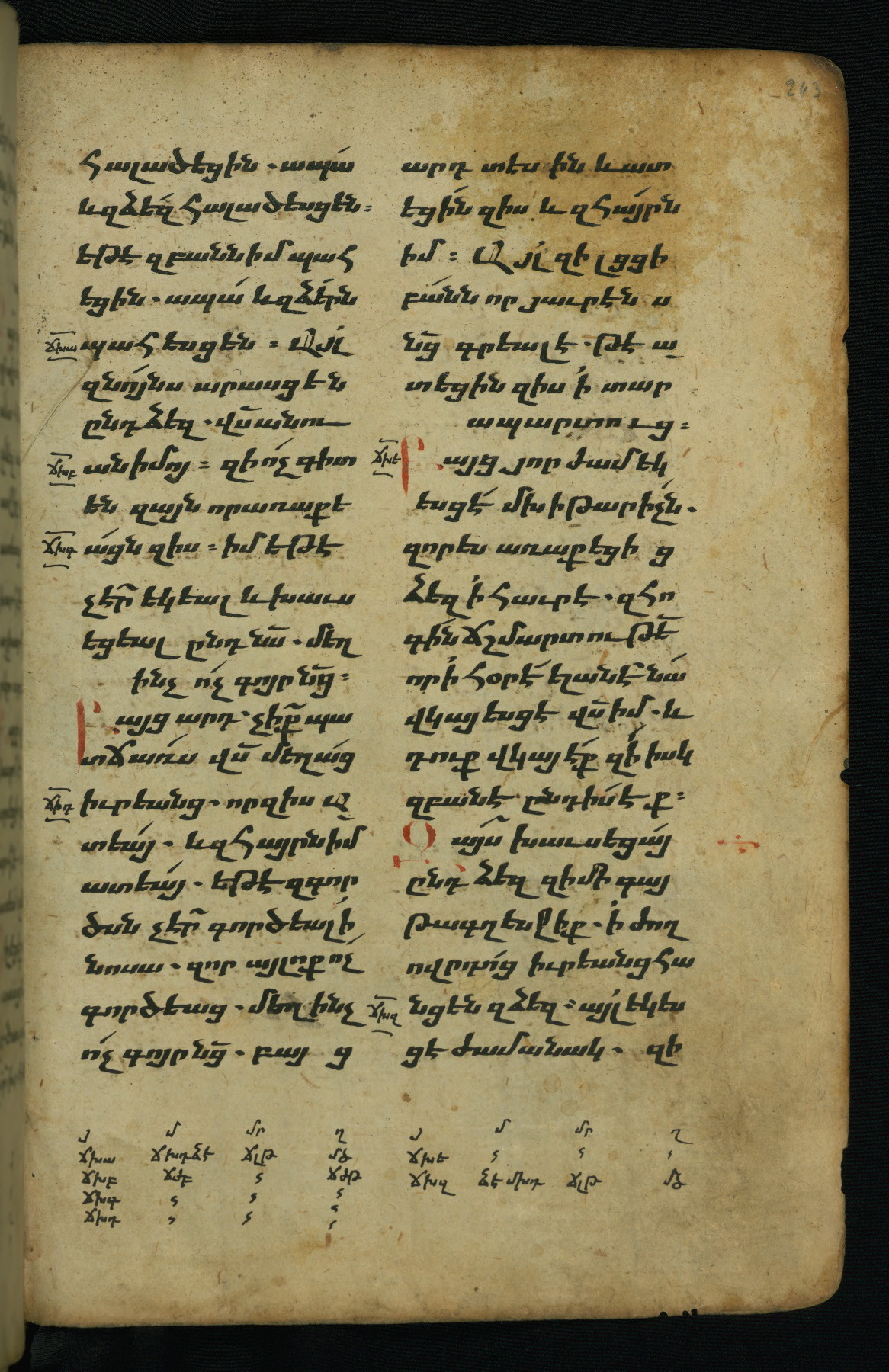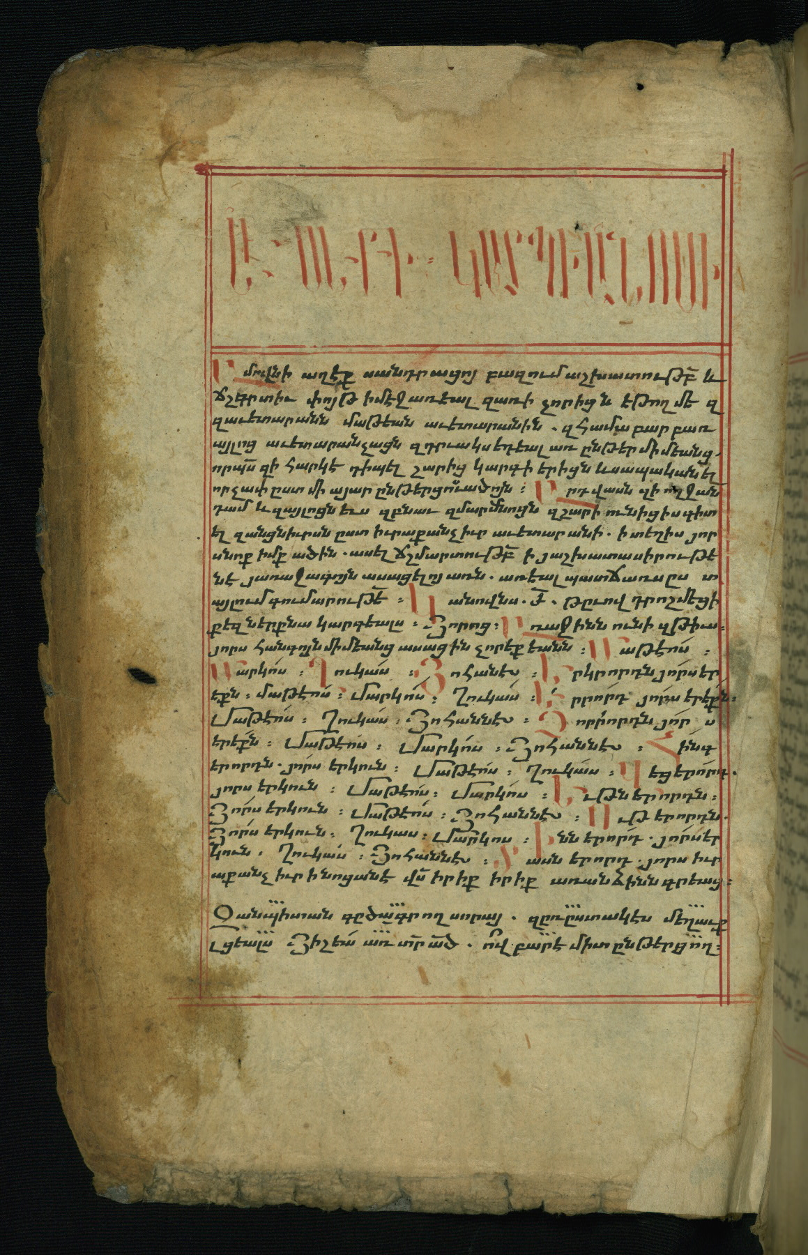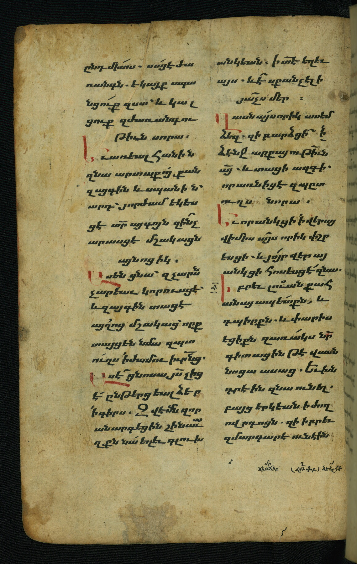 This manuscript was executed in 1475 CE by a scribe identified as Aristakes for a priest named Hakob. It contains a series of sixteen images on the life of Christ preceding the text of the Gospels, as well as the traditional Evangelist portraits, and there are marginal illustrations throughout. The style of the miniatures, which employ brilliant colors and emphasize decorative patterns, is characteristic of manuscript production in the region around Lake Van during the fifteenth century. The style of Lake Van has often been described in relation to schools of Islamic arts of the book. Numerous inscriptions (on fols. 258-260) spanning a few centuries attest to the manuscript's long history of use and revered preservation. The codex's later history included a rebinding with silver covers from Kayseri that date to approximately 1700. This jeweled and enameled silver binding bears a composition of the Adoration of the Magi on the front and the Ascension on the back.