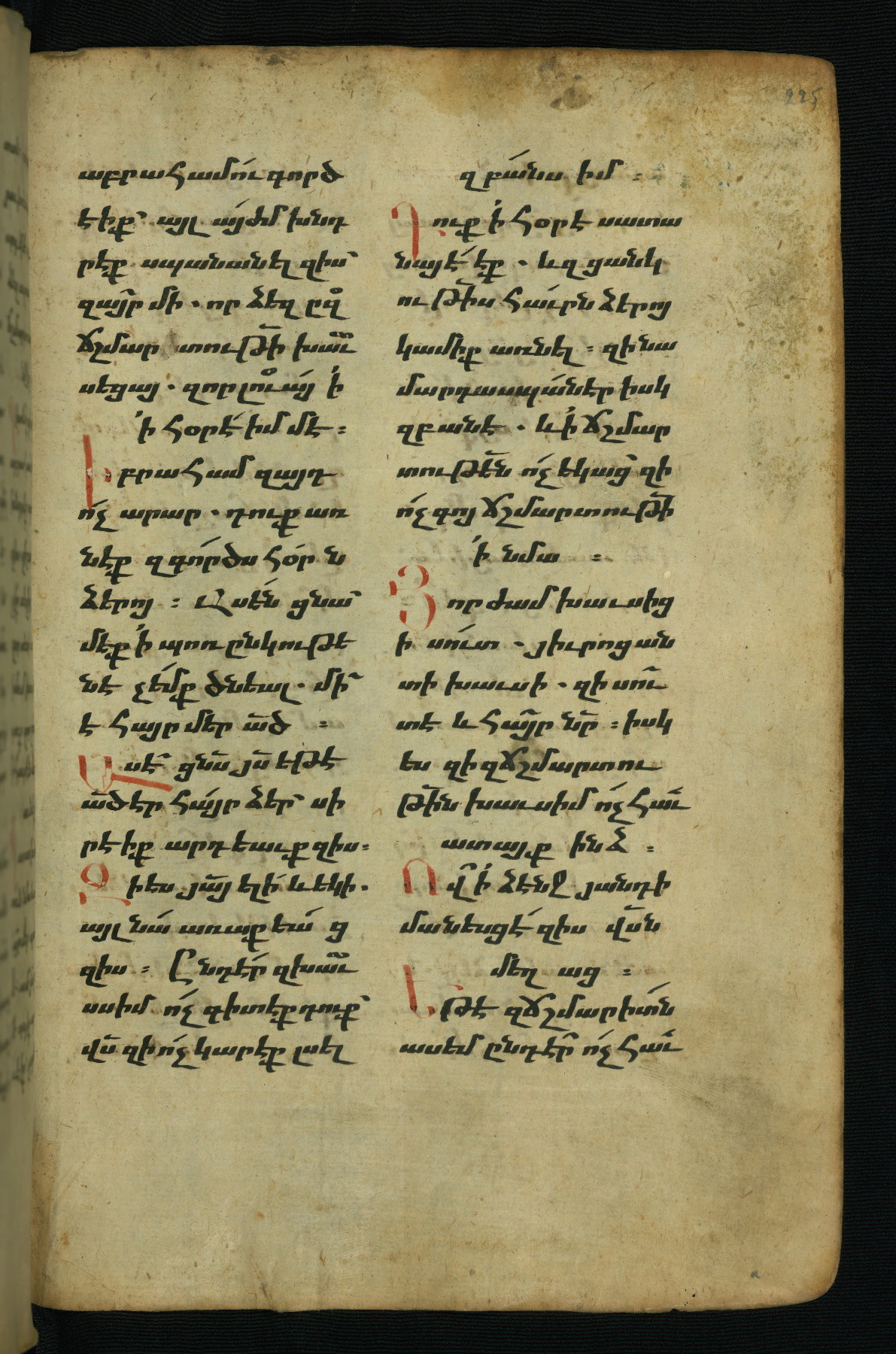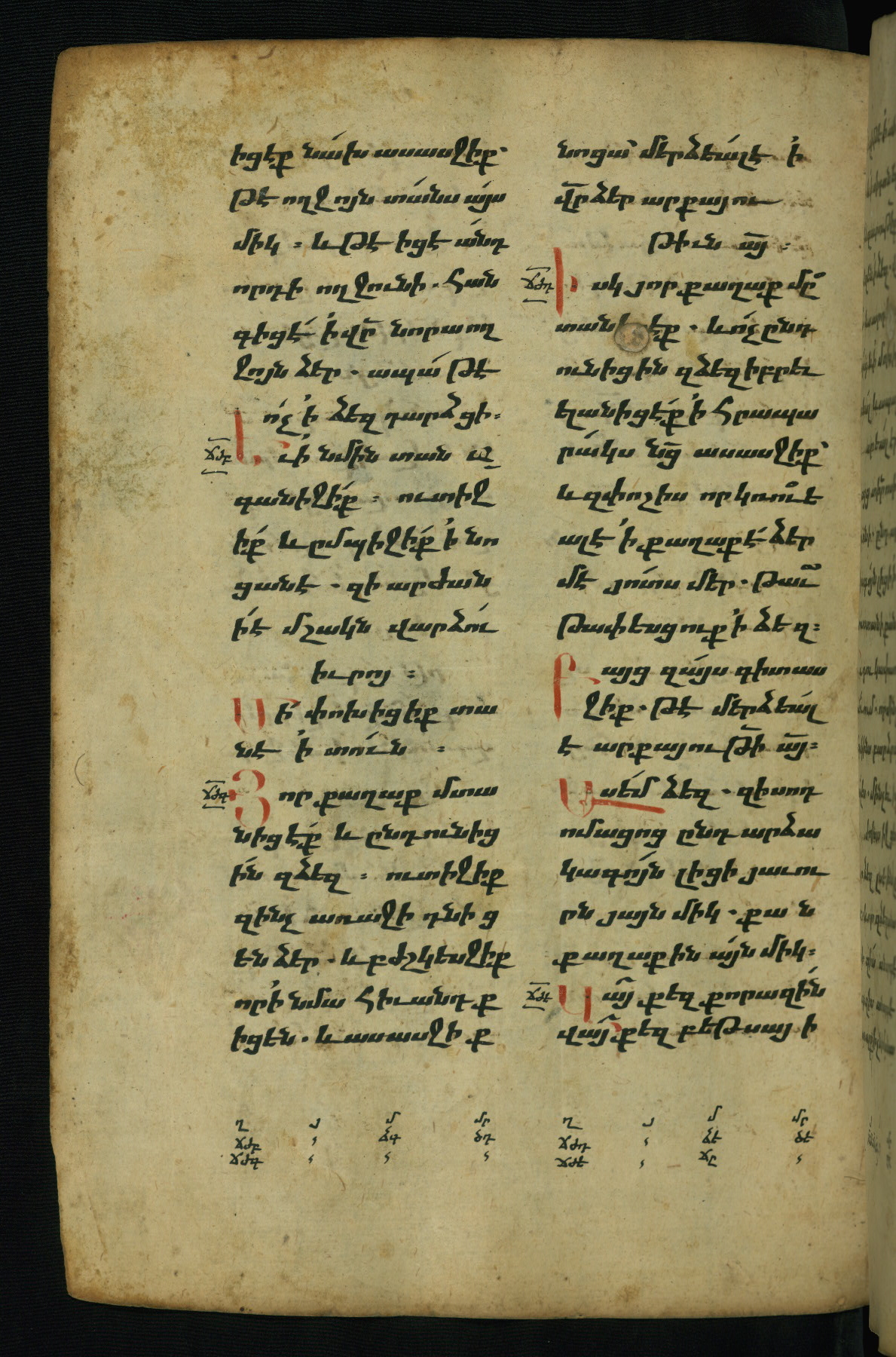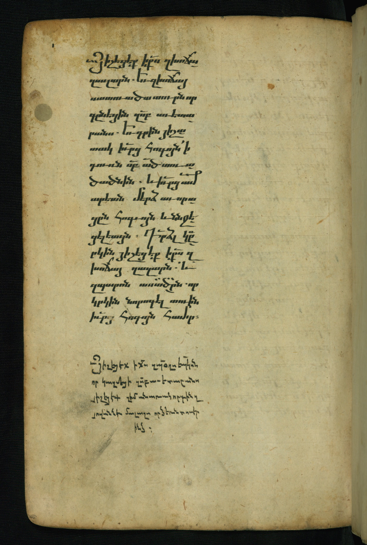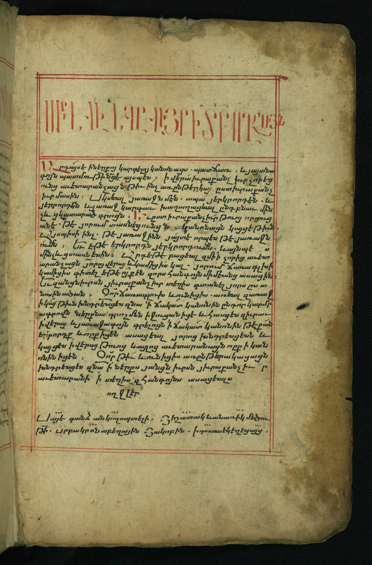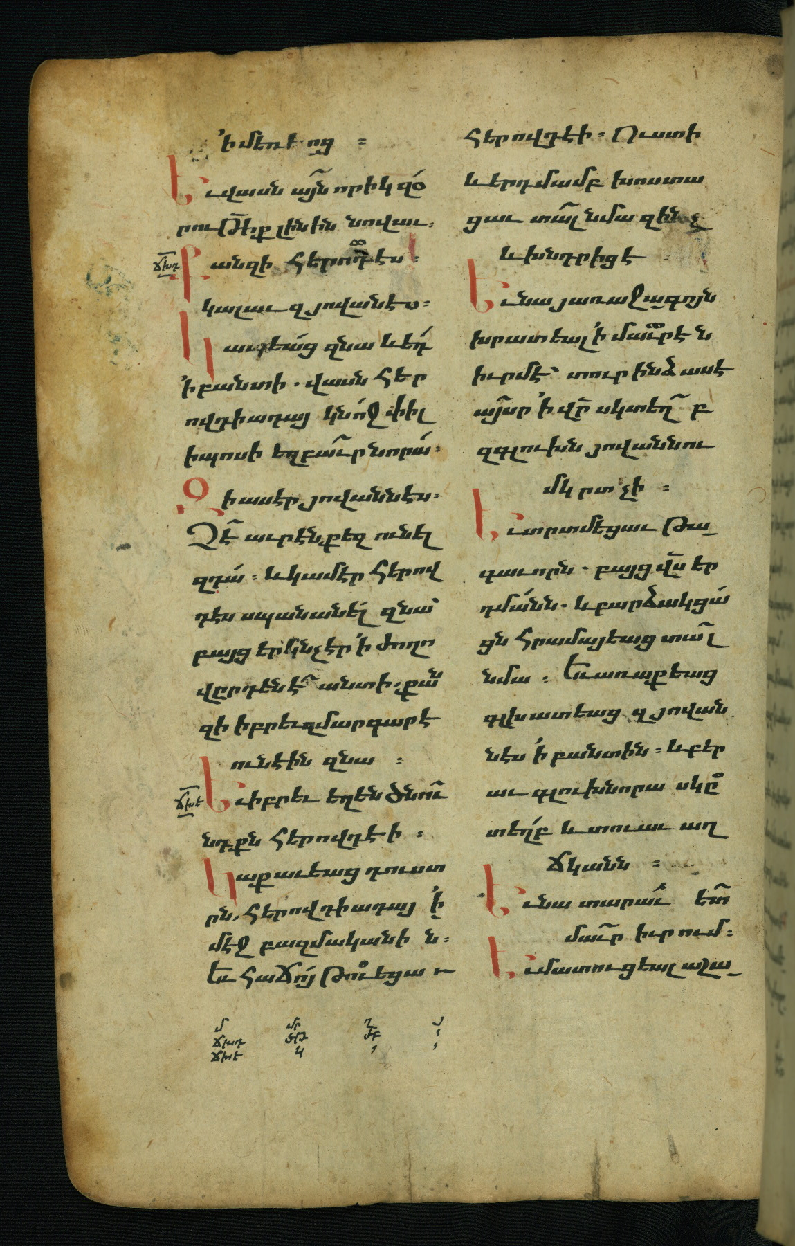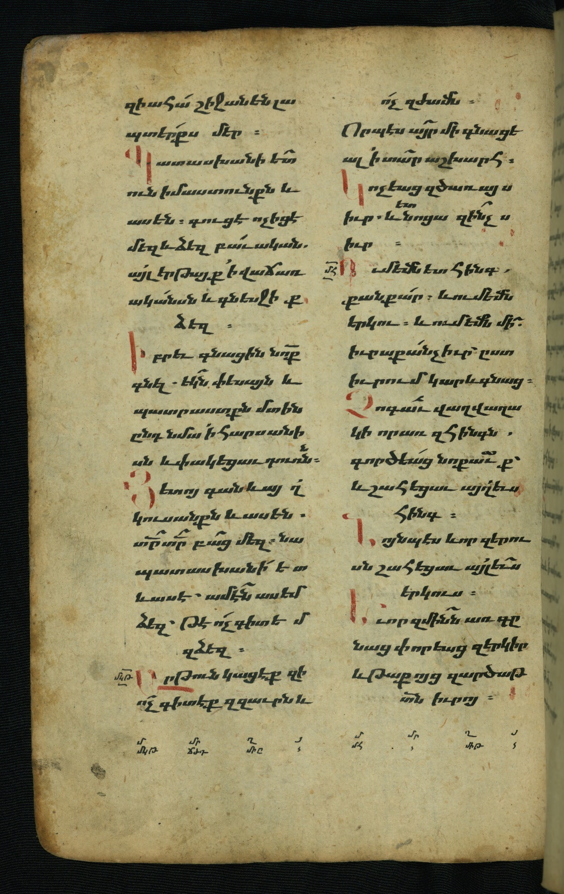 This manuscript was executed in 1475 CE by a scribe identified as Aristakes for a priest named Hakob. It contains a series of sixteen images on the life of Christ preceding the text of the Gospels, as well as the traditional Evangelist portraits, and there are marginal illustrations throughout. The style of the miniatures, which employ brilliant colors and emphasize decorative patterns, is characteristic of manuscript production in the region around Lake Van during the fifteenth century. The style of Lake Van has often been described in relation to schools of Islamic arts of the book. Numerous inscriptions (on fols. 258-260) spanning a few centuries attest to the manuscript's long history of use and revered preservation. The codex's later history included a rebinding with silver covers from Kayseri that date to approximately 1700. This jeweled and enameled silver binding bears a composition of the Adoration of the Magi on the front and the Ascension on the back.