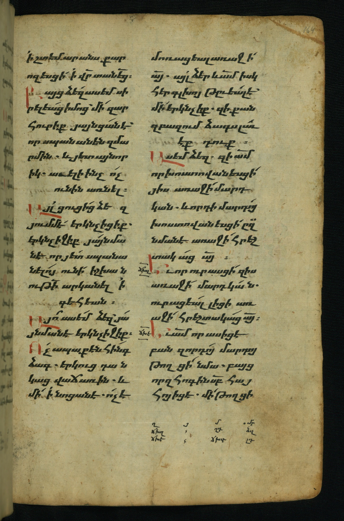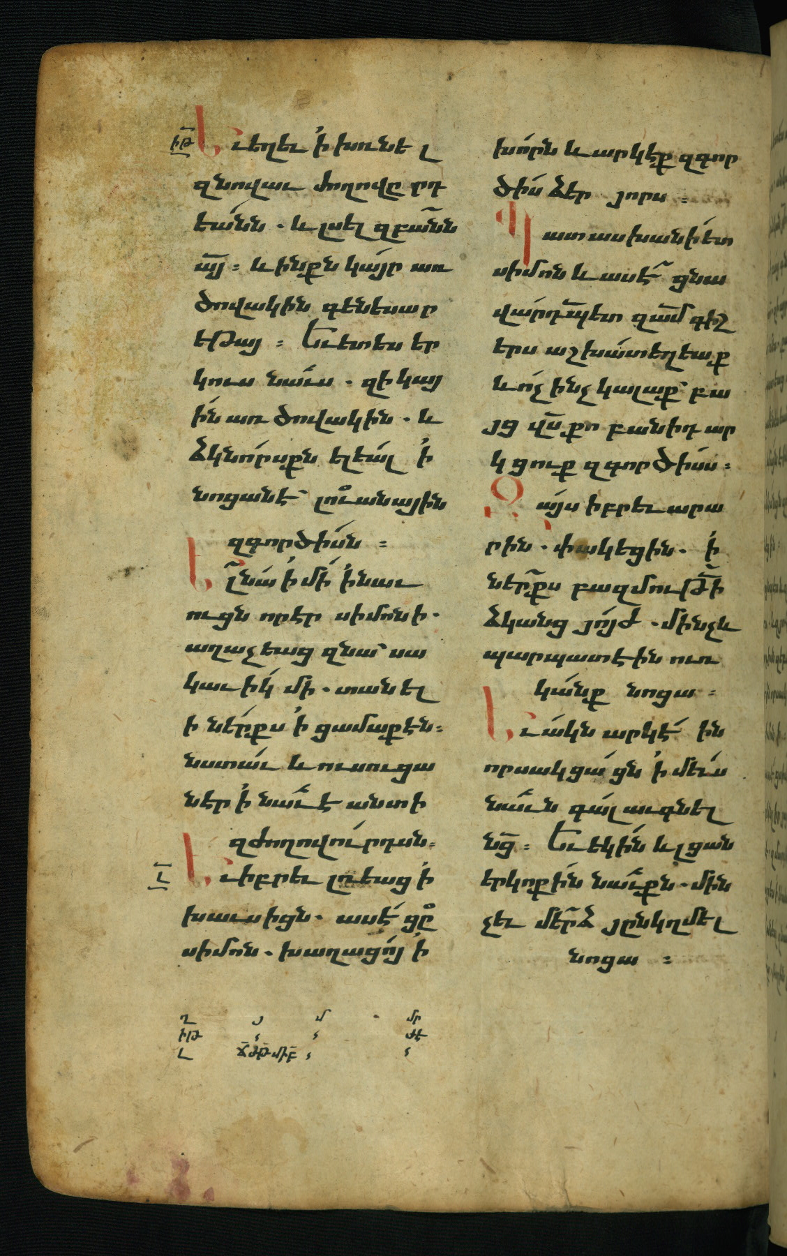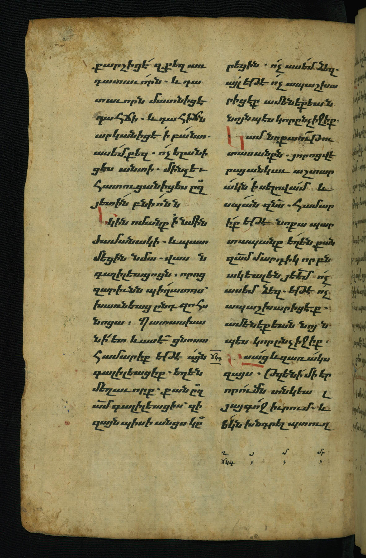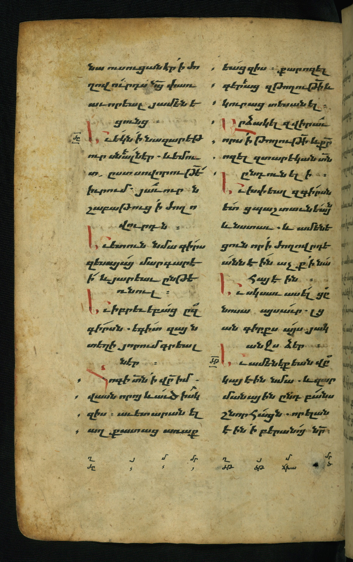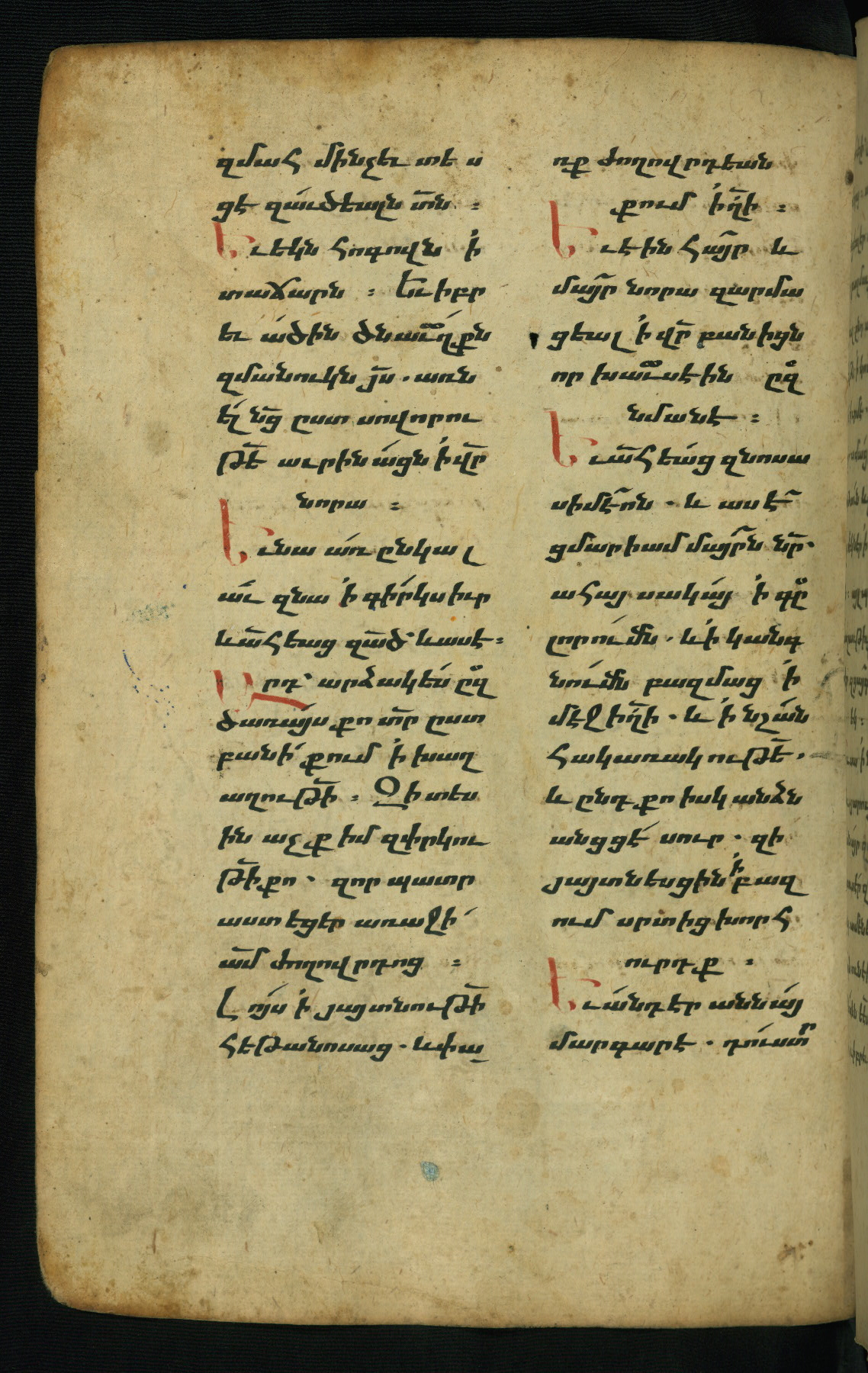 This manuscript was executed in 1475 CE by a scribe identified as Aristakes for a priest named Hakob. It contains a series of sixteen images on the life of Christ preceding the text of the Gospels, as well as the traditional Evangelist portraits, and there are marginal illustrations throughout. The style of the miniatures, which employ brilliant colors and emphasize decorative patterns, is characteristic of manuscript production in the region around Lake Van during the fifteenth century. The style of Lake Van has often been described in relation to schools of Islamic arts of the book. Numerous inscriptions (on fols. 258-260) spanning a few centuries attest to the manuscript's long history of use and revered preservation. The codex's later history included a rebinding with silver covers from Kayseri that date to approximately 1700. This jeweled and enameled silver binding bears a composition of the Adoration of the Magi on the front and the Ascension on the back.