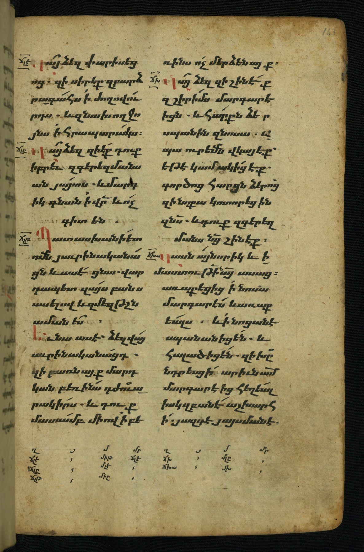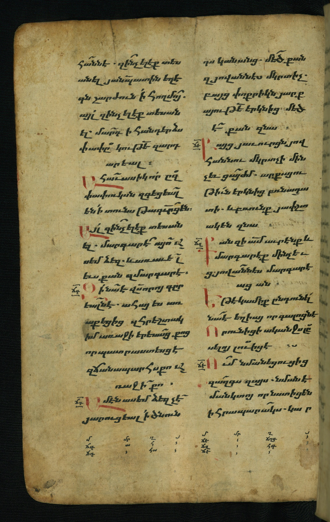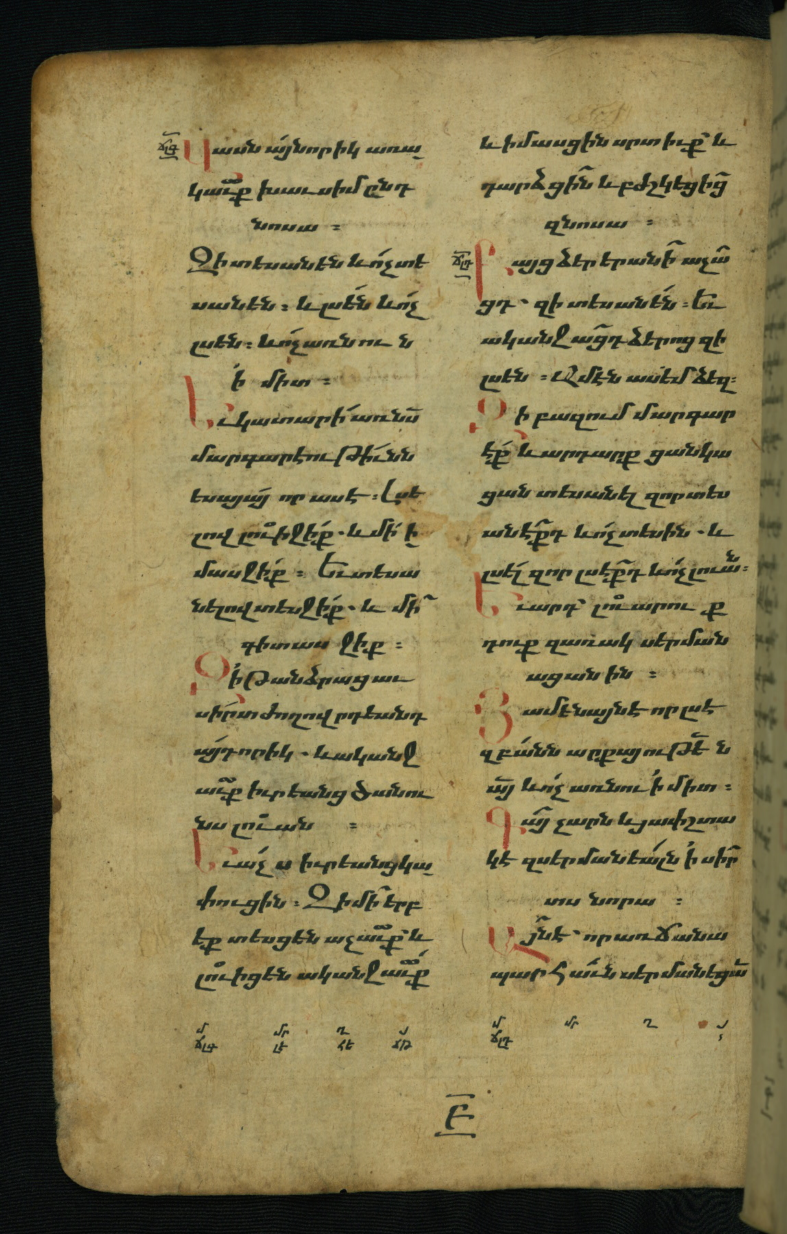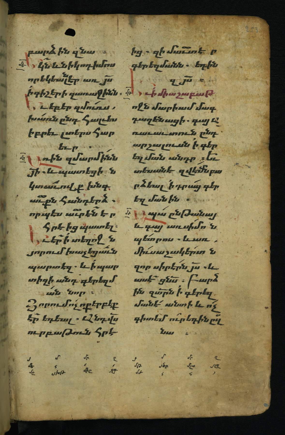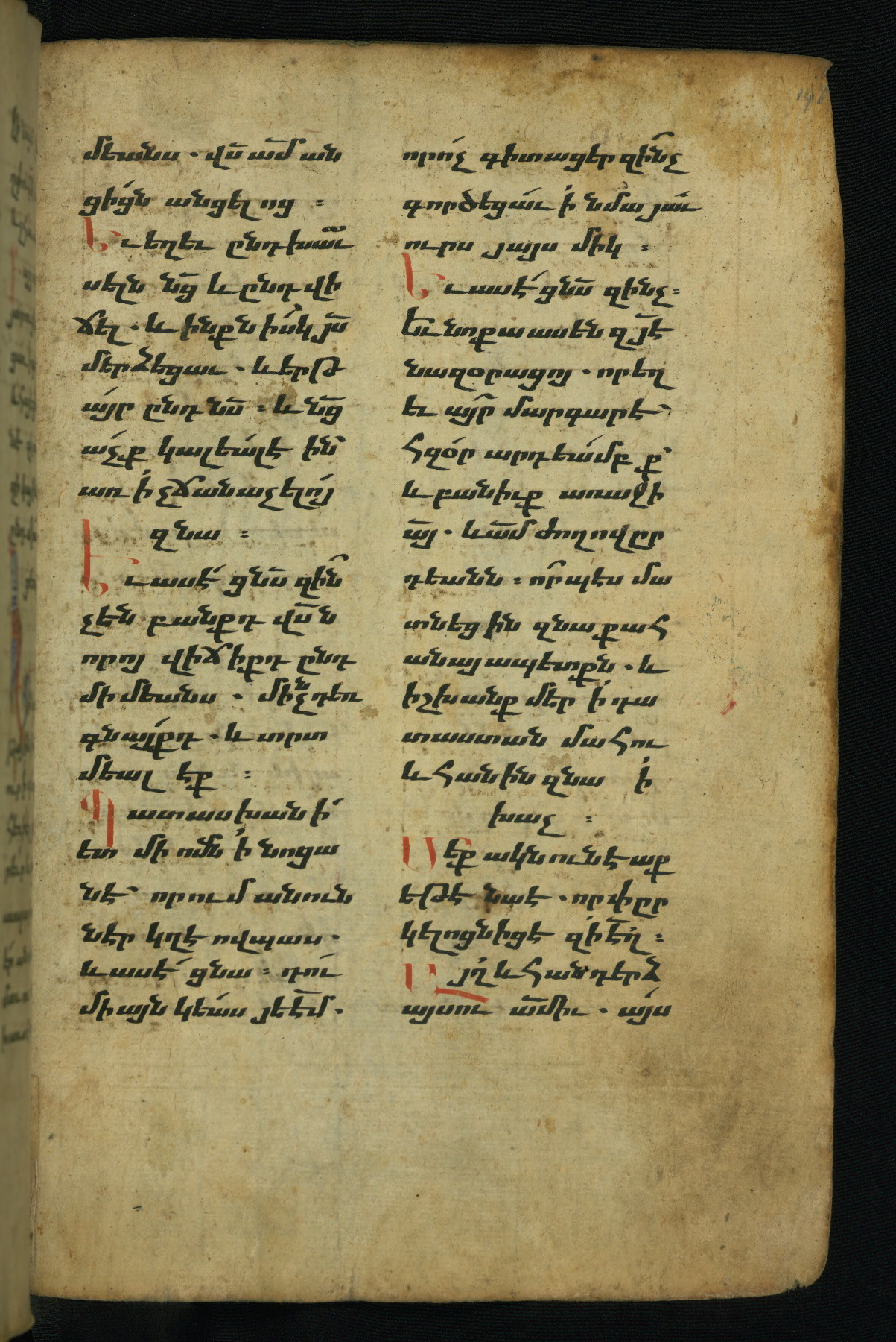 This manuscript was executed in 1475 CE by a scribe identified as Aristakes for a priest named Hakob. It contains a series of sixteen images on the life of Christ preceding the text of the Gospels, as well as the traditional Evangelist portraits, and there are marginal illustrations throughout. The style of the miniatures, which employ brilliant colors and emphasize decorative patterns, is characteristic of manuscript production in the region around Lake Van during the fifteenth century. The style of Lake Van has often been described in relation to schools of Islamic arts of the book. Numerous inscriptions (on fols. 258-260) spanning a few centuries attest to the manuscript's long history of use and revered preservation. The codex's later history included a rebinding with silver covers from Kayseri that date to approximately 1700. This jeweled and enameled silver binding bears a composition of the Adoration of the Magi on the front and the Ascension on the back.