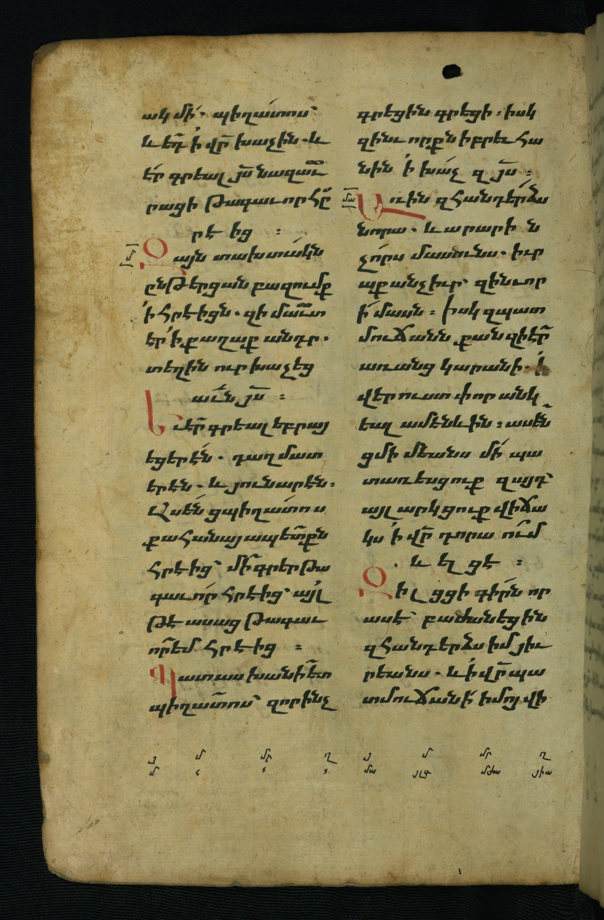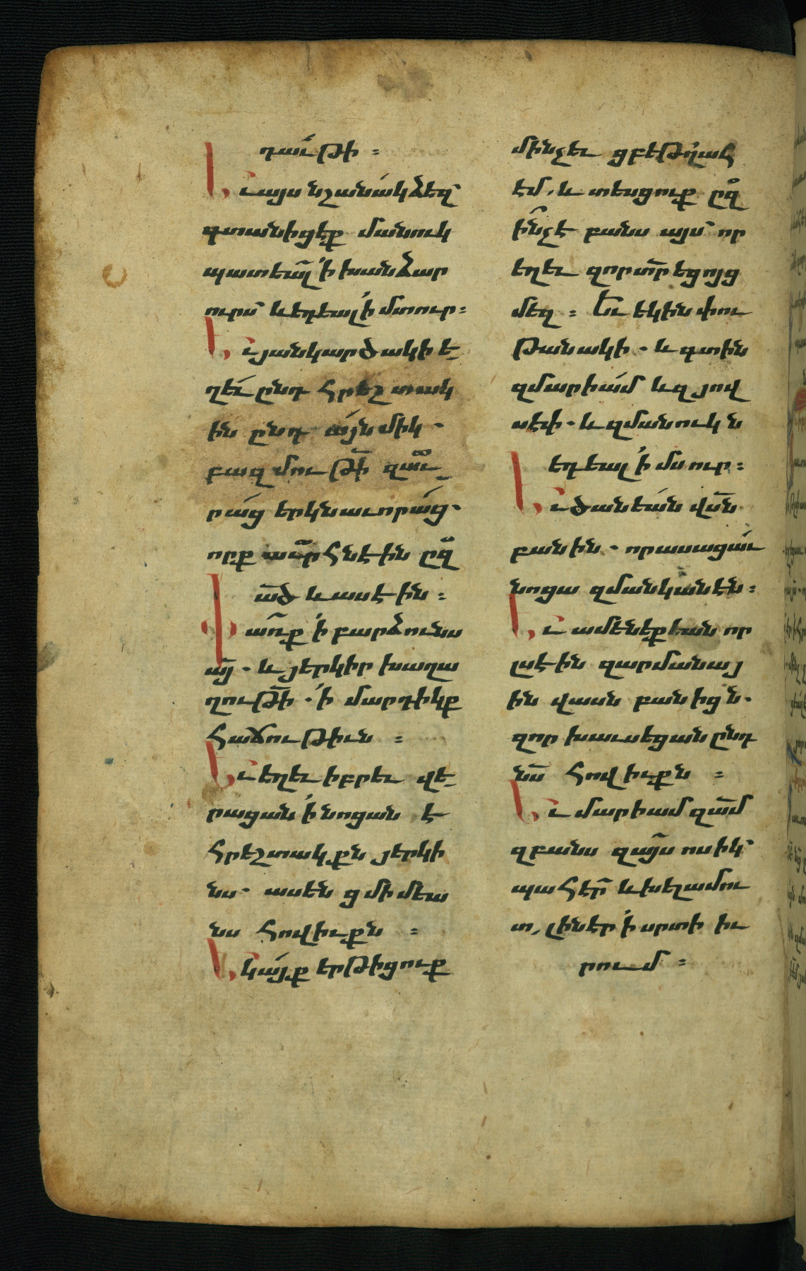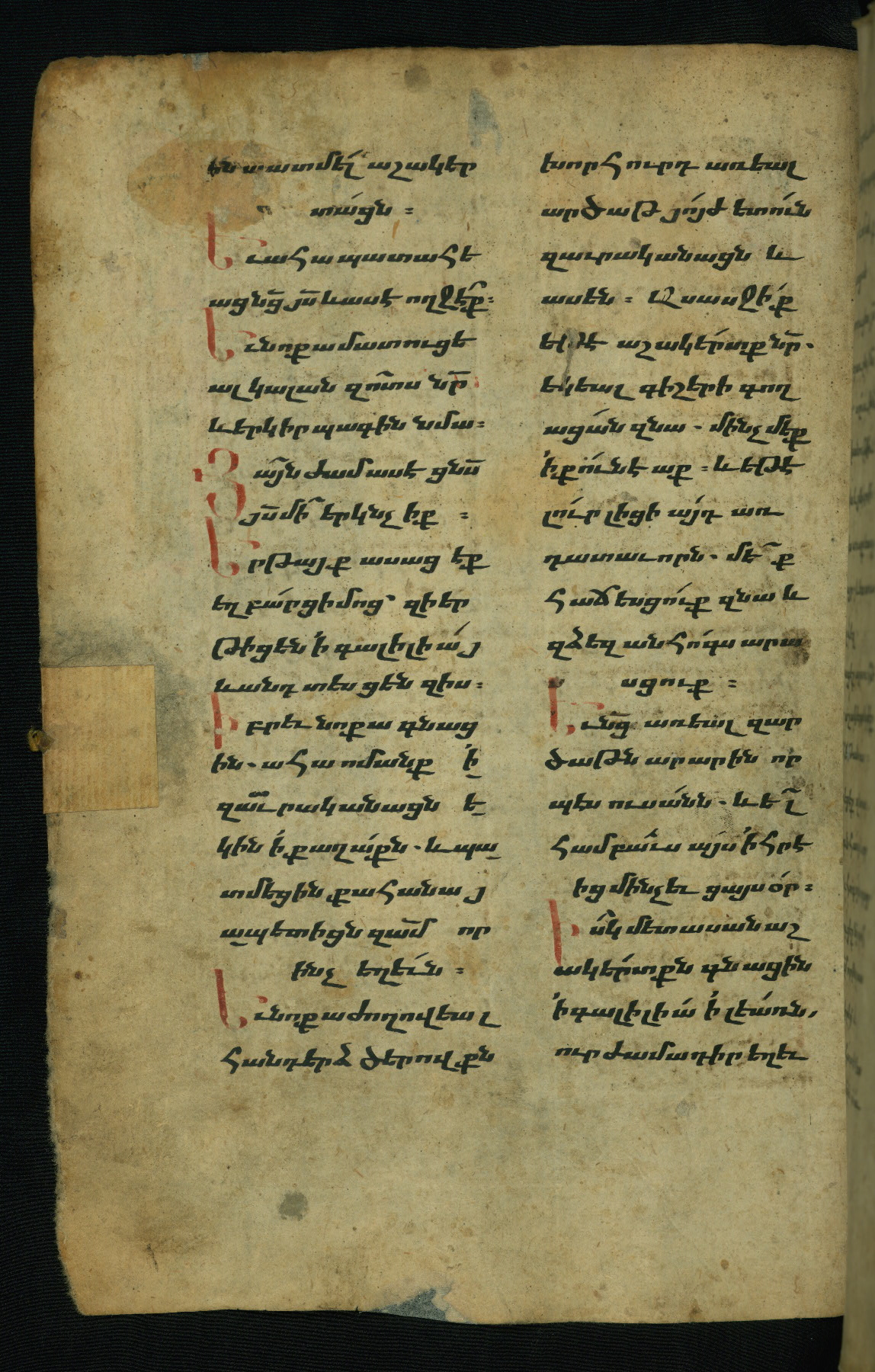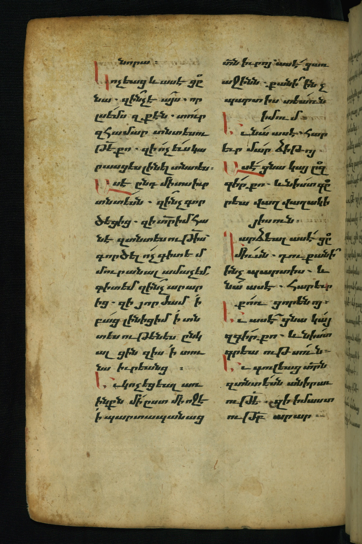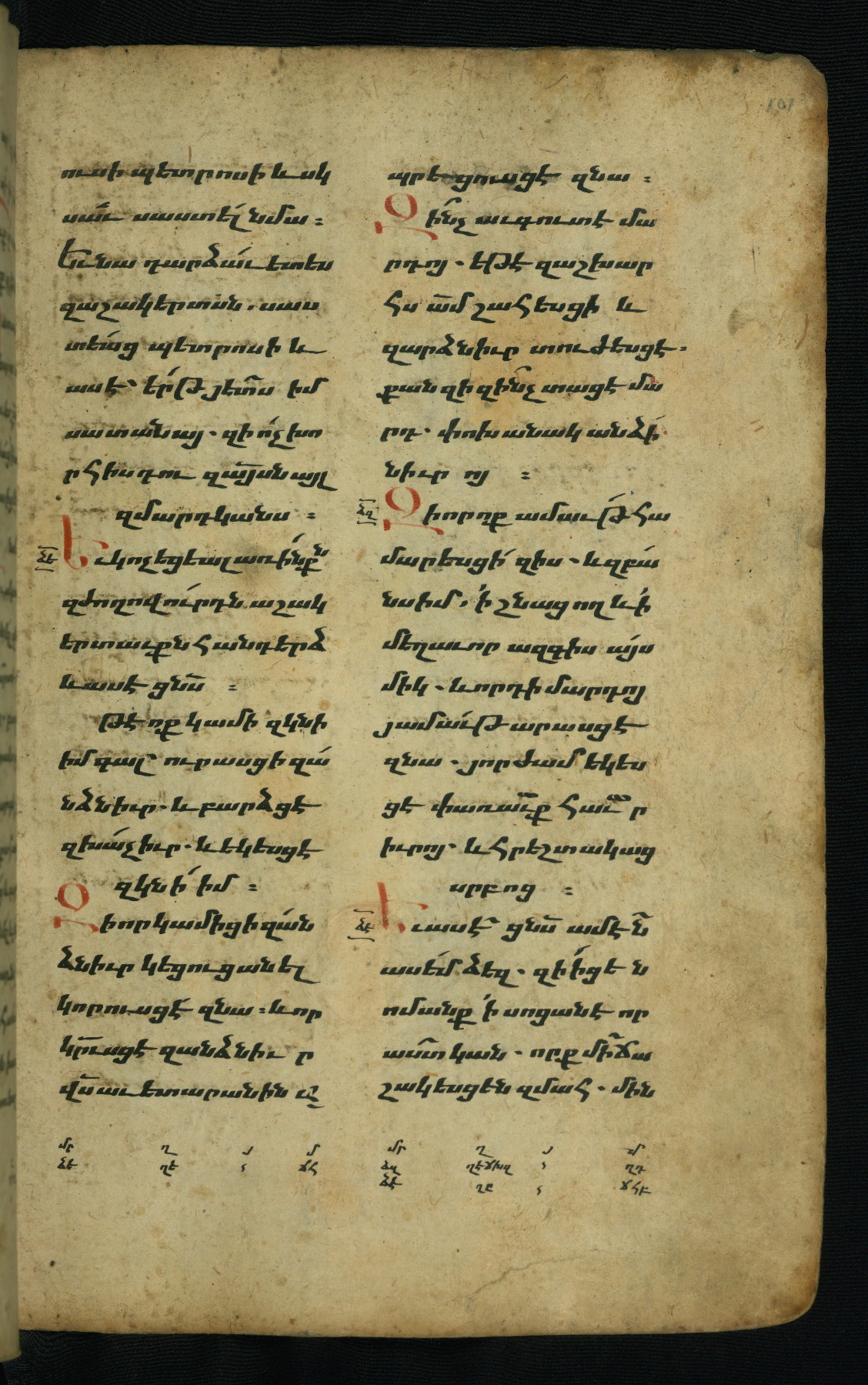This manuscript was executed in 1475 CE by a scribe identified as Aristakes for a priest named Hakob. It contains a series of sixteen images on the life of Christ preceding the text of the Gospels, as well as the traditional Evangelist portraits, and there are marginal illustrations throughout. The style of the miniatures, which employ brilliant colors and emphasize decorative patterns, is characteristic of manuscript production in the region around Lake Van during the fifteenth century. The style of Lake Van has often been described in relation to schools of Islamic arts of the book. Numerous inscriptions (on fols. 258-260) spanning a few centuries attest to the manuscript's long history of use and revered preservation. The codex's later history included a rebinding with silver covers from Kayseri that date to approximately 1700. This jeweled and enameled silver binding bears a composition of the Adoration of the Magi on the front and the Ascension on the back.