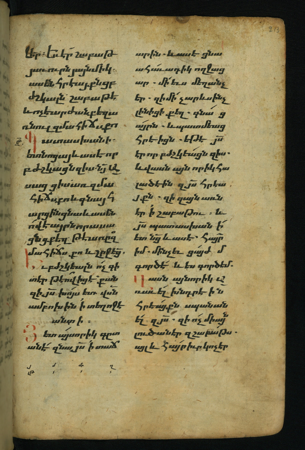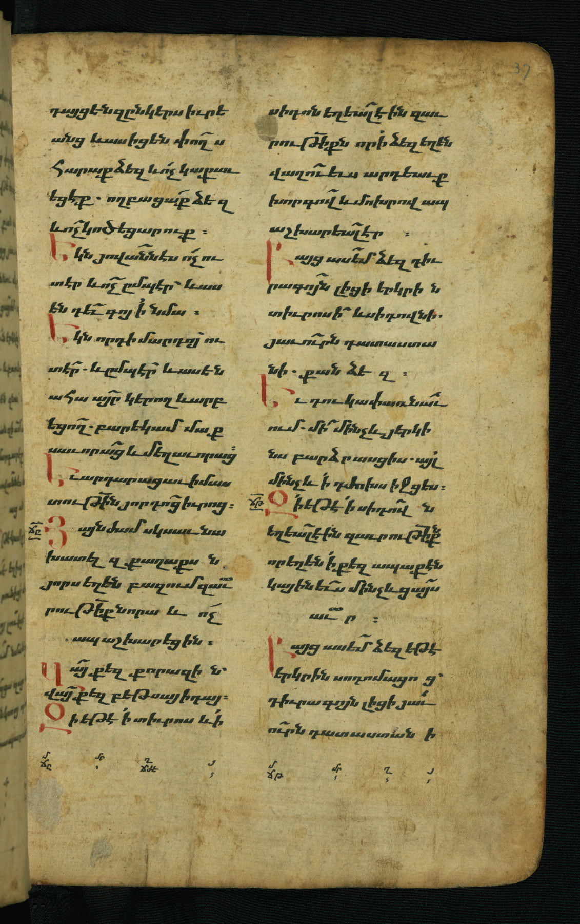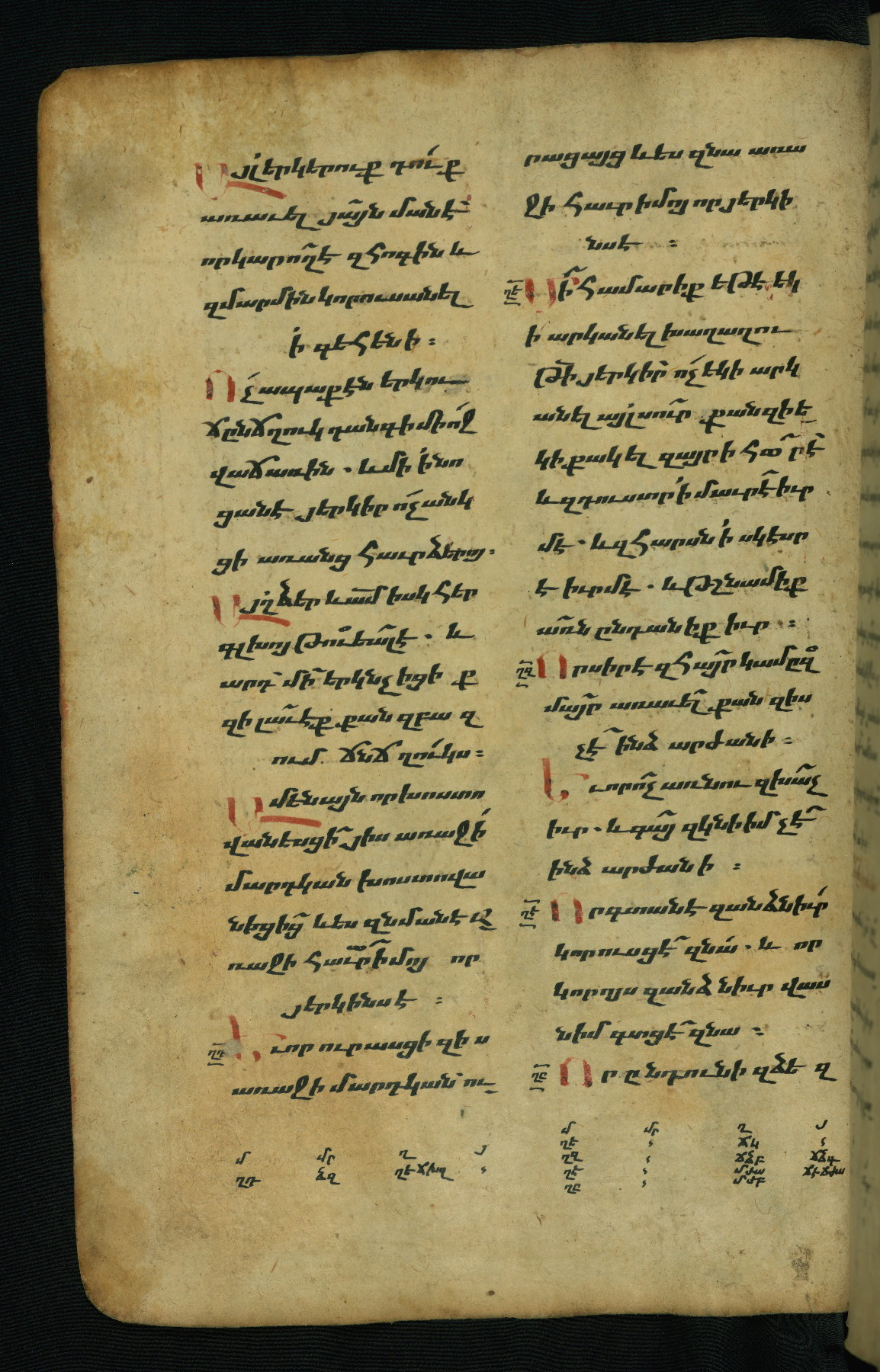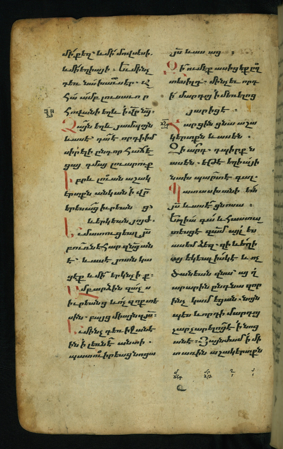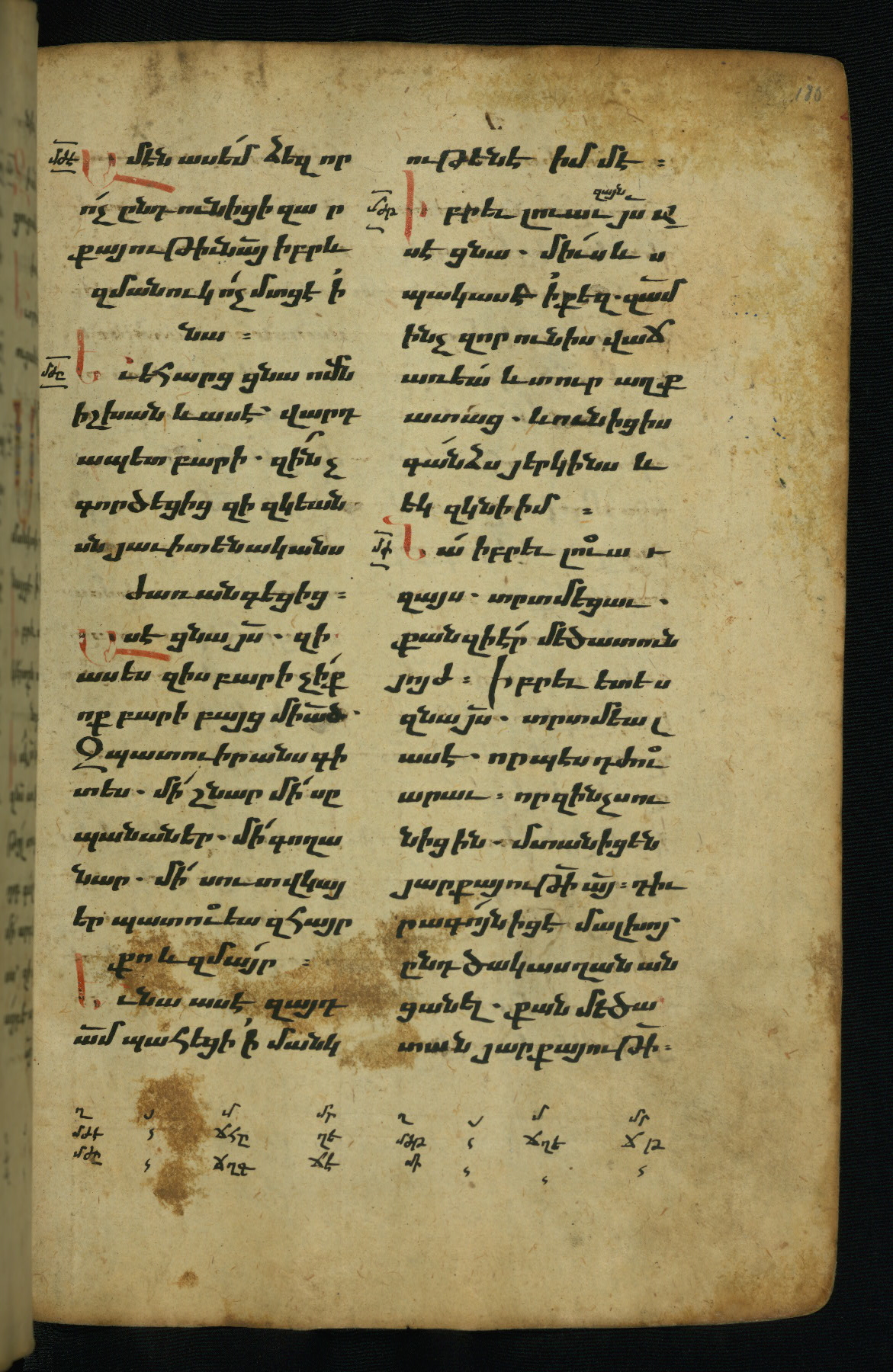 This manuscript was executed in 1475 CE by a scribe identified as Aristakes for a priest named Hakob. It contains a series of sixteen images on the life of Christ preceding the text of the Gospels, as well as the traditional Evangelist portraits, and there are marginal illustrations throughout. The style of the miniatures, which employ brilliant colors and emphasize decorative patterns, is characteristic of manuscript production in the region around Lake Van during the fifteenth century. The style of Lake Van has often been described in relation to schools of Islamic arts of the book. Numerous inscriptions (on fols. 258-260) spanning a few centuries attest to the manuscript's long history of use and revered preservation. The codex's later history included a rebinding with silver covers from Kayseri that date to approximately 1700. This jeweled and enameled silver binding bears a composition of the Adoration of the Magi on the front and the Ascension on the back.