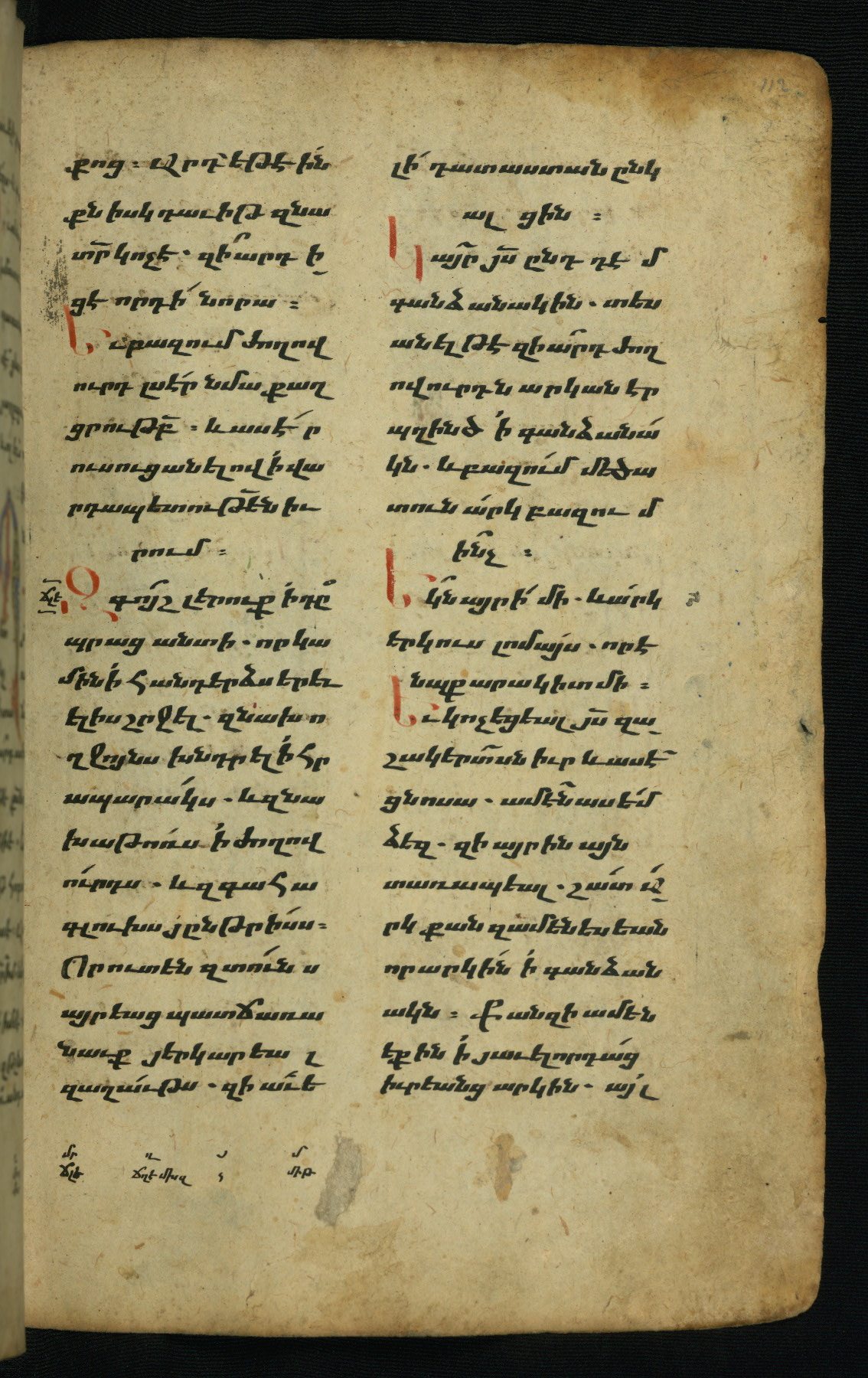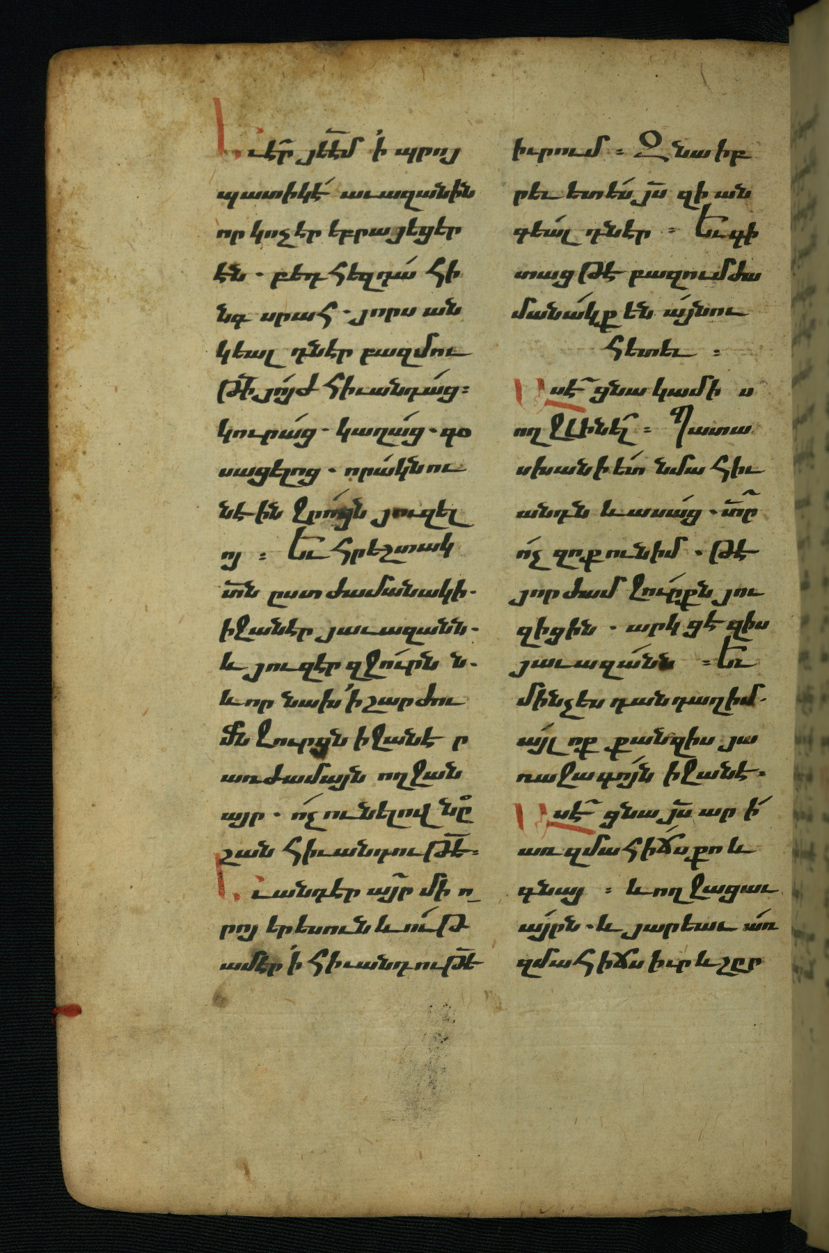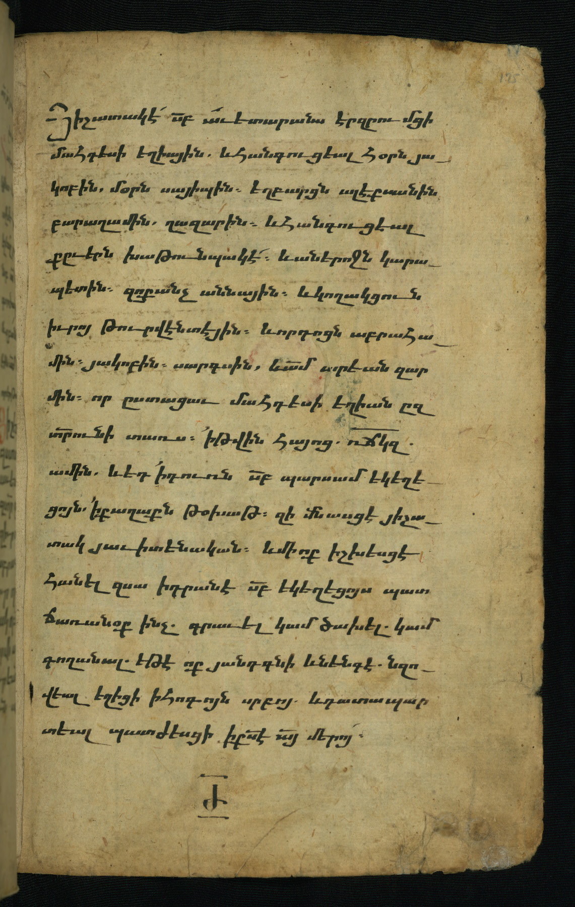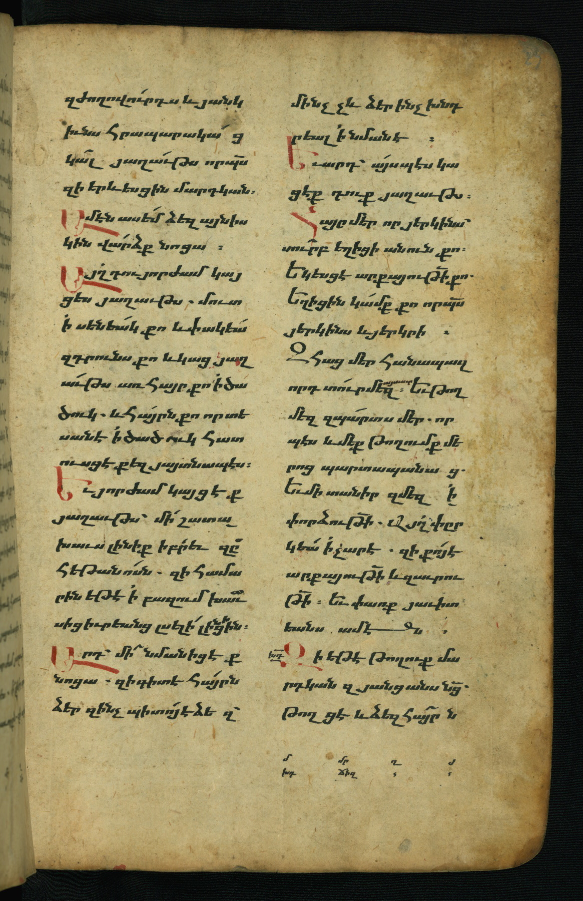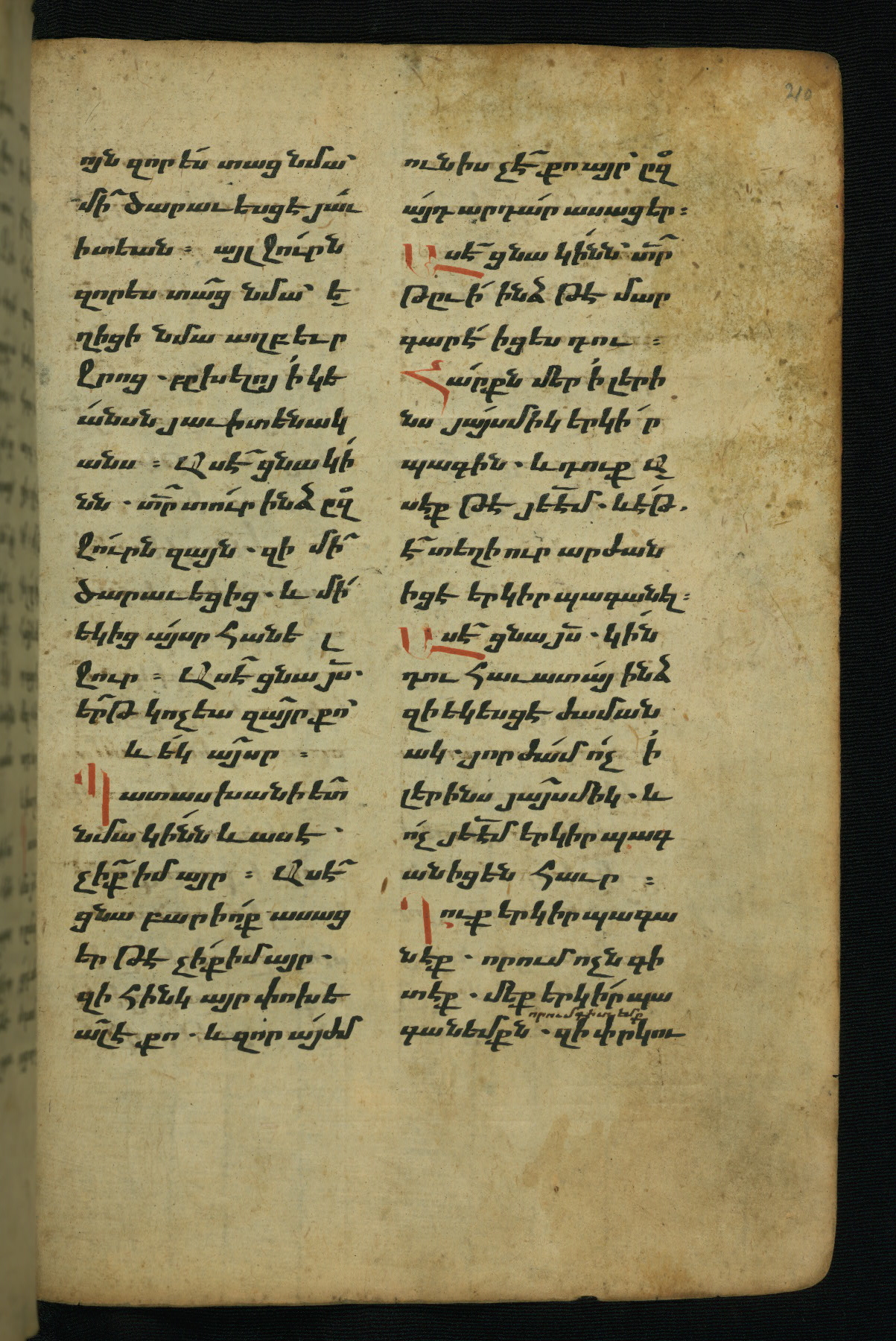 This manuscript was executed in 1475 CE by a scribe identified as Aristakes for a priest named Hakob. It contains a series of sixteen images on the life of Christ preceding the text of the Gospels, as well as the traditional Evangelist portraits, and there are marginal illustrations throughout. The style of the miniatures, which employ brilliant colors and emphasize decorative patterns, is characteristic of manuscript production in the region around Lake Van during the fifteenth century. The style of Lake Van has often been described in relation to schools of Islamic arts of the book. Numerous inscriptions (on fols. 258-260) spanning a few centuries attest to the manuscript's long history of use and revered preservation. The codex's later history included a rebinding with silver covers from Kayseri that date to approximately 1700. This jeweled and enameled silver binding bears a composition of the Adoration of the Magi on the front and the Ascension on the back.
