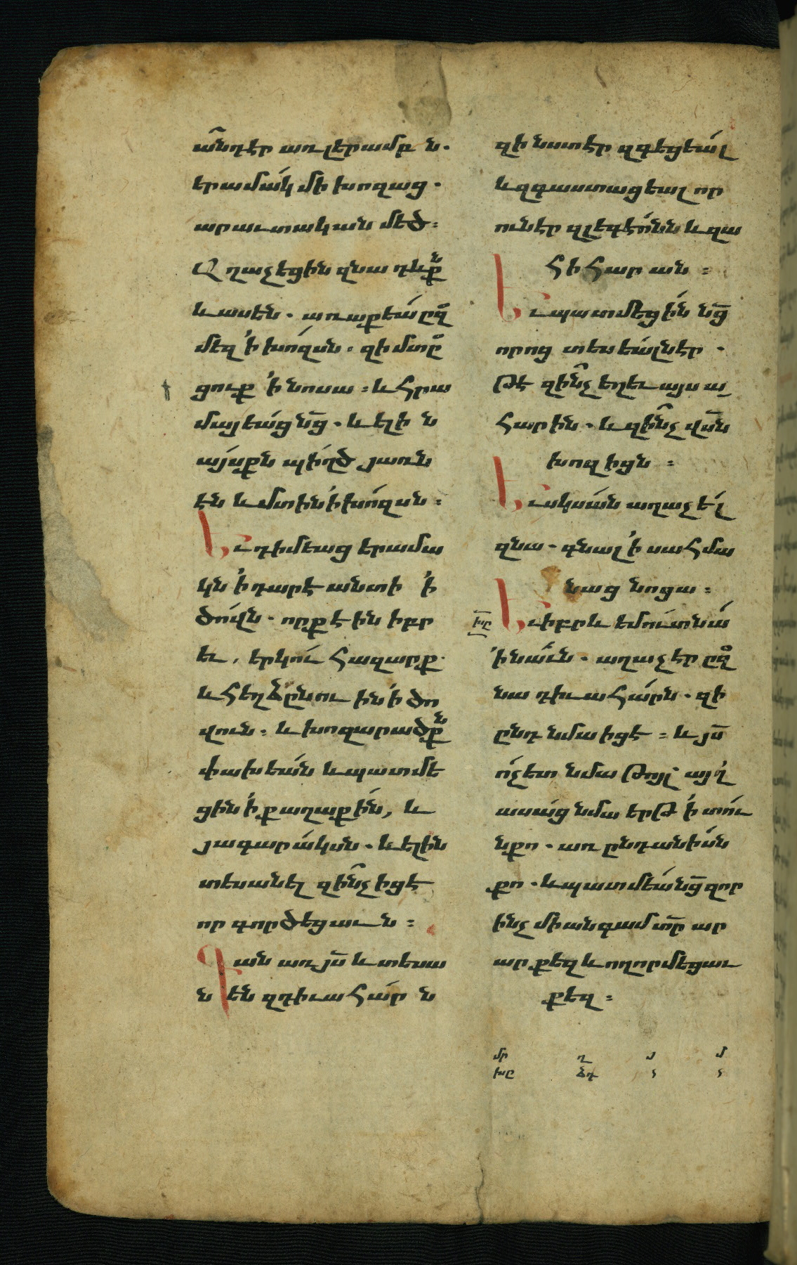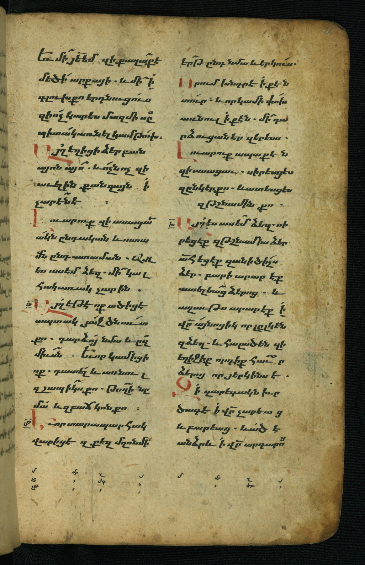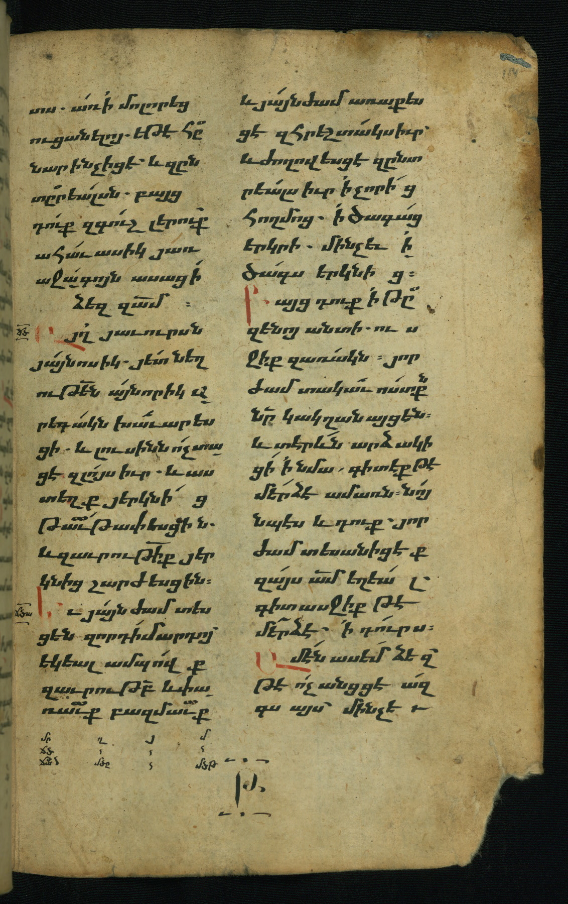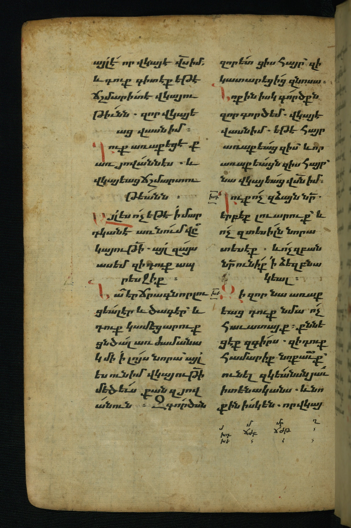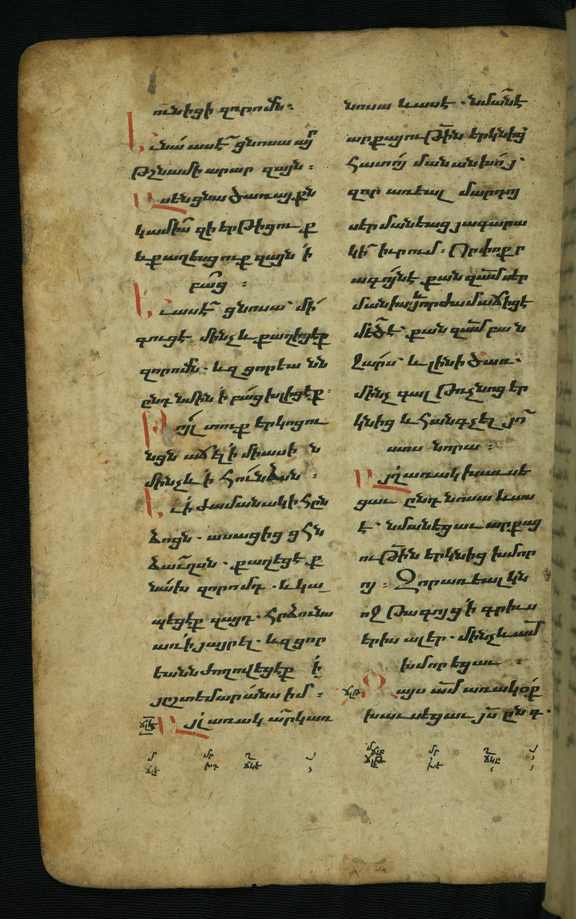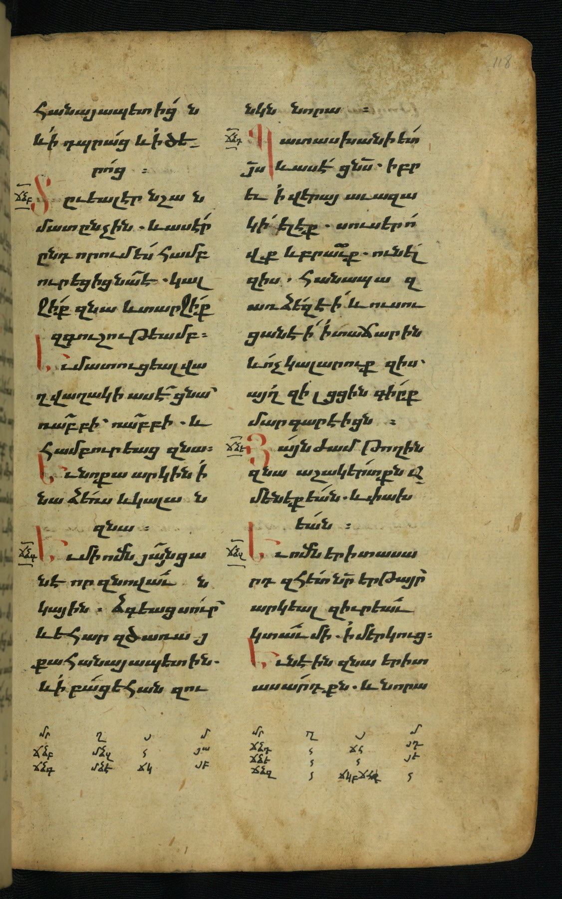 This manuscript was executed in 1475 CE by a scribe identified as Aristakes for a priest named Hakob. It contains a series of sixteen images on the life of Christ preceding the text of the Gospels, as well as the traditional Evangelist portraits, and there are marginal illustrations throughout. The style of the miniatures, which employ brilliant colors and emphasize decorative patterns, is characteristic of manuscript production in the region around Lake Van during the fifteenth century. The style of Lake Van has often been described in relation to schools of Islamic arts of the book. Numerous inscriptions (on fols. 258-260) spanning a few centuries attest to the manuscript's long history of use and revered preservation. The codex's later history included a rebinding with silver covers from Kayseri that date to approximately 1700. This jeweled and enameled silver binding bears a composition of the Adoration of the Magi on the front and the Ascension on the back.