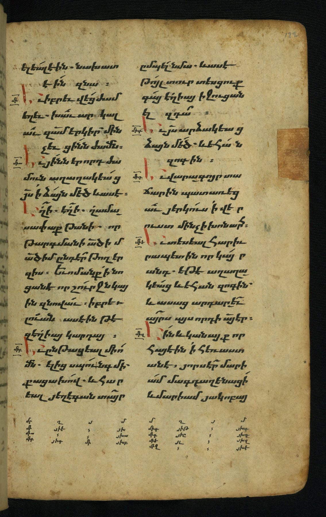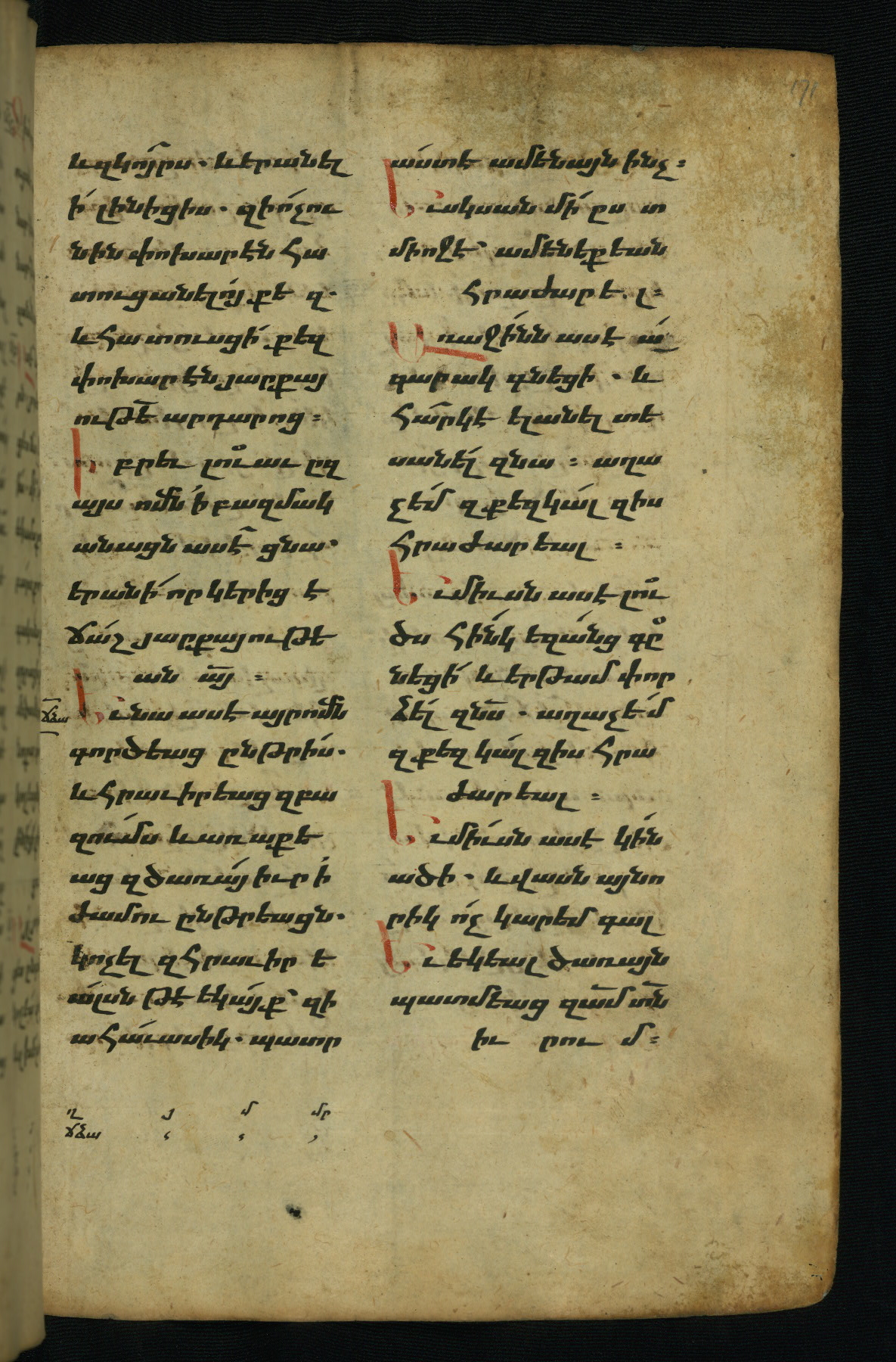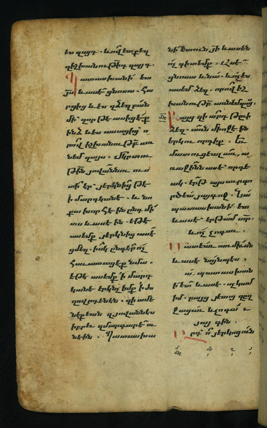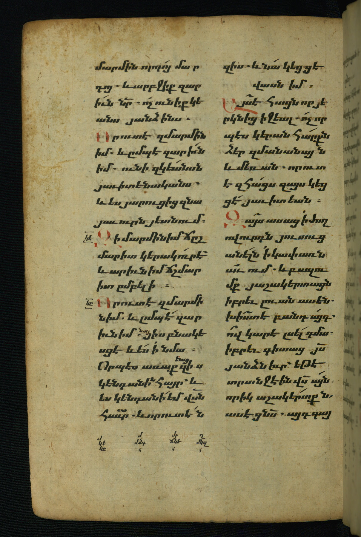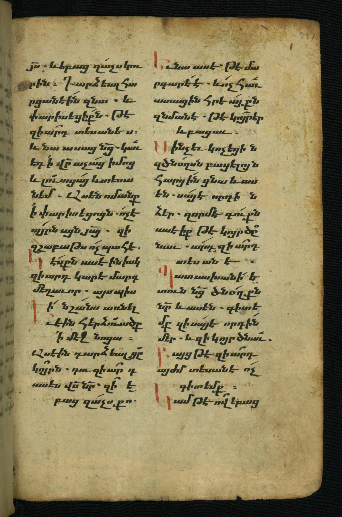 This manuscript was executed in 1475 CE by a scribe identified as Aristakes for a priest named Hakob. It contains a series of sixteen images on the life of Christ preceding the text of the Gospels, as well as the traditional Evangelist portraits, and there are marginal illustrations throughout. The style of the miniatures, which employ brilliant colors and emphasize decorative patterns, is characteristic of manuscript production in the region around Lake Van during the fifteenth century. The style of Lake Van has often been described in relation to schools of Islamic arts of the book. Numerous inscriptions (on fols. 258-260) spanning a few centuries attest to the manuscript's long history of use and revered preservation. The codex's later history included a rebinding with silver covers from Kayseri that date to approximately 1700. This jeweled and enameled silver binding bears a composition of the Adoration of the Magi on the front and the Ascension on the back.