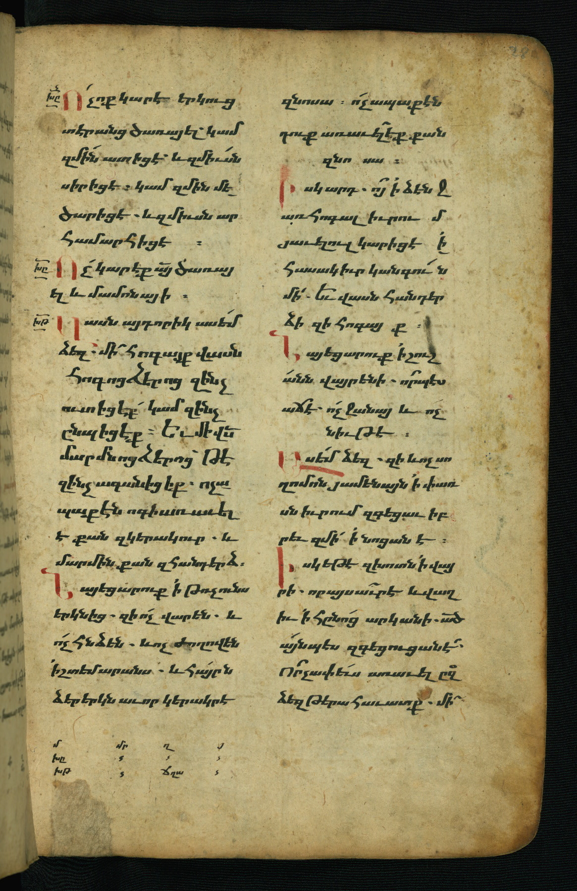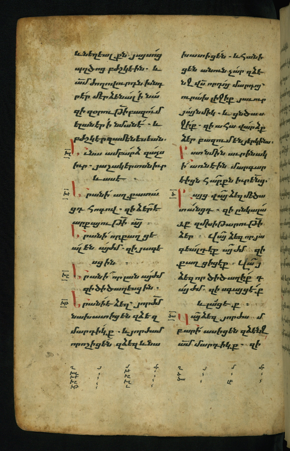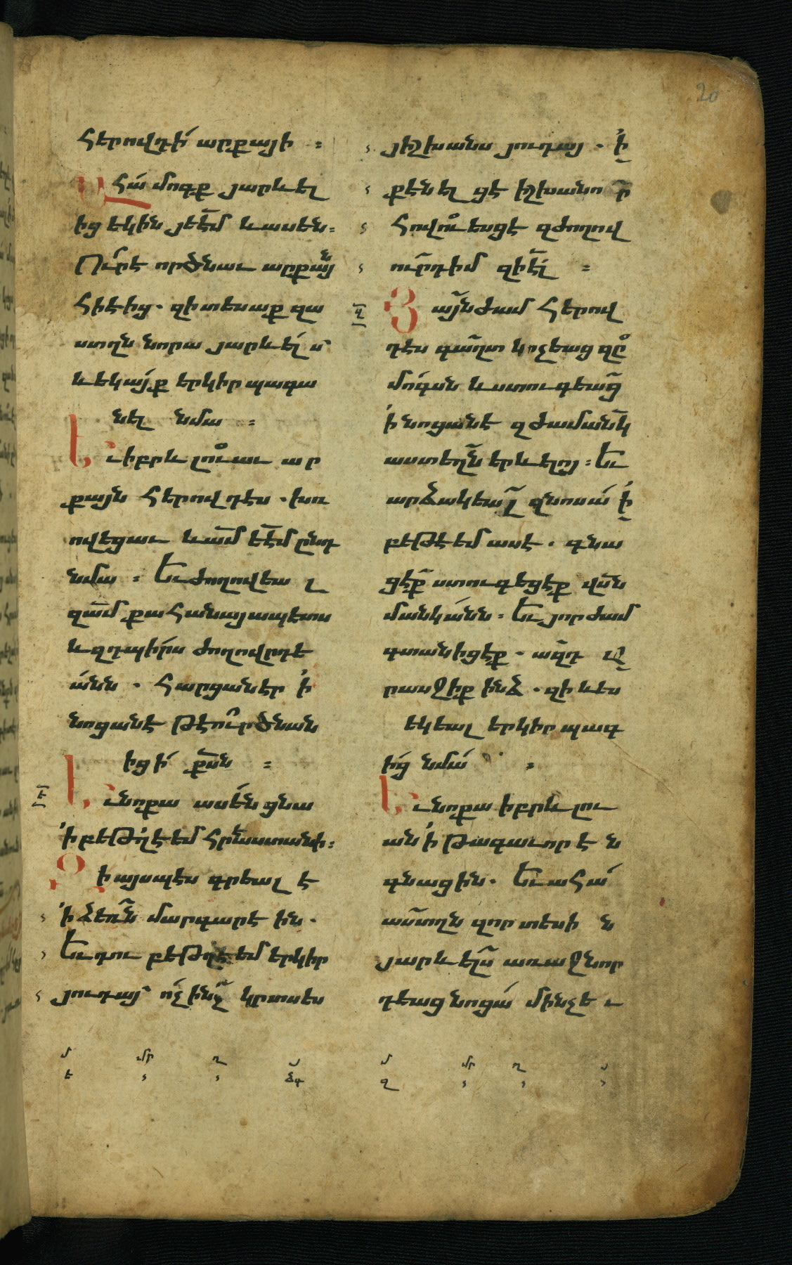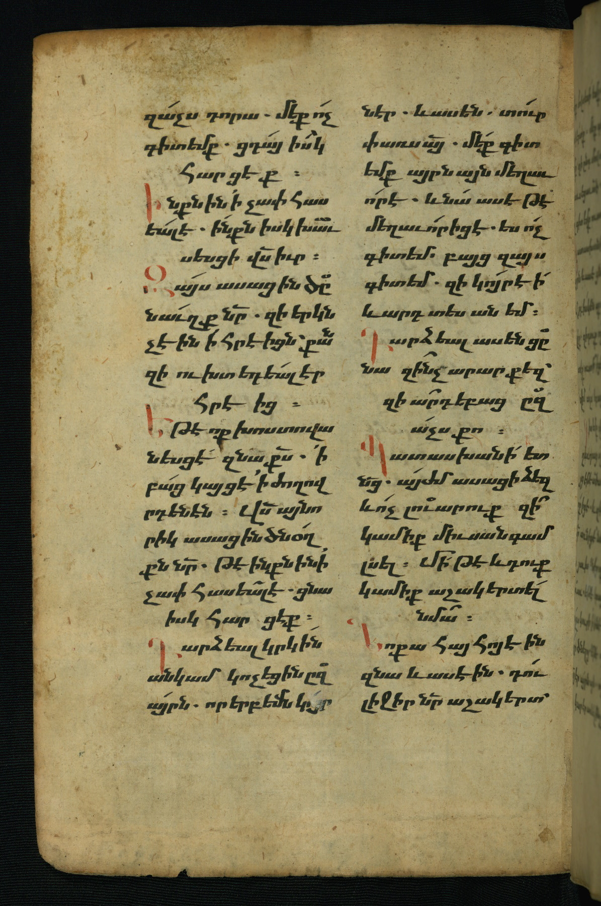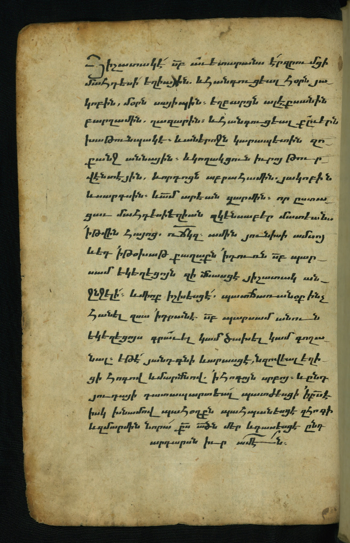 This manuscript was executed in 1475 CE by a scribe identified as Aristakes for a priest named Hakob. It contains a series of sixteen images on the life of Christ preceding the text of the Gospels, as well as the traditional Evangelist portraits, and there are marginal illustrations throughout. The style of the miniatures, which employ brilliant colors and emphasize decorative patterns, is characteristic of manuscript production in the region around Lake Van during the fifteenth century. The style of Lake Van has often been described in relation to schools of Islamic arts of the book. Numerous inscriptions (on fols. 258-260) spanning a few centuries attest to the manuscript's long history of use and revered preservation. The codex's later history included a rebinding with silver covers from Kayseri that date to approximately 1700. This jeweled and enameled silver binding bears a composition of the Adoration of the Magi on the front and the Ascension on the back.