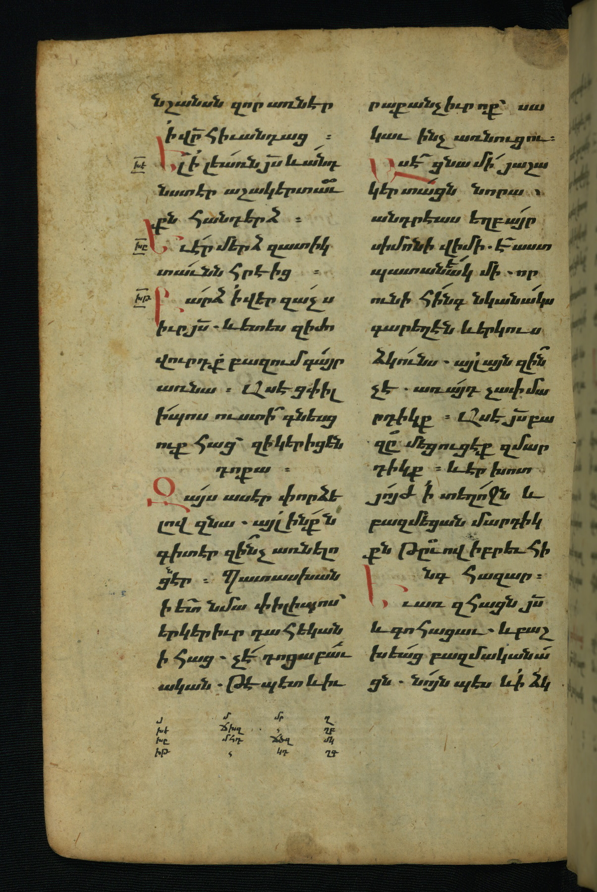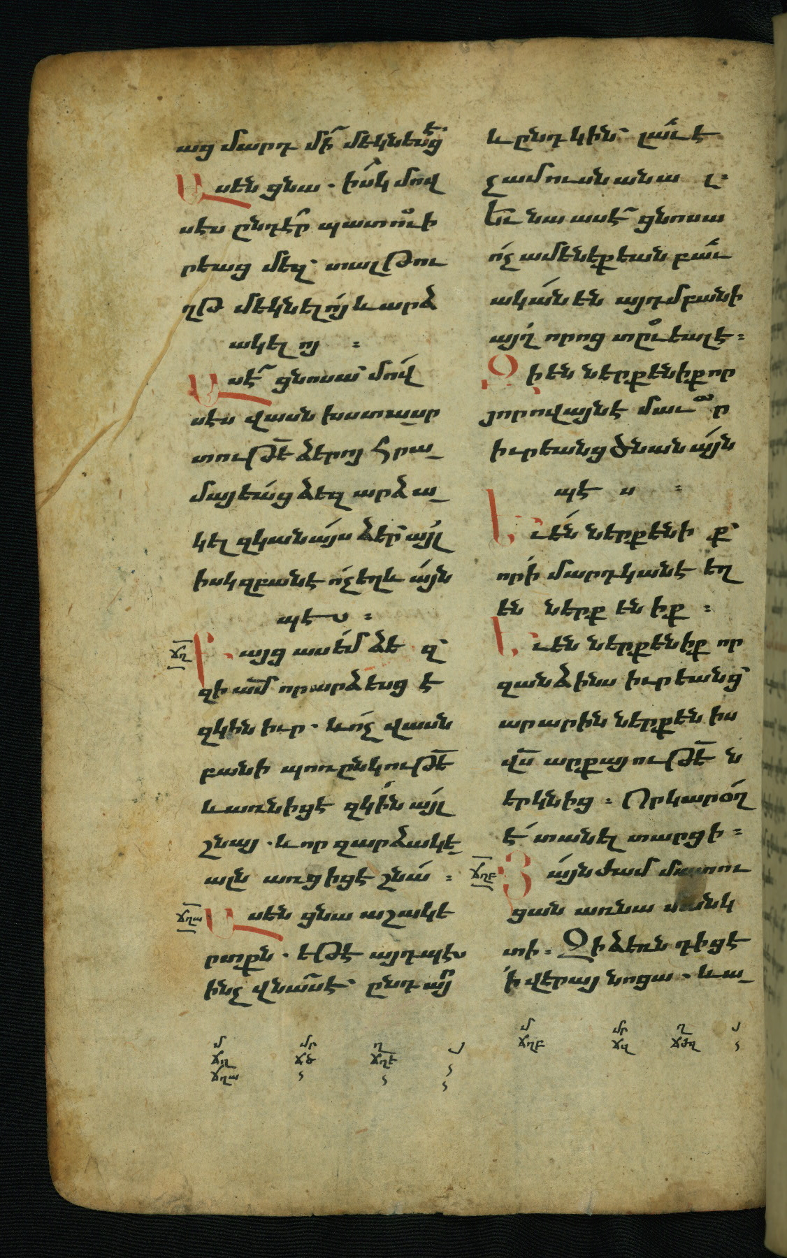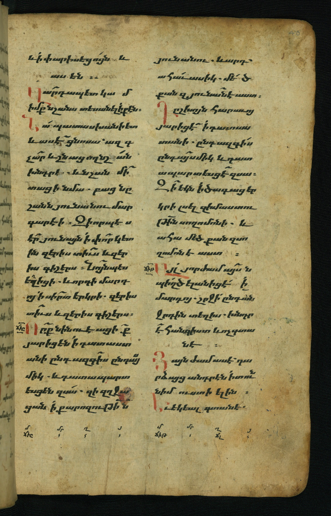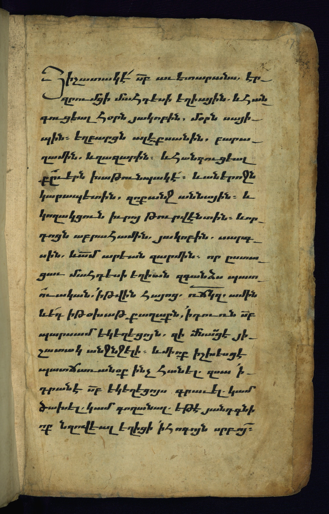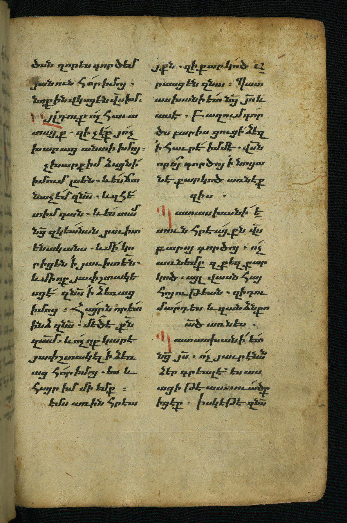 This manuscript was executed in 1475 CE by a scribe identified as Aristakes for a priest named Hakob. It contains a series of sixteen images on the life of Christ preceding the text of the Gospels, as well as the traditional Evangelist portraits, and there are marginal illustrations throughout. The style of the miniatures, which employ brilliant colors and emphasize decorative patterns, is characteristic of manuscript production in the region around Lake Van during the fifteenth century. The style of Lake Van has often been described in relation to schools of Islamic arts of the book. Numerous inscriptions (on fols. 258-260) spanning a few centuries attest to the manuscript's long history of use and revered preservation. The codex's later history included a rebinding with silver covers from Kayseri that date to approximately 1700. This jeweled and enameled silver binding bears a composition of the Adoration of the Magi on the front and the Ascension on the back.