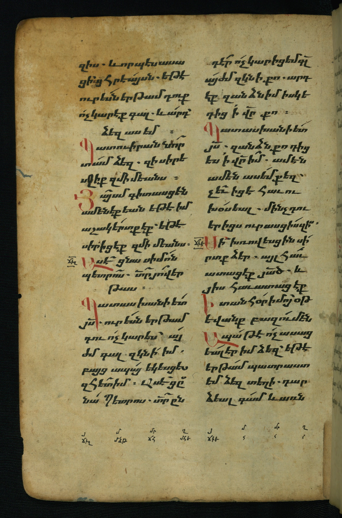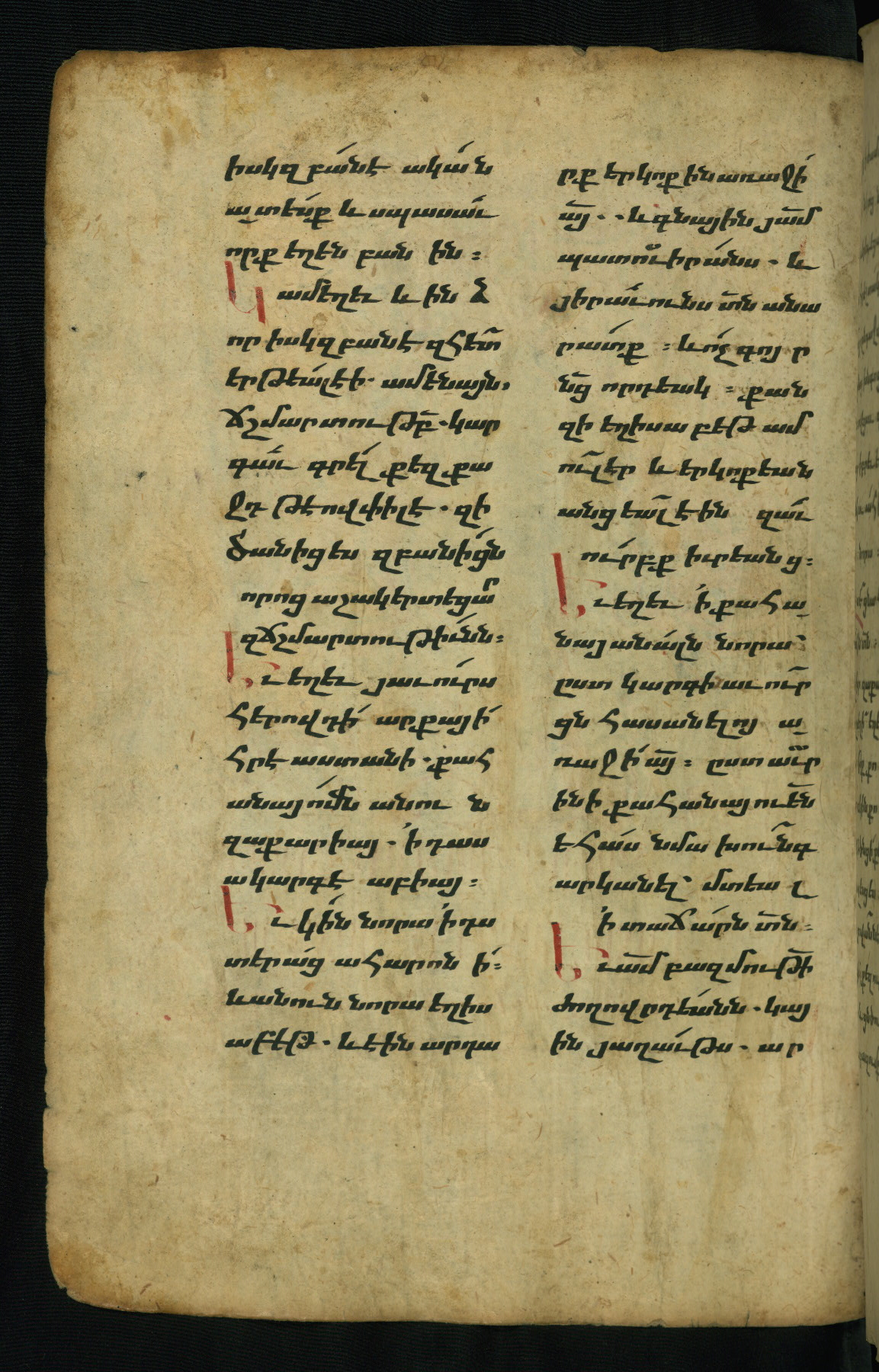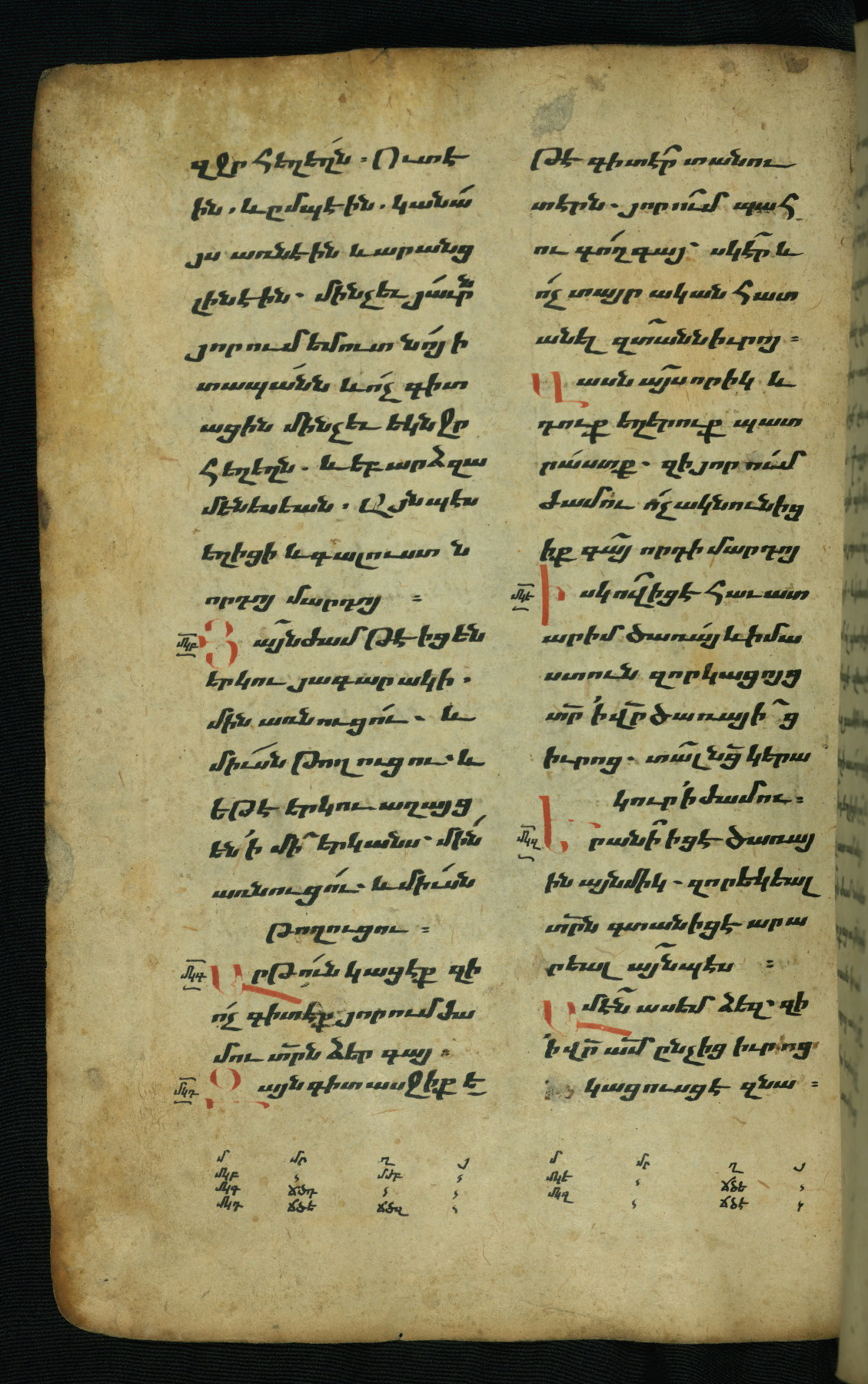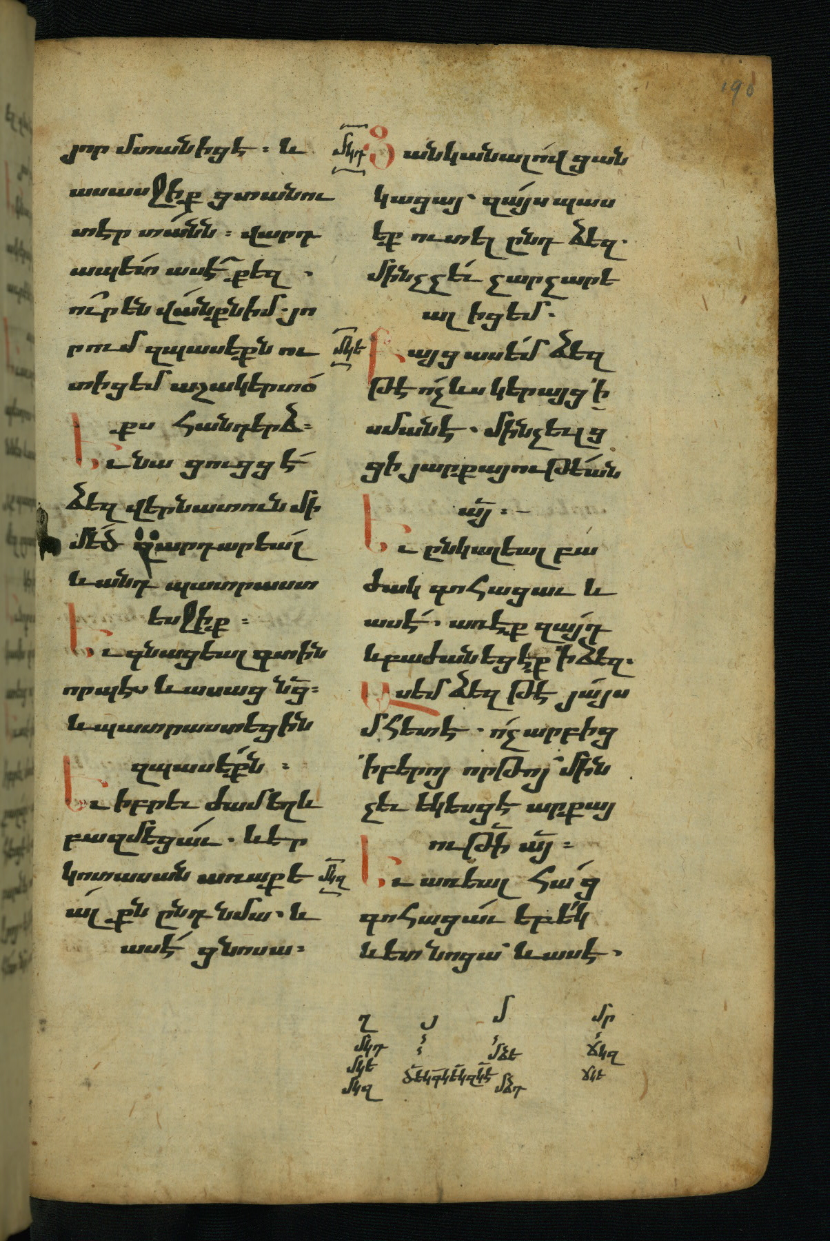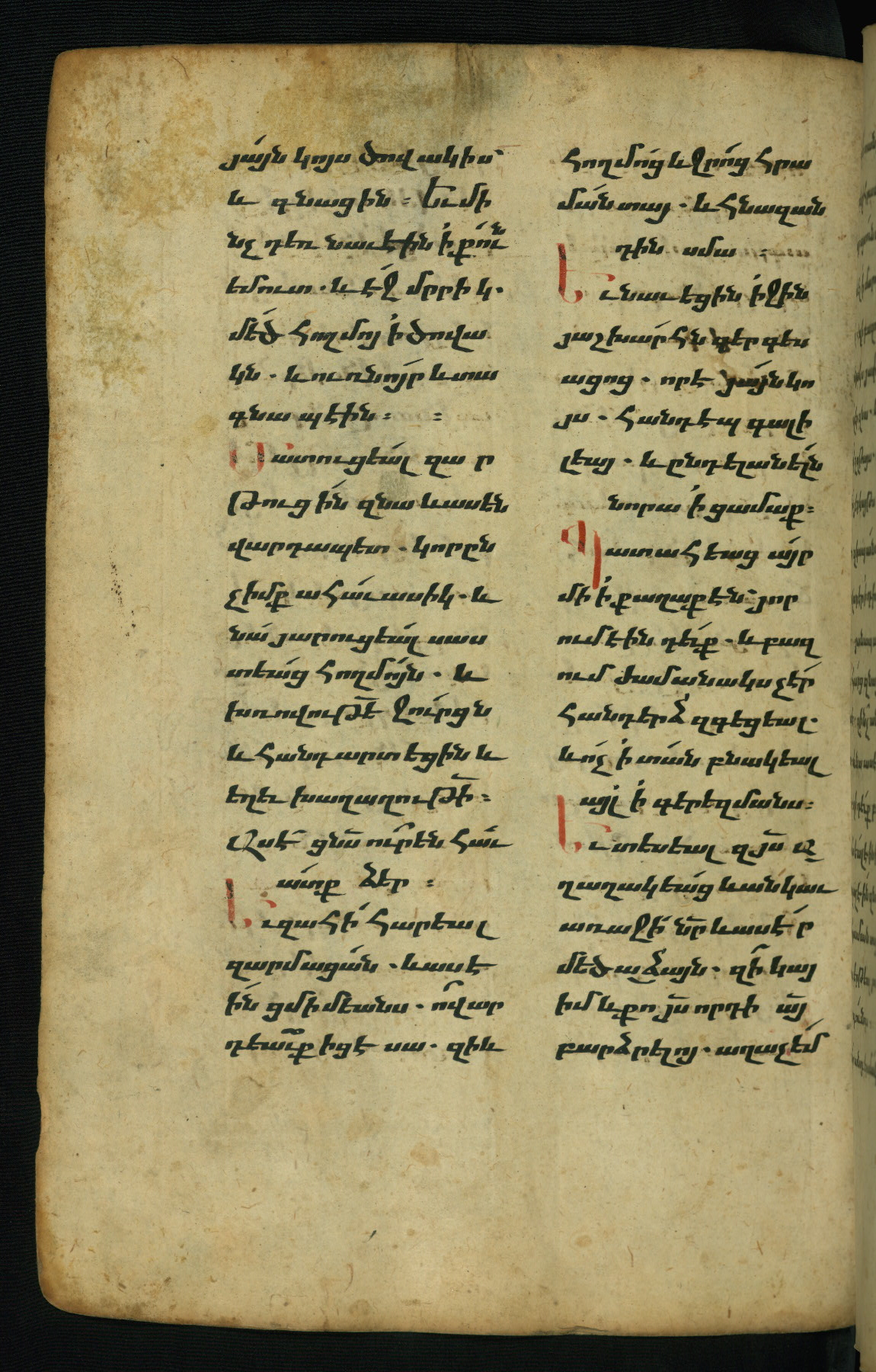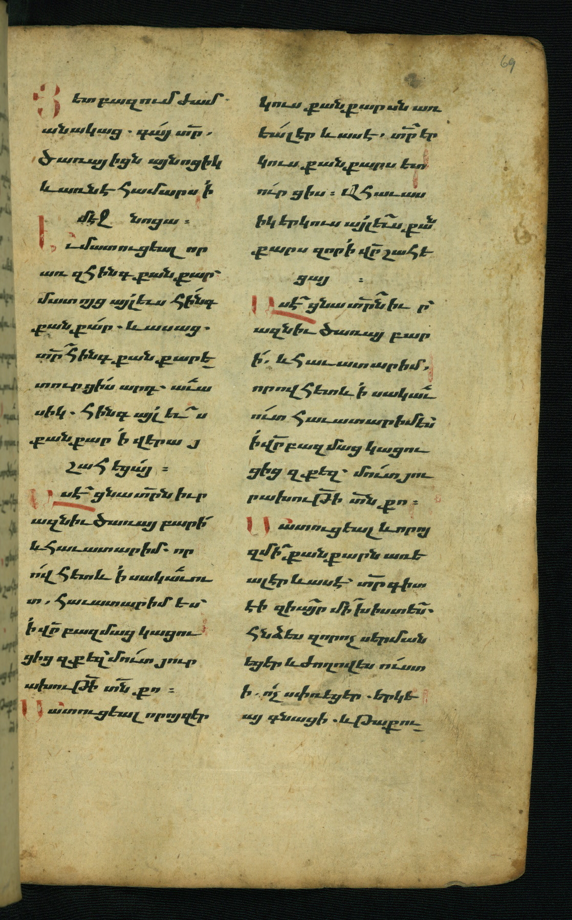 This manuscript was executed in 1475 CE by a scribe identified as Aristakes for a priest named Hakob. It contains a series of sixteen images on the life of Christ preceding the text of the Gospels, as well as the traditional Evangelist portraits, and there are marginal illustrations throughout. The style of the miniatures, which employ brilliant colors and emphasize decorative patterns, is characteristic of manuscript production in the region around Lake Van during the fifteenth century. The style of Lake Van has often been described in relation to schools of Islamic arts of the book. Numerous inscriptions (on fols. 258-260) spanning a few centuries attest to the manuscript's long history of use and revered preservation. The codex's later history included a rebinding with silver covers from Kayseri that date to approximately 1700. This jeweled and enameled silver binding bears a composition of the Adoration of the Magi on the front and the Ascension on the back.